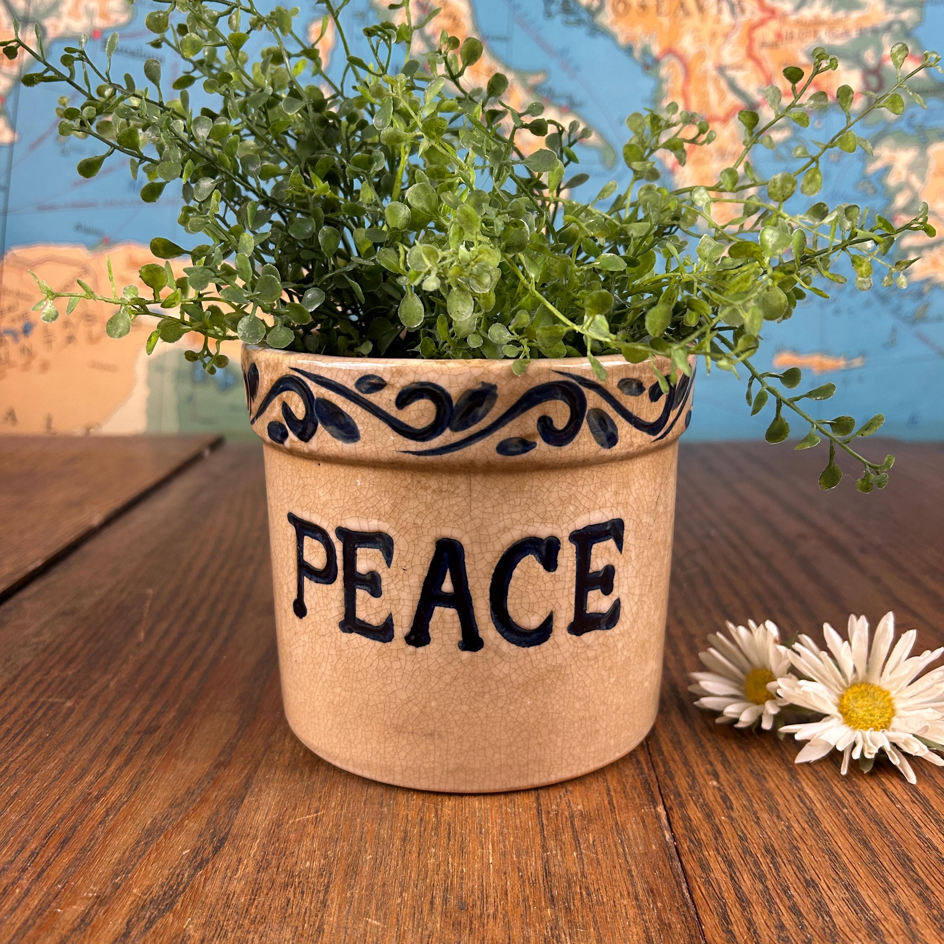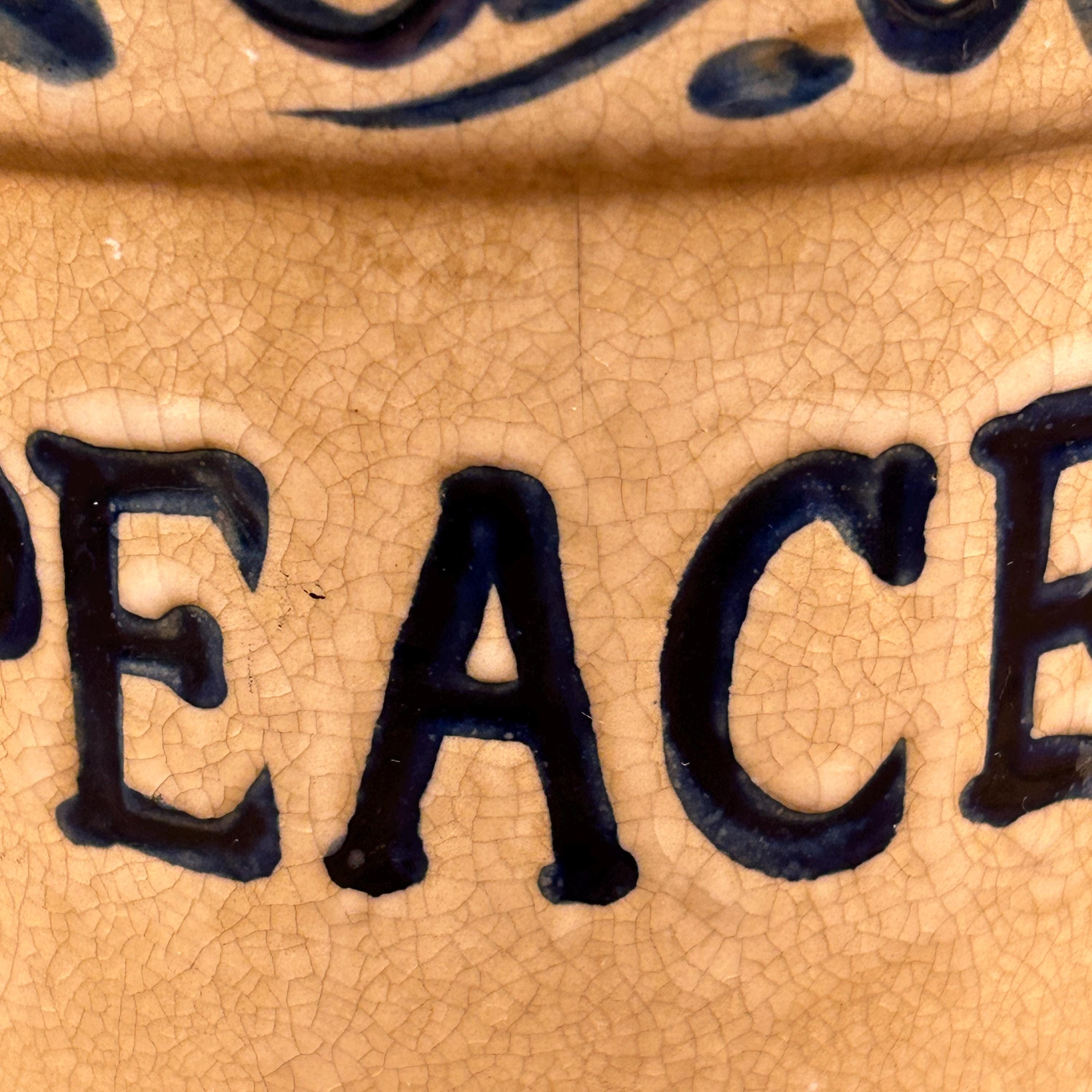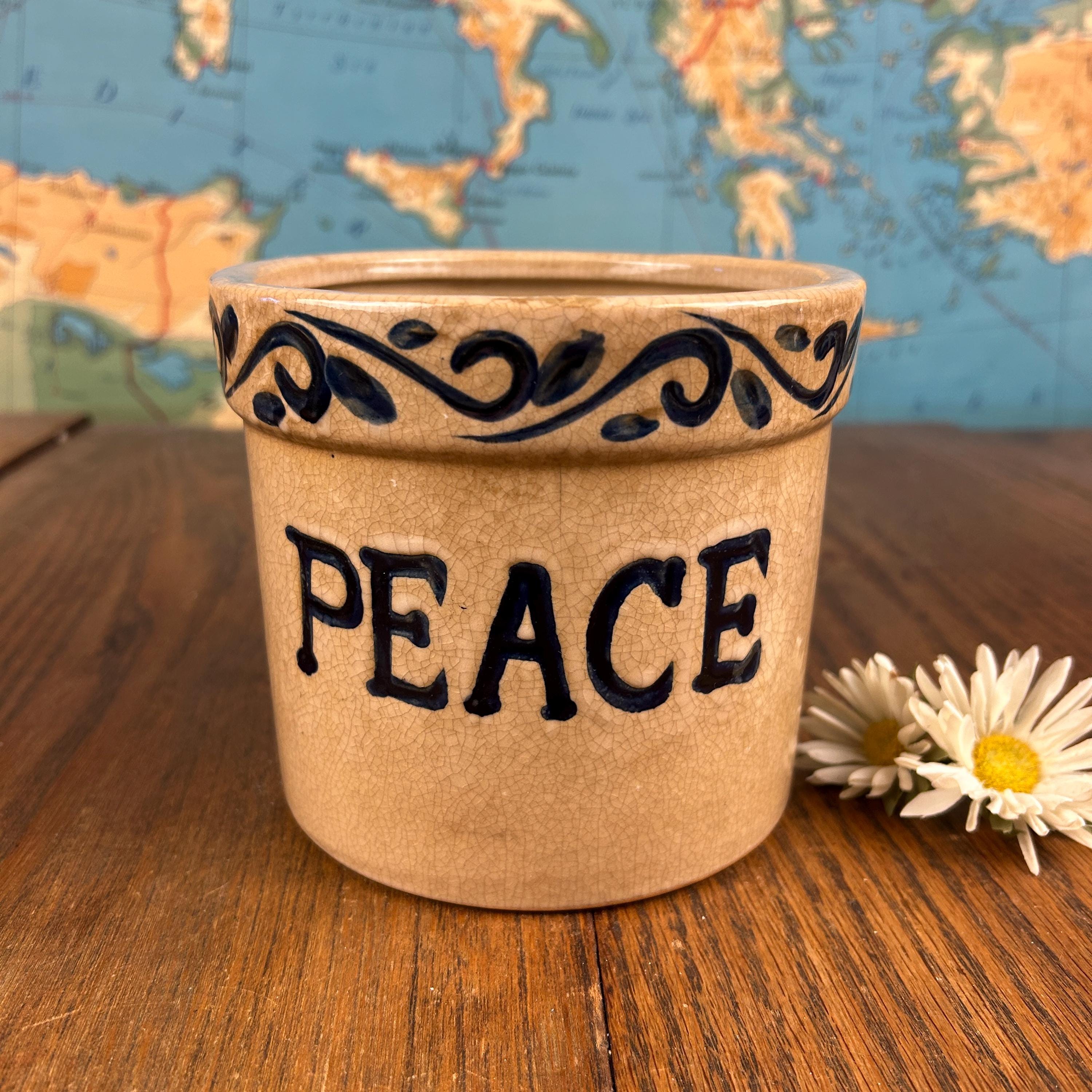 This is a vintage blue and beige stoneware crock featuring the word “PEACE” in bold blue lettering, accented by a decorative blue scroll pattern around the rim. The design appears hand-painted and stamped, giving the piece a simple, folk-art feel that’s both timeless and calming.