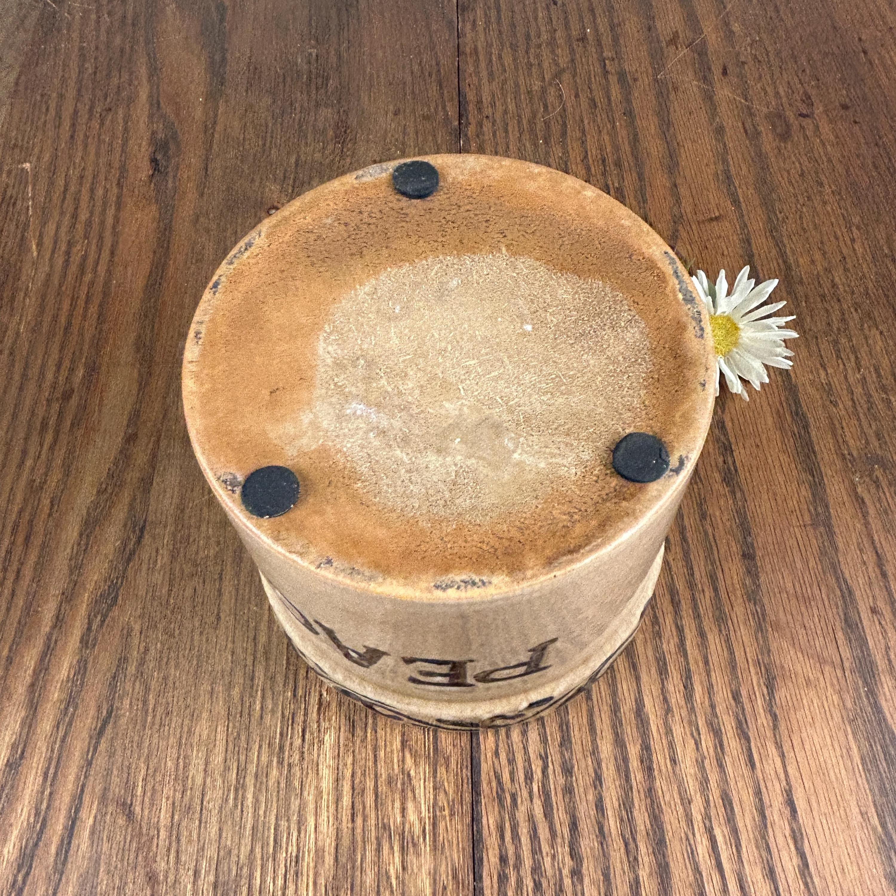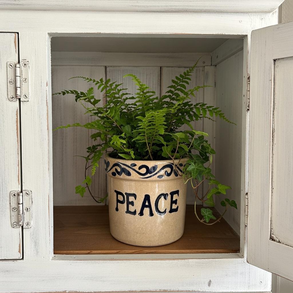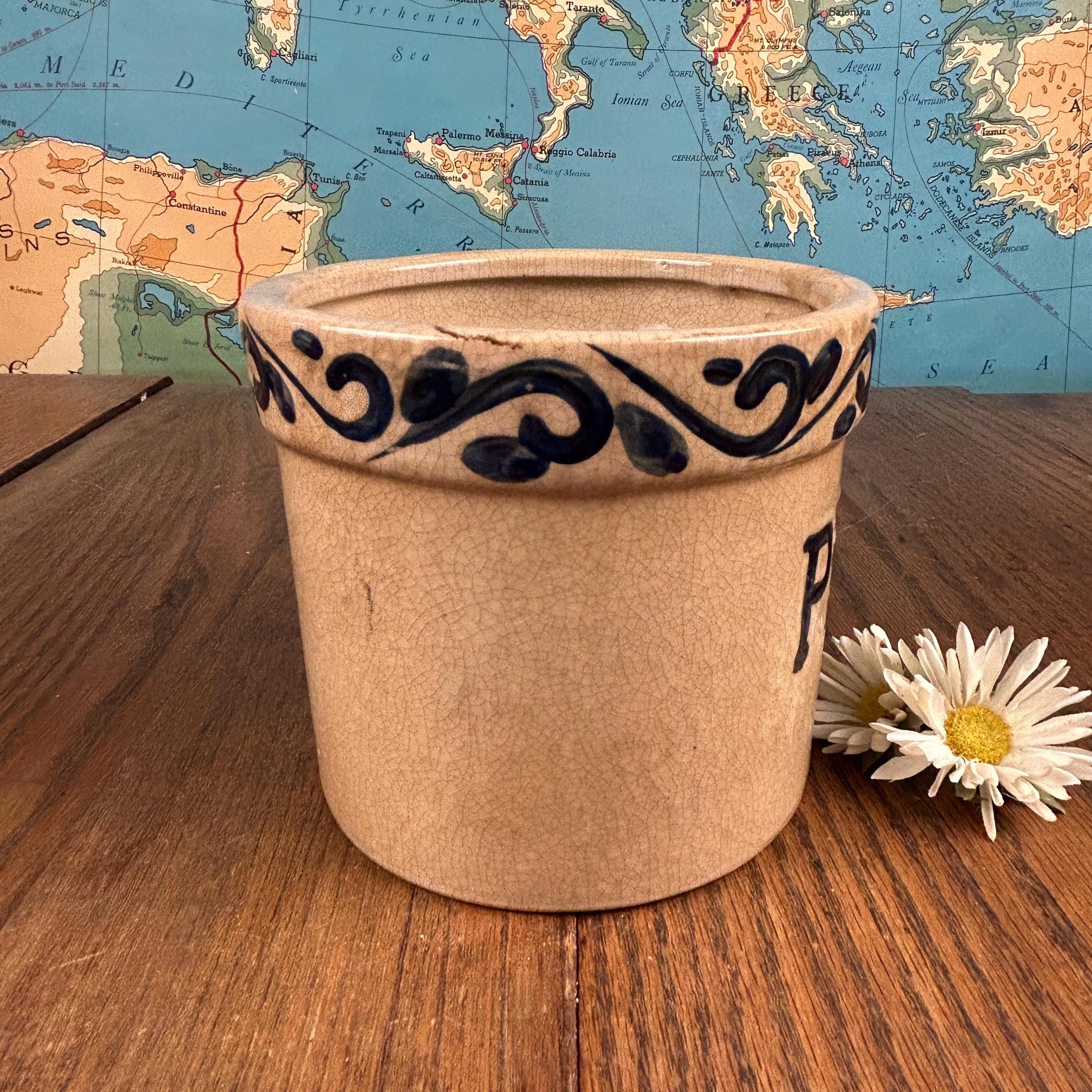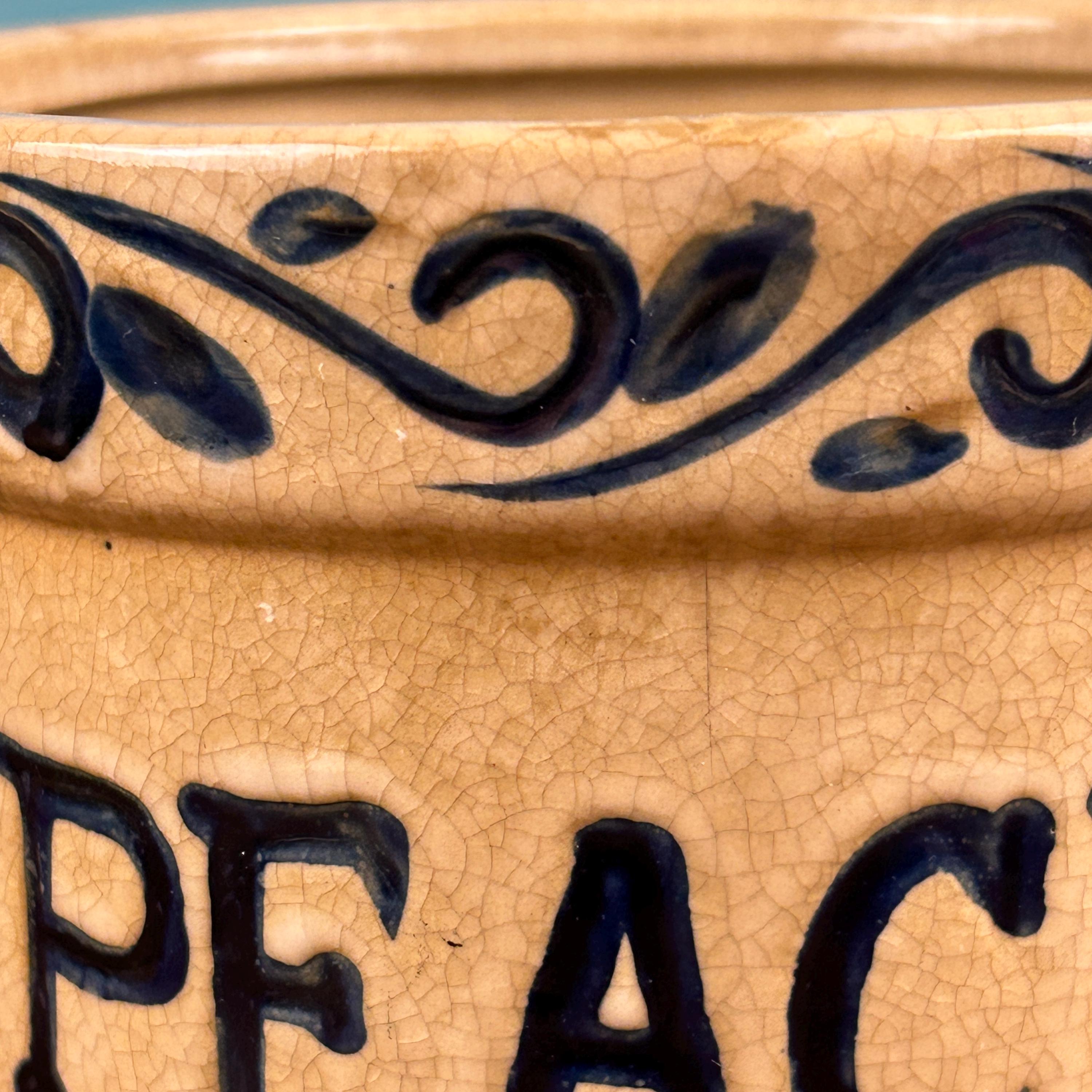 This is a vintage blue and beige stoneware crock featuring the word “PEACE” in bold blue lettering, accented by a decorative blue scroll pattern around the rim. The design appears hand-painted and stamped, giving the piece a simple, folk-art feel that’s both timeless and calming.