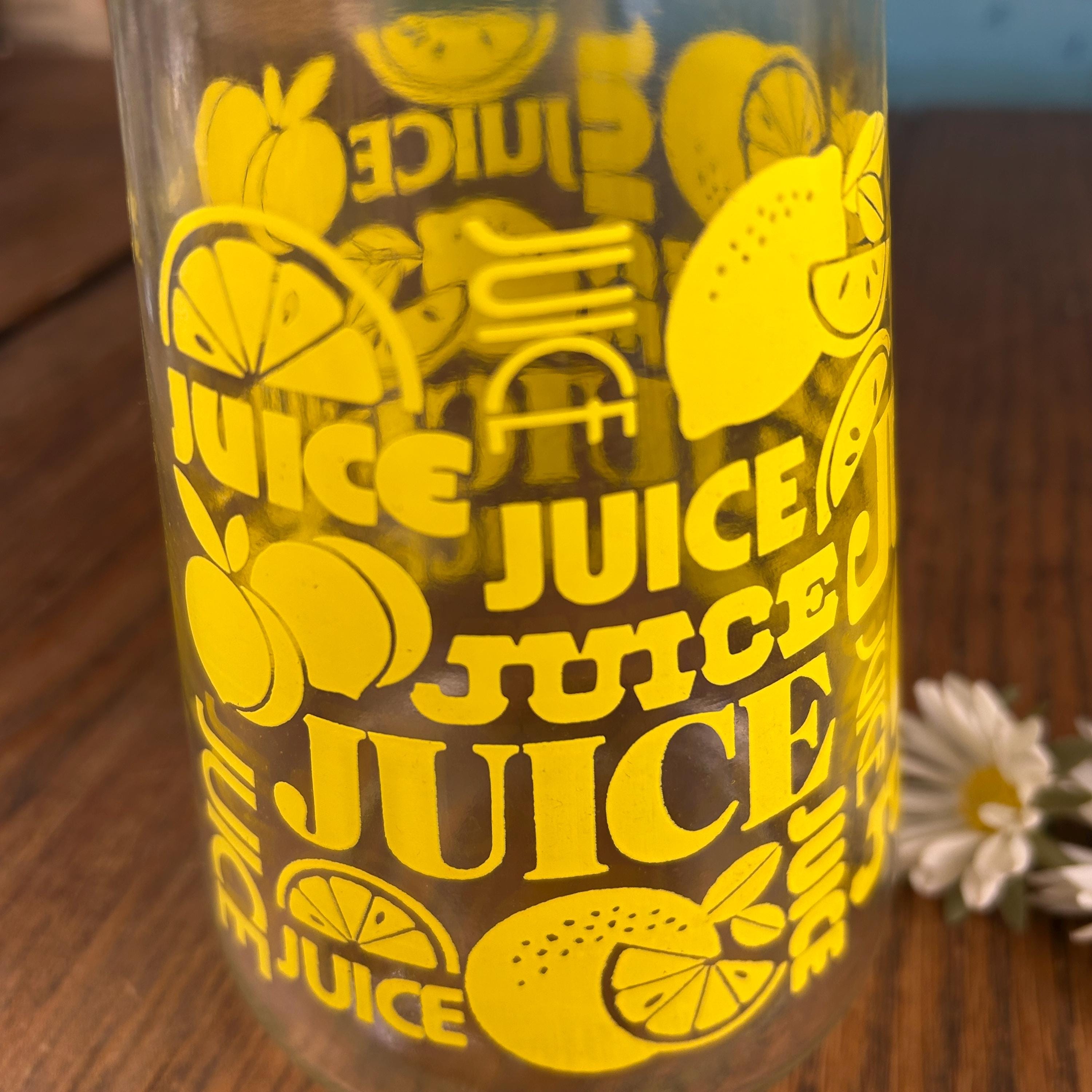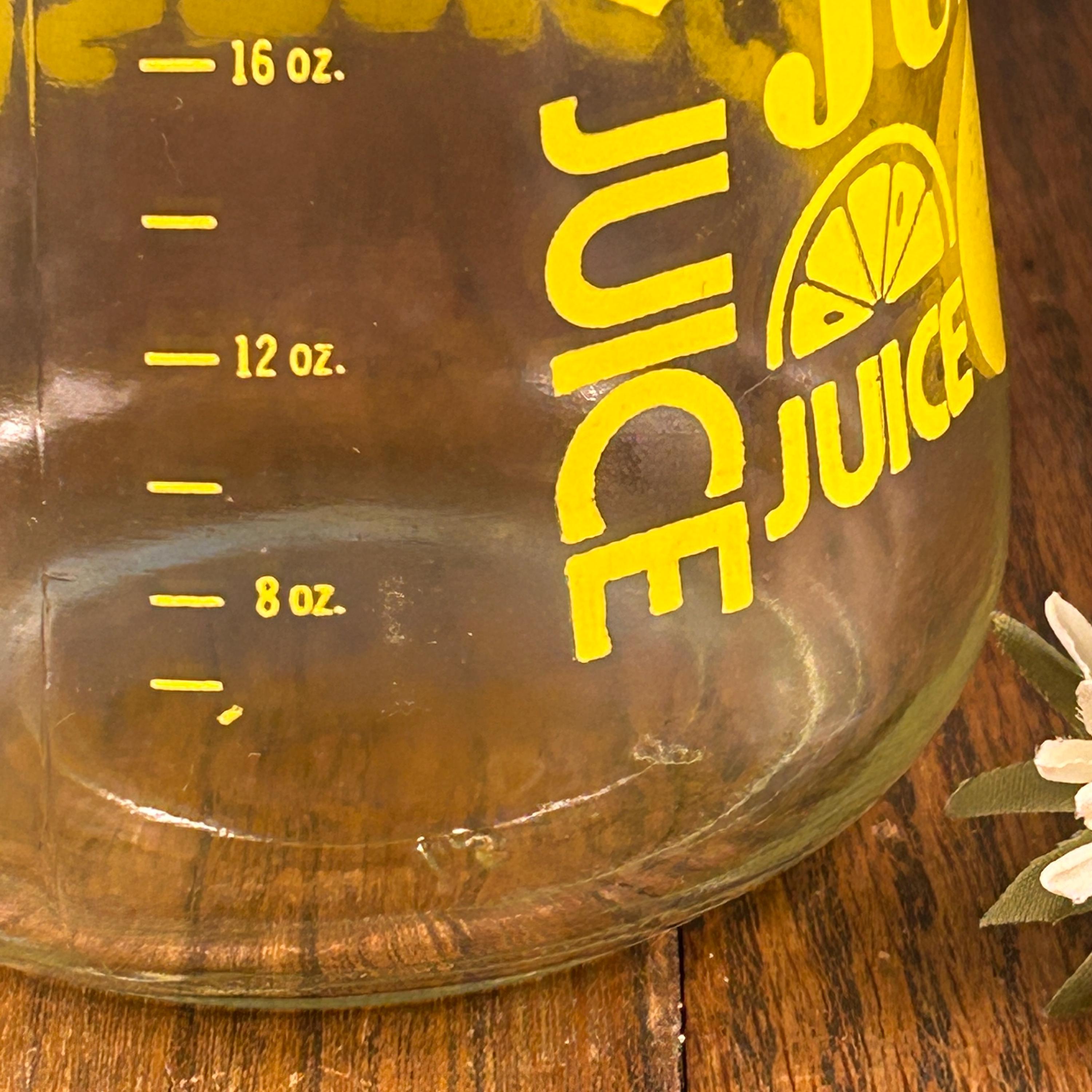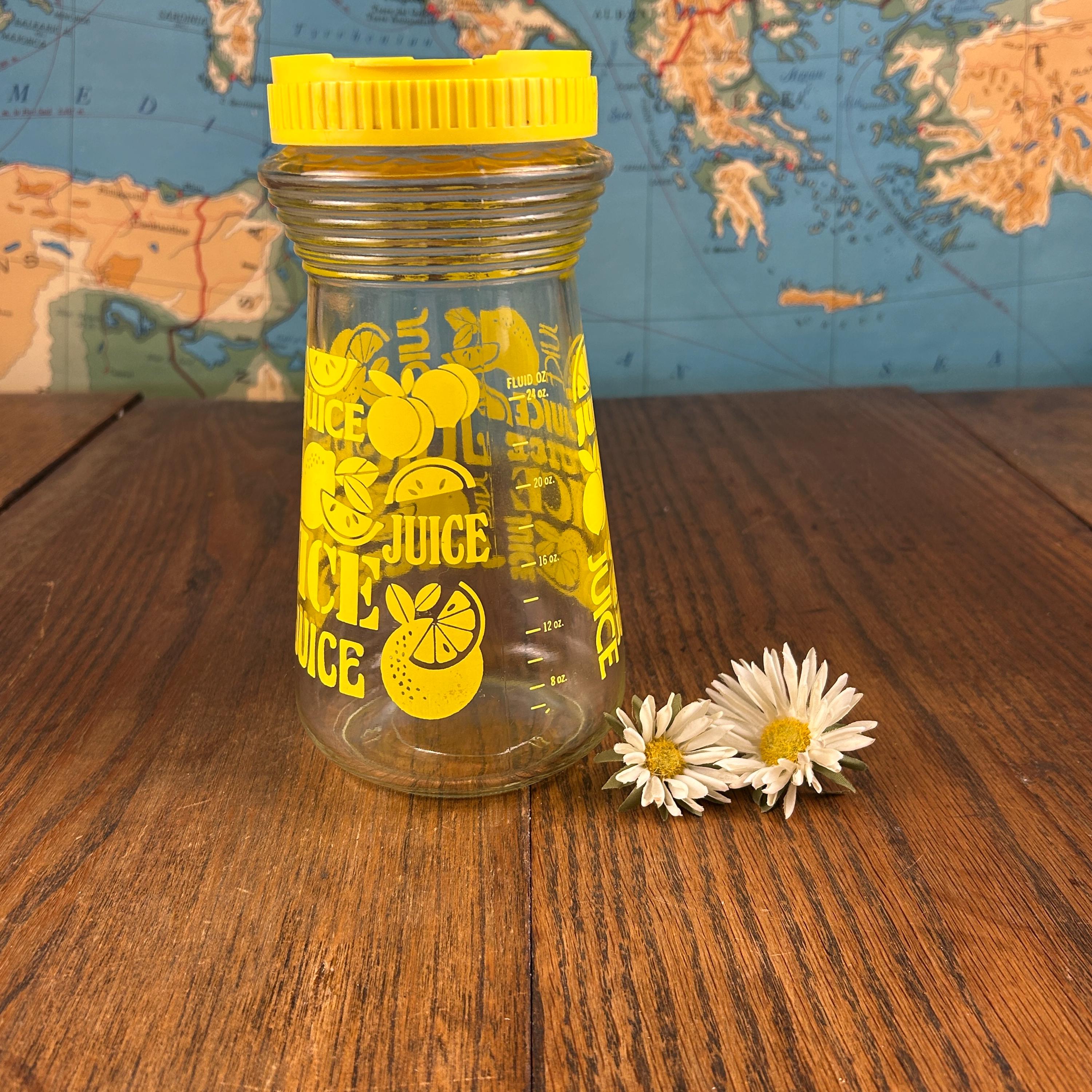 The clear glass body holds approximately 24 fluid ounces, making it perfect for serving lemon juice, iced tea, juice, or water. With its bold color and playful graphics, this piece works just as well for everyday use as it does for display in a retro or vintage kitchen.