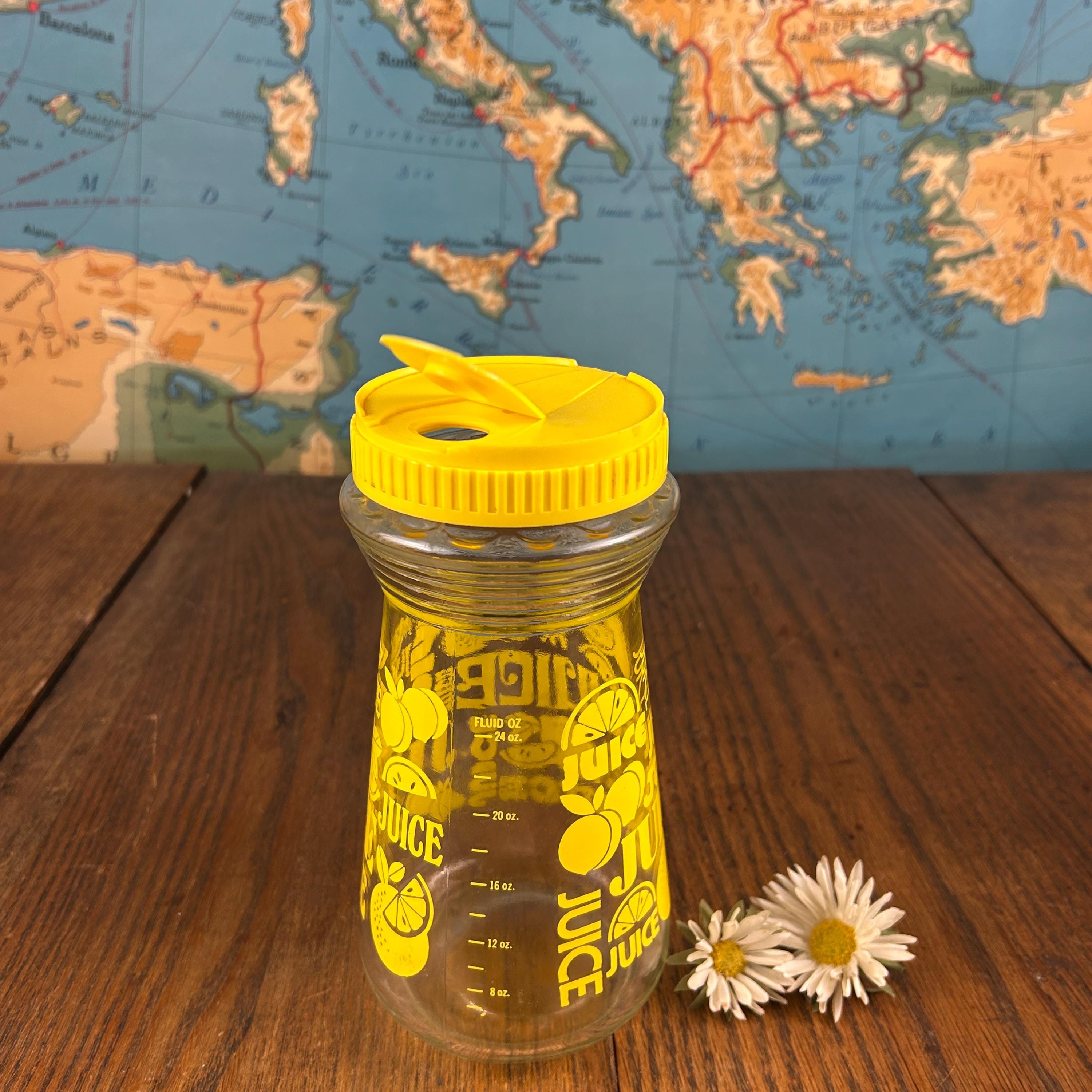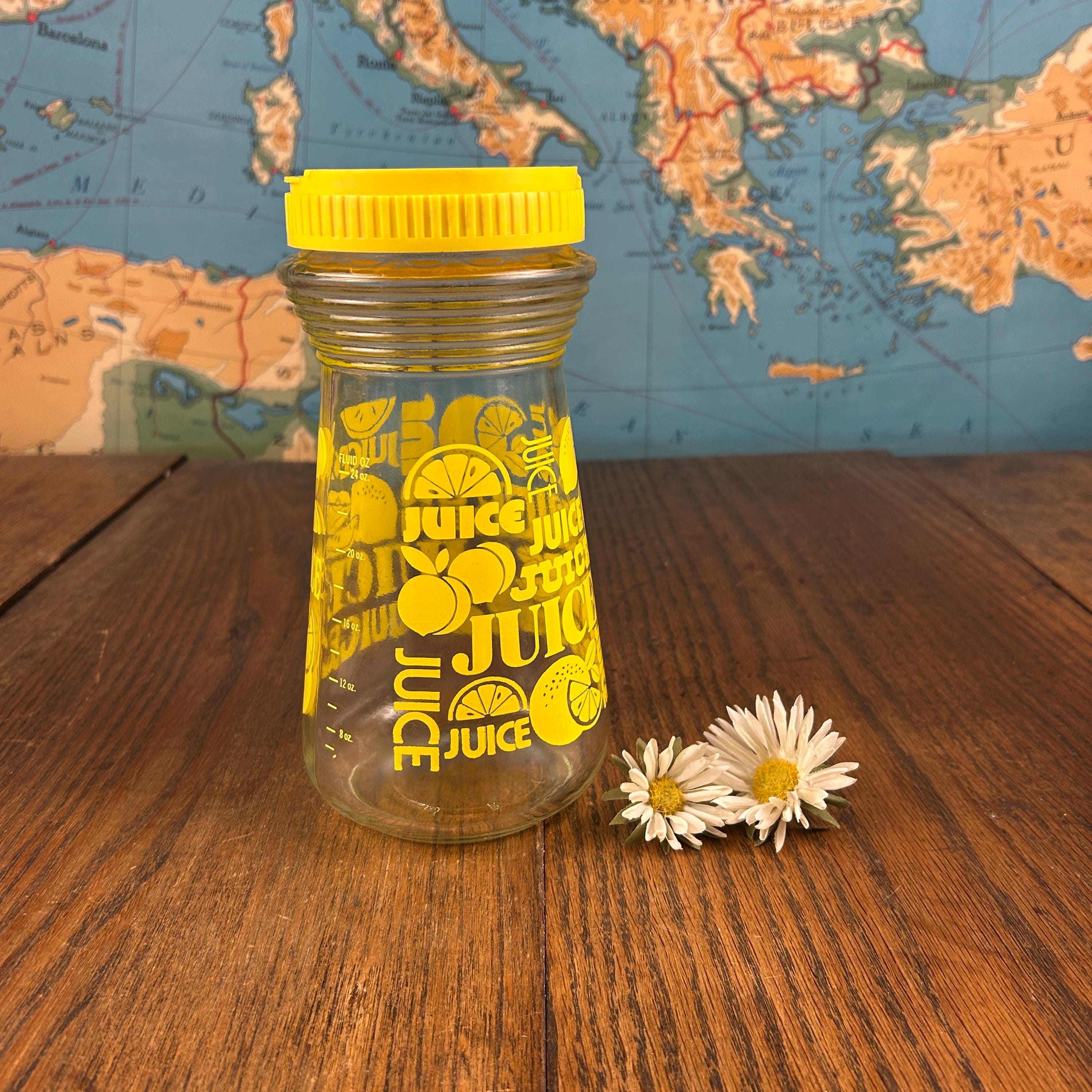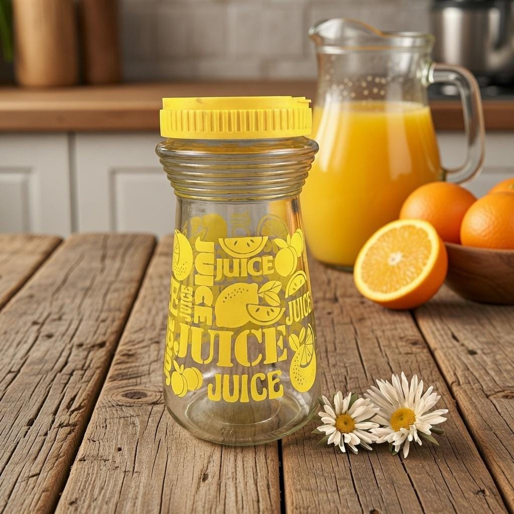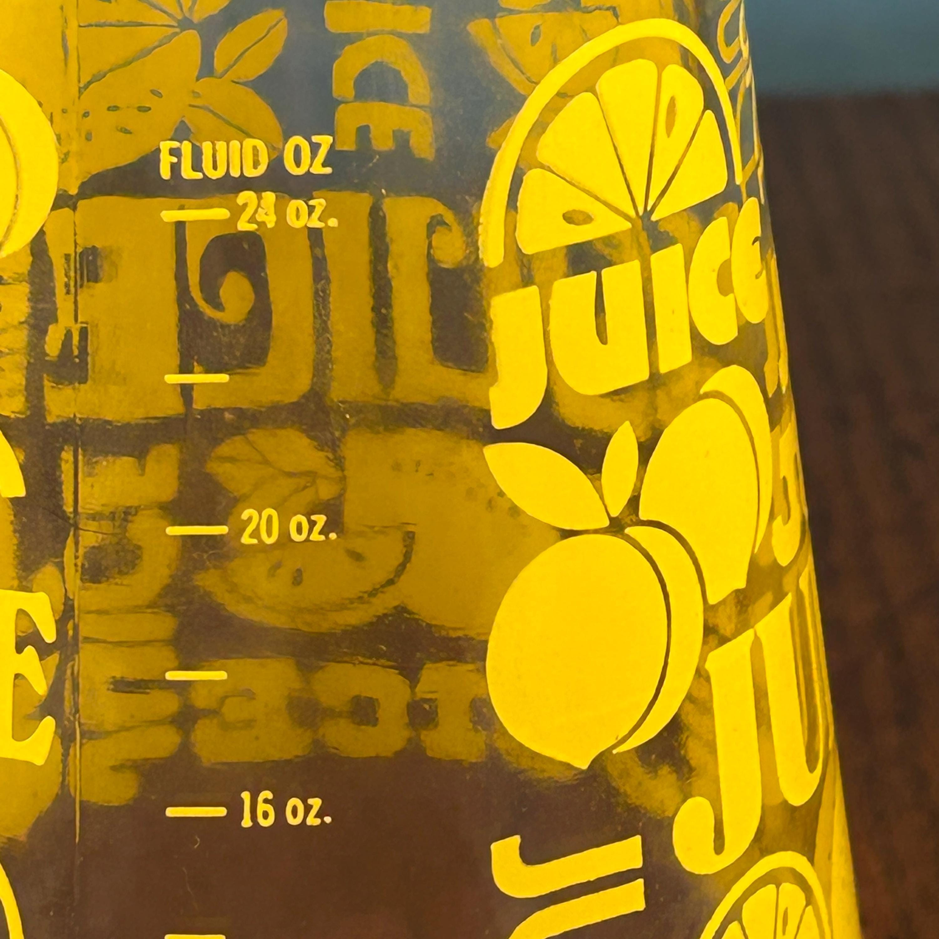 The clear glass body holds approximately 24 fluid ounces, making it perfect for serving lemon juice, iced tea, juice, or water. With its bold color and playful graphics, this piece works just as well for everyday use as it does for display in a retro or vintage kitchen.