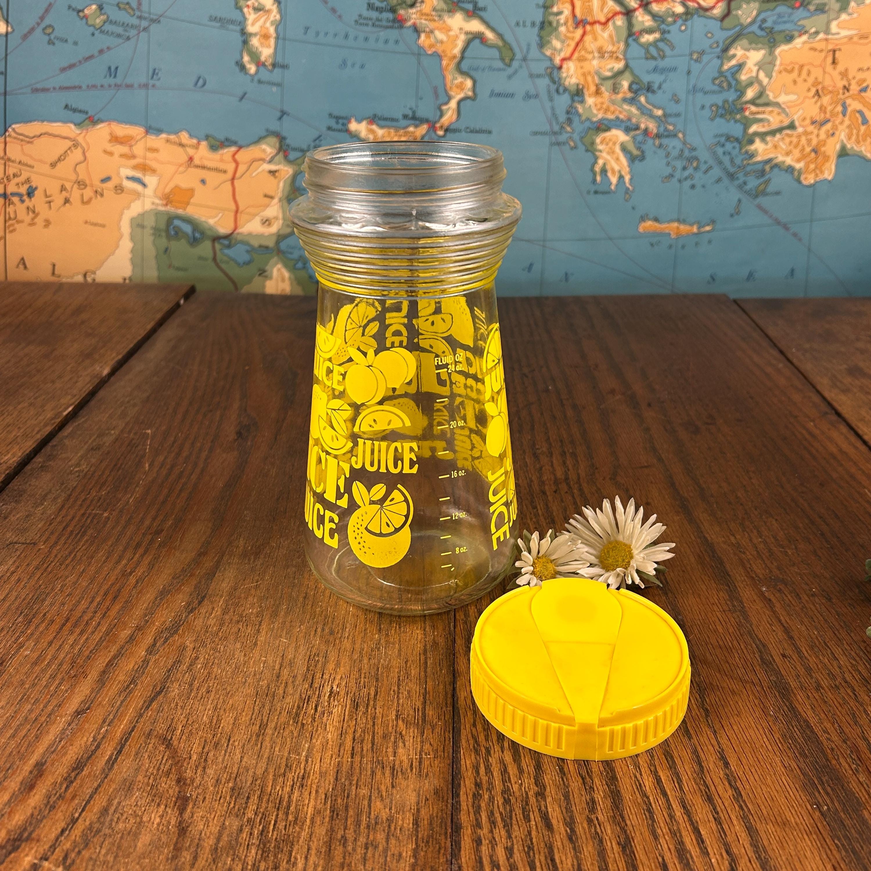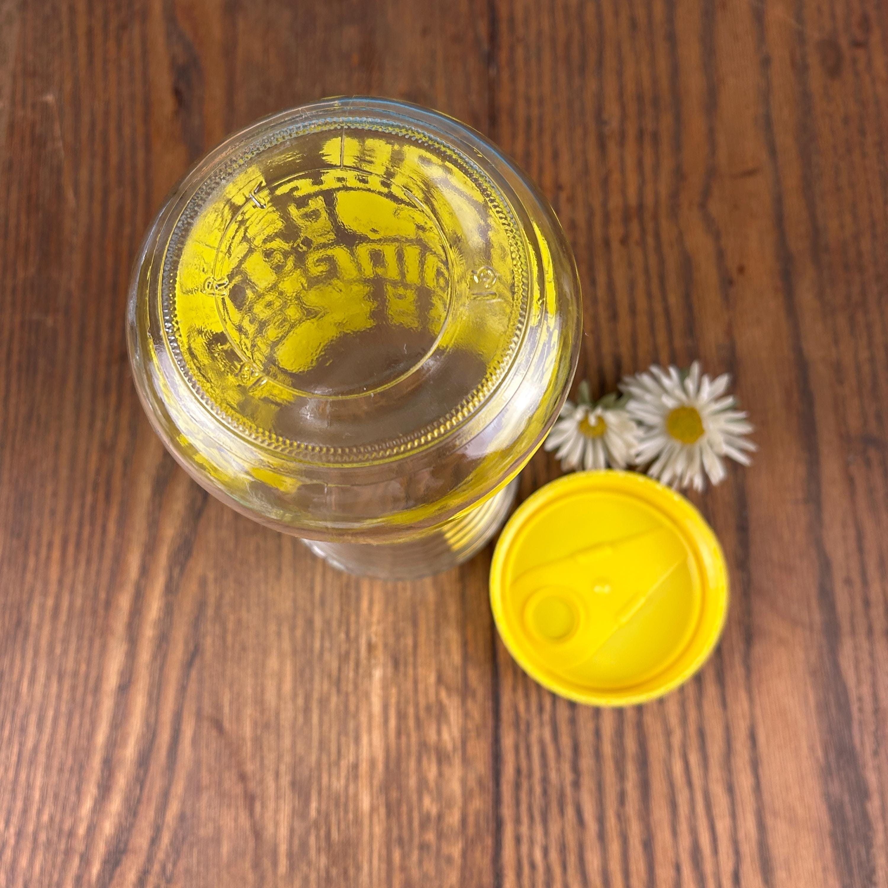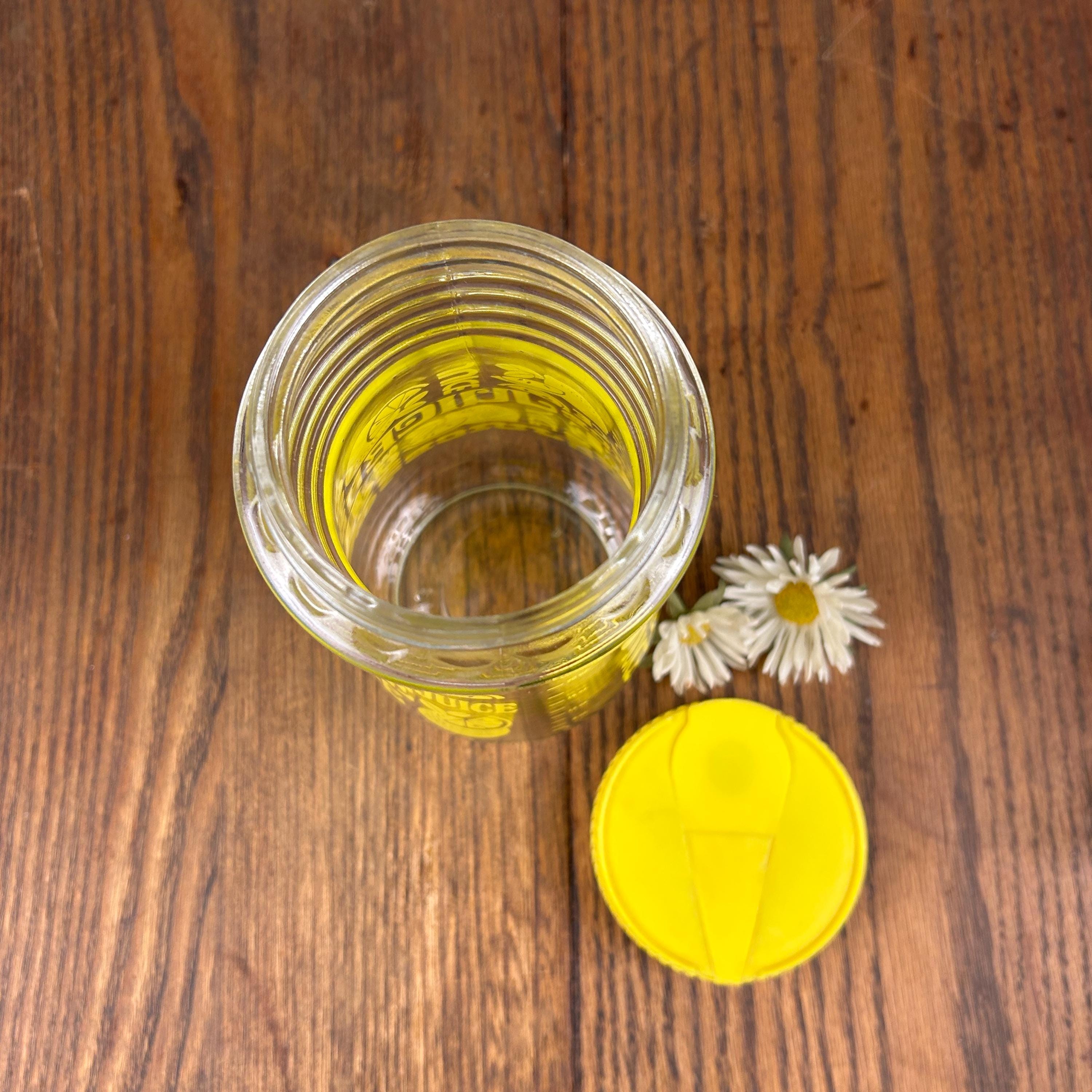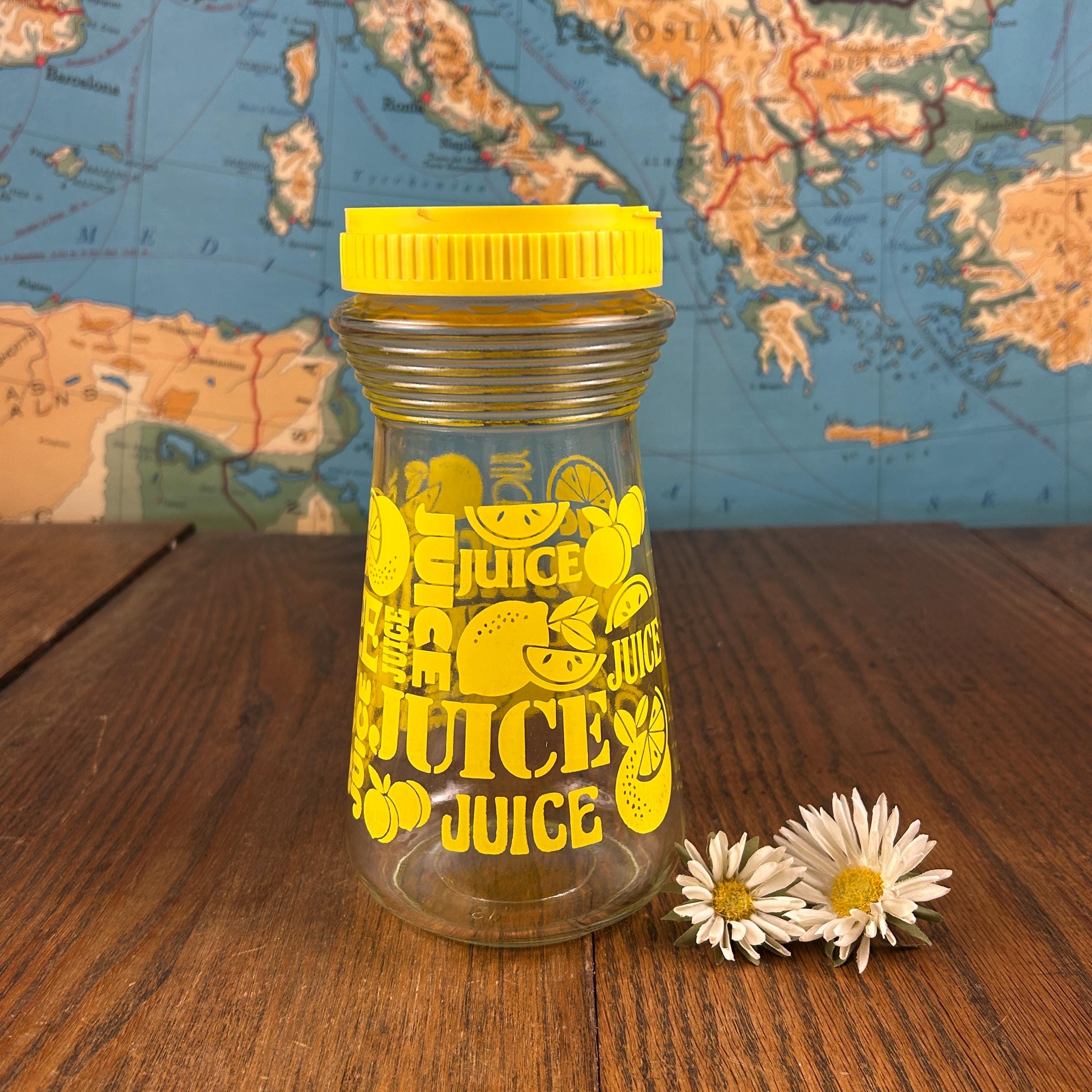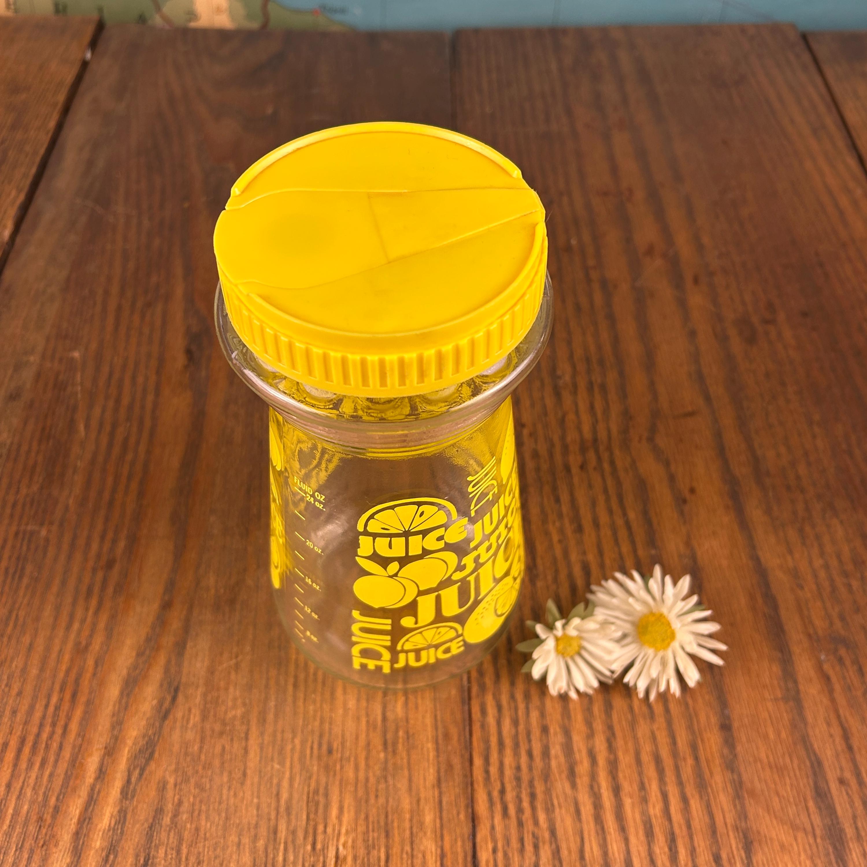 This is a vintage Anchor Hocking lemon juice pitcher / carafe, featuring a bright yellow plastic snap-top lid and cheerful stylized yellow lemon graphics with the word “JUICE” printed on the glass. Made in the United States, this design is a fun and functional example of 1970s kitchenware.