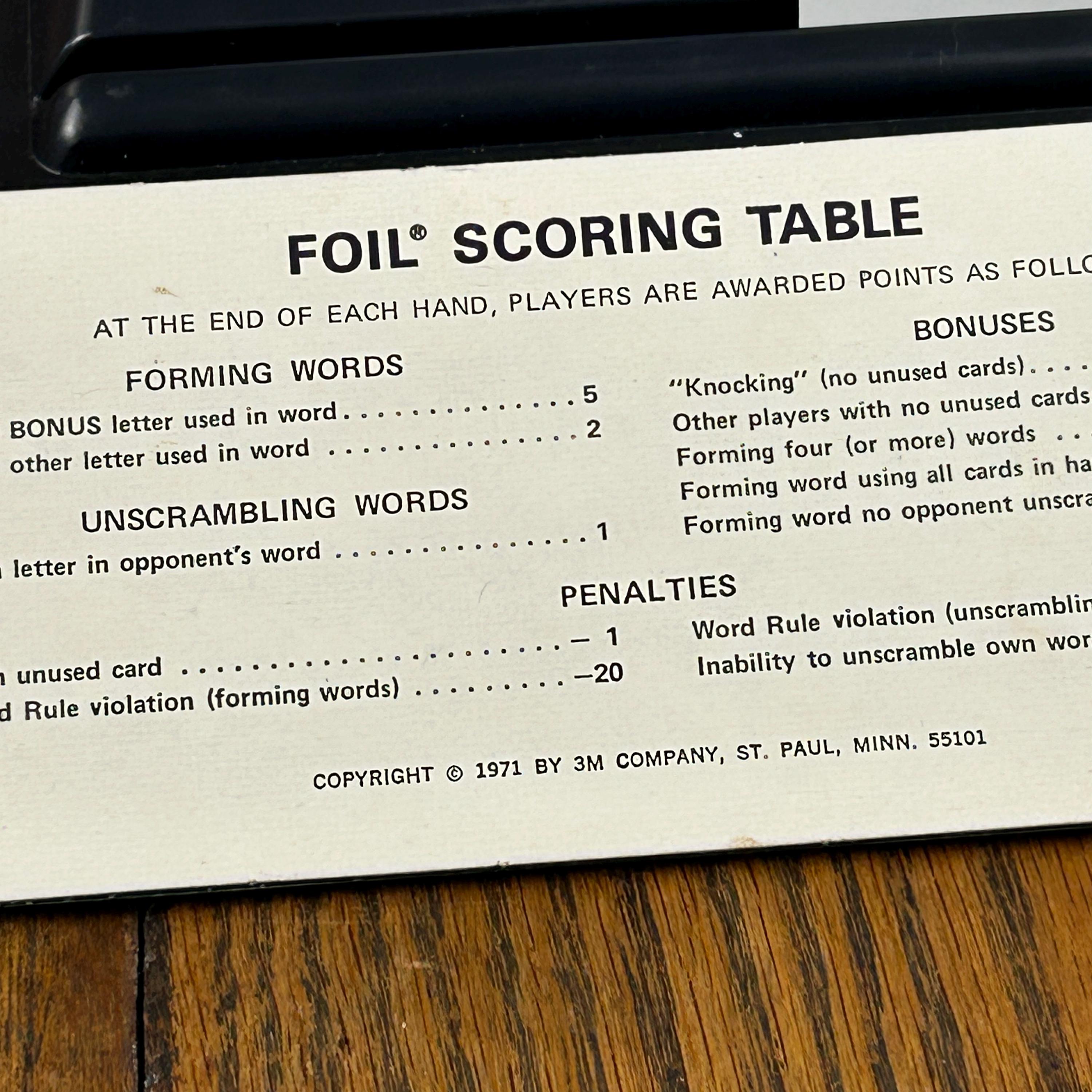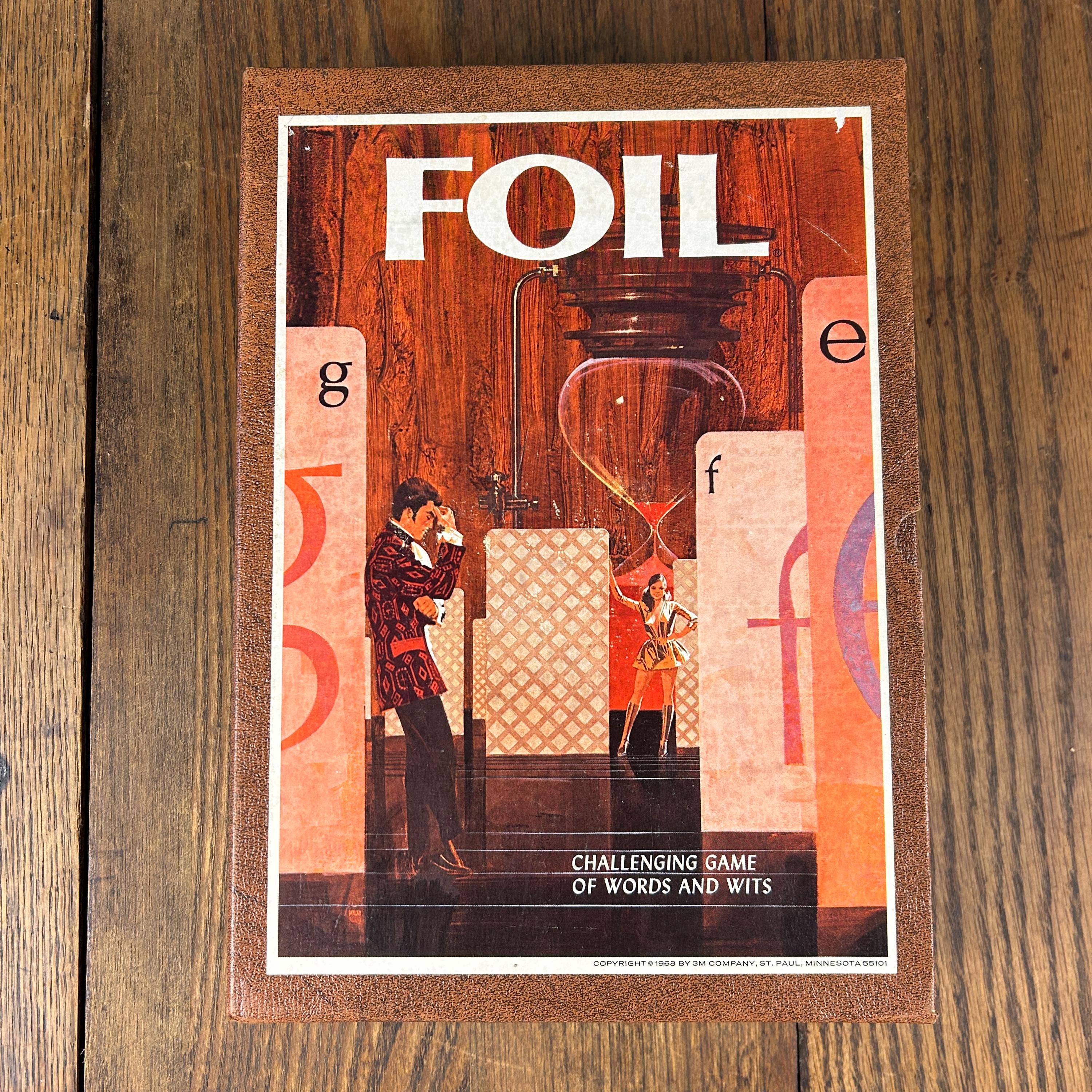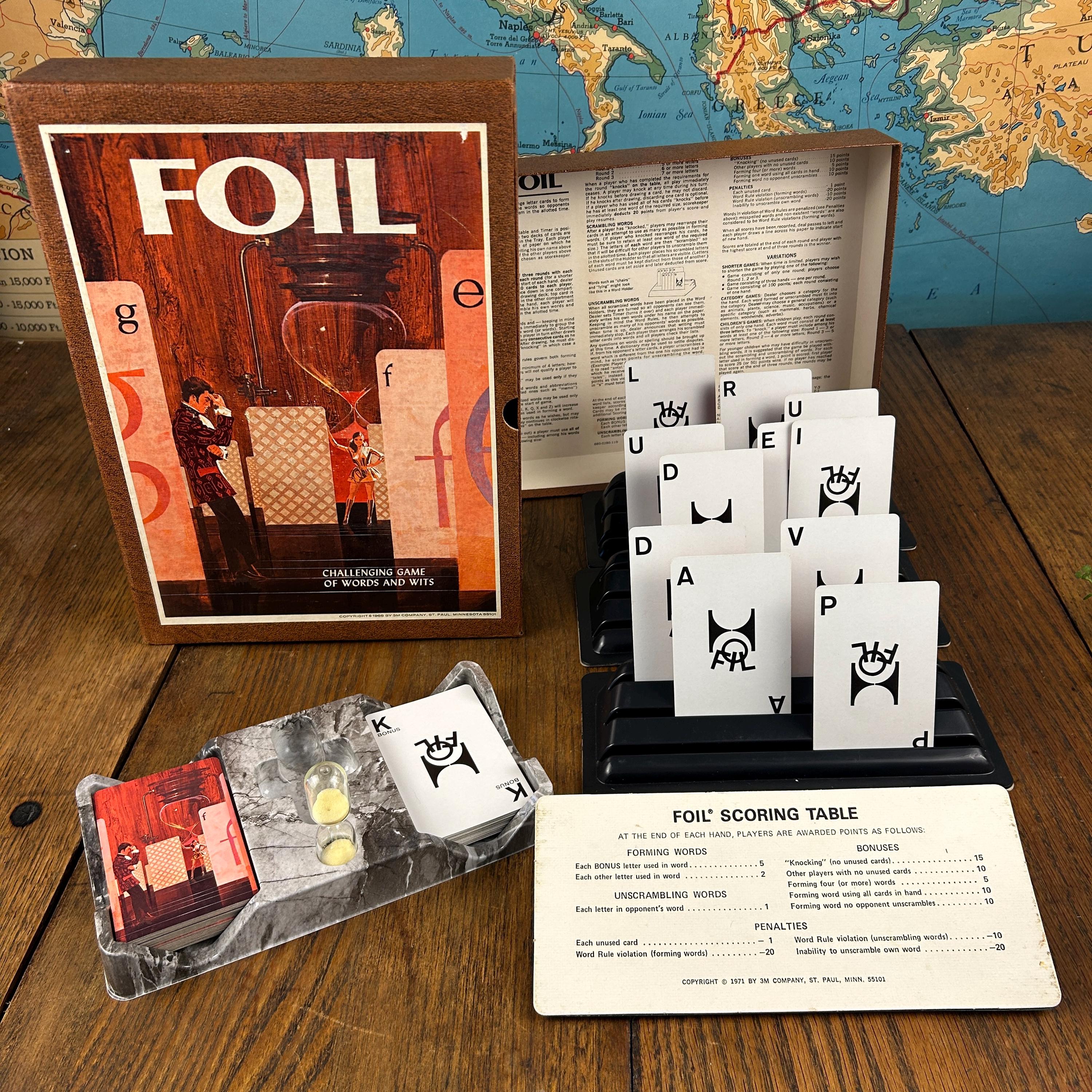 This is a vintage 1968 Foil card game, produced by Minnesota Mining and Manufacturing Company as part of their highly collectible Bookshelf Games series. Foil is a strategy-based word card game that challenges players to form words using letter cards from their hand, blending vocabulary skills with tactical play.
