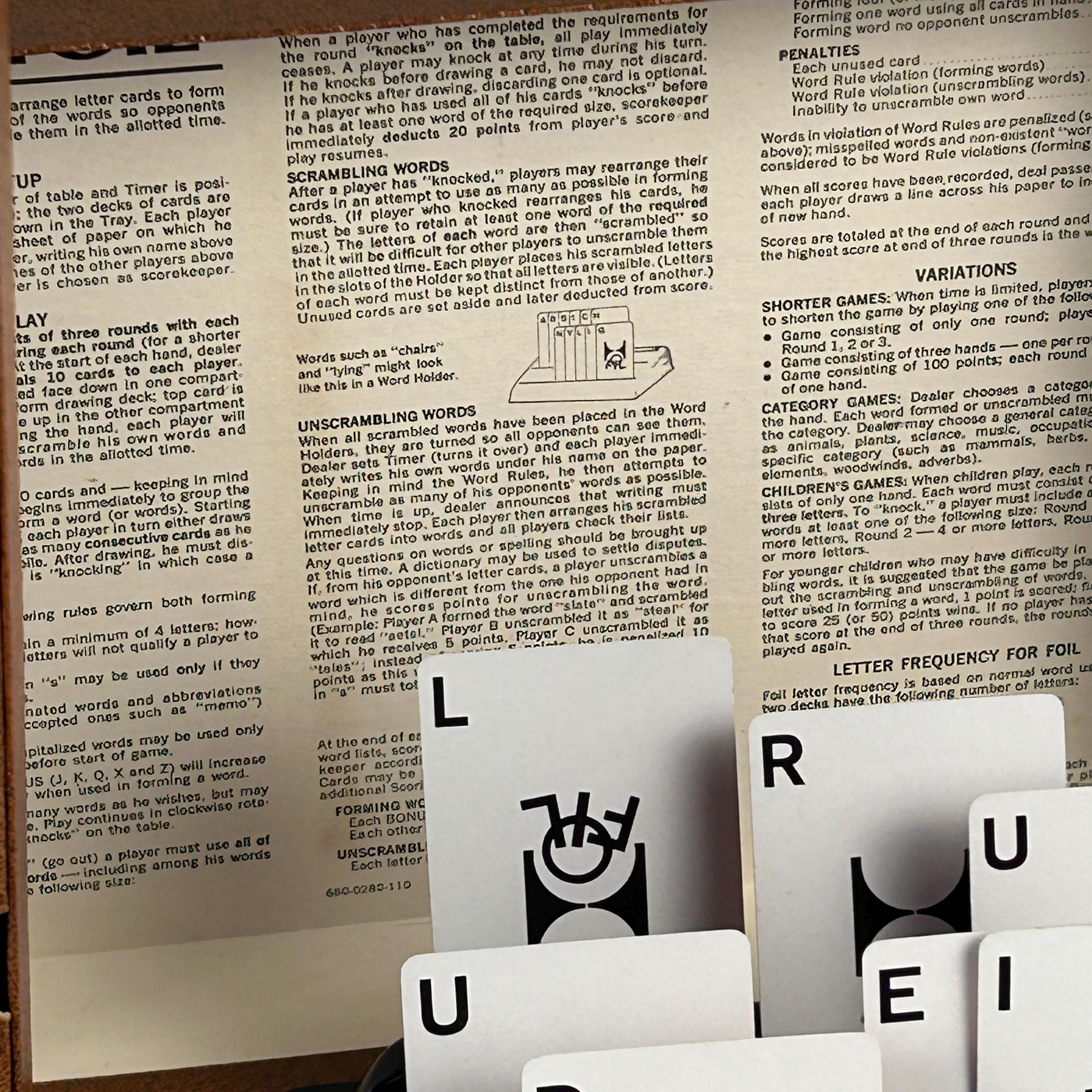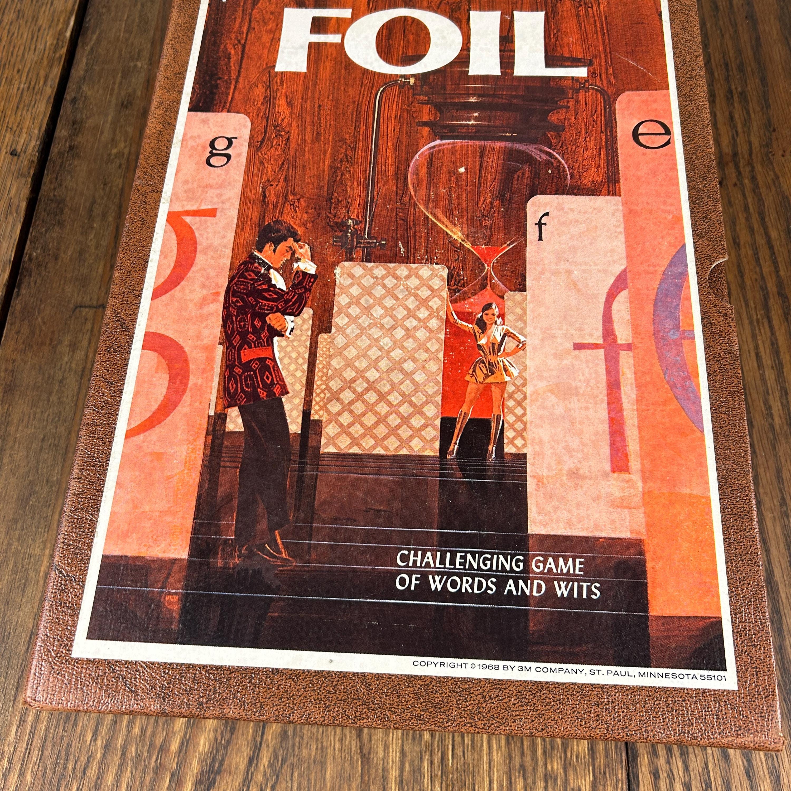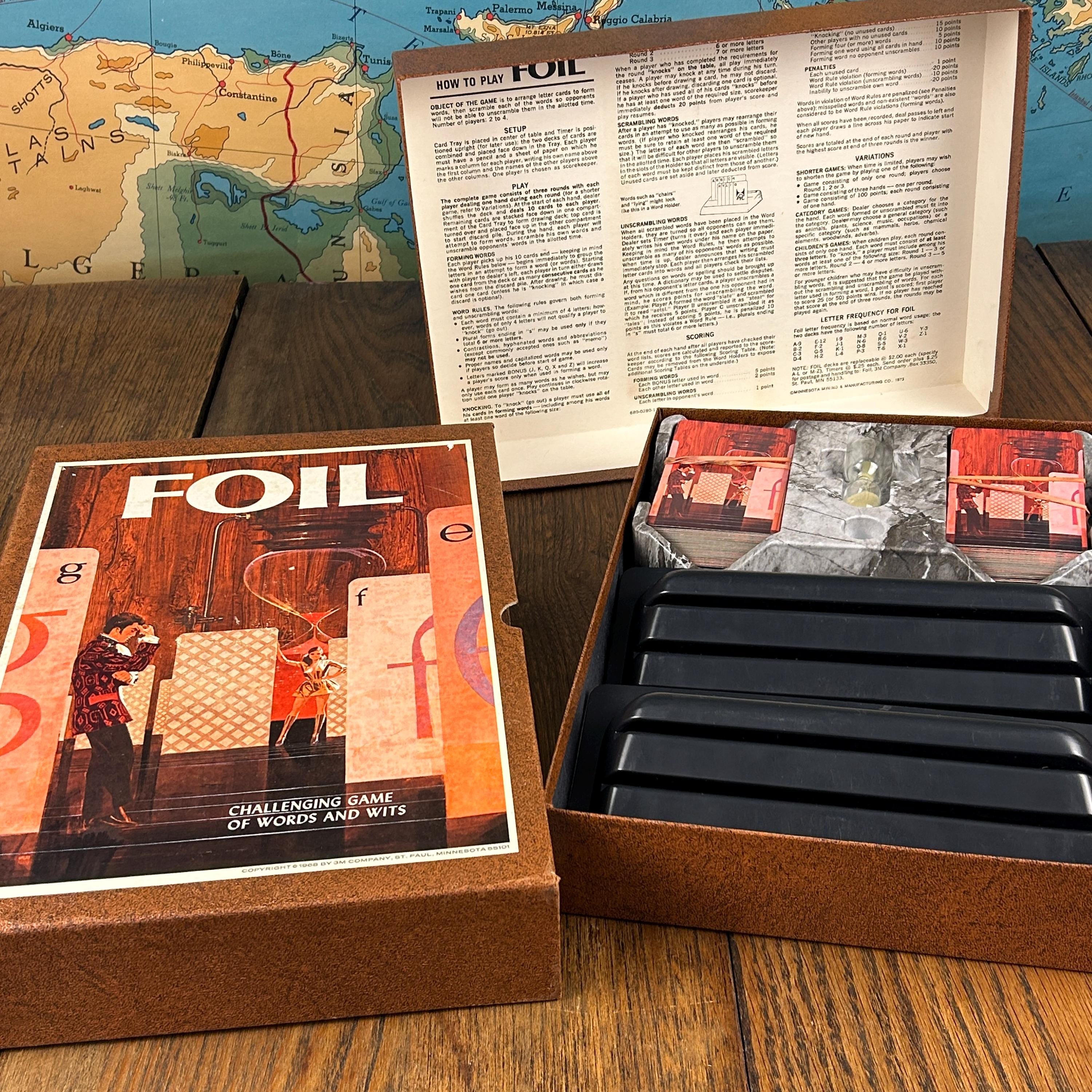 This is a vintage 1968 Foil card game, produced by Minnesota Mining and Manufacturing Company as part of their highly collectible Bookshelf Games series. Foil is a strategy-based word card game that challenges players to form words using letter cards from their hand, blending vocabulary skills with tactical play.