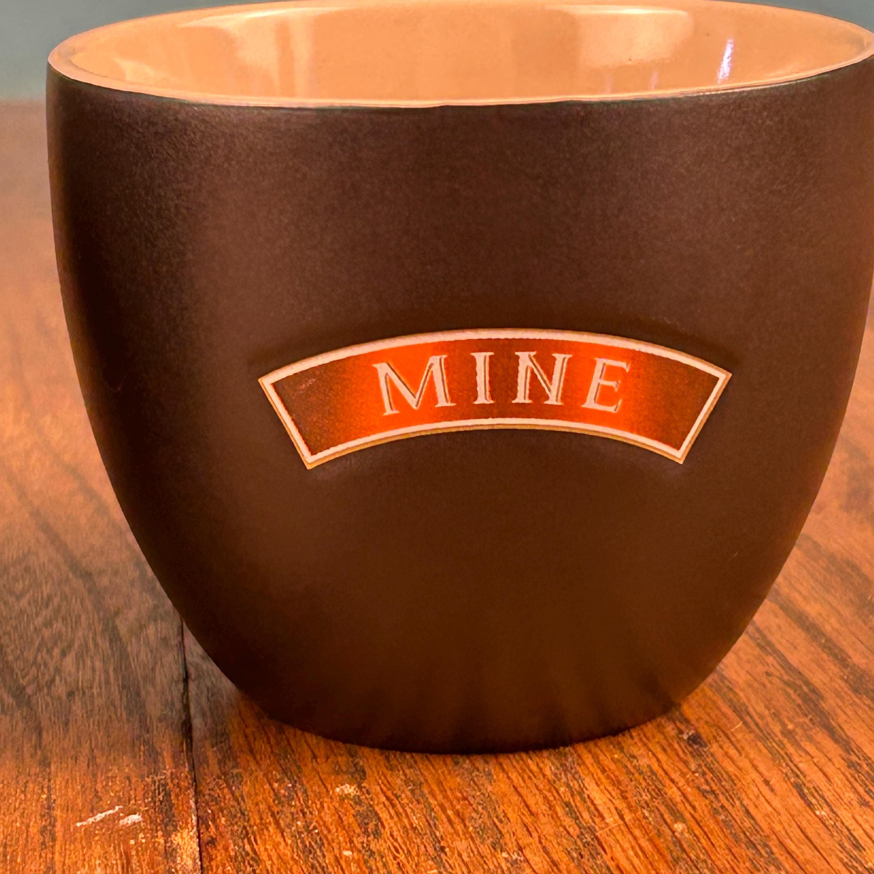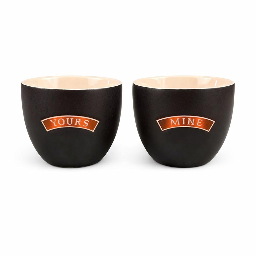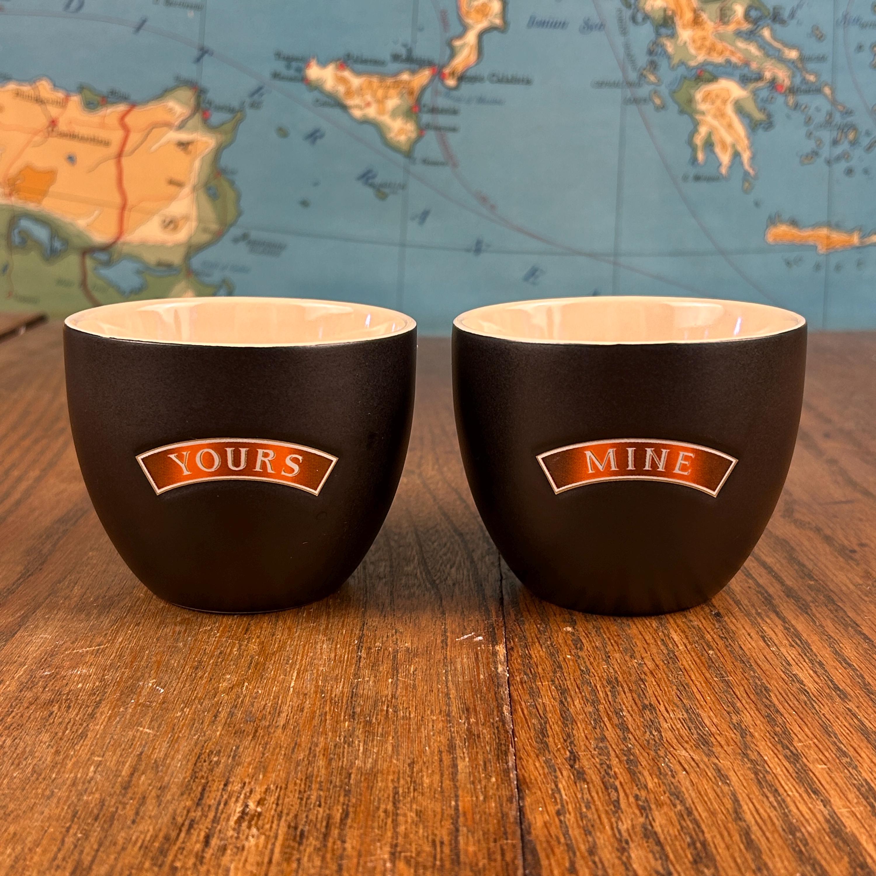 This is a set of vintage ceramic “Yours and Mine” cups by Baileys Irish Cream. The pair features a sleek matte black exterior with a warm tan interior, each cup clearly labeled “Yours” and “Mine”—a fun and cozy design made for sharing.
