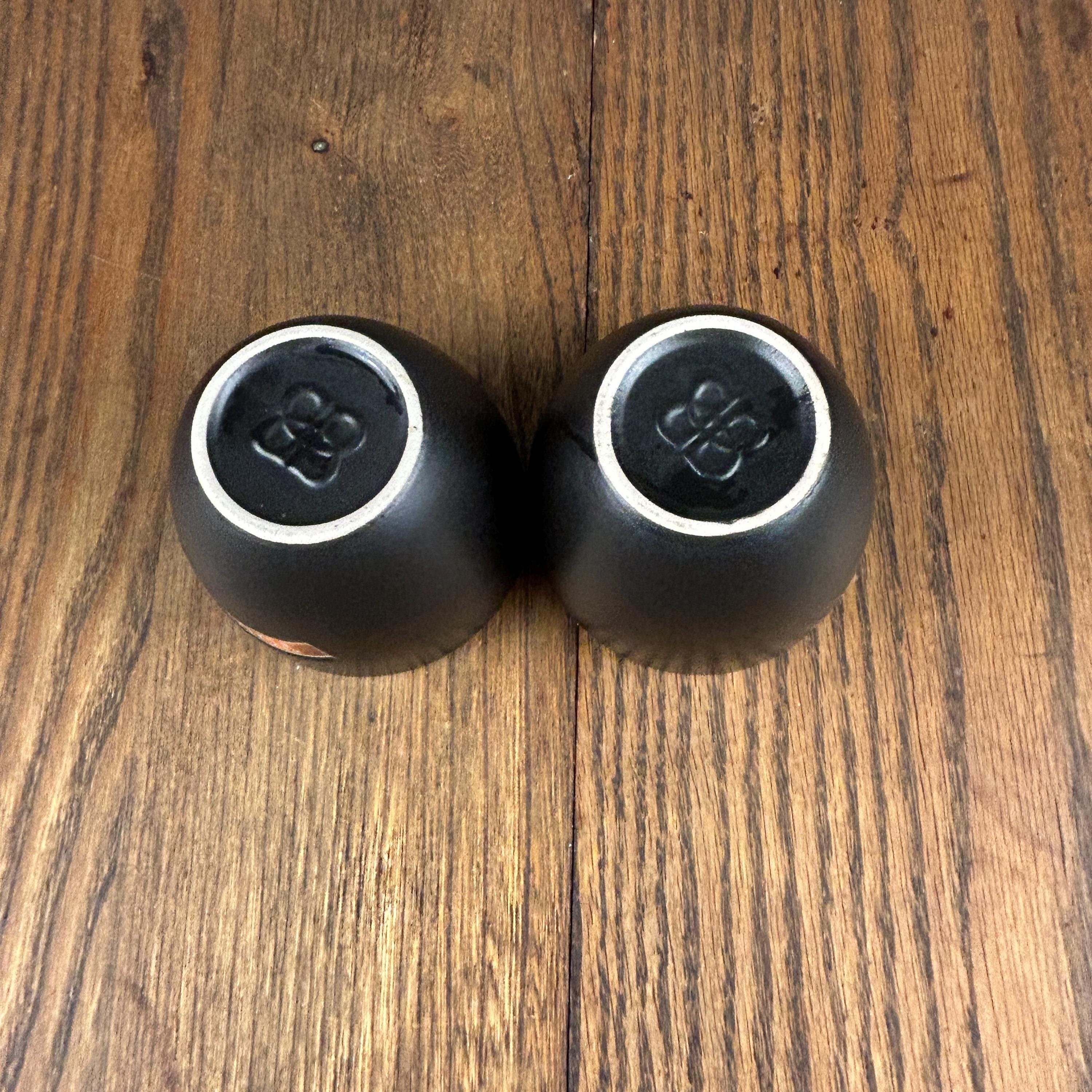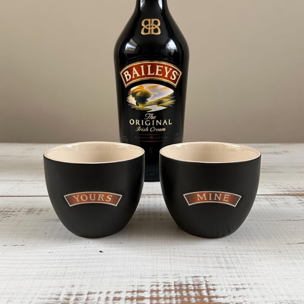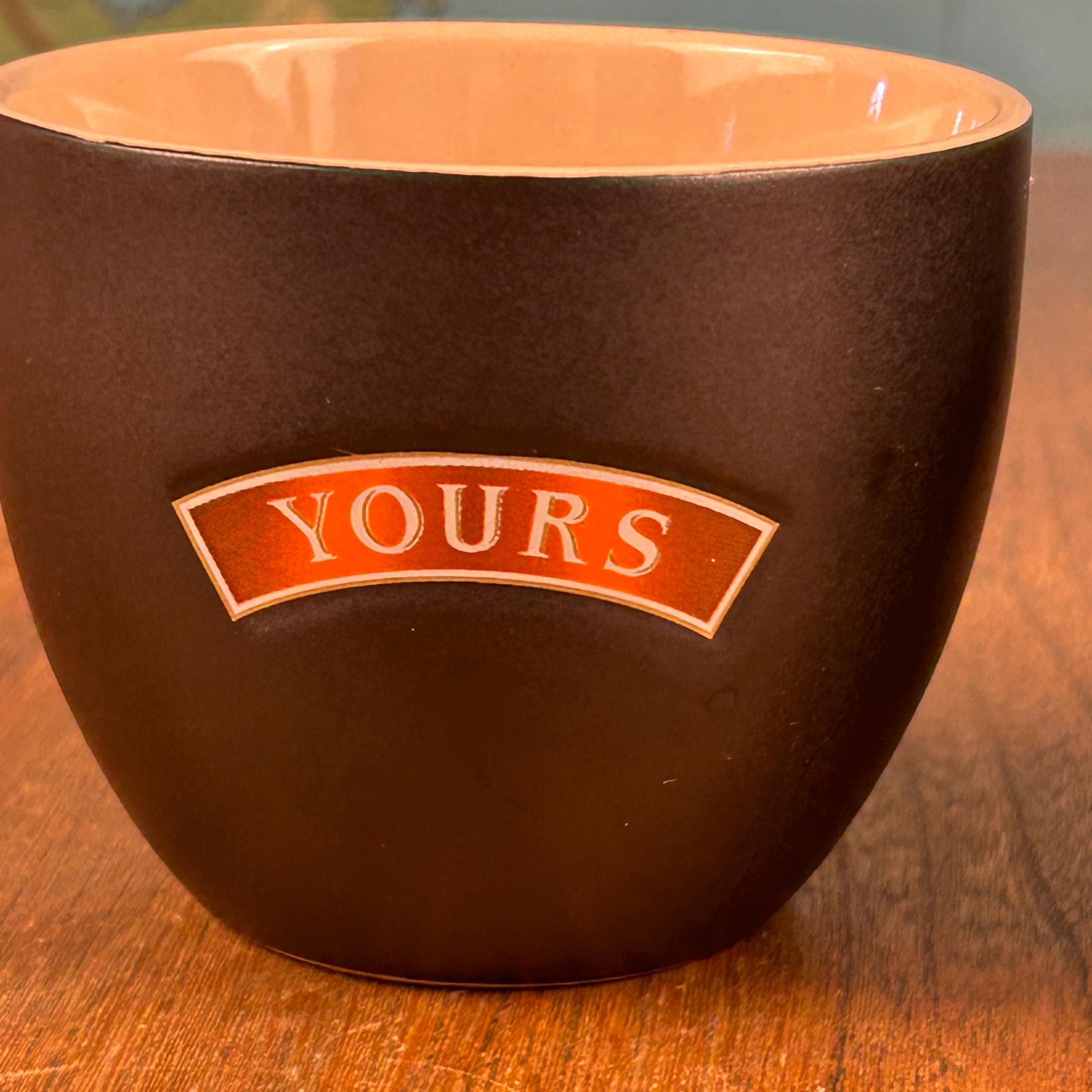 This is a set of vintage ceramic “Yours and Mine” cups by Baileys Irish Cream. The pair features a sleek matte black exterior with a warm tan interior, each cup clearly labeled “Yours” and “Mine”—a fun and cozy design made for sharing.