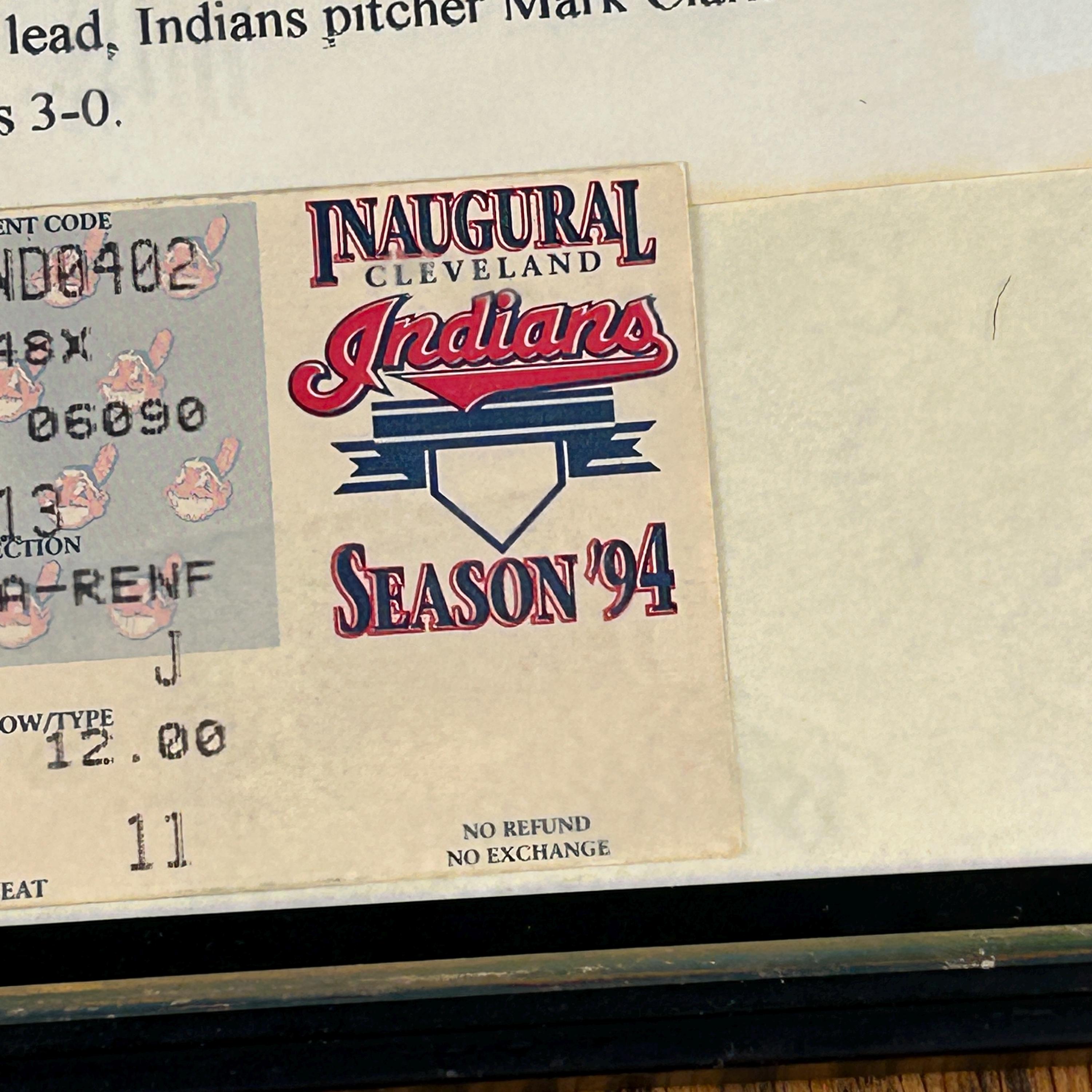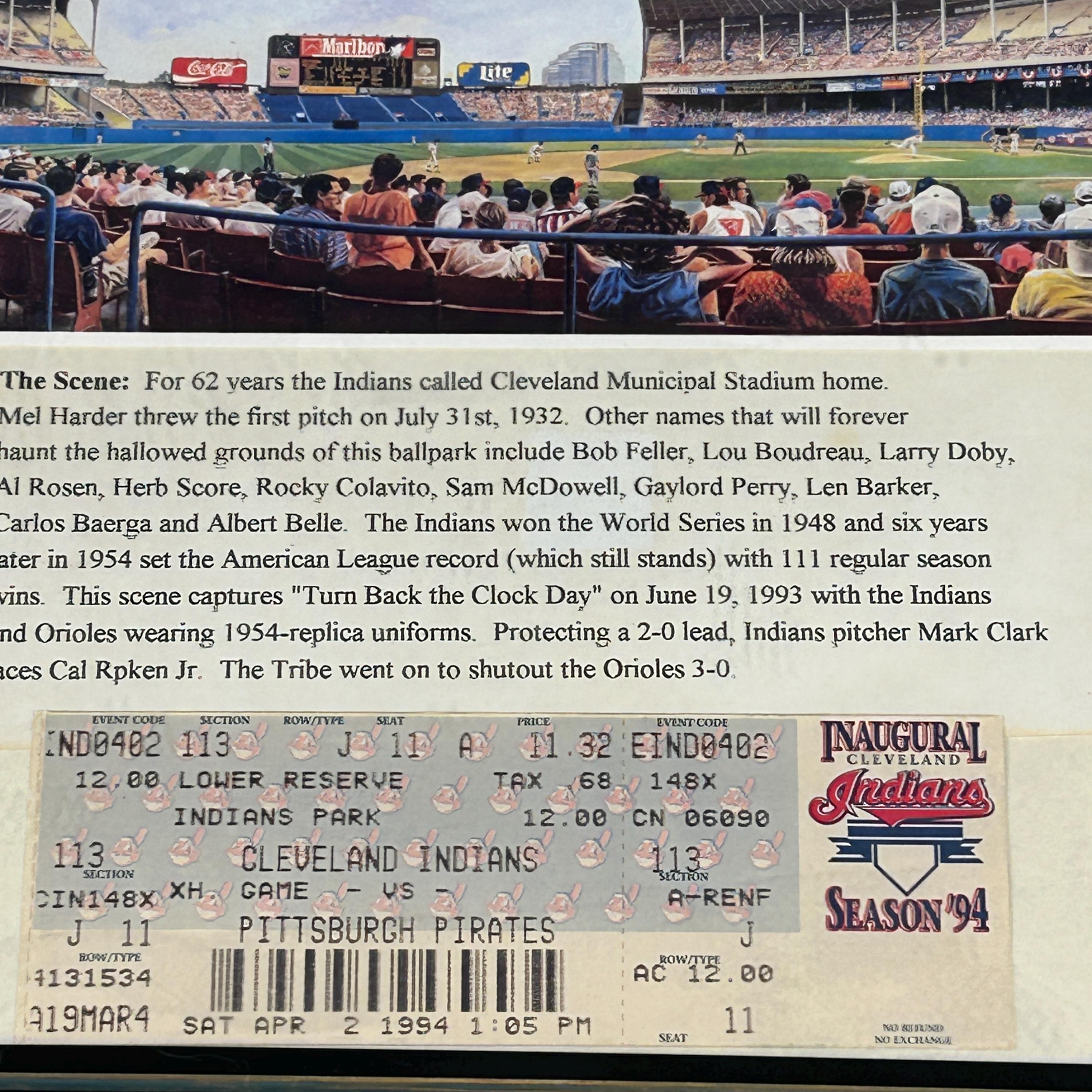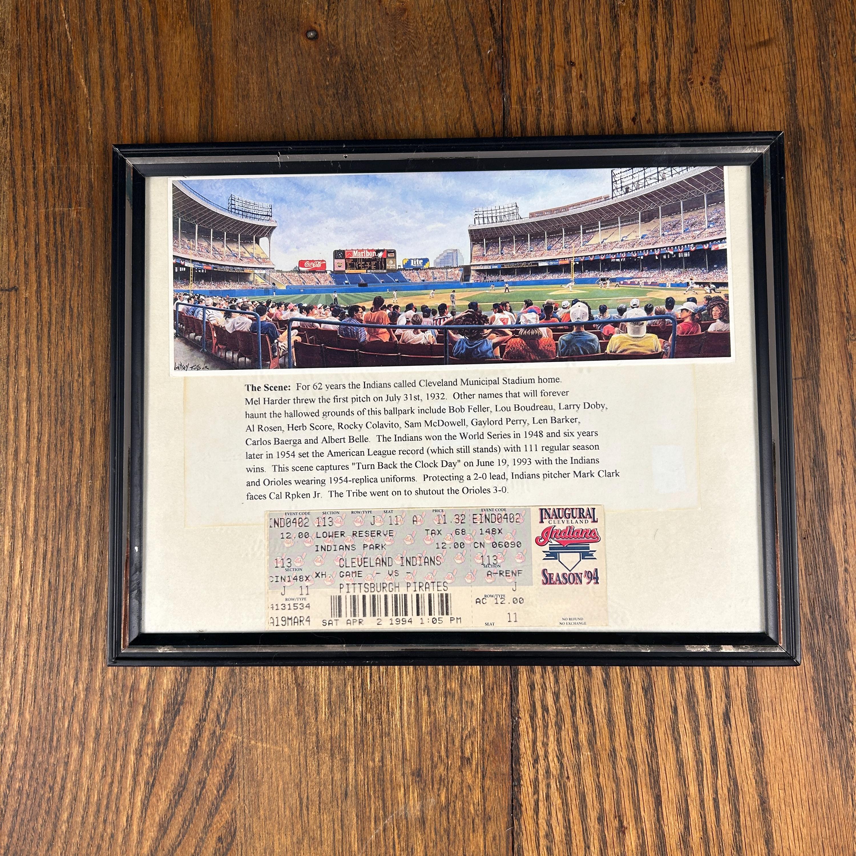 This framed 1994 Cleveland Indians Inaugural Game Ticket is accompanied by a vintage photos of the Cleveland Municipal Stadium. The photo captures the "Turn Back the Clock Day" on June 19, 1993 with the Indians and Orioles wearing 1954-replica uniforms. Great baseball and Cleveland Indians memorabilia. Framed and ready to hang on your sports wall.