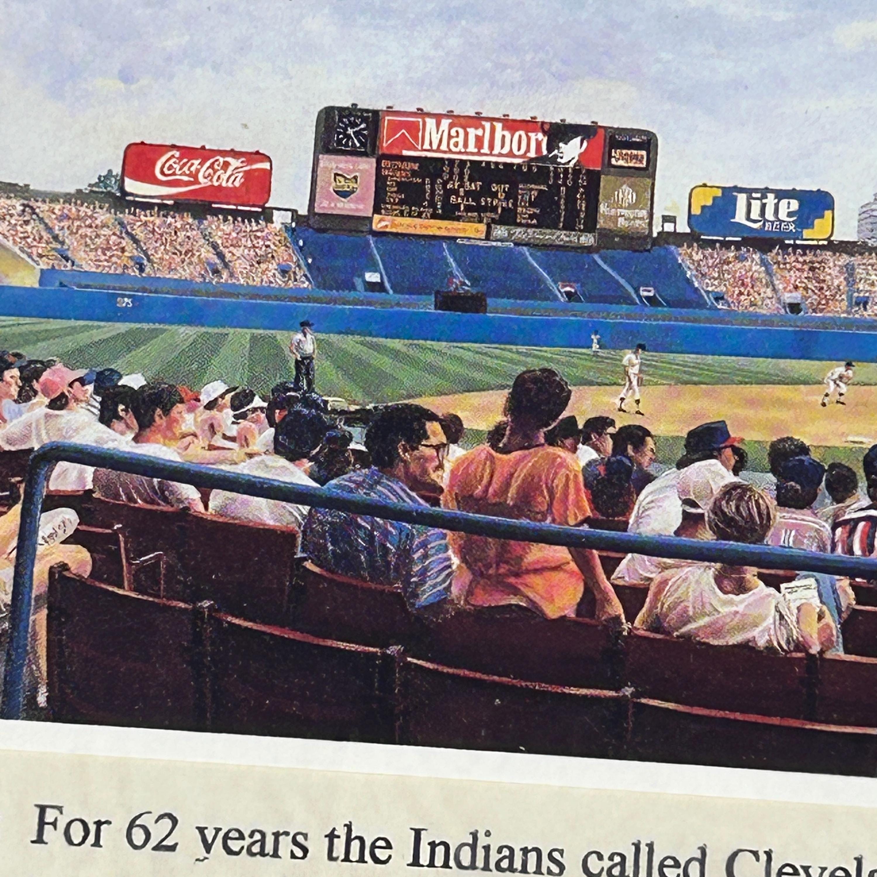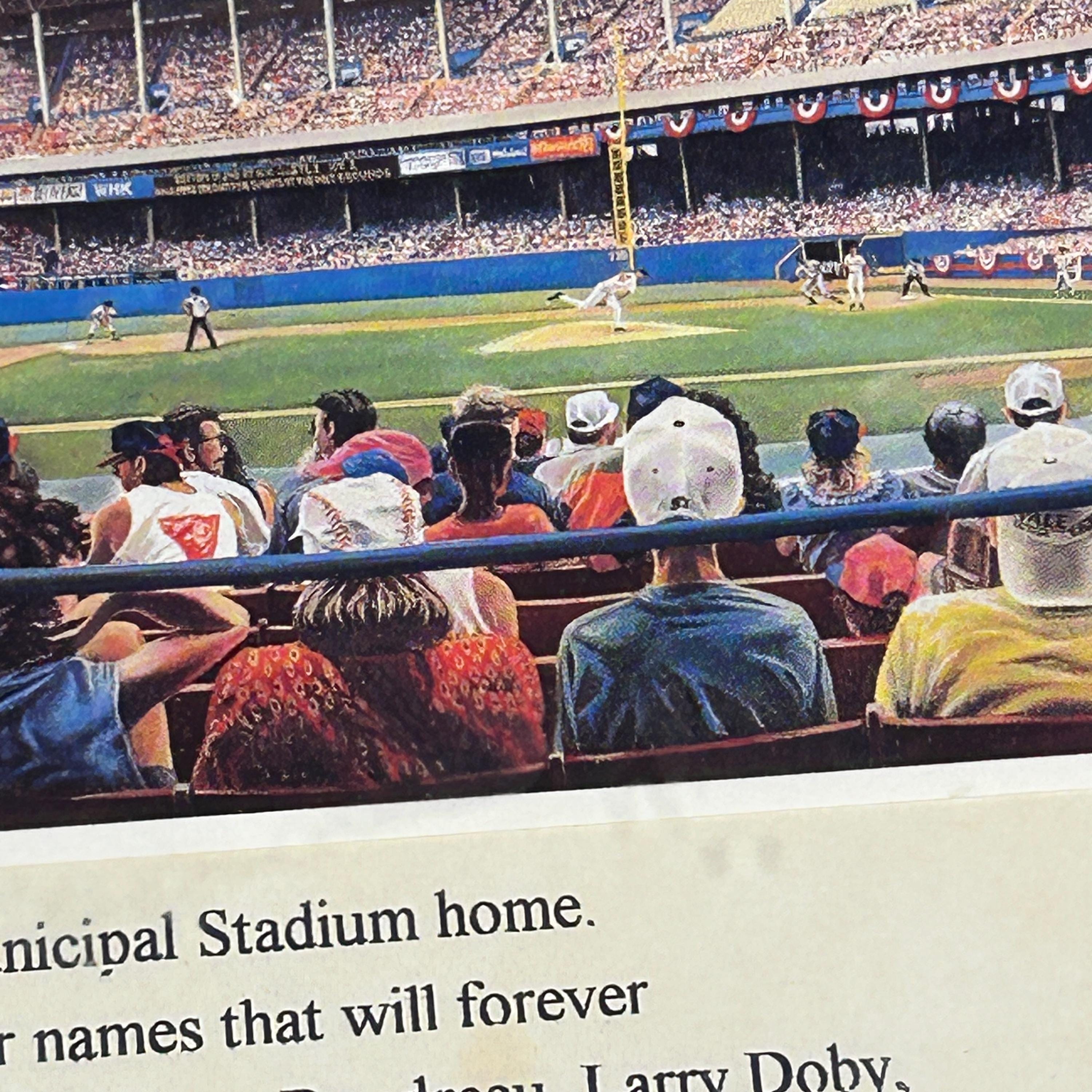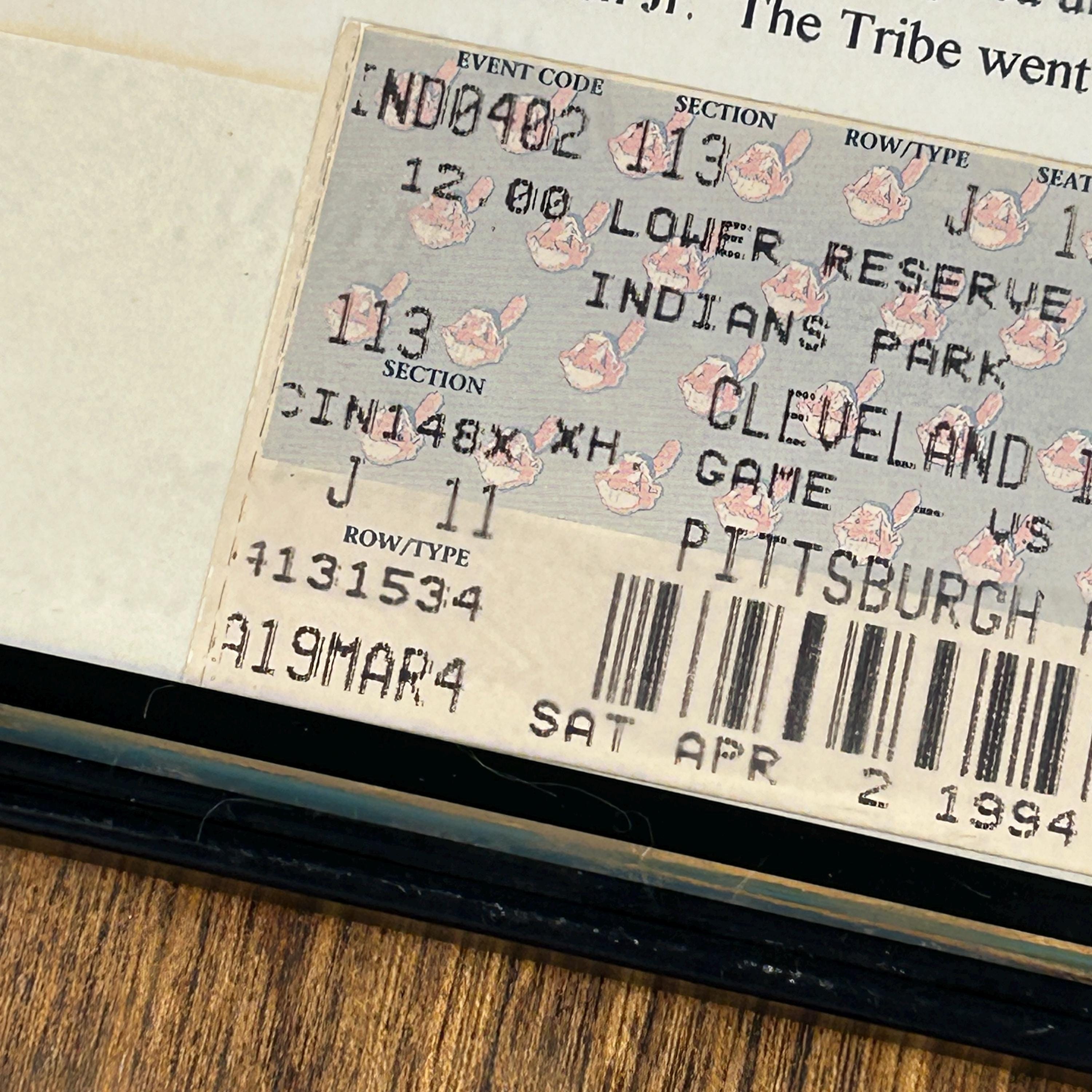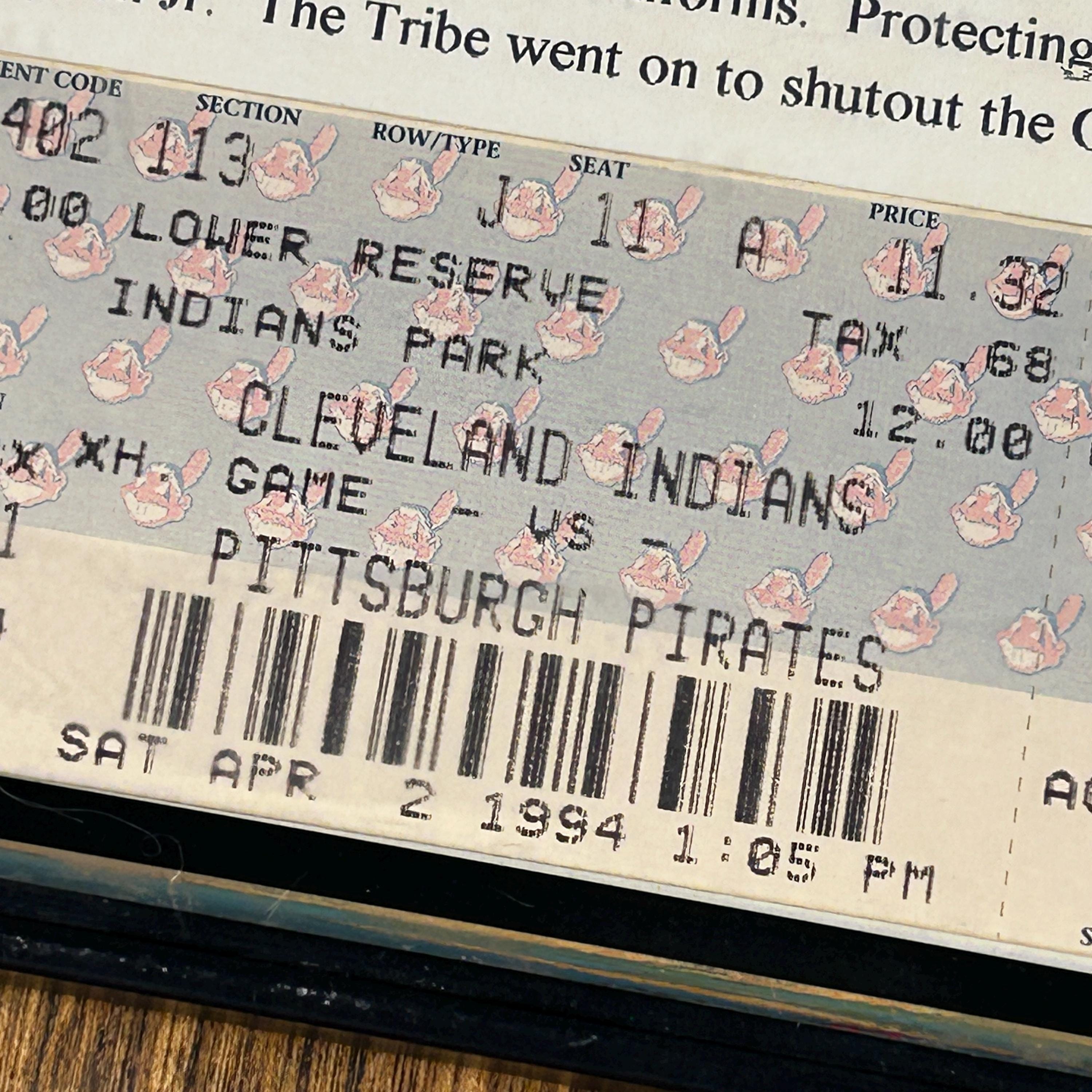 This framed 1994 Cleveland Indians Inaugural Game Ticket is accompanied by a vintage photos of the Cleveland Municipal Stadium. The photo captures the "Turn Back the Clock Day" on June 19, 1993 with the Indians and Orioles wearing 1954-replica uniforms. Great baseball and Cleveland Indians memorabilia. Framed and ready to hang on your sports wall.