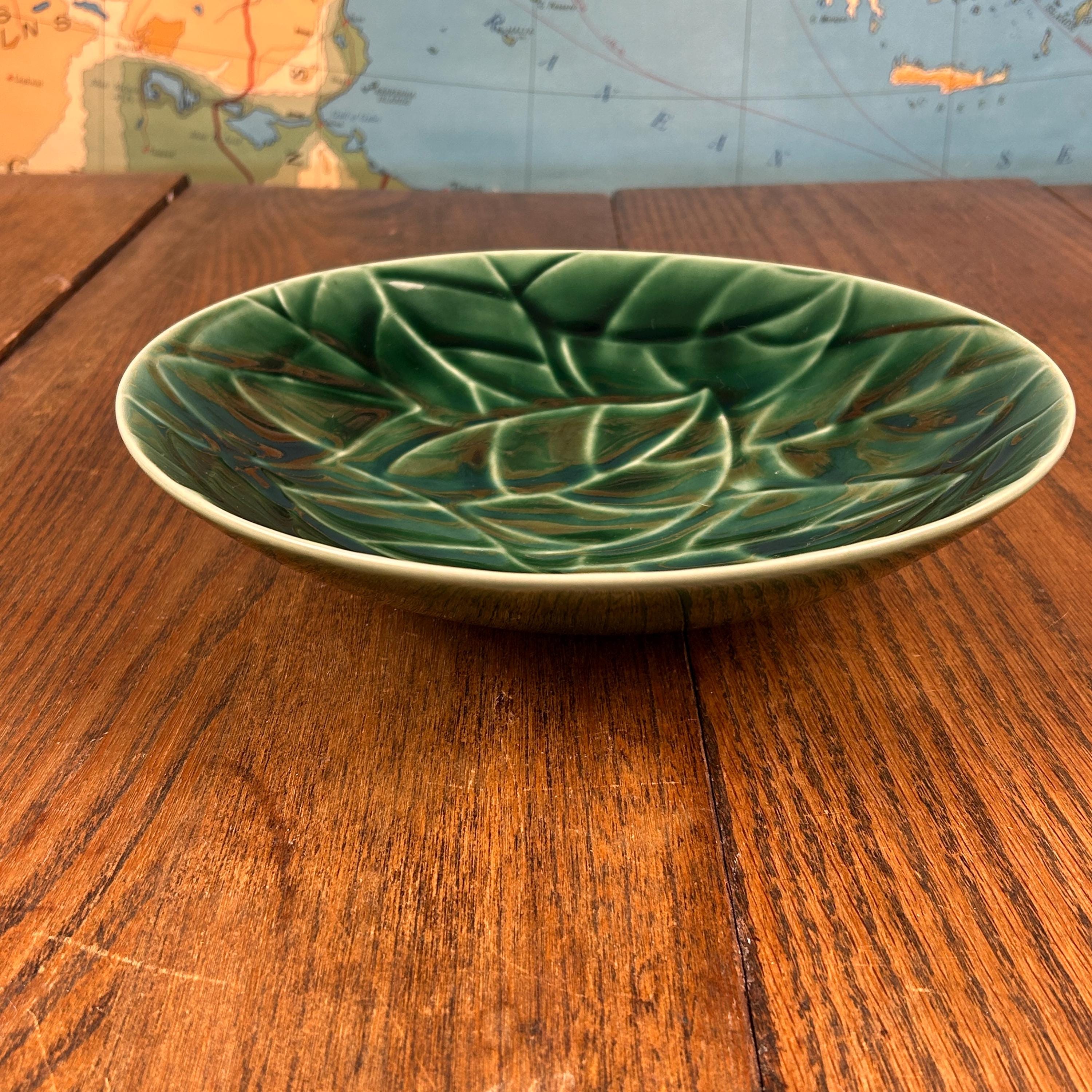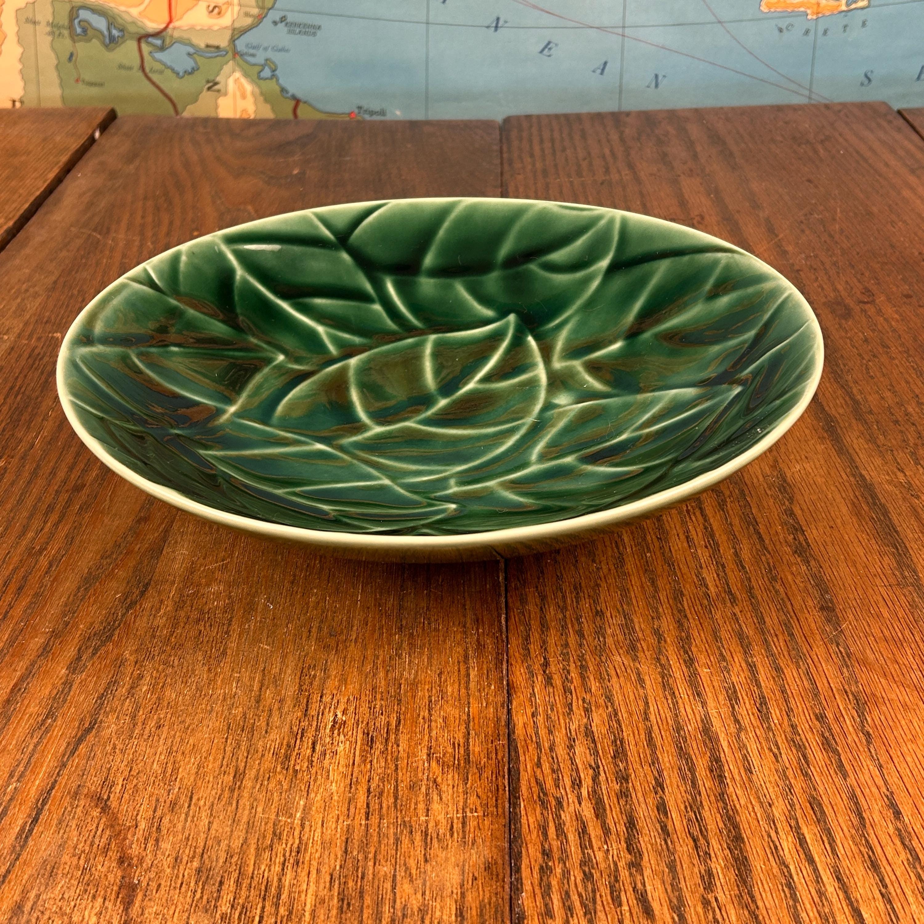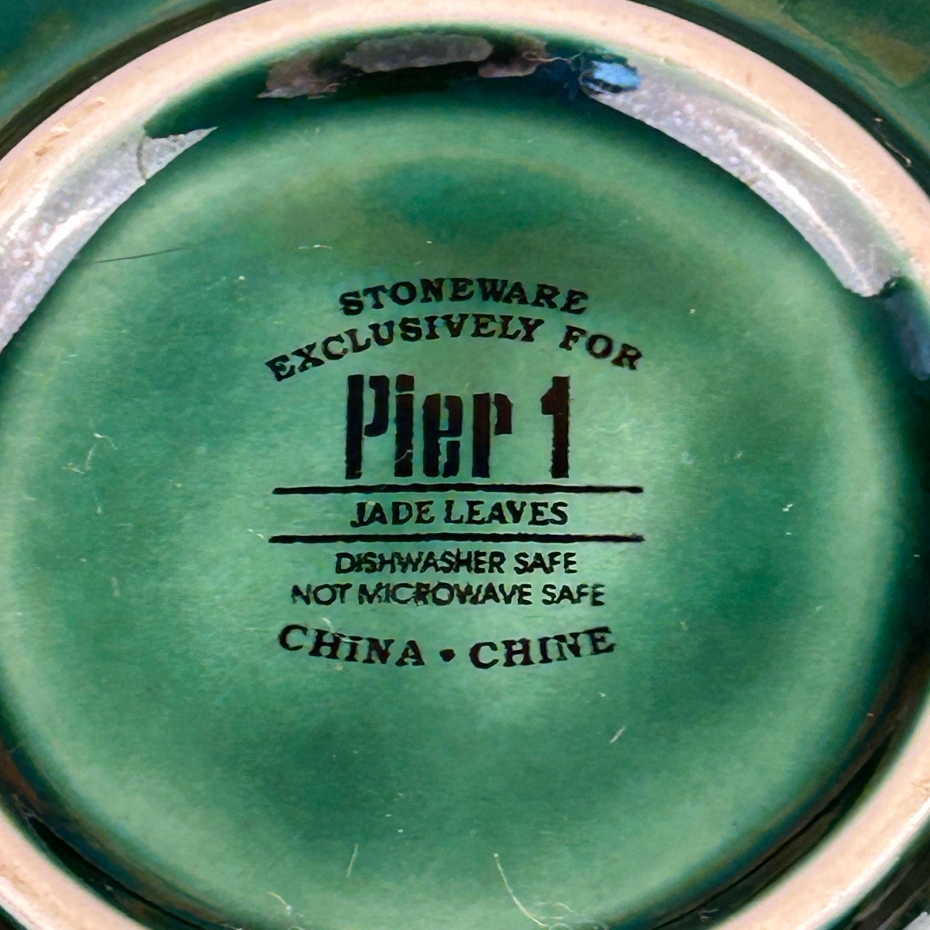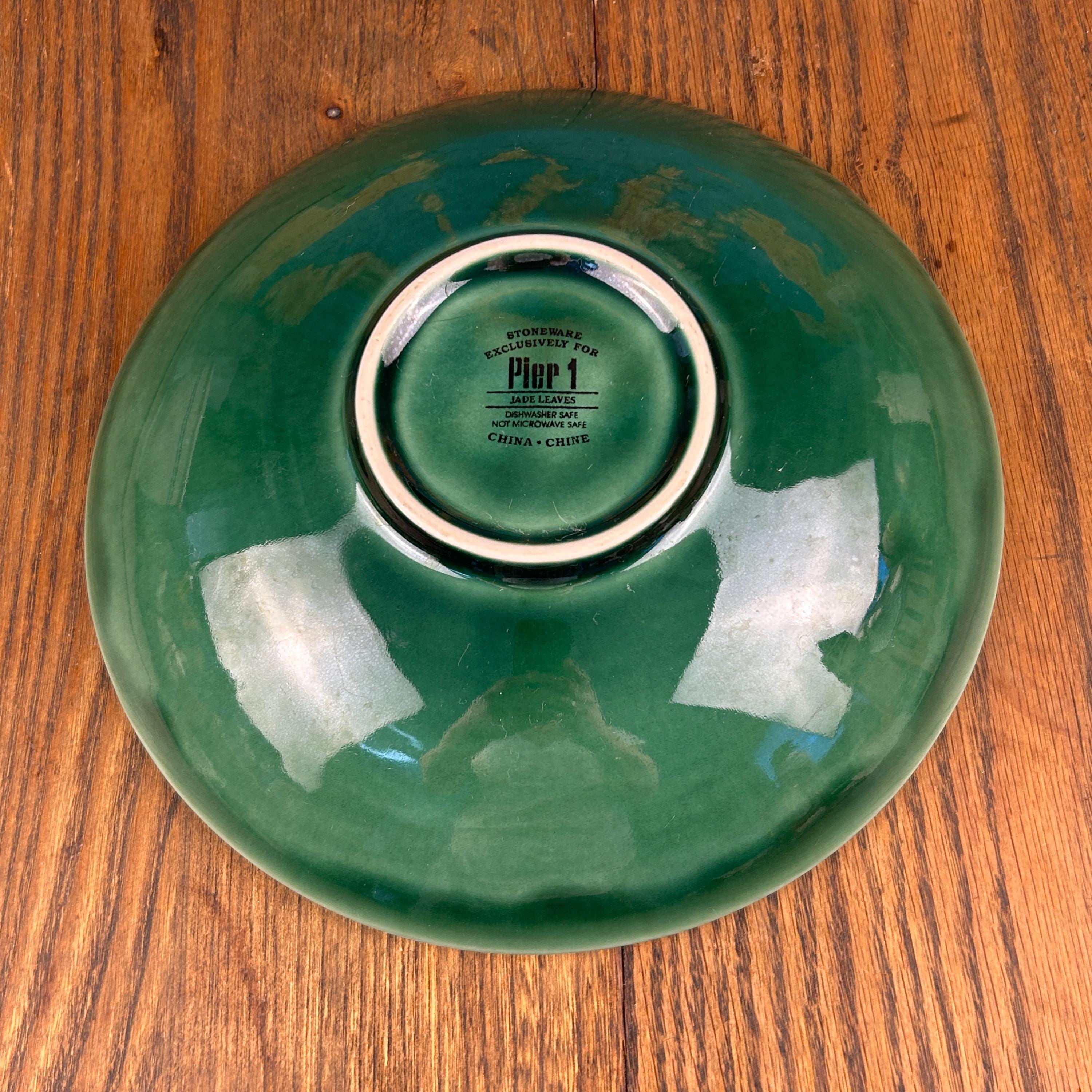 This is a large 10-inch stoneware salad serving bowl from Pier 1 Imports in the Jade Leaves pattern. The bowl features embossed green leaves on the interior, giving it rich texture and a nature-inspired look that’s both elegant and versatile.