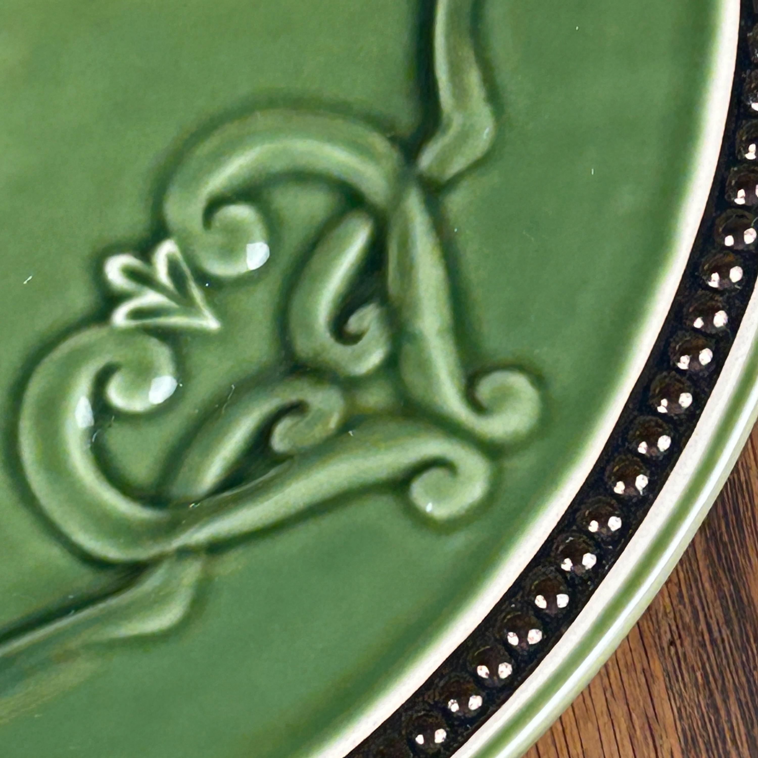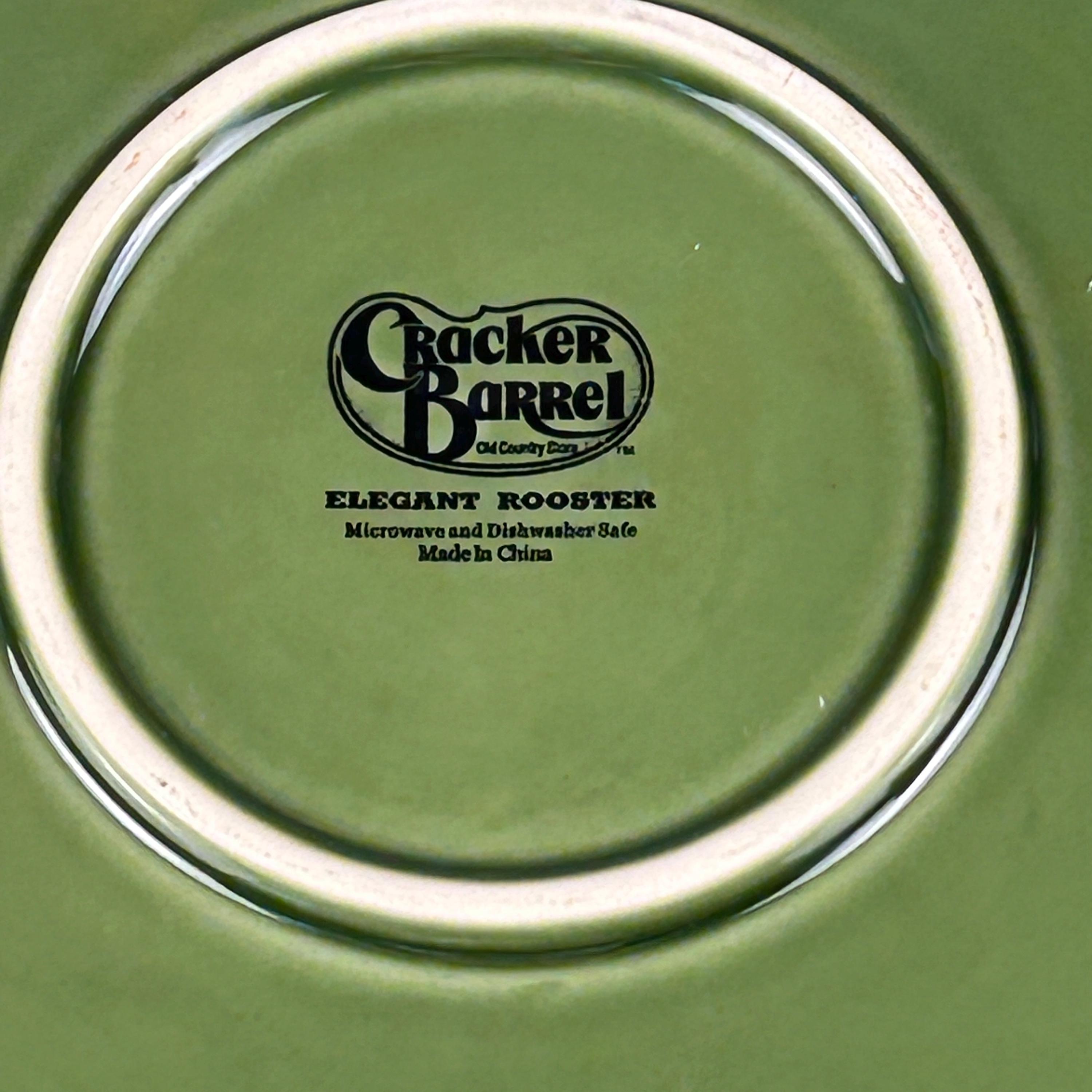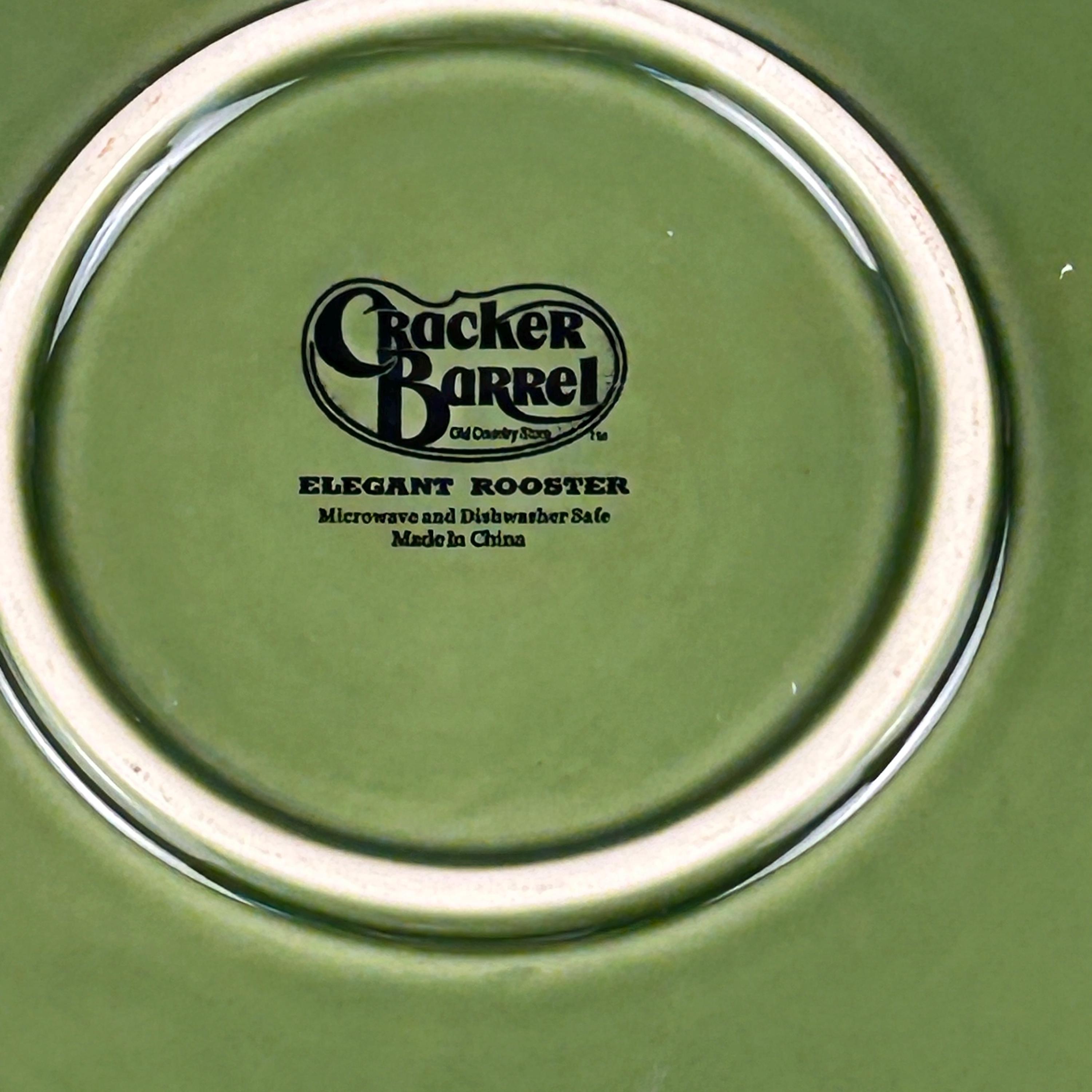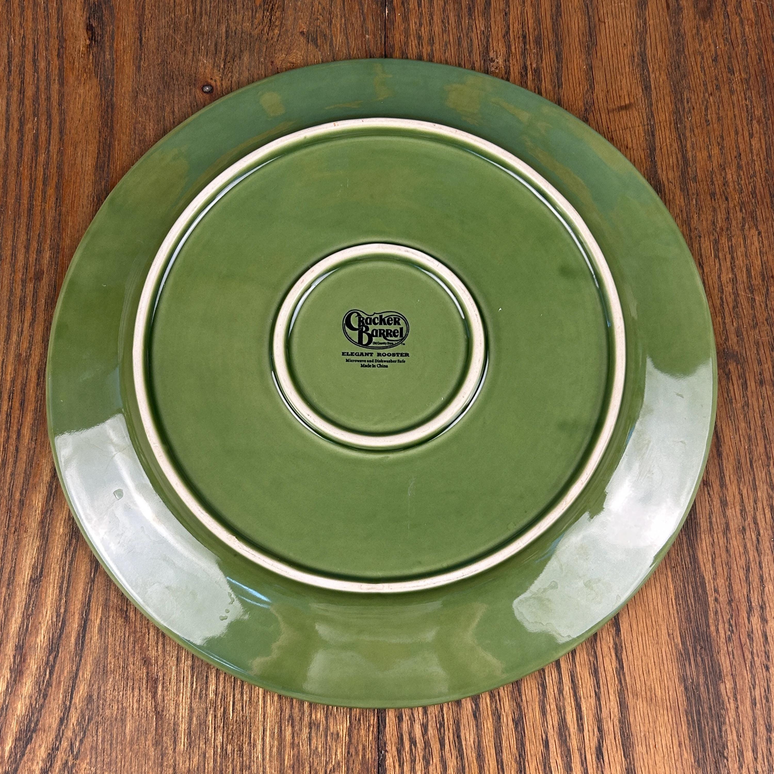 This is a vintage Cracker Barrel dinner plate in the Elegant Rooster pattern, a discontinued stoneware design loved for its bold farmhouse style. The plate features a vibrant green glossy glaze with an embossed black rooster centered in the middle, surrounded by decorative border details that add texture and visual interest.