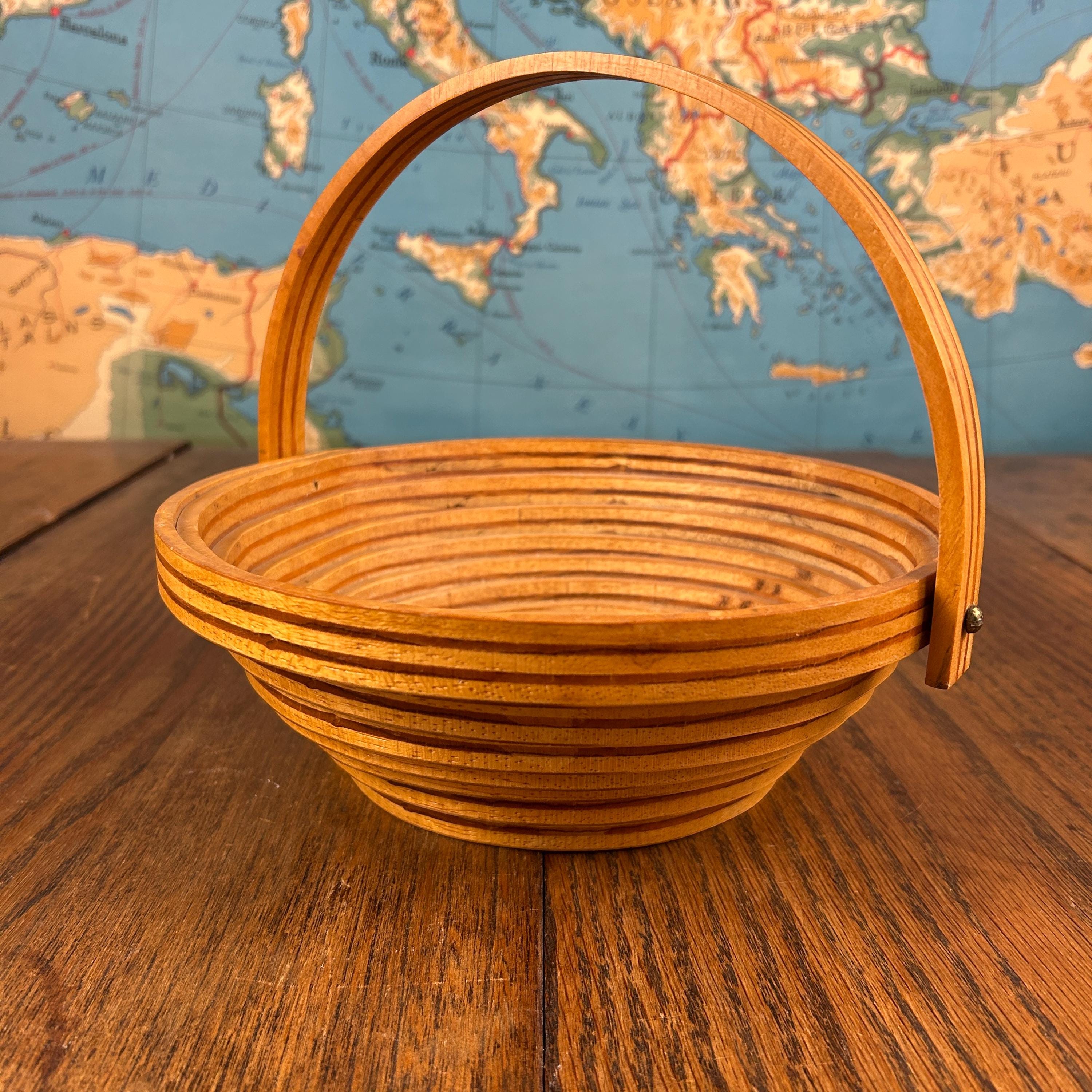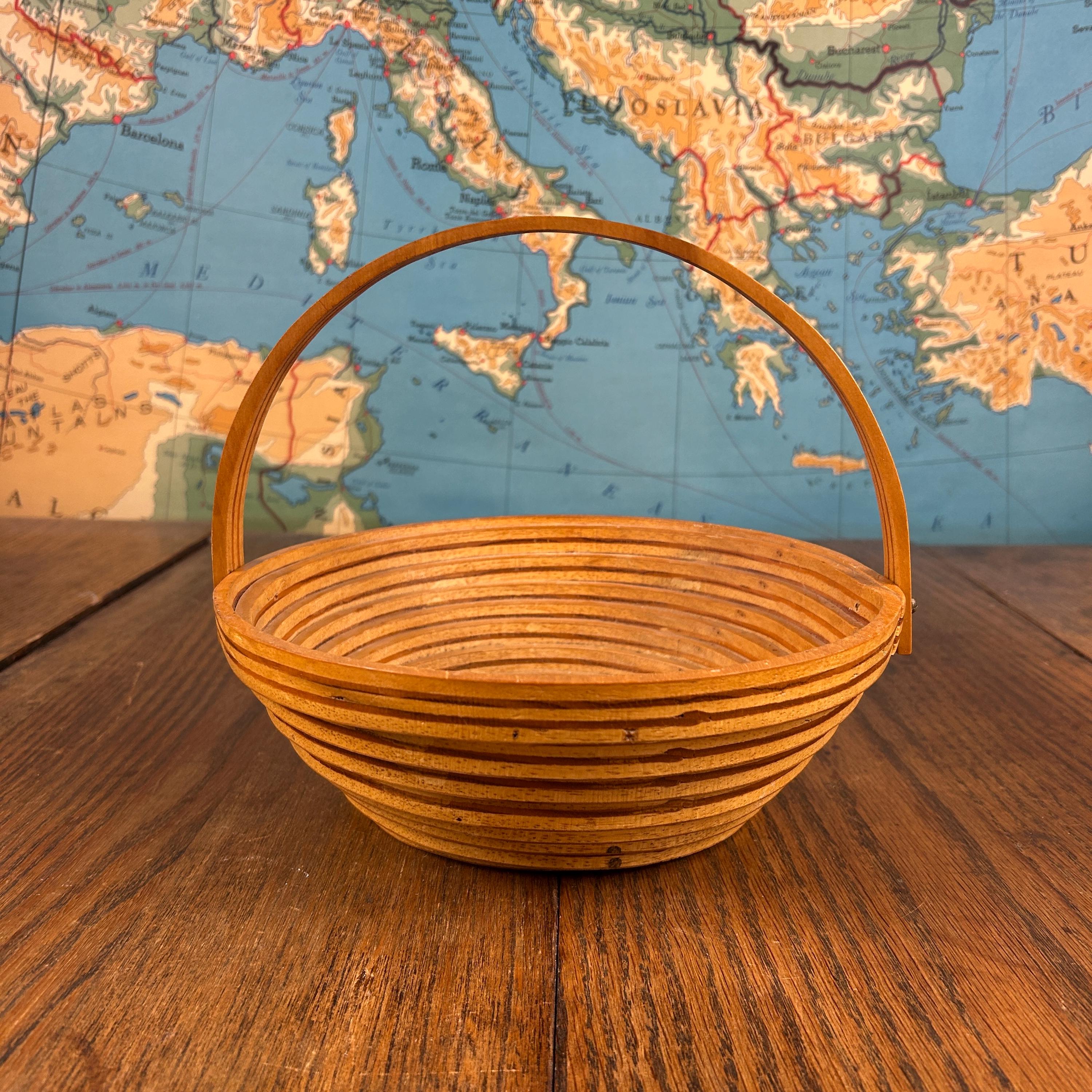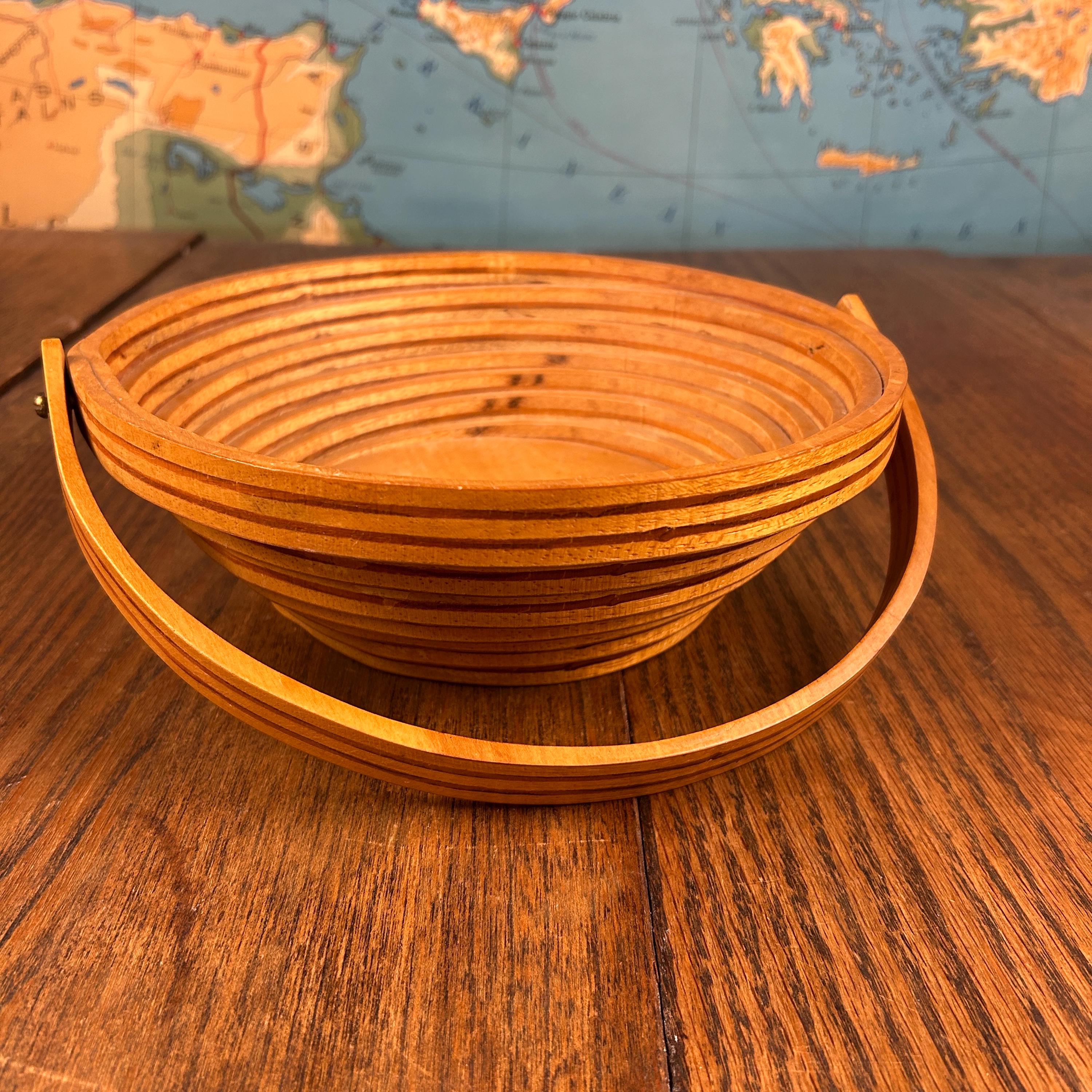 This is a handmade decorative wooden basket featuring a striking one-piece spiral-cut design. Thoughtfully crafted from solid wood with a warm stained finish, the piece includes a fold-down handle and can also be used as a trivet, blending beauty with function.