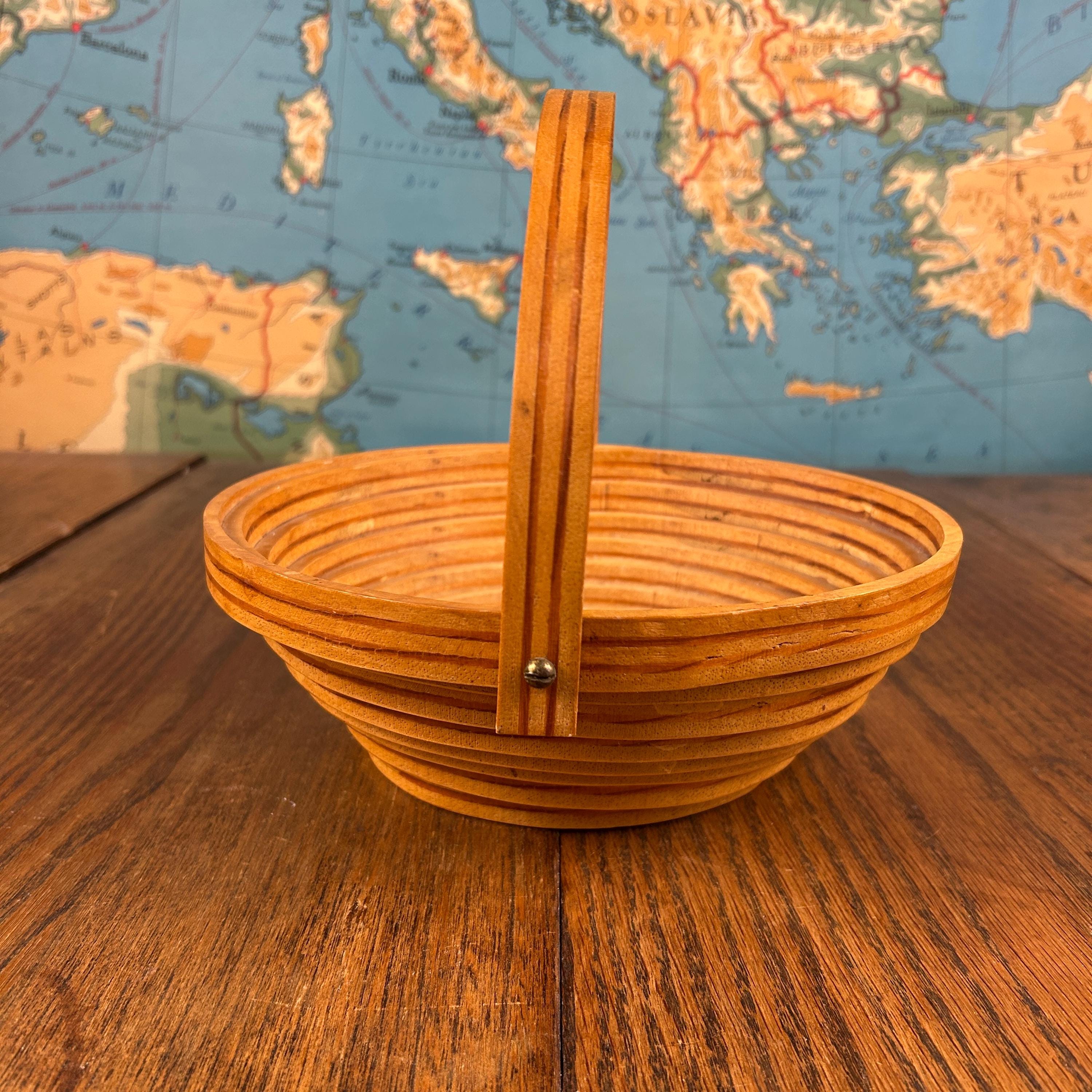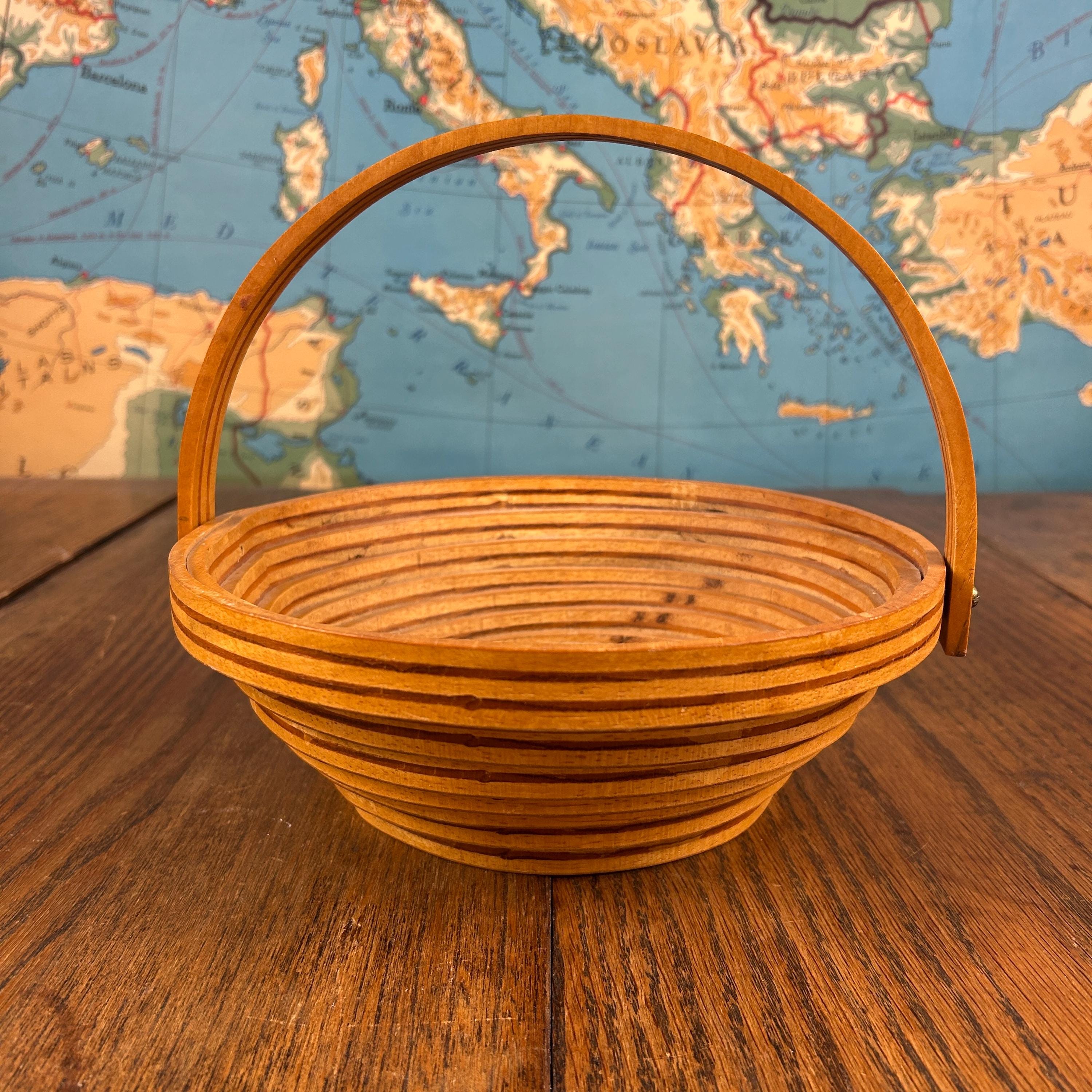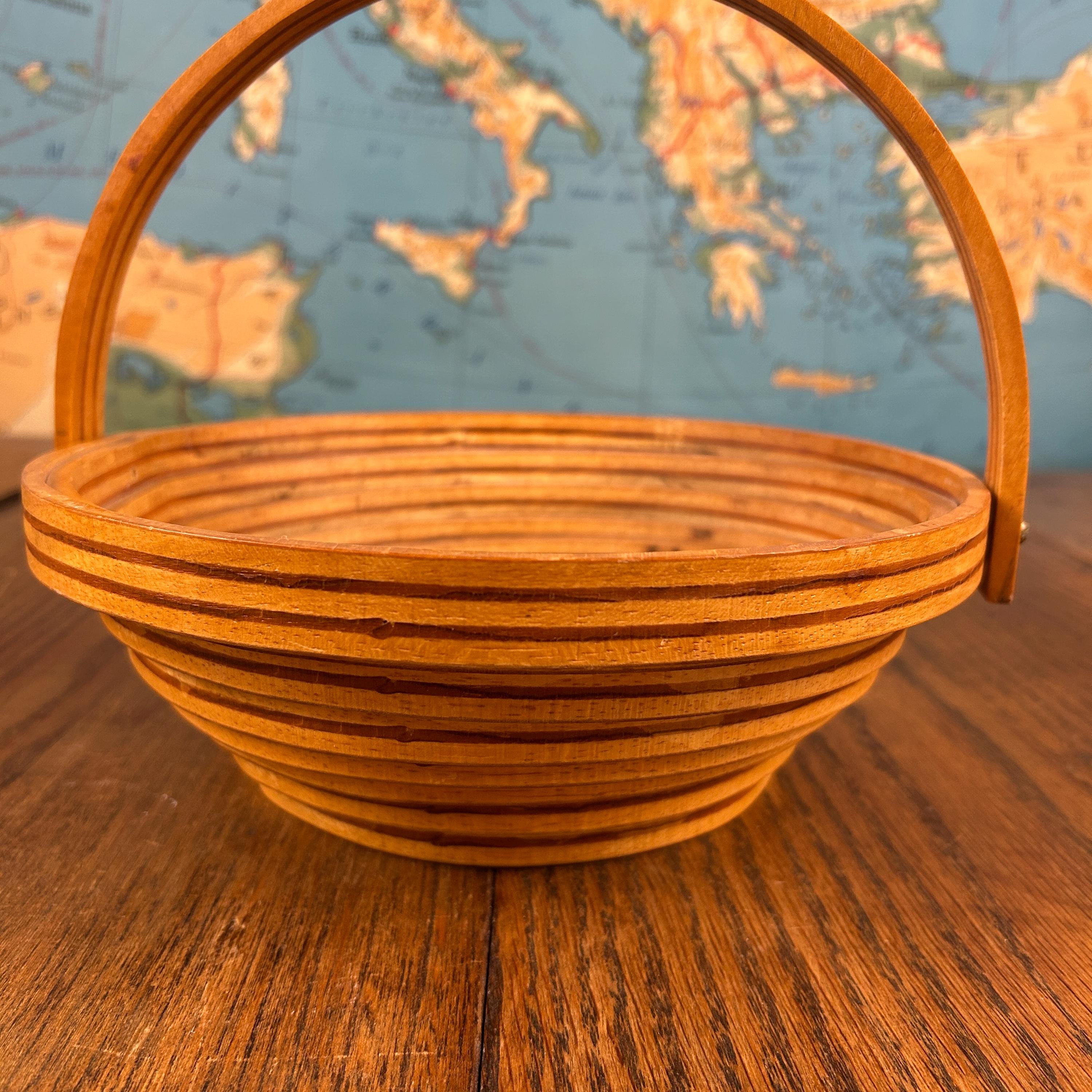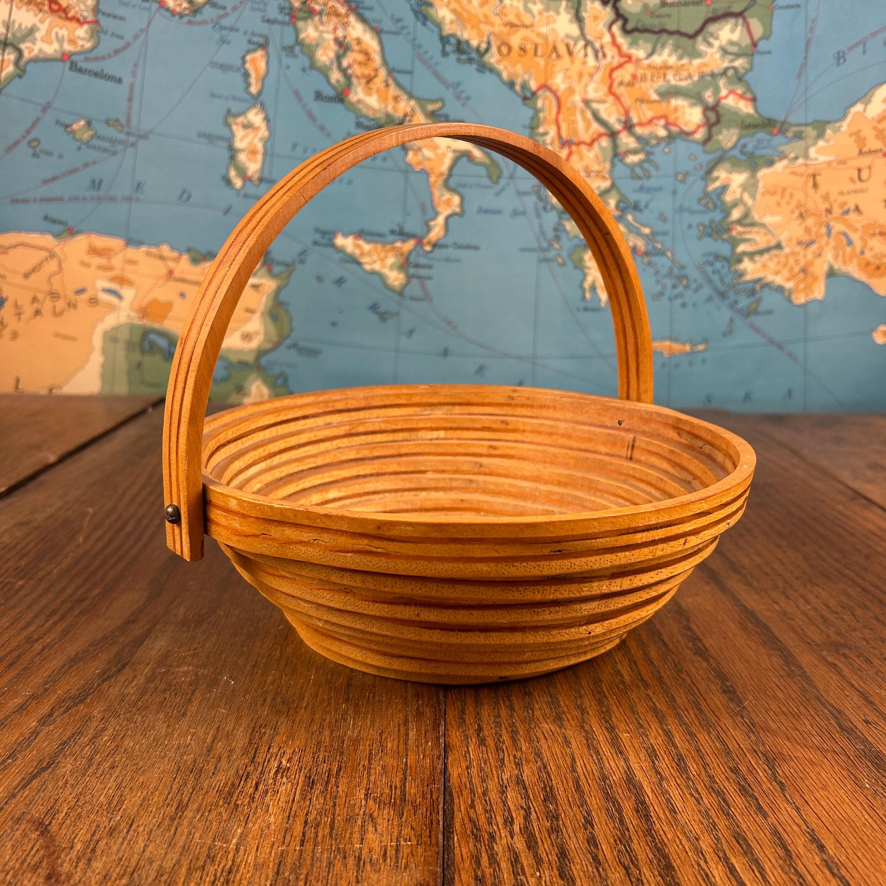 This is a handmade decorative wooden basket featuring a striking one-piece spiral-cut design. Thoughtfully crafted from solid wood with a warm stained finish, the piece includes a fold-down handle and can also be used as a trivet, blending beauty with function.