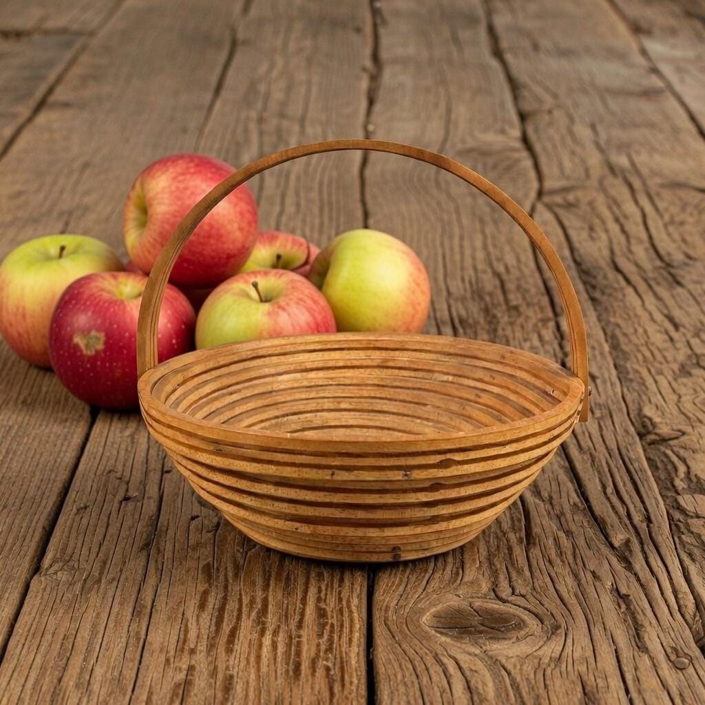 Signed and dated 1985, this artisan-made piece reflects Arts & Crafts movement–inspired design, emphasizing hand craftsmanship, natural materials, and honest construction. Its sculptural spiral form makes it equally suited for display or everyday use—perfect for holding fruit, mail, or small items, or for protecting surfaces from hot dishes.