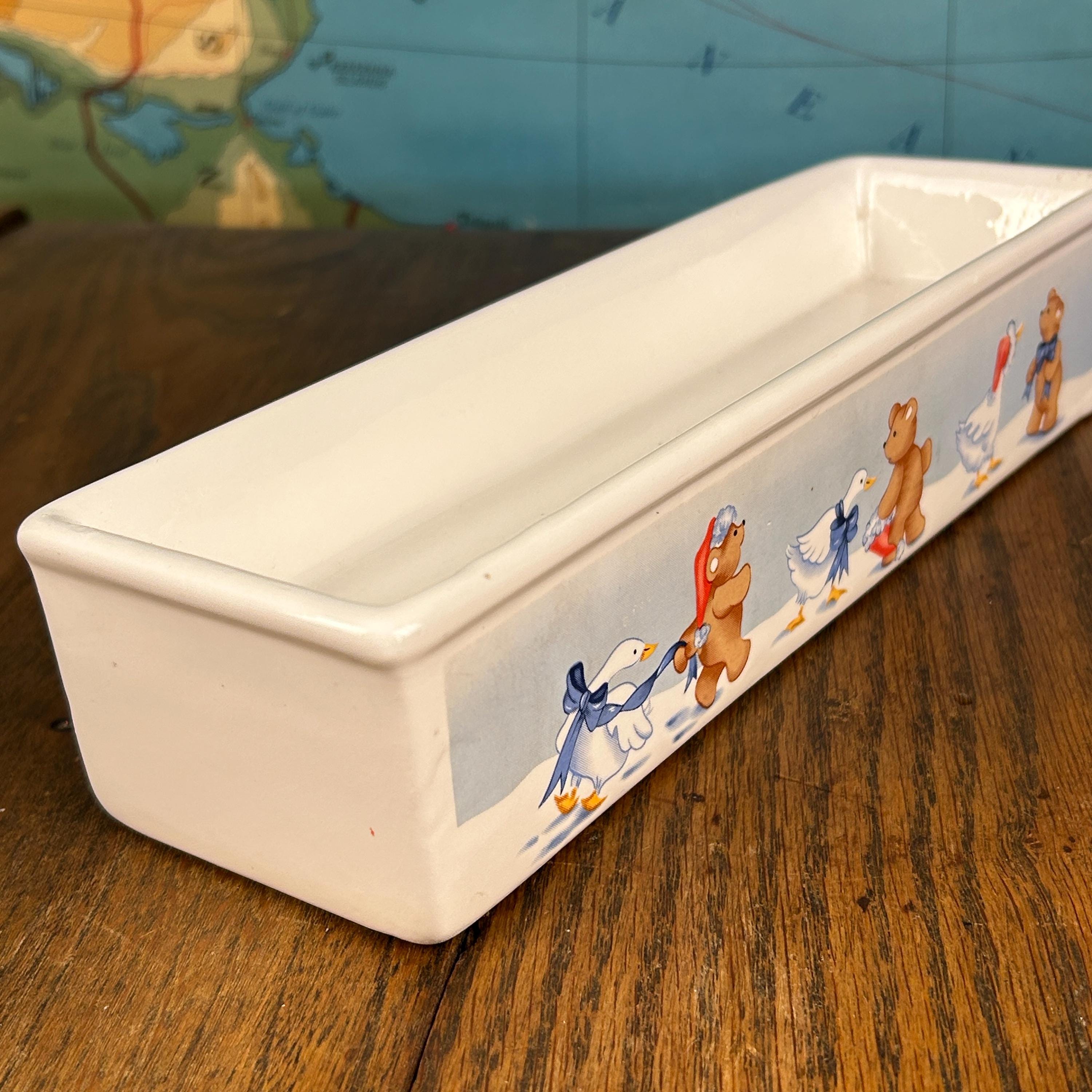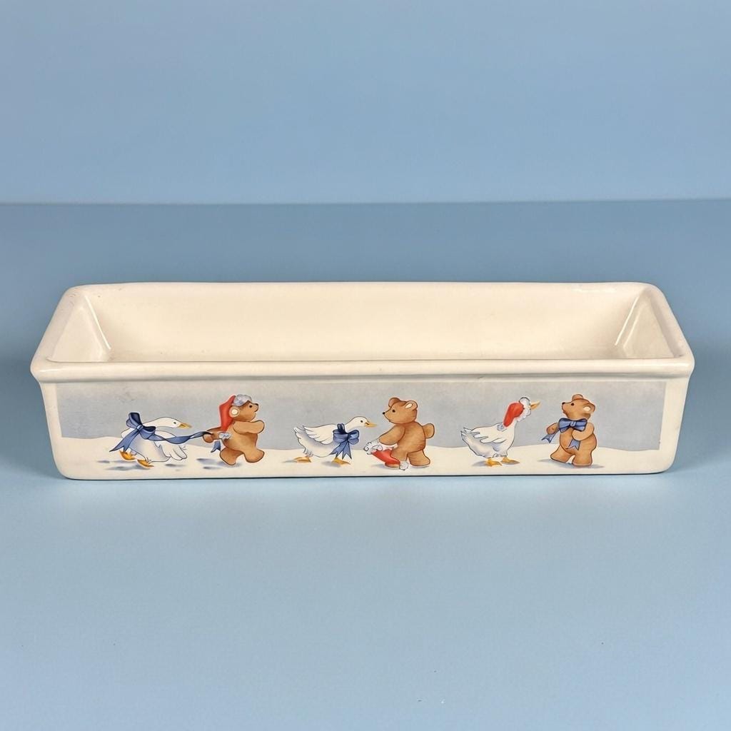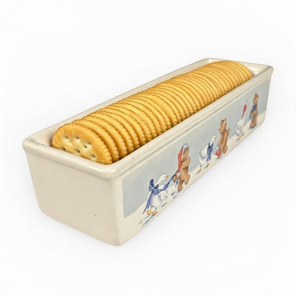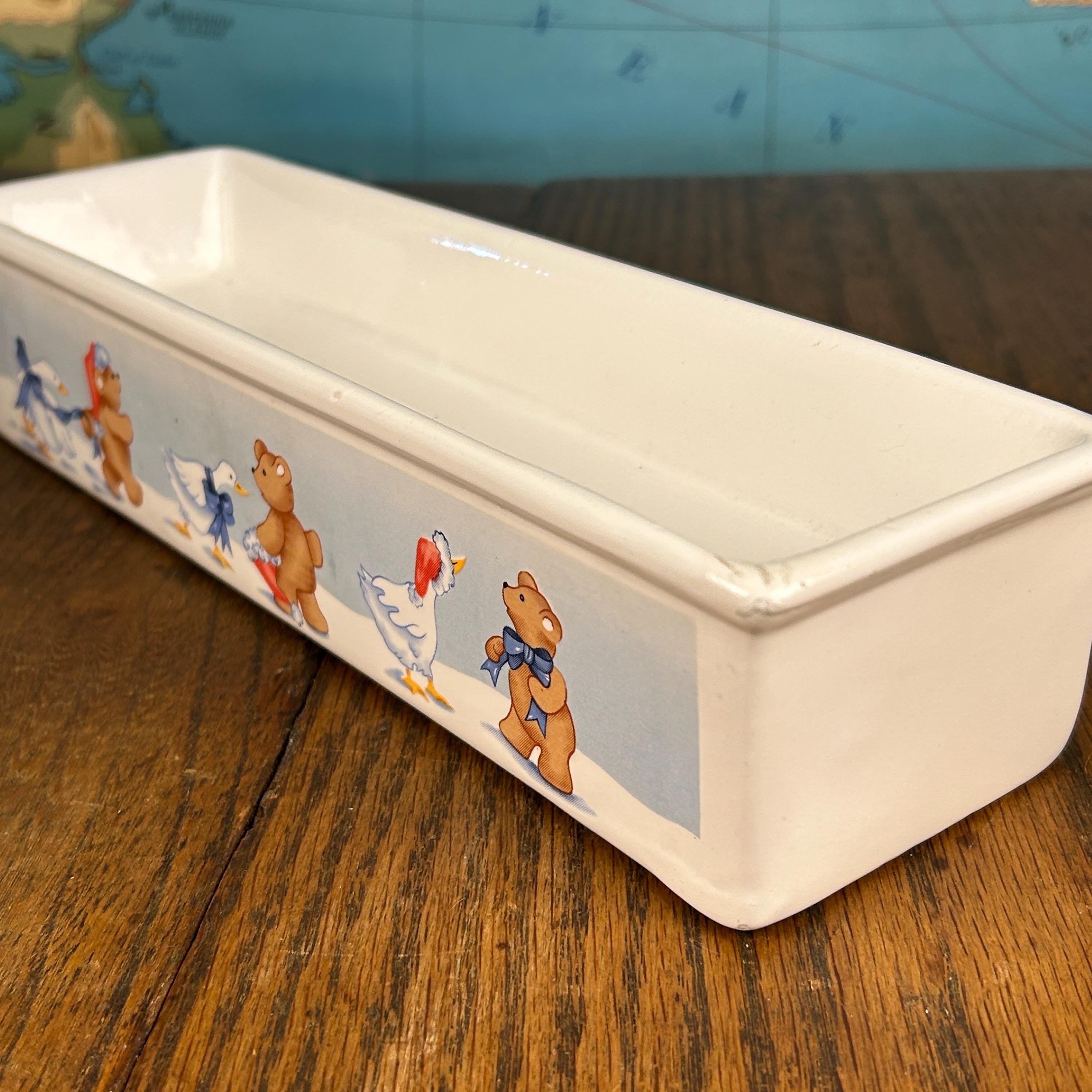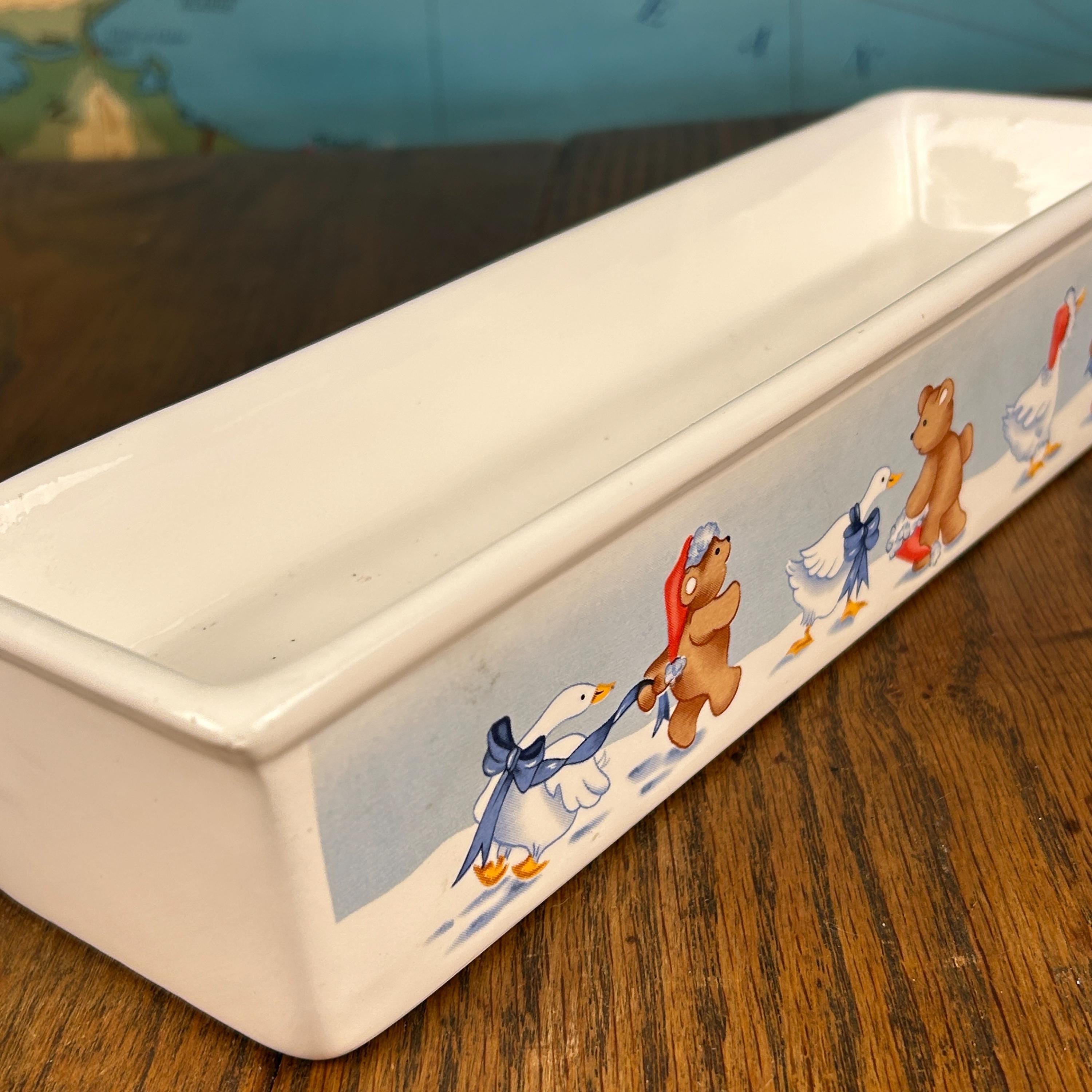 This is a vintage 1988 “Quacker” cracker tray by House of Lloyd, featuring an adorable festive scene of bears and geese. With its narrow, elongated shape, this ceramic tray was designed for serving crackers, breadsticks, or cookies—and it displays beautifully on a table or shelf.