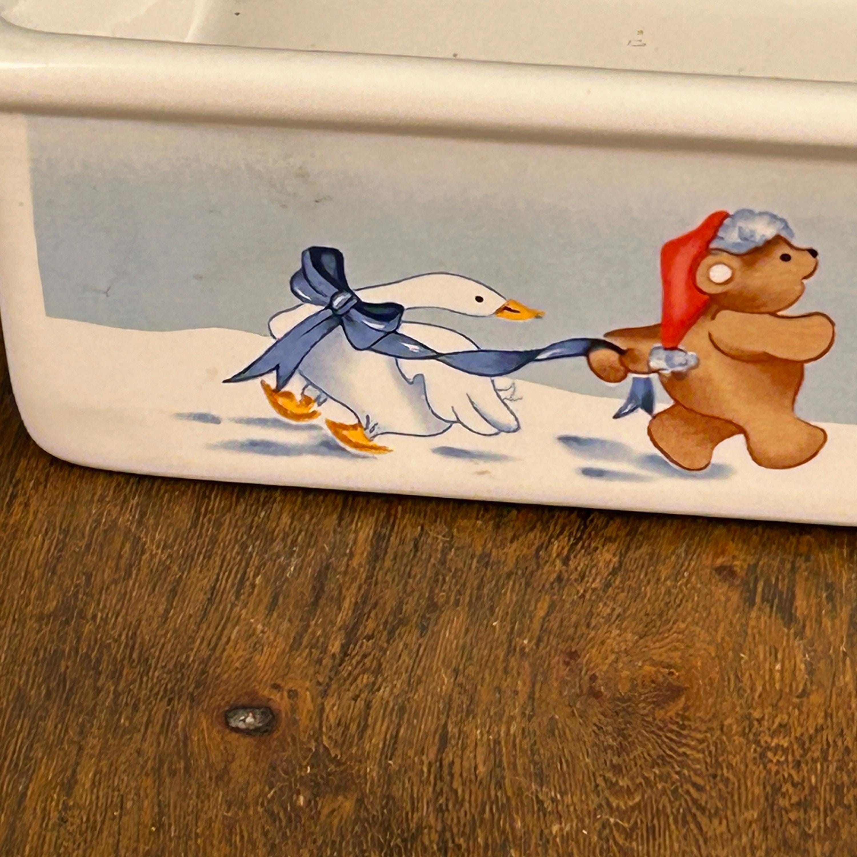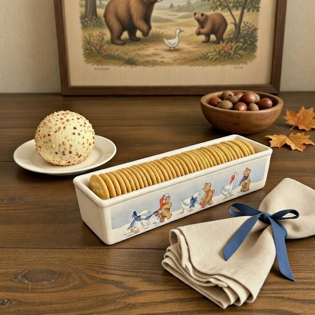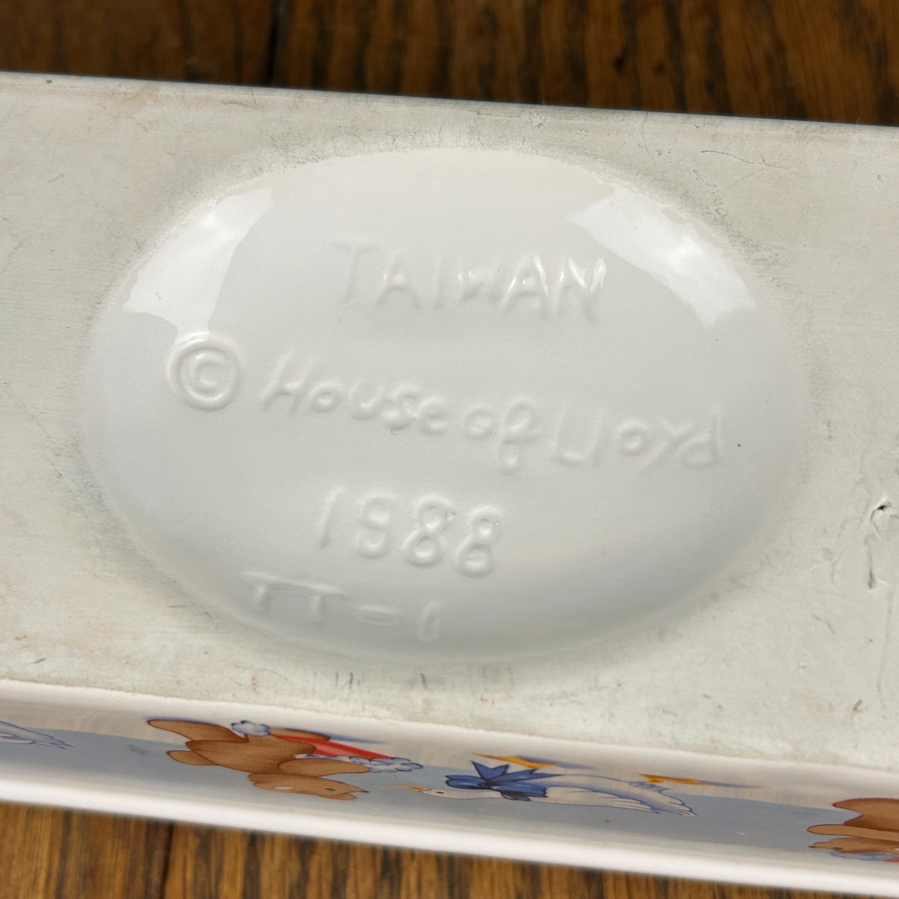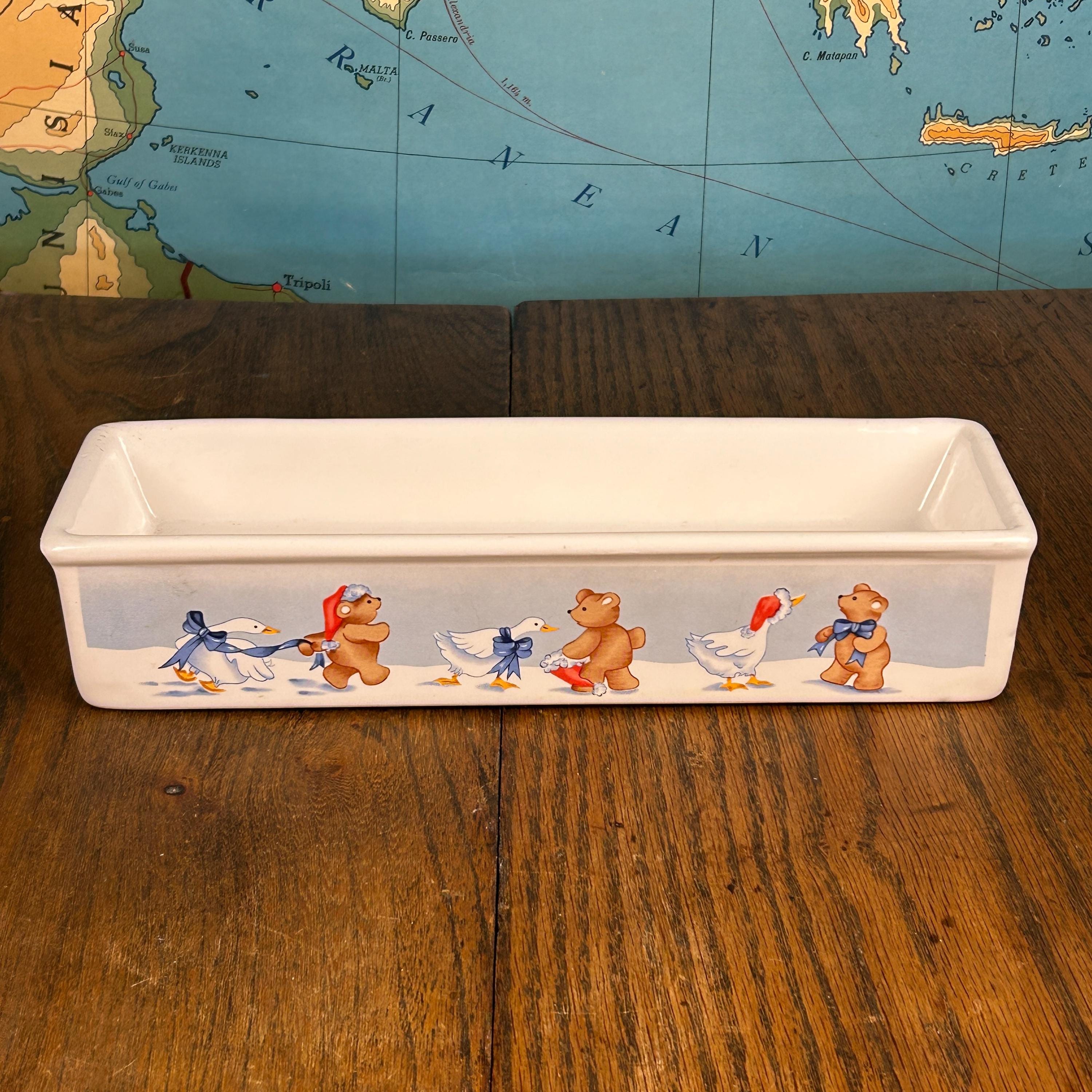 This is a vintage 1988 “Quacker” cracker tray by House of Lloyd, featuring an adorable festive scene of bears and geese. With its narrow, elongated shape, this ceramic tray was designed for serving crackers, breadsticks, or cookies—and it displays beautifully on a table or shelf.