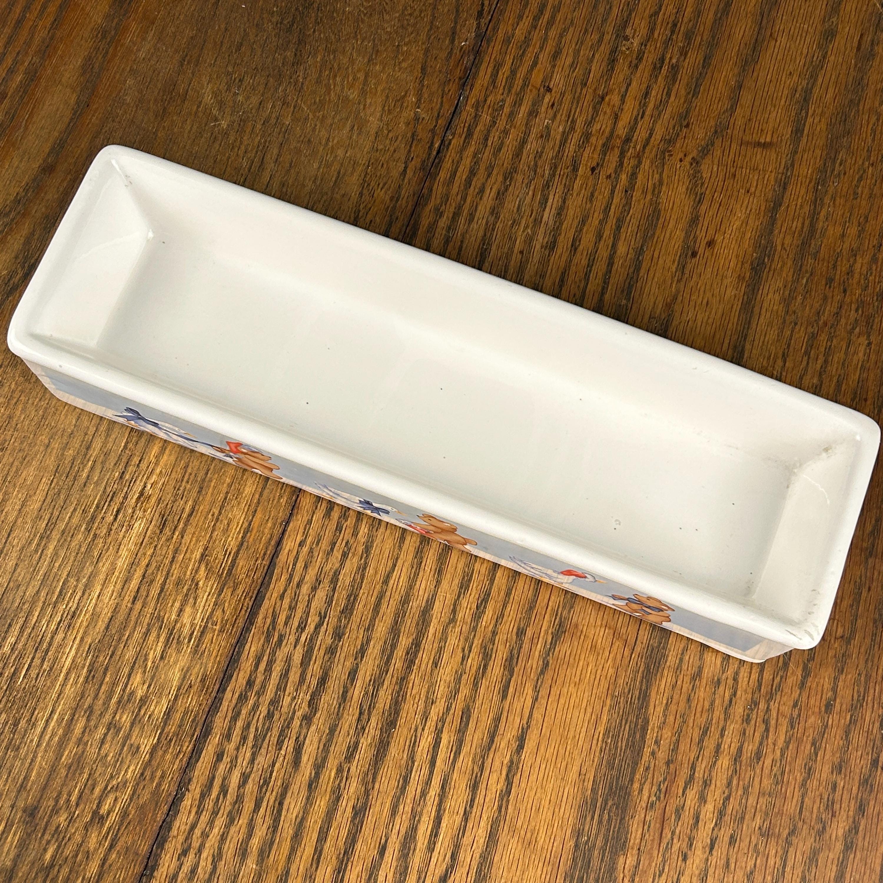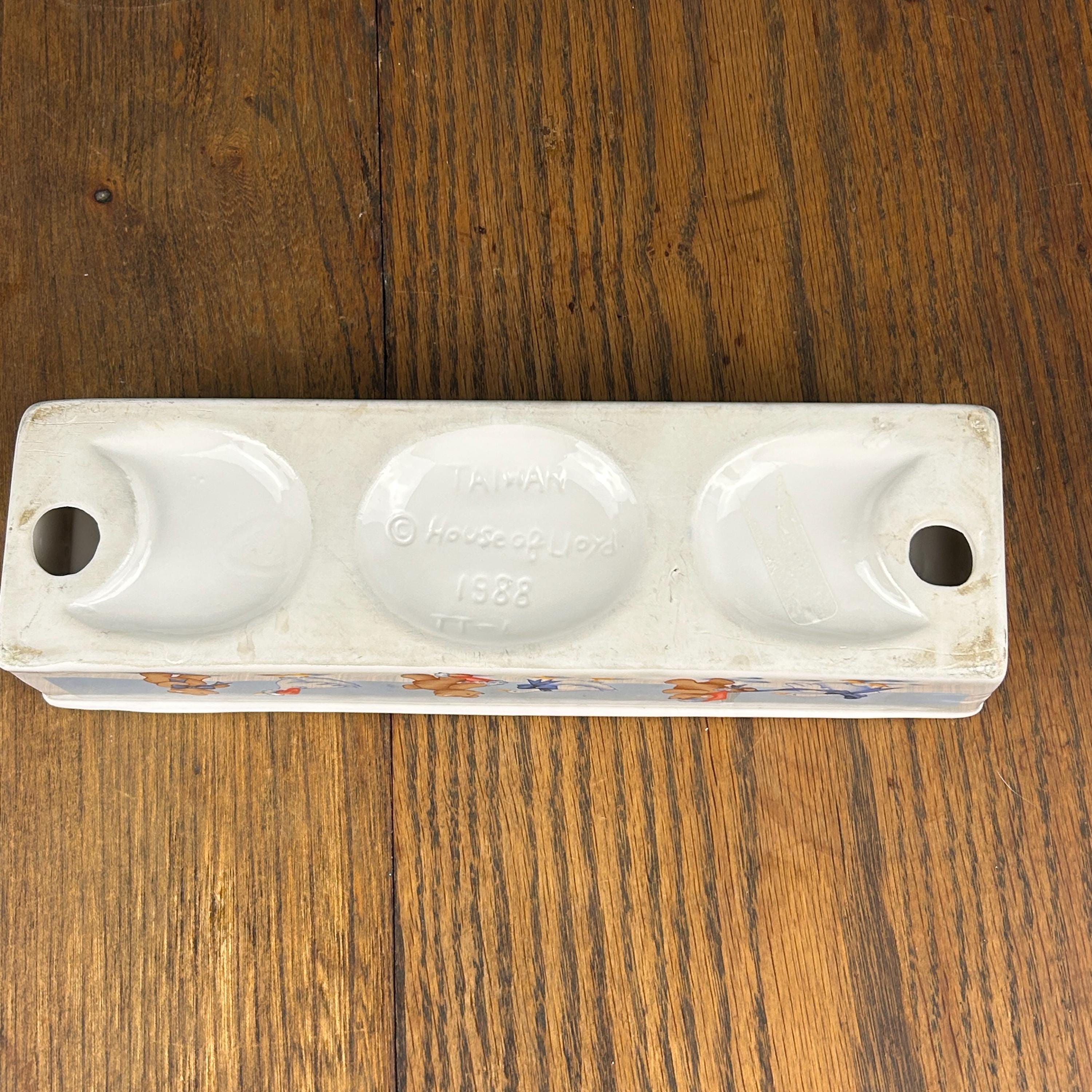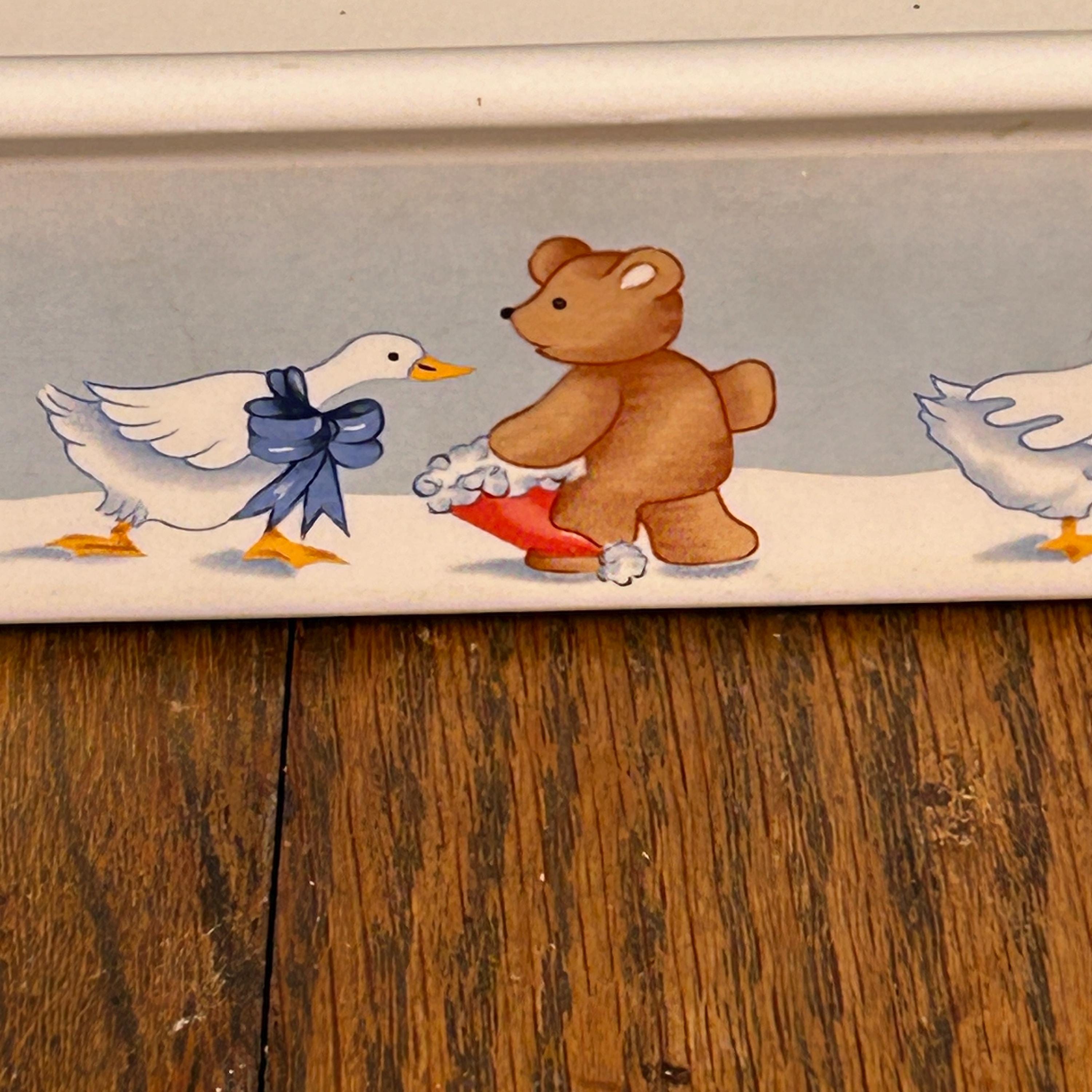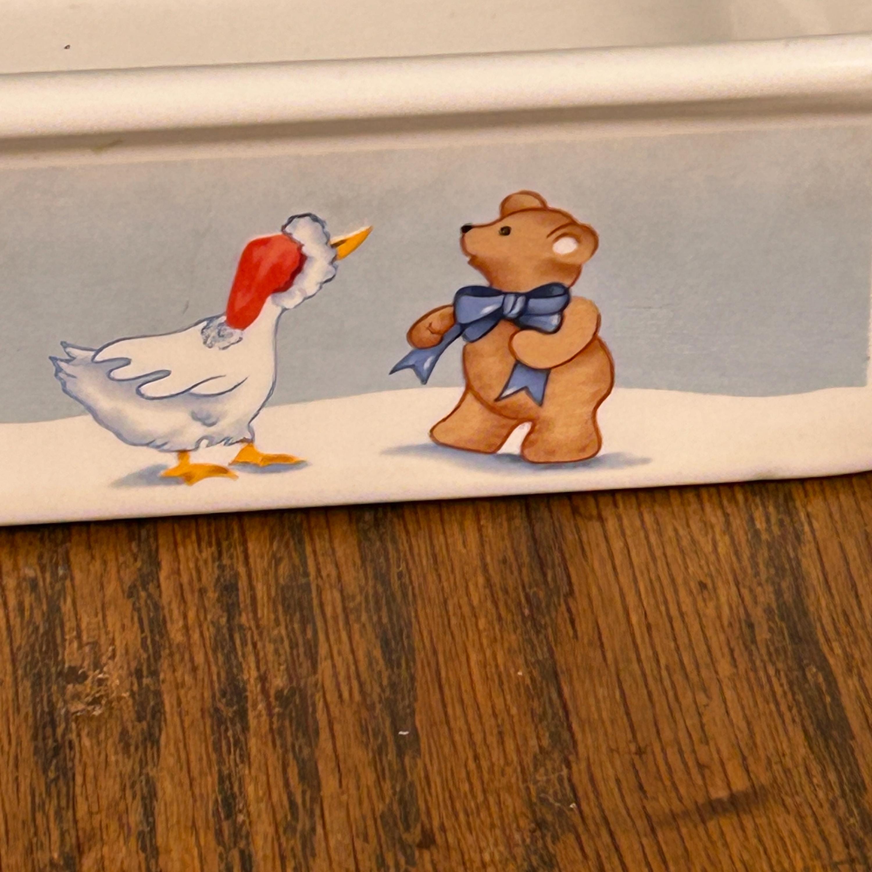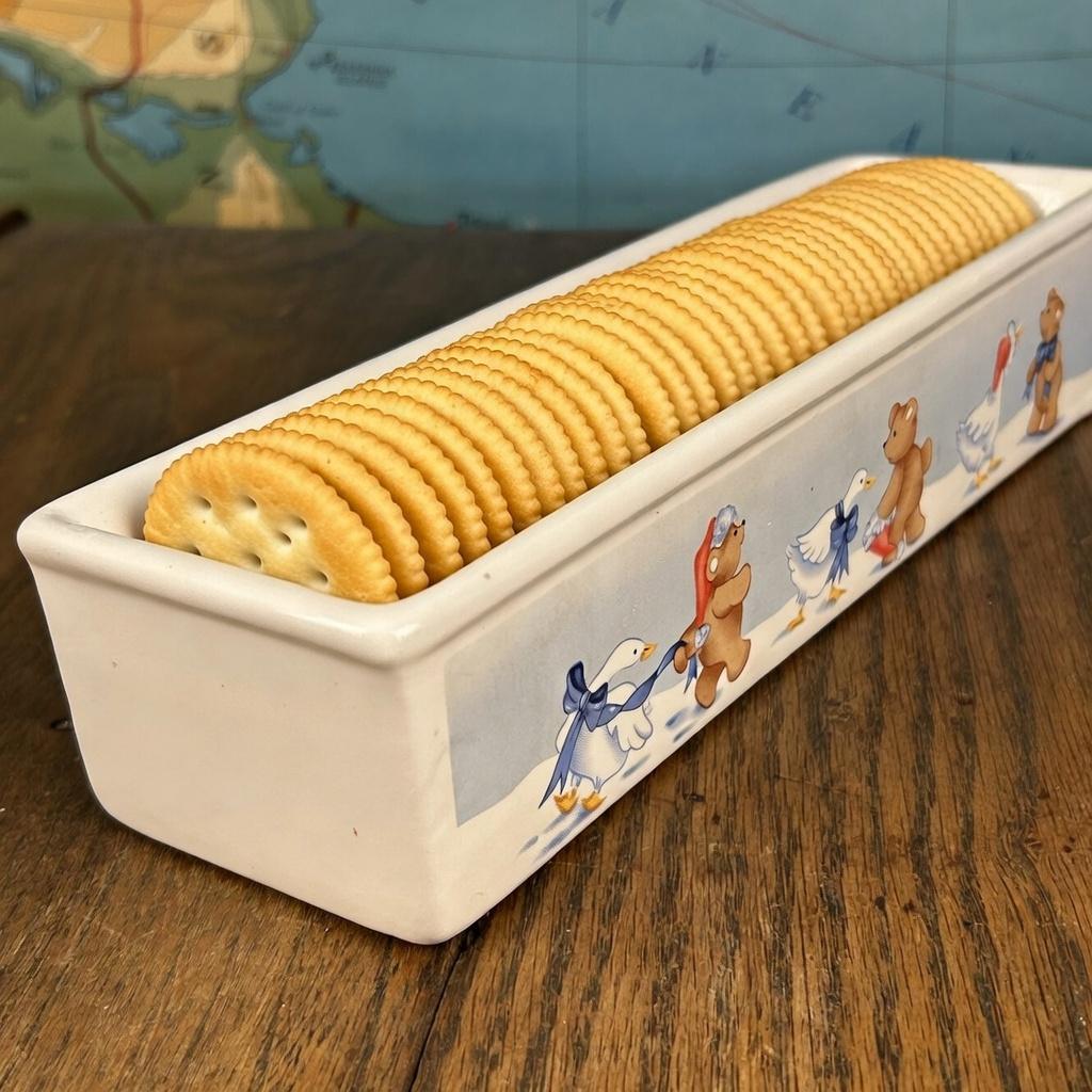 This is a vintage 1988 “Quacker” cracker tray by House of Lloyd, featuring an adorable festive scene of bears and geese. With its narrow, elongated shape, this ceramic tray was designed for serving crackers, breadsticks, or cookies—and it displays beautifully on a table or shelf.