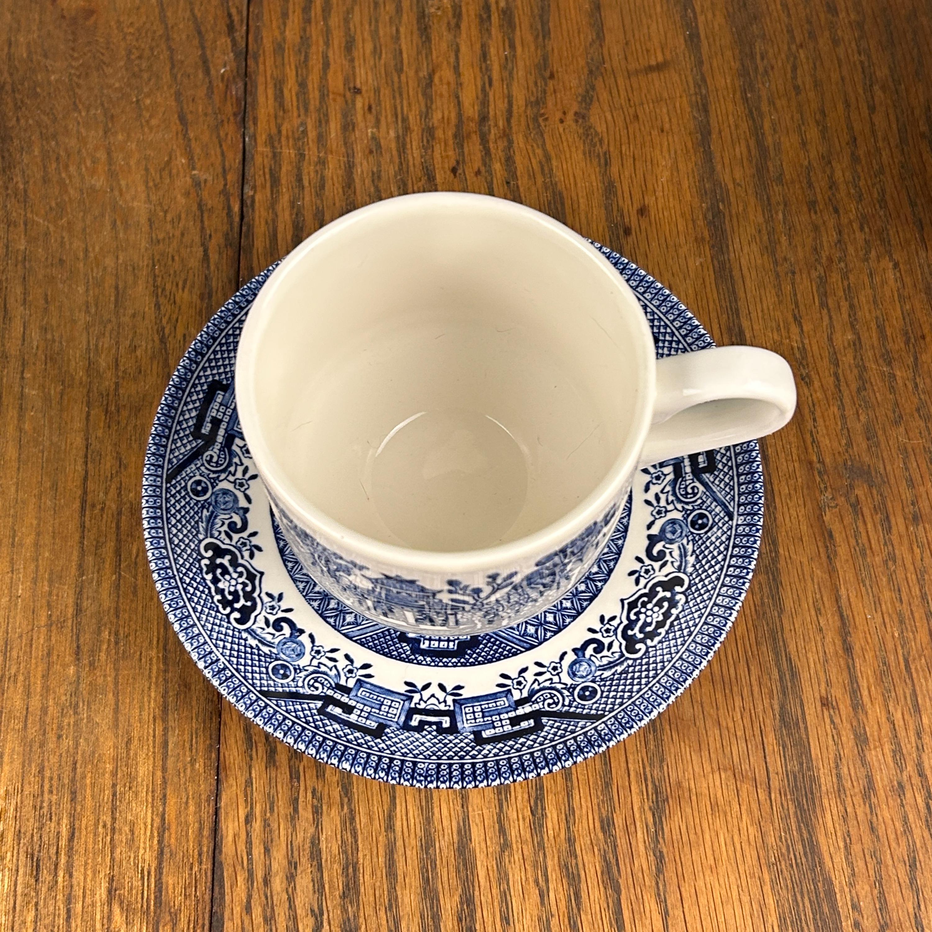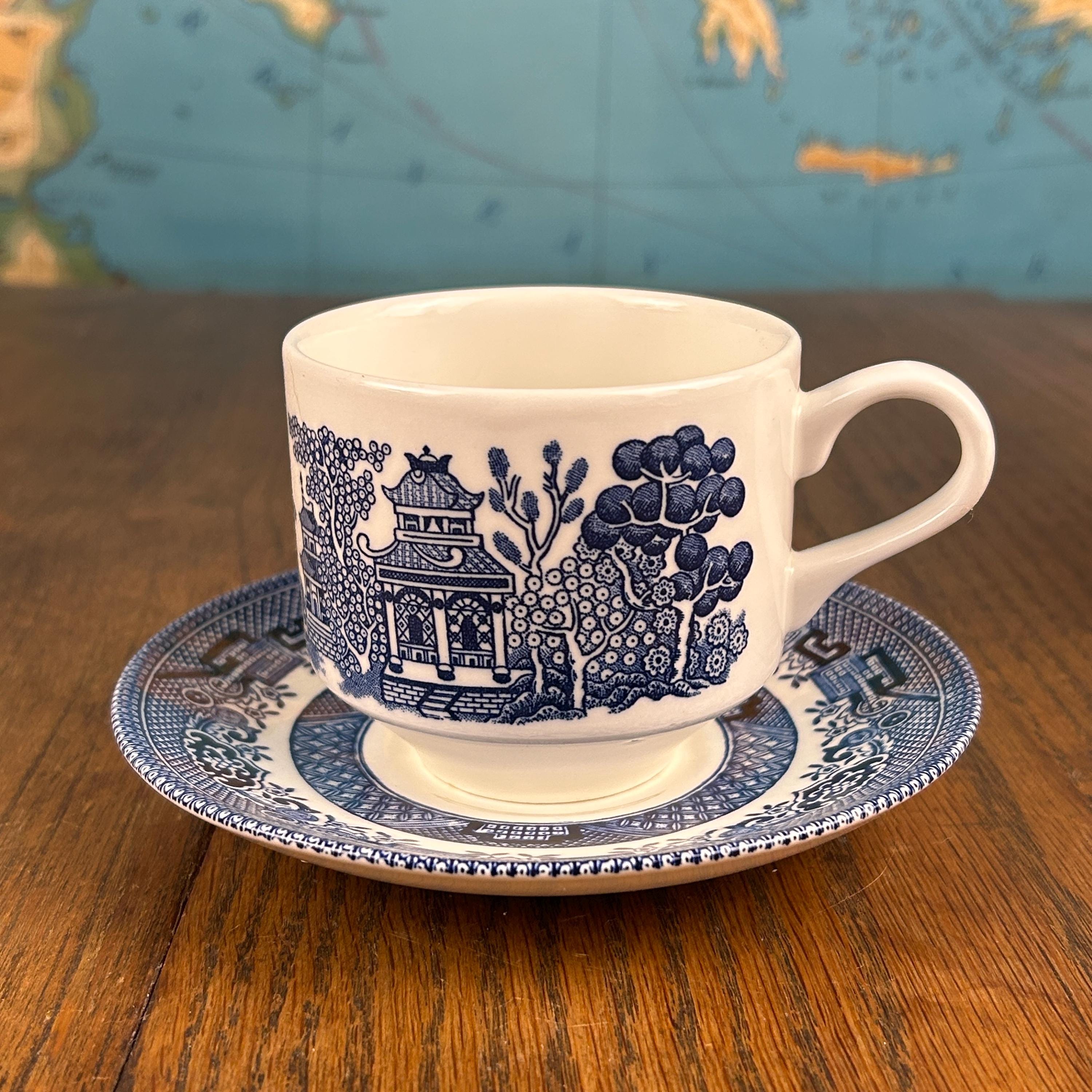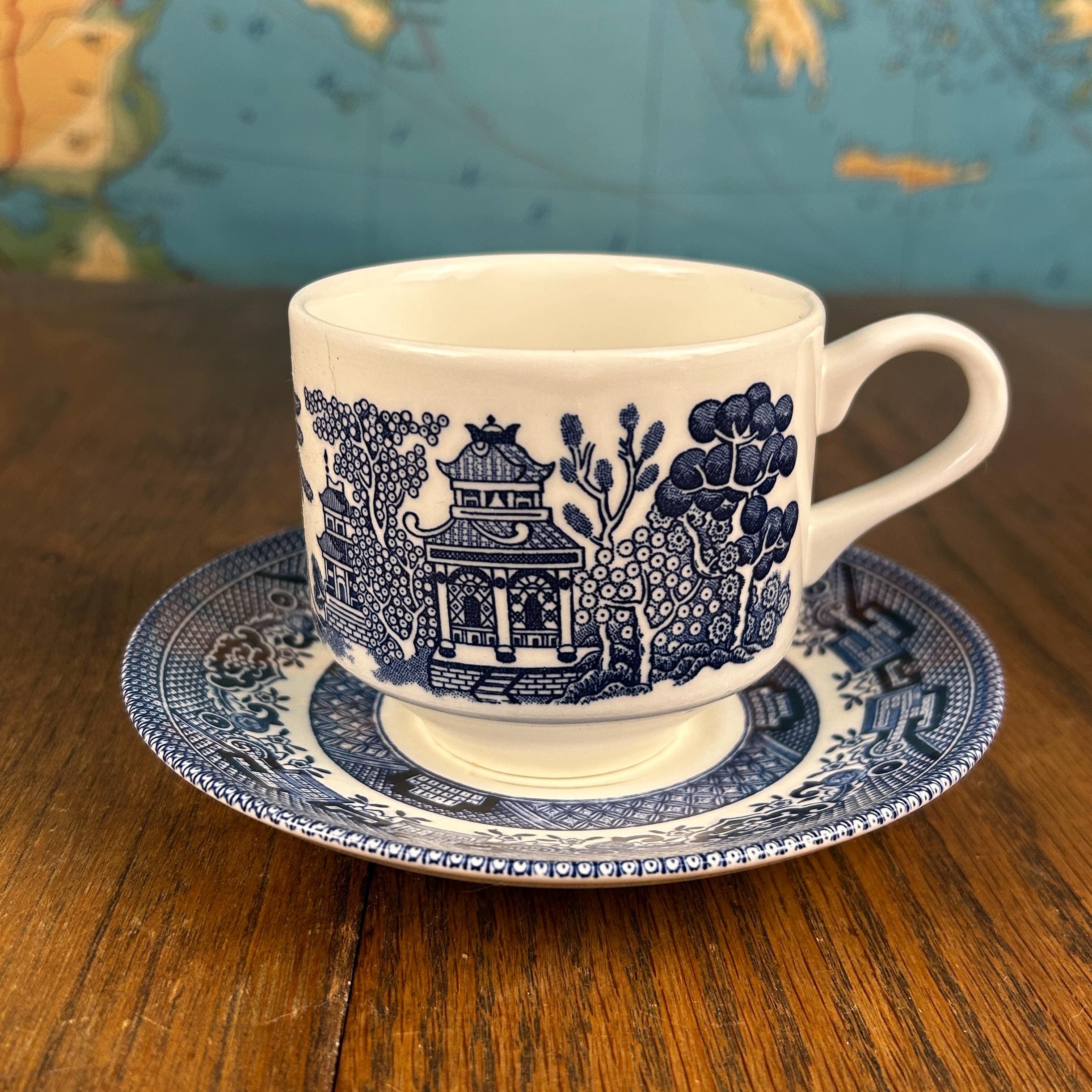 This beautiful vintage teacup and saucer set features the timeless Blue Willow pattern, produced by Churchill in England. A true classic, the Blue Willow design showcases the iconic garden and pagoda scene that has been beloved for generations.