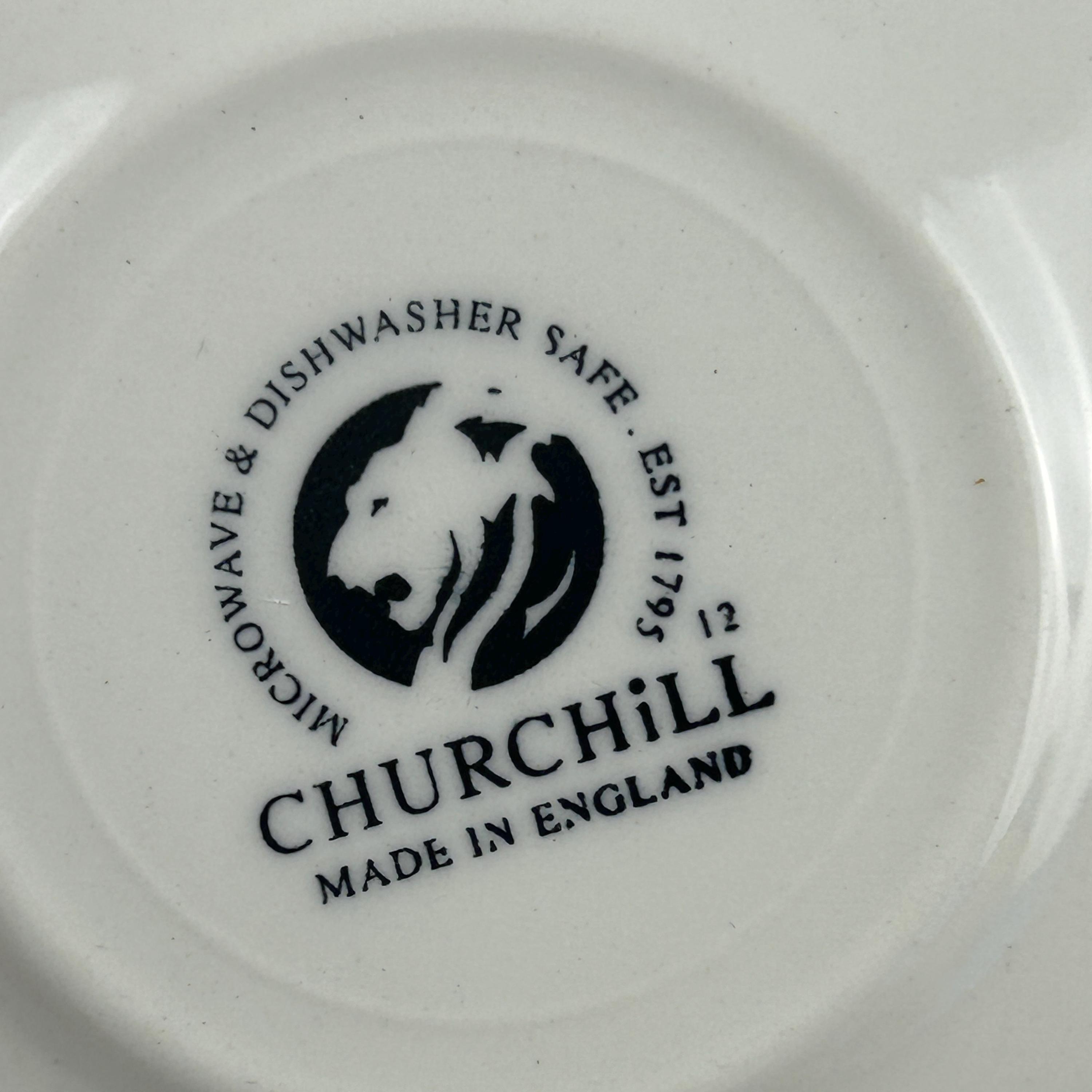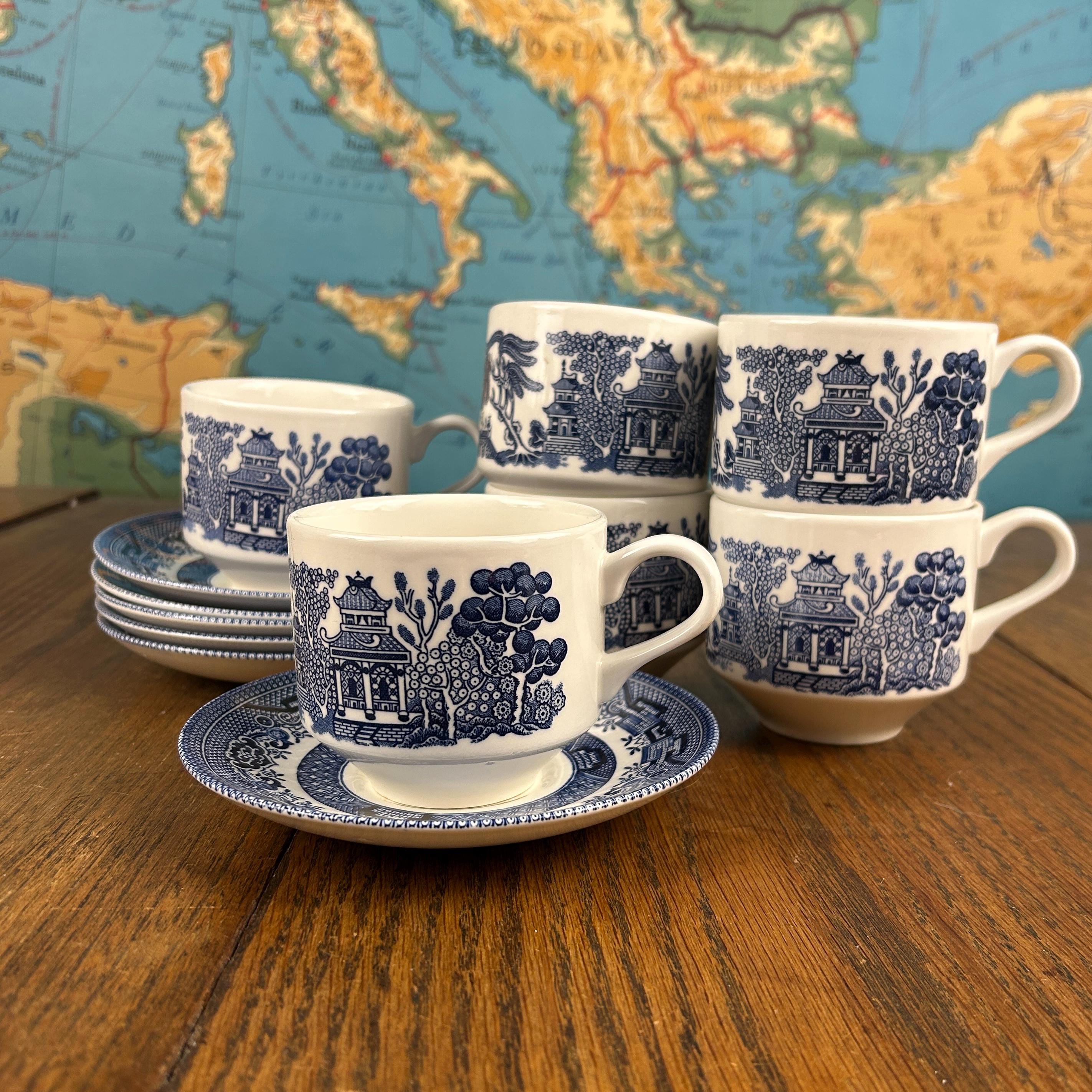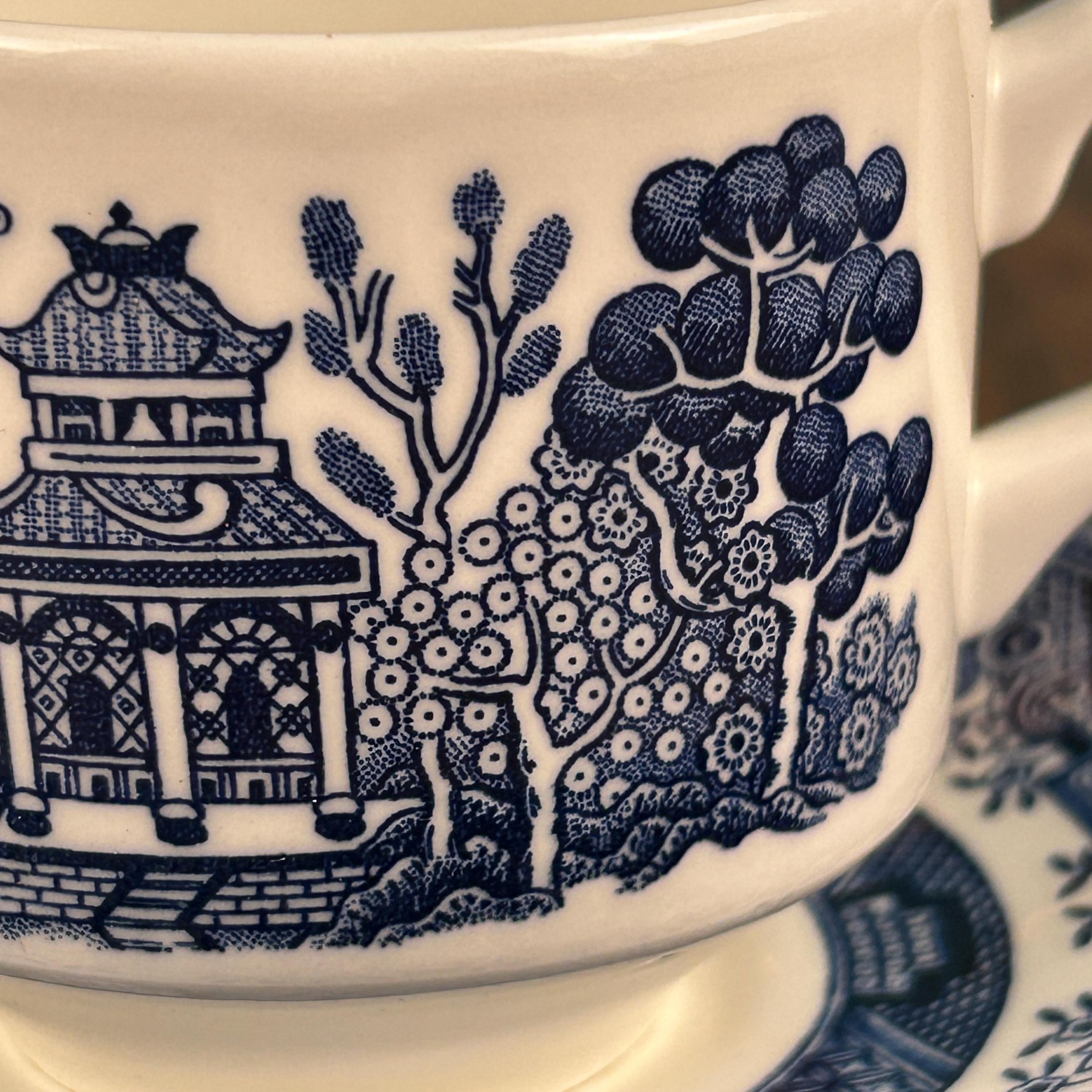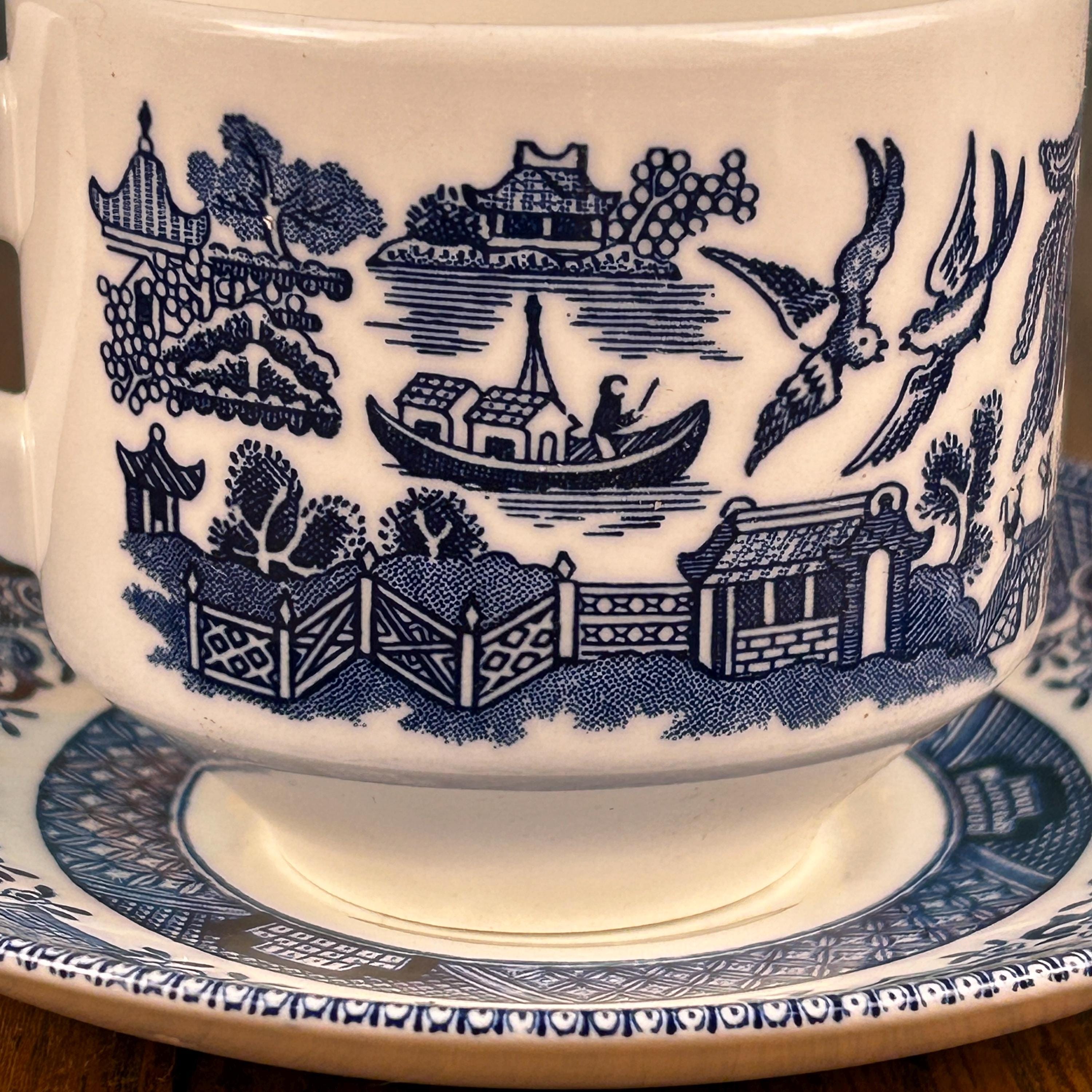 This beautiful vintage teacup and saucer set features the timeless Blue Willow pattern, produced by Churchill in England. A true classic, the Blue Willow design showcases the iconic garden and pagoda scene that has been beloved for generations.