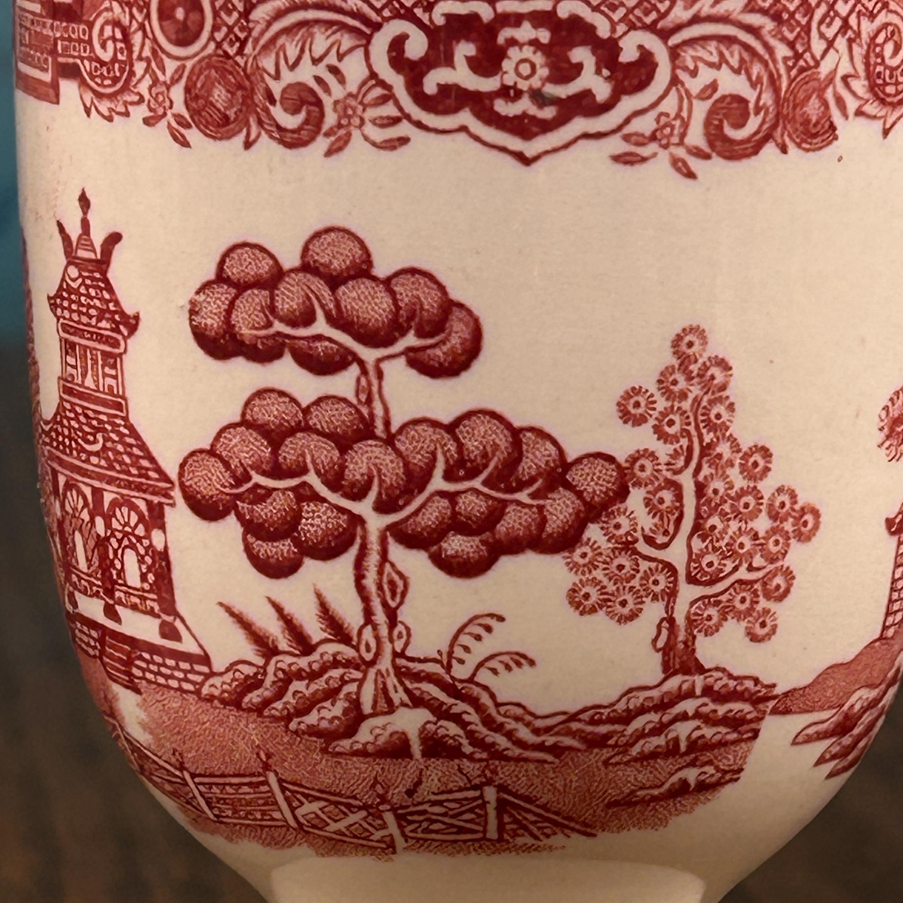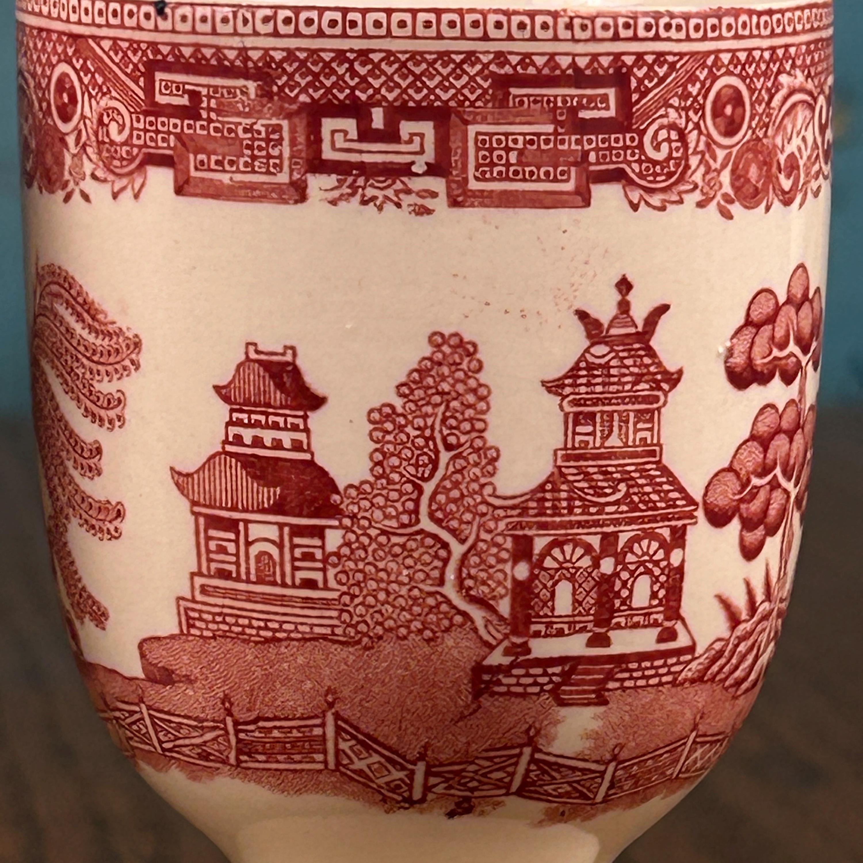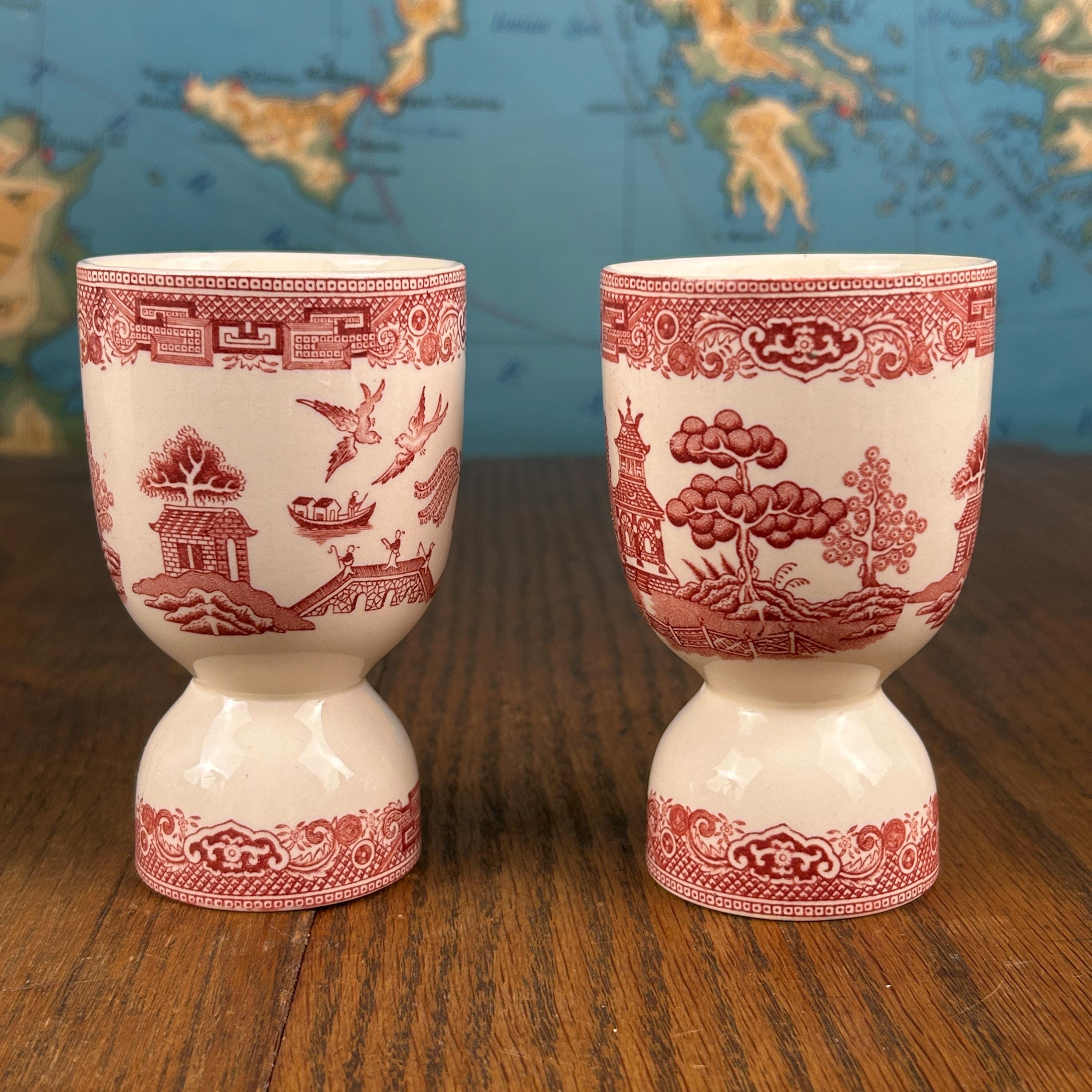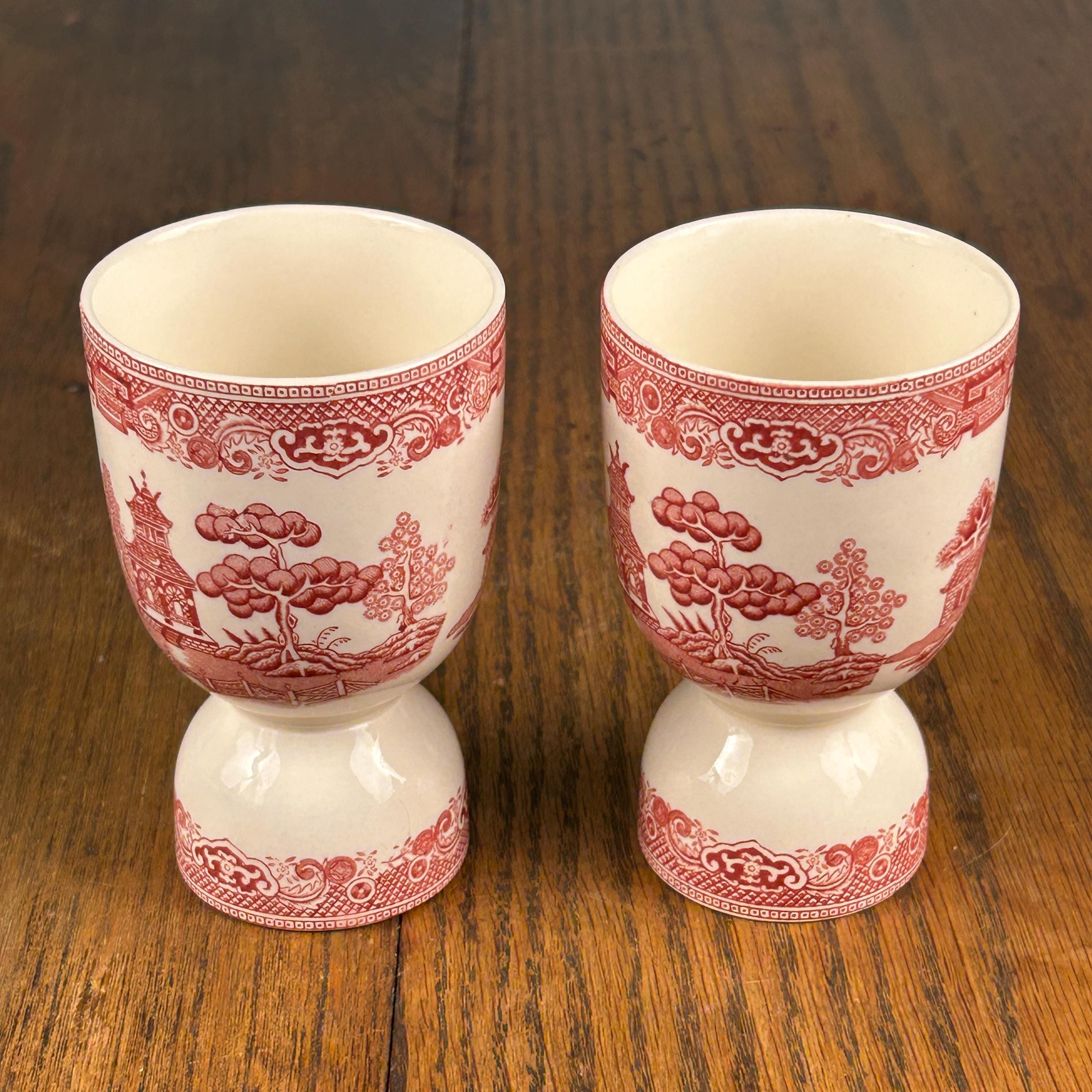 These lovely vintage English red transferware double egg cups feature a classic Willow-style Oriental landscape design, rendered in rich red transfer print. A beautiful and functional piece of traditional English tableware.