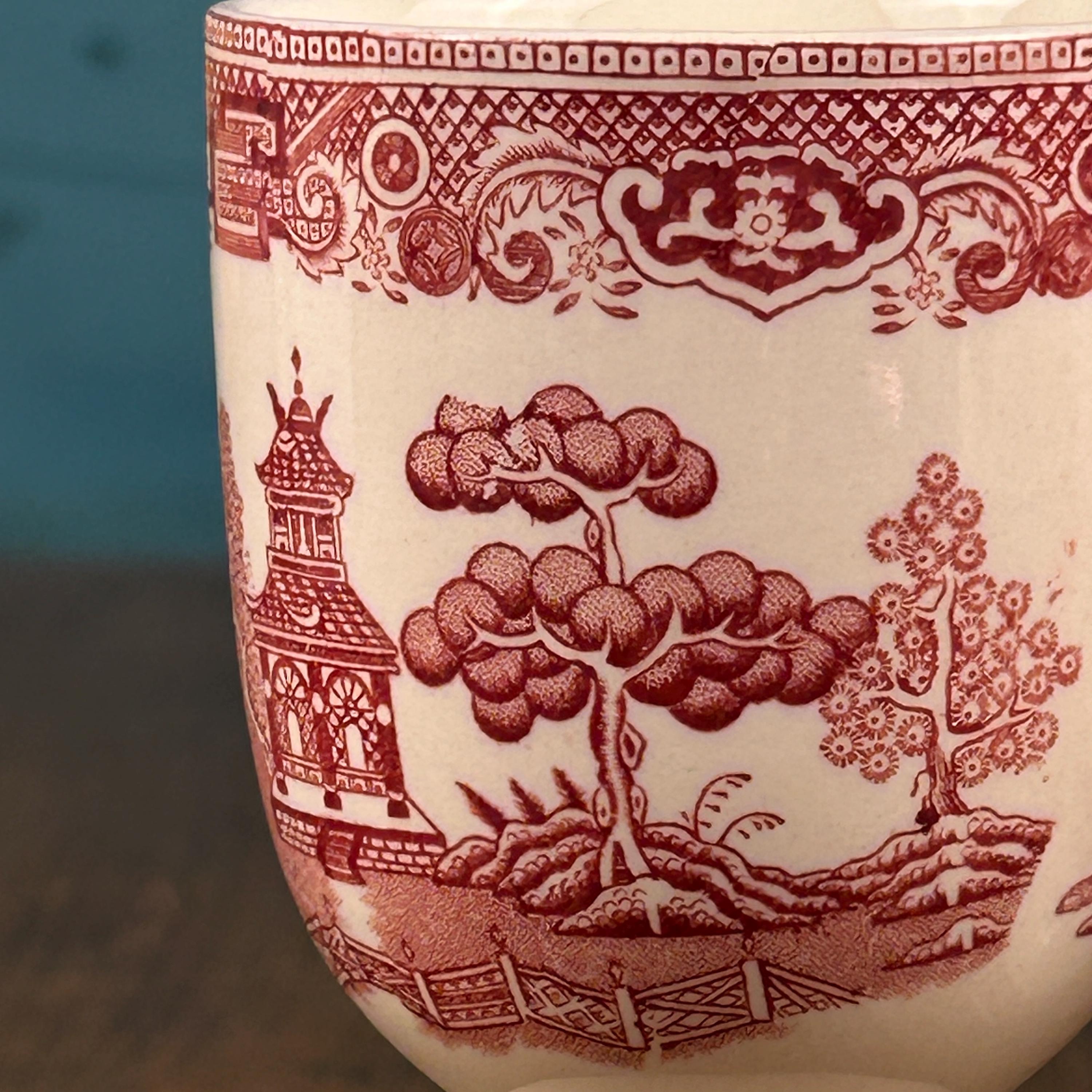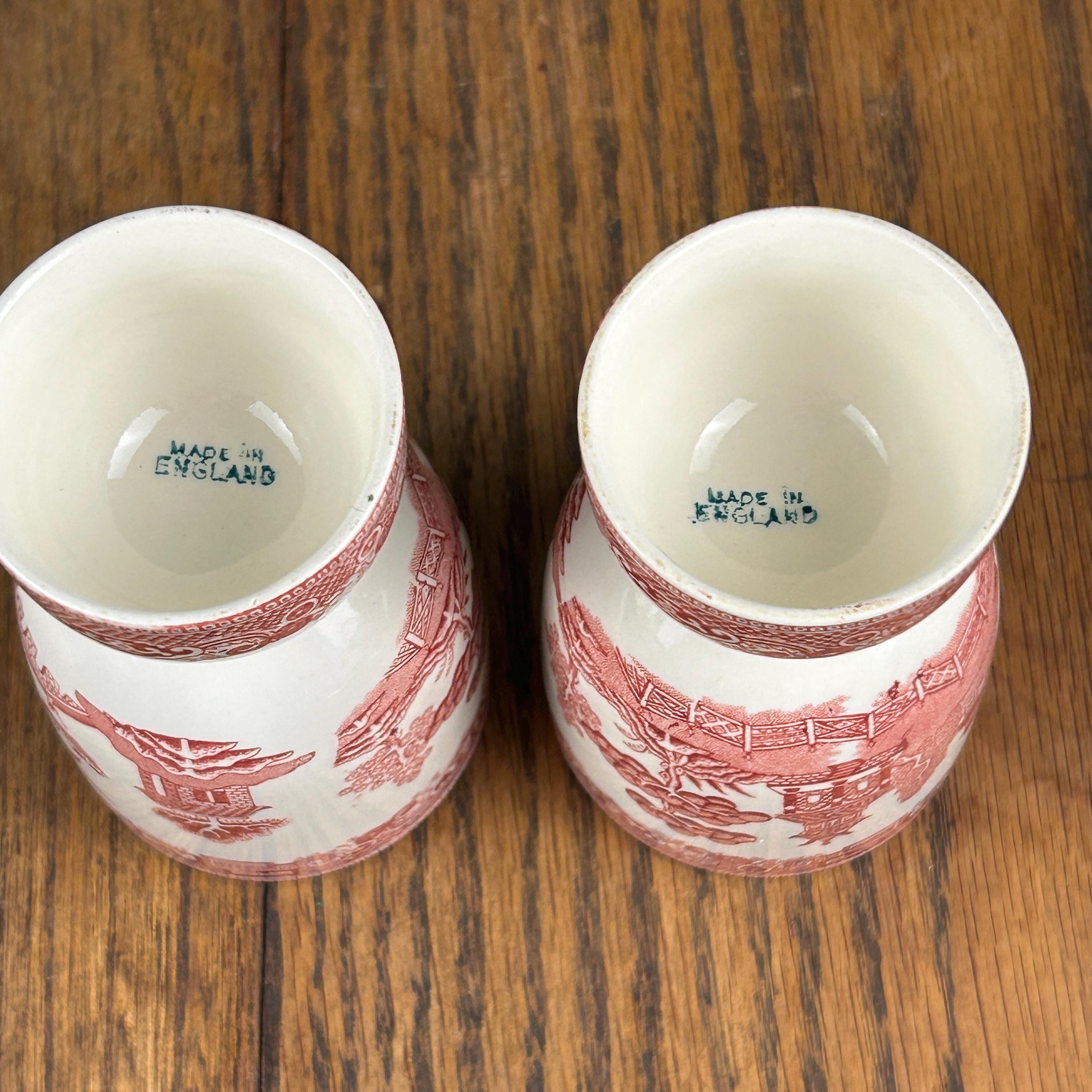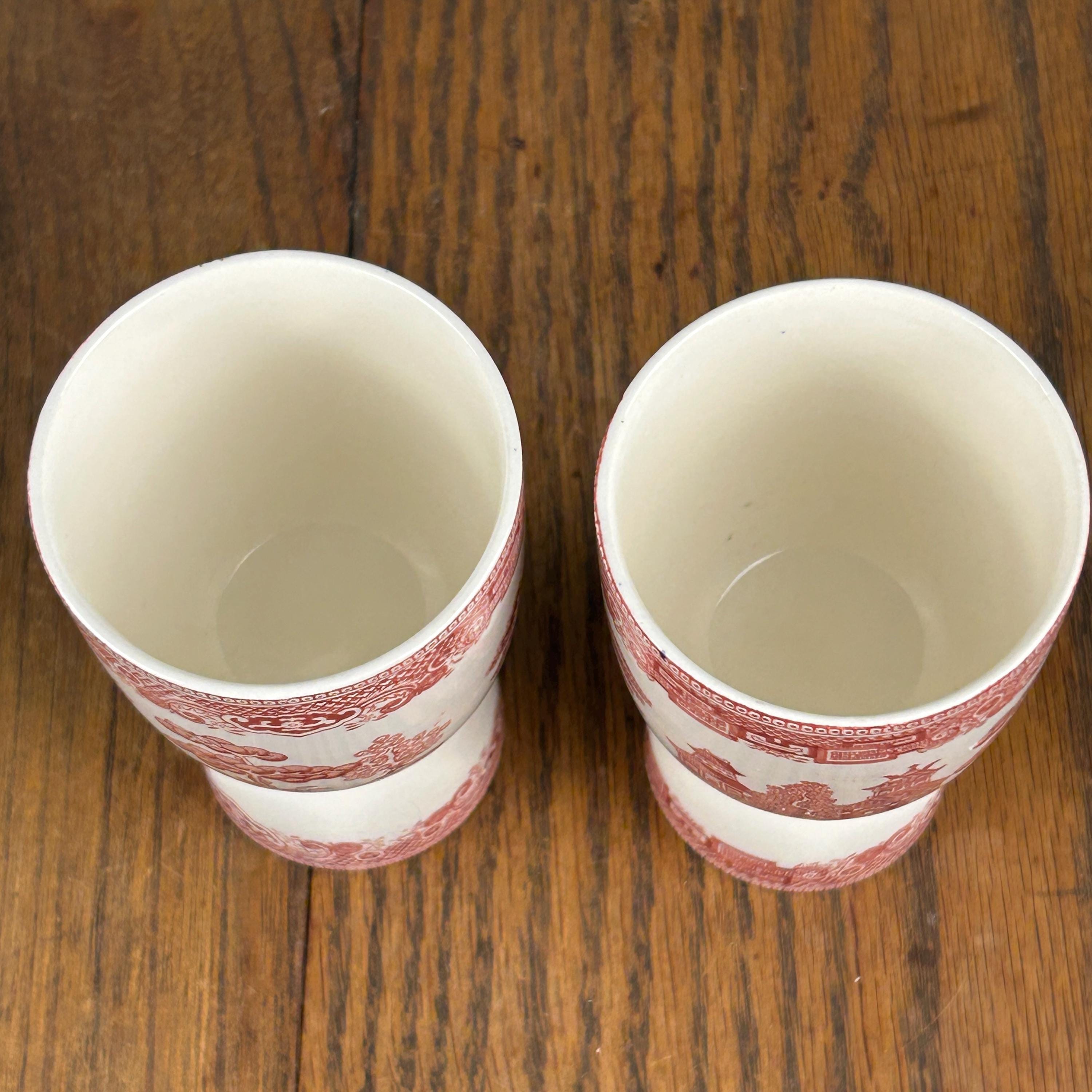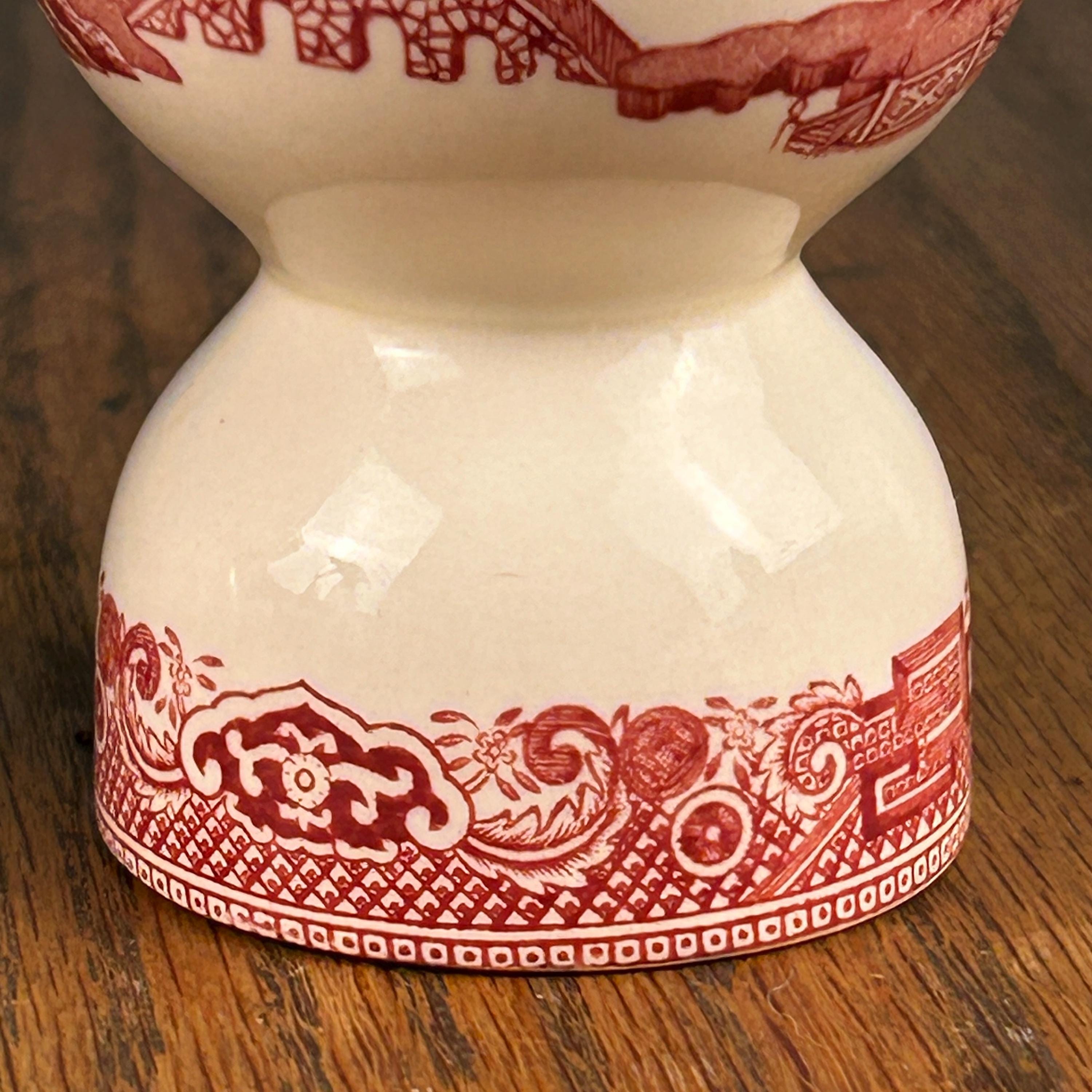 These lovely vintage English red transferware double egg cups feature a classic Willow-style Oriental landscape design, rendered in rich red transfer print. A beautiful and functional piece of traditional English tableware.