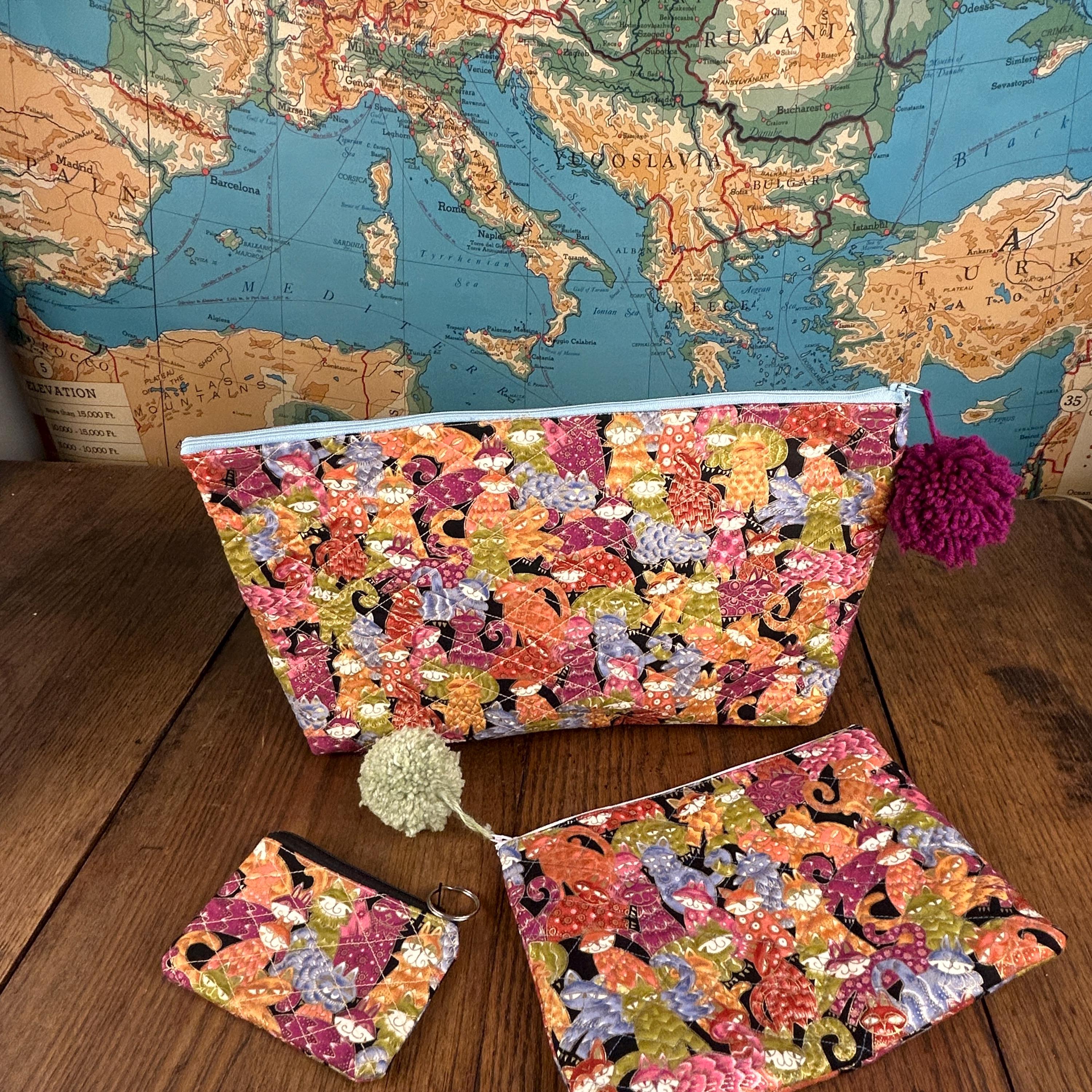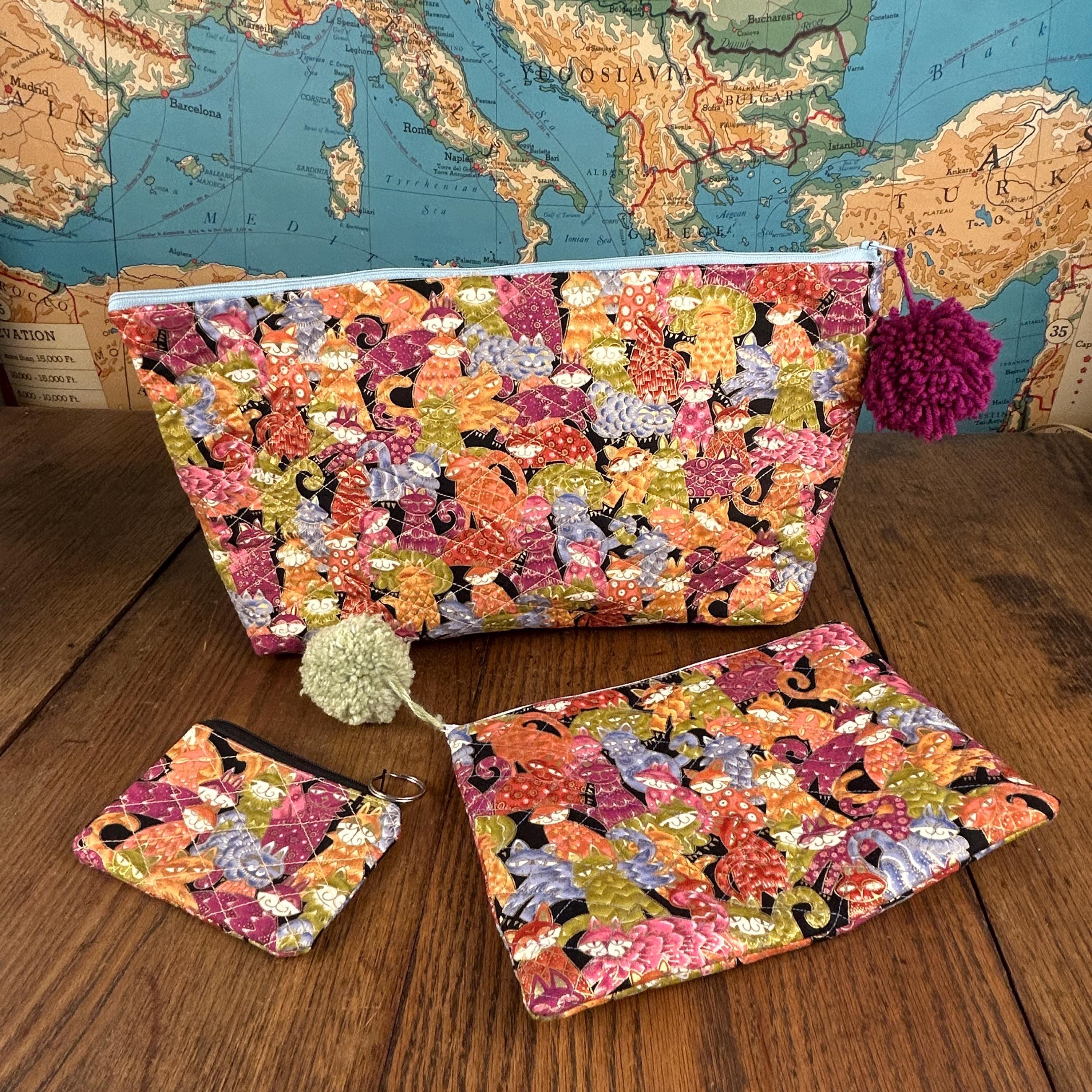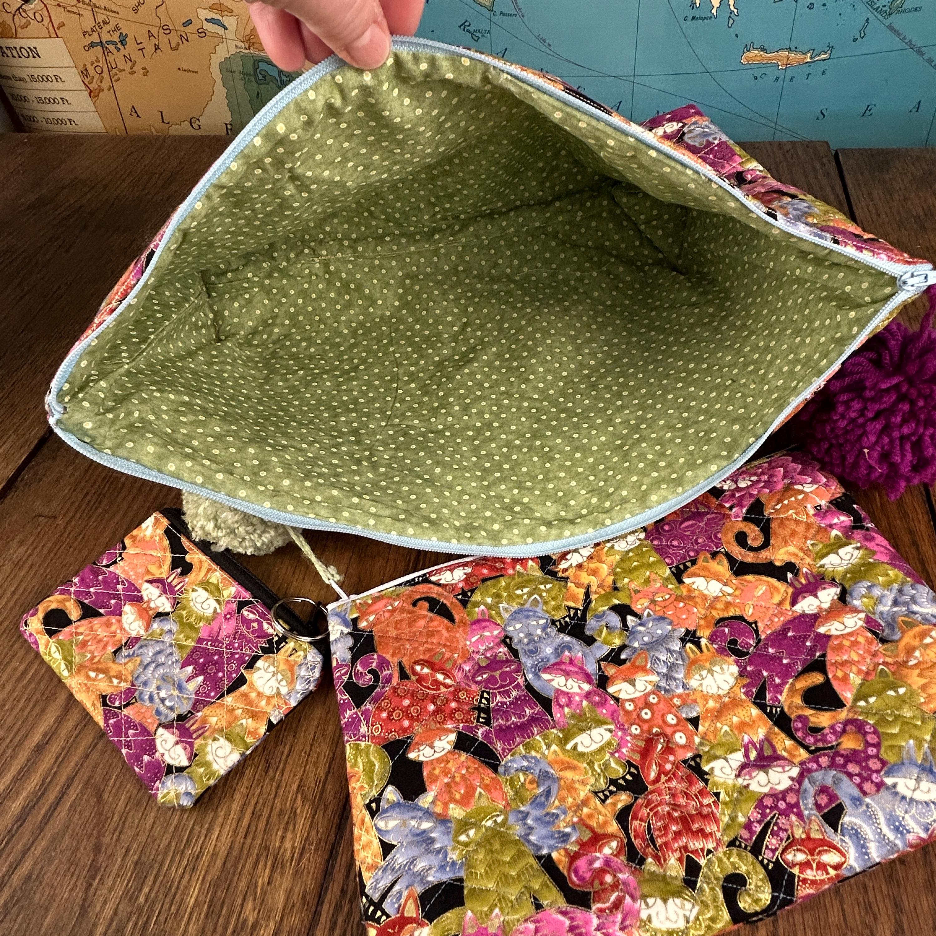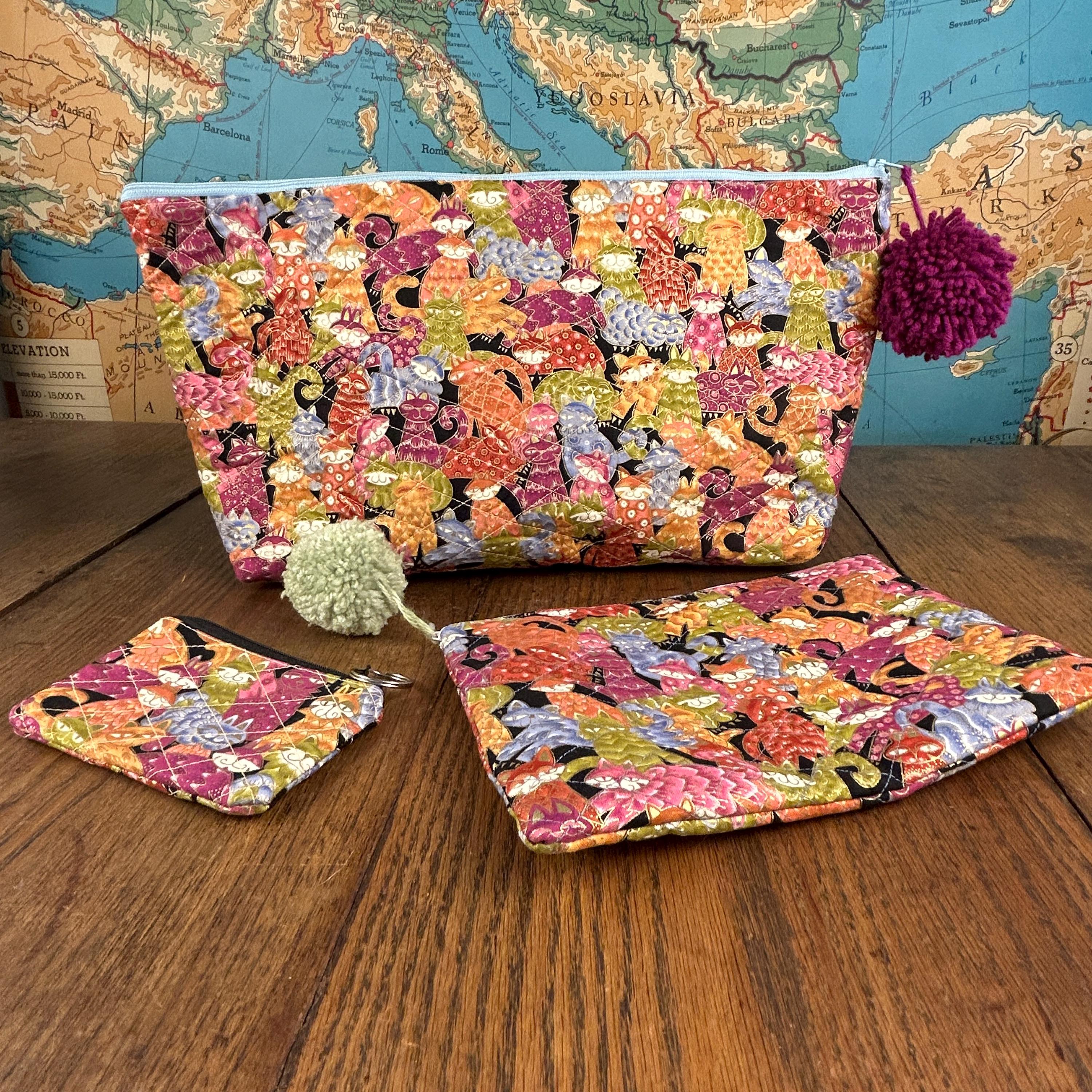 This handmade quilted pouch set of three features a whimsical, colorful cat design paired with fun pom-pom zipper accents. Each bag is carefully crafted and fully lined with a cheerful green and yellow polka-dot fabric, making the set both practical and joyful to use.