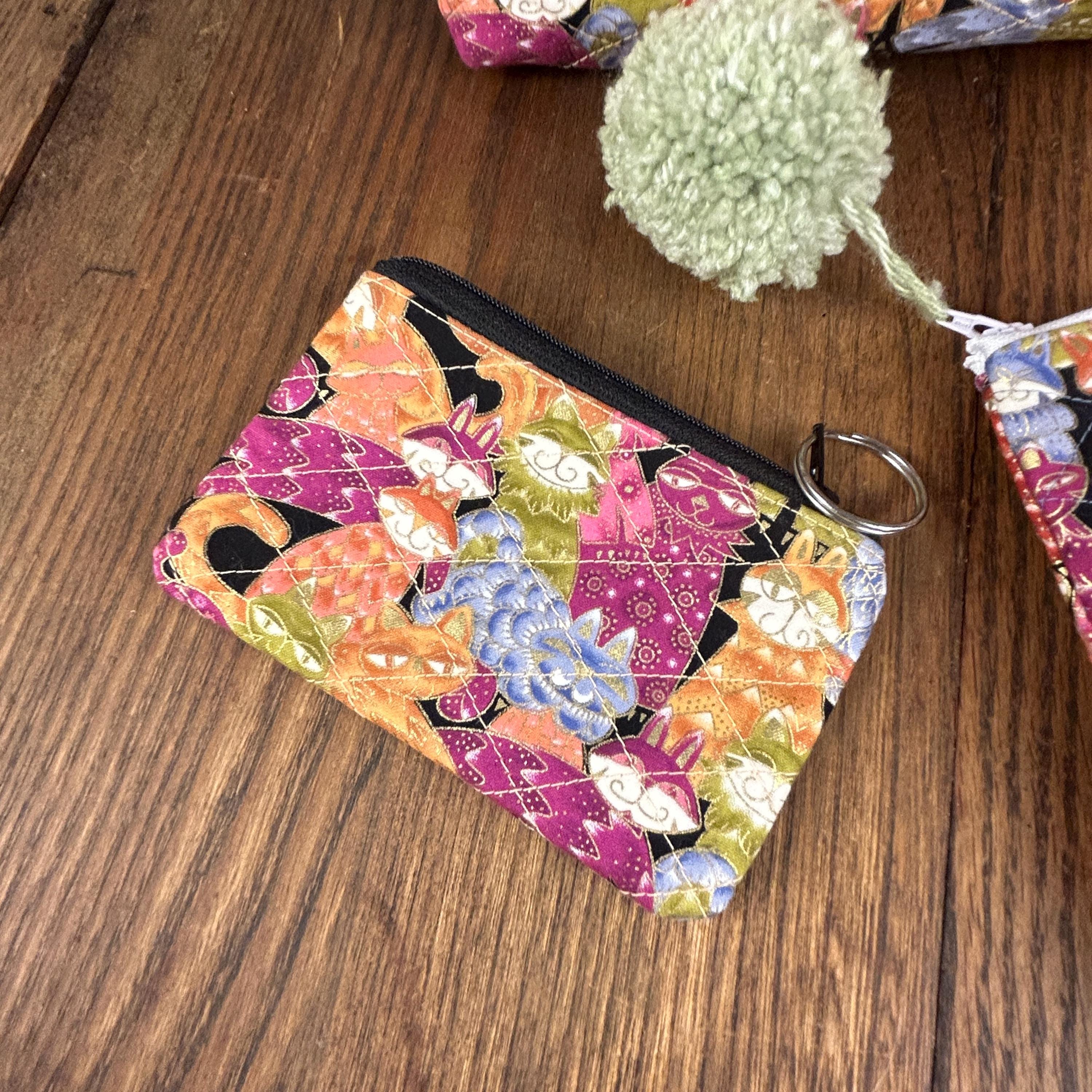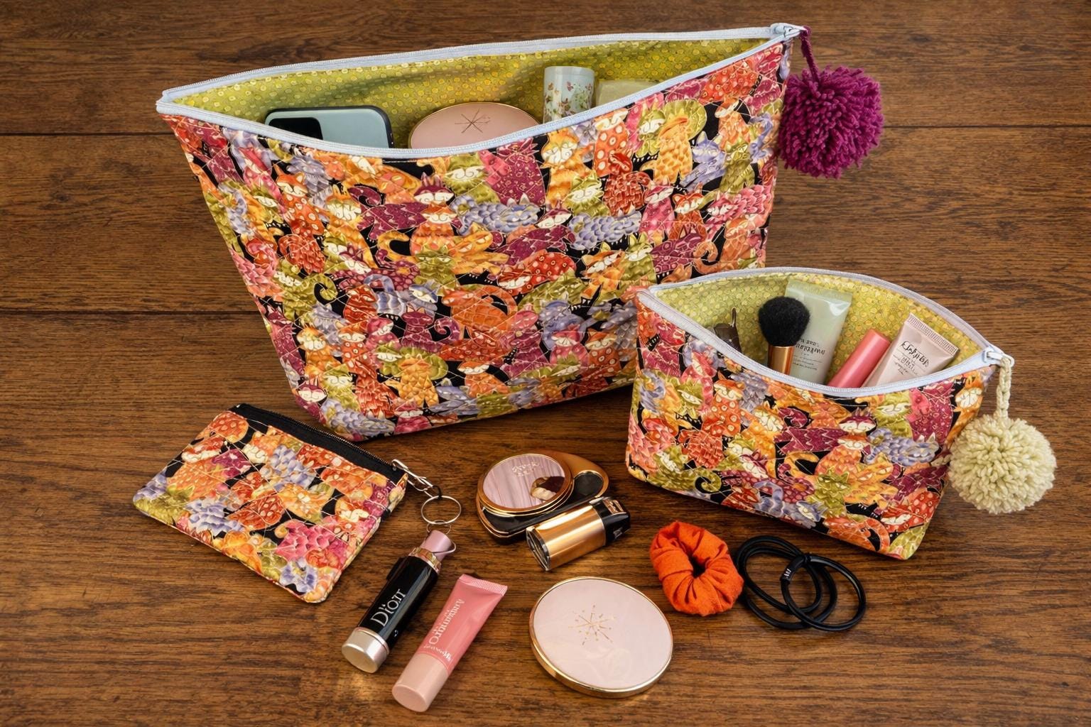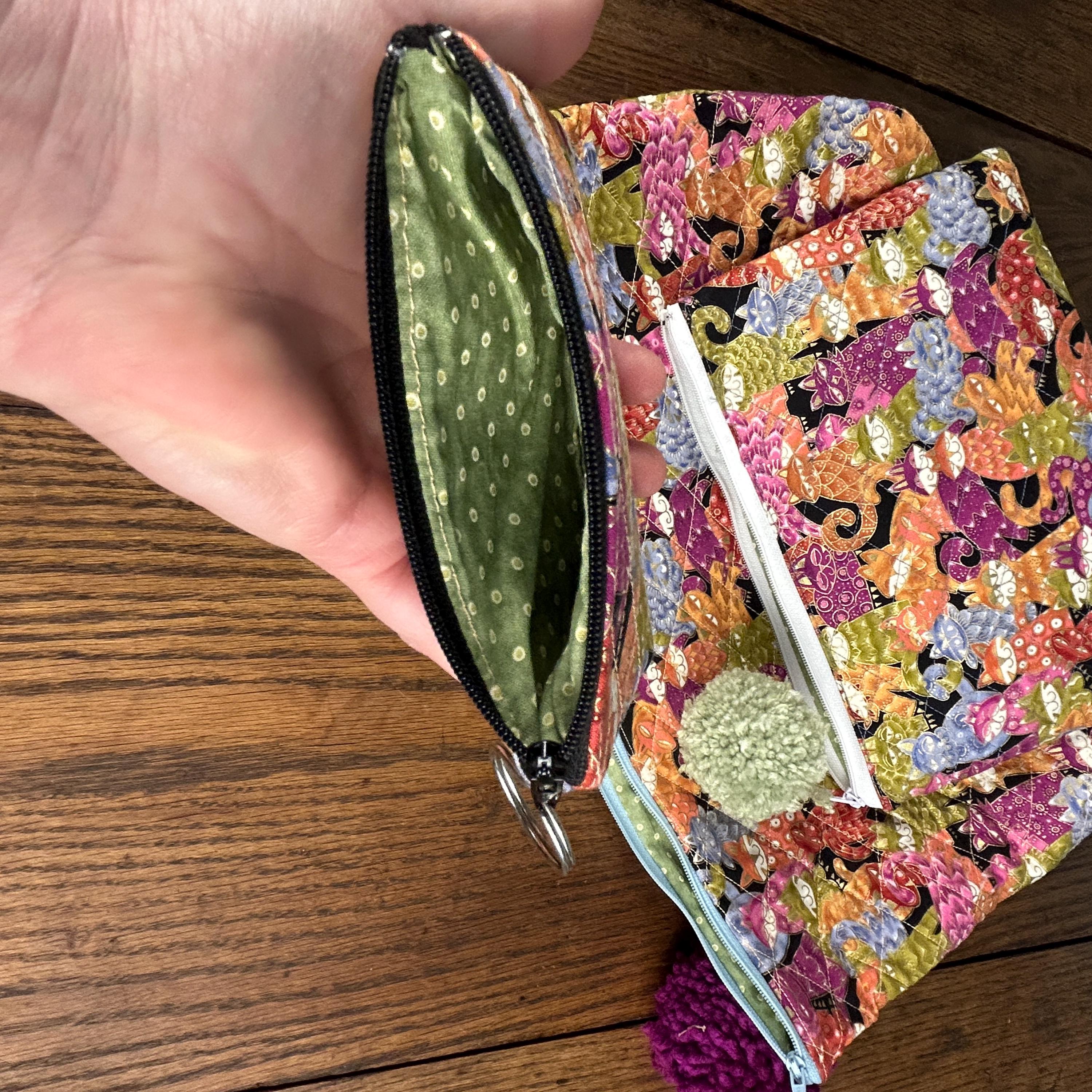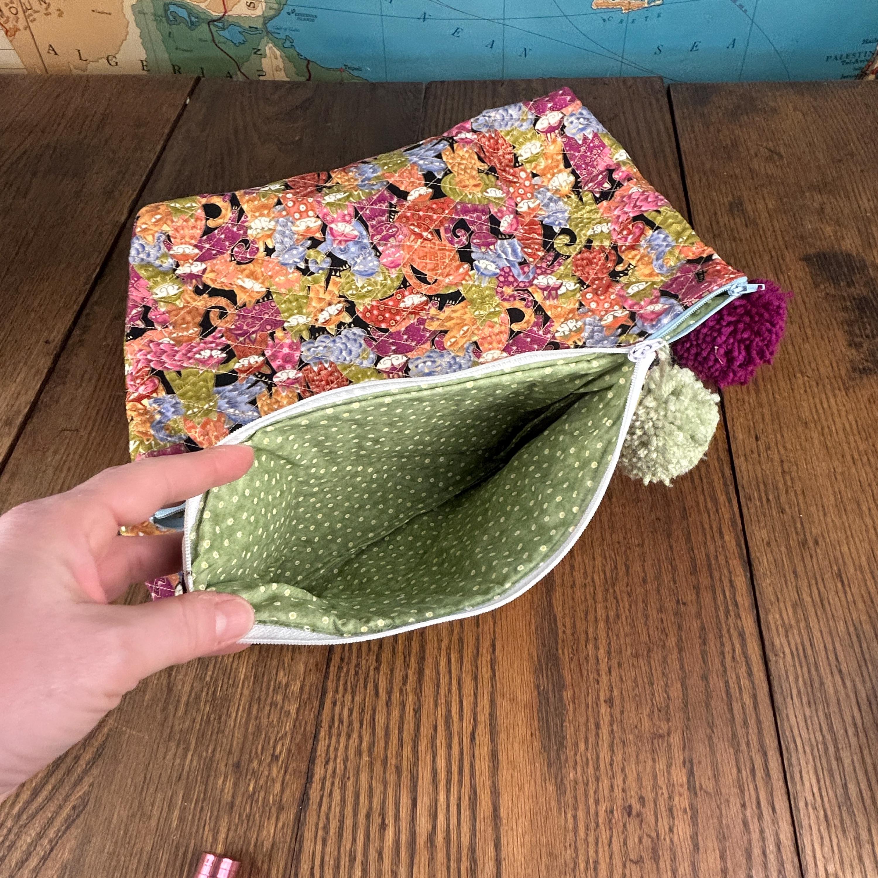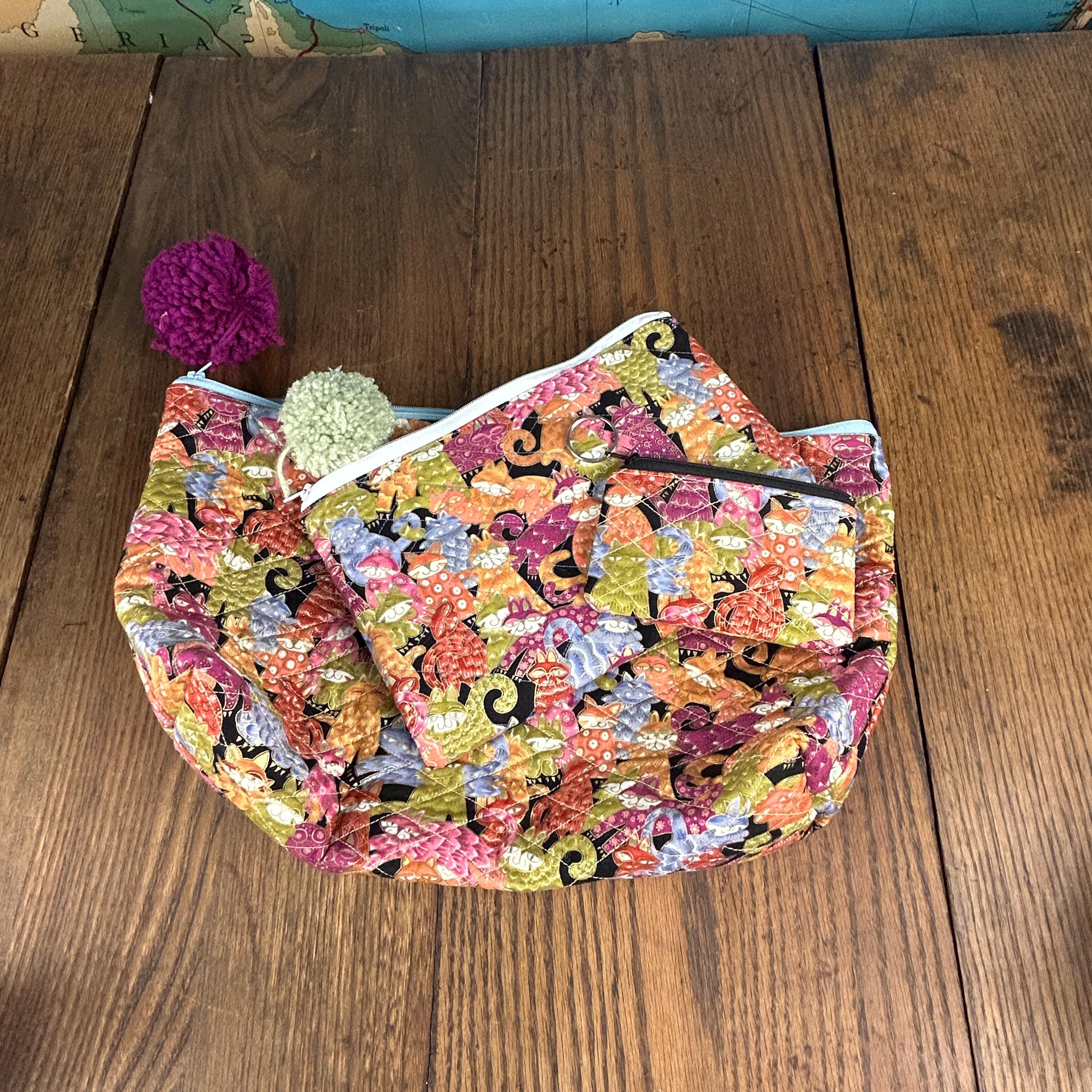 This handmade quilted pouch set of three features a whimsical, colorful cat design paired with fun pom-pom zipper accents. Each bag is carefully crafted and fully lined with a cheerful green and yellow polka-dot fabric, making the set both practical and joyful to use.