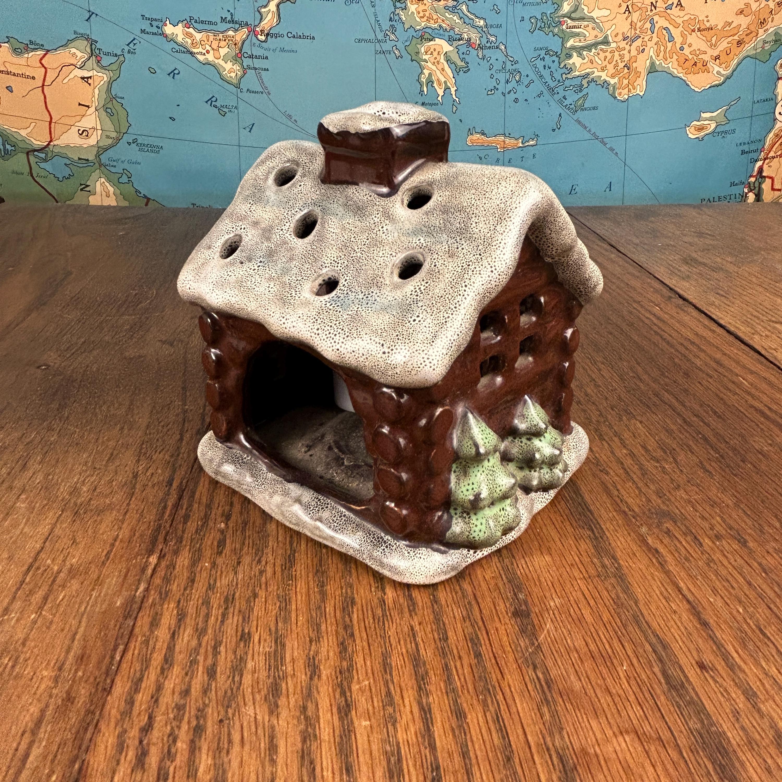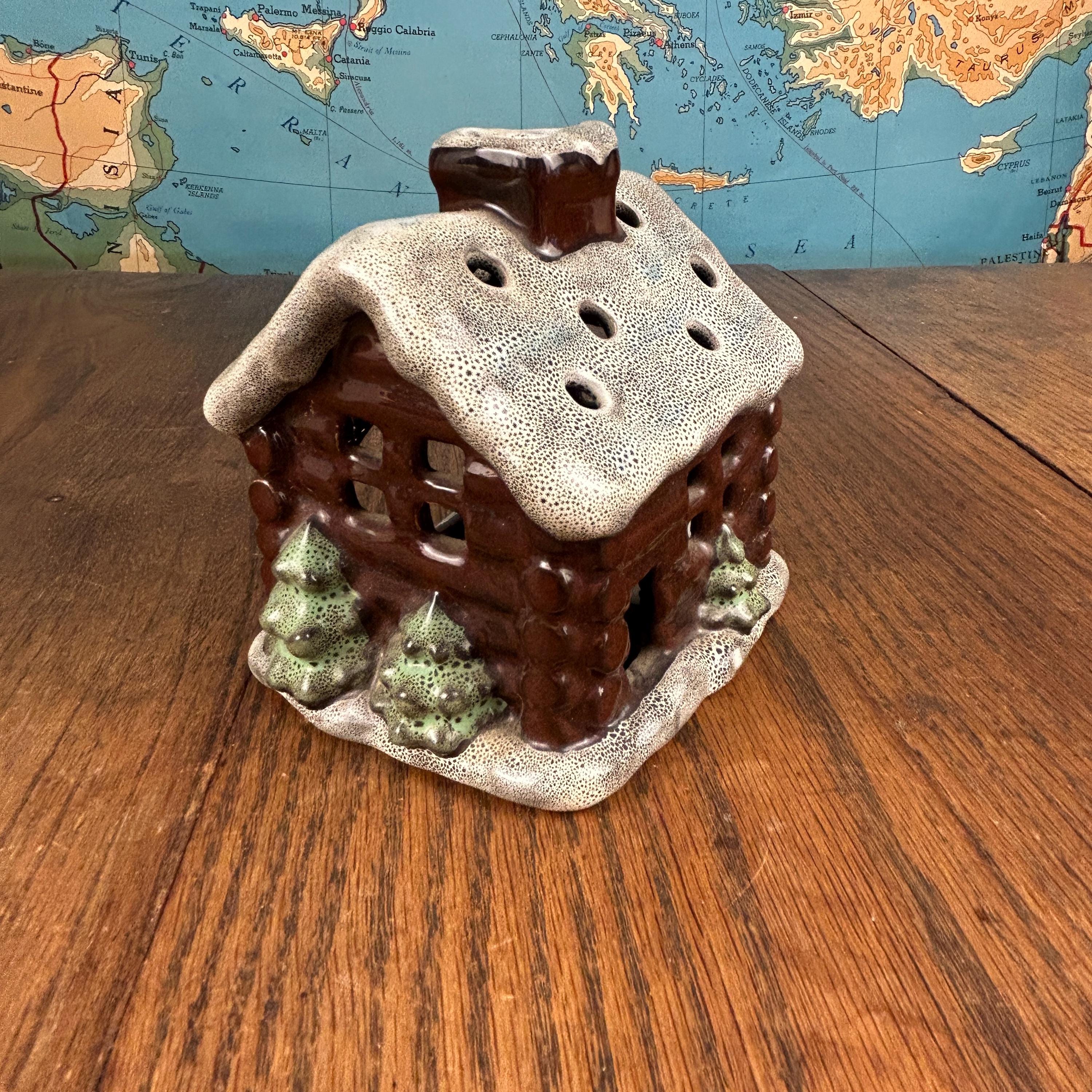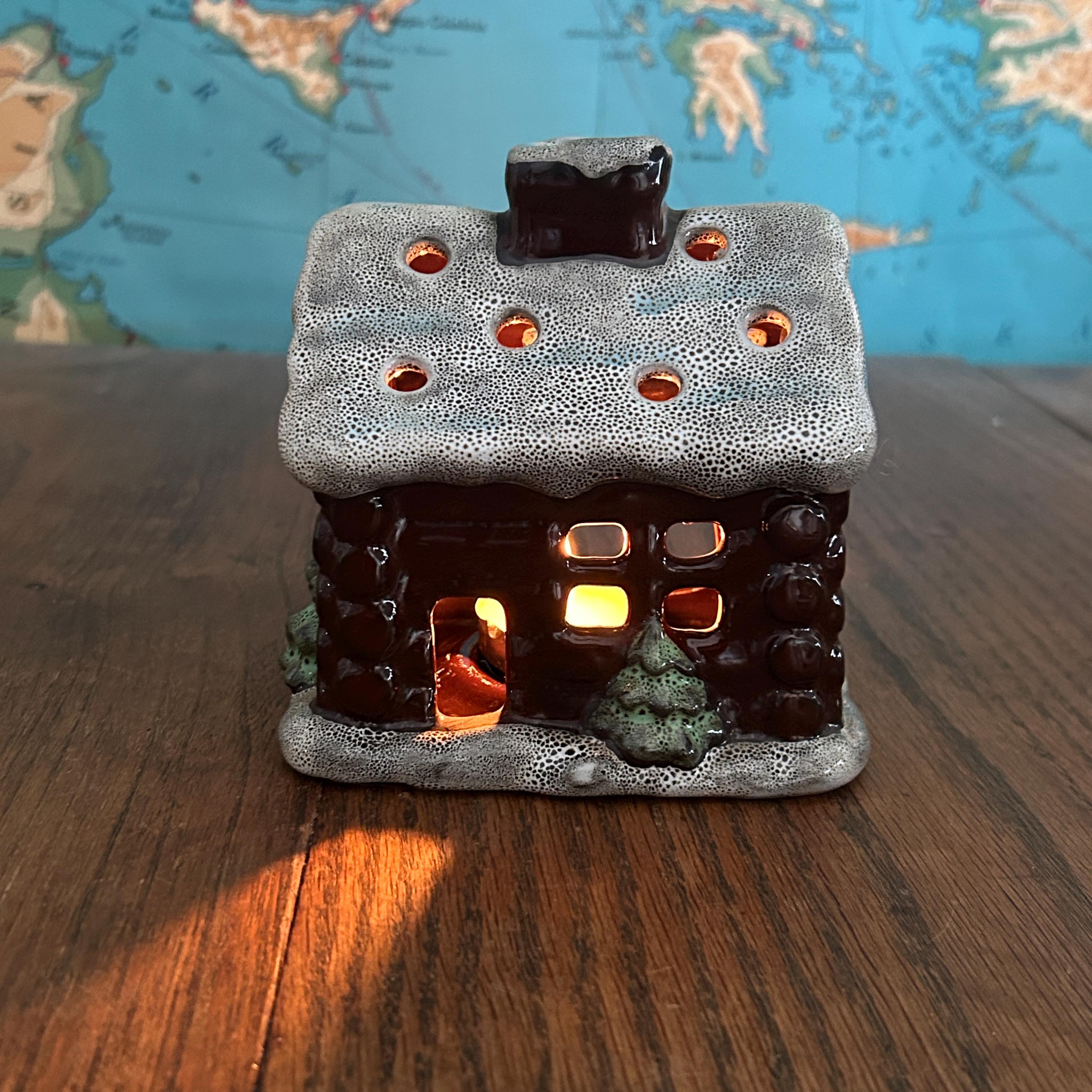 Create a warm, cozy glow with this mini Christmas village log cabin house, beautifully handcrafted from ceramic and designed to hold a standard tealight candle. With its snow-covered roof, rustic brown log cabin walls, and tiny cutout windows, this charming miniature comes to life when lit from within.