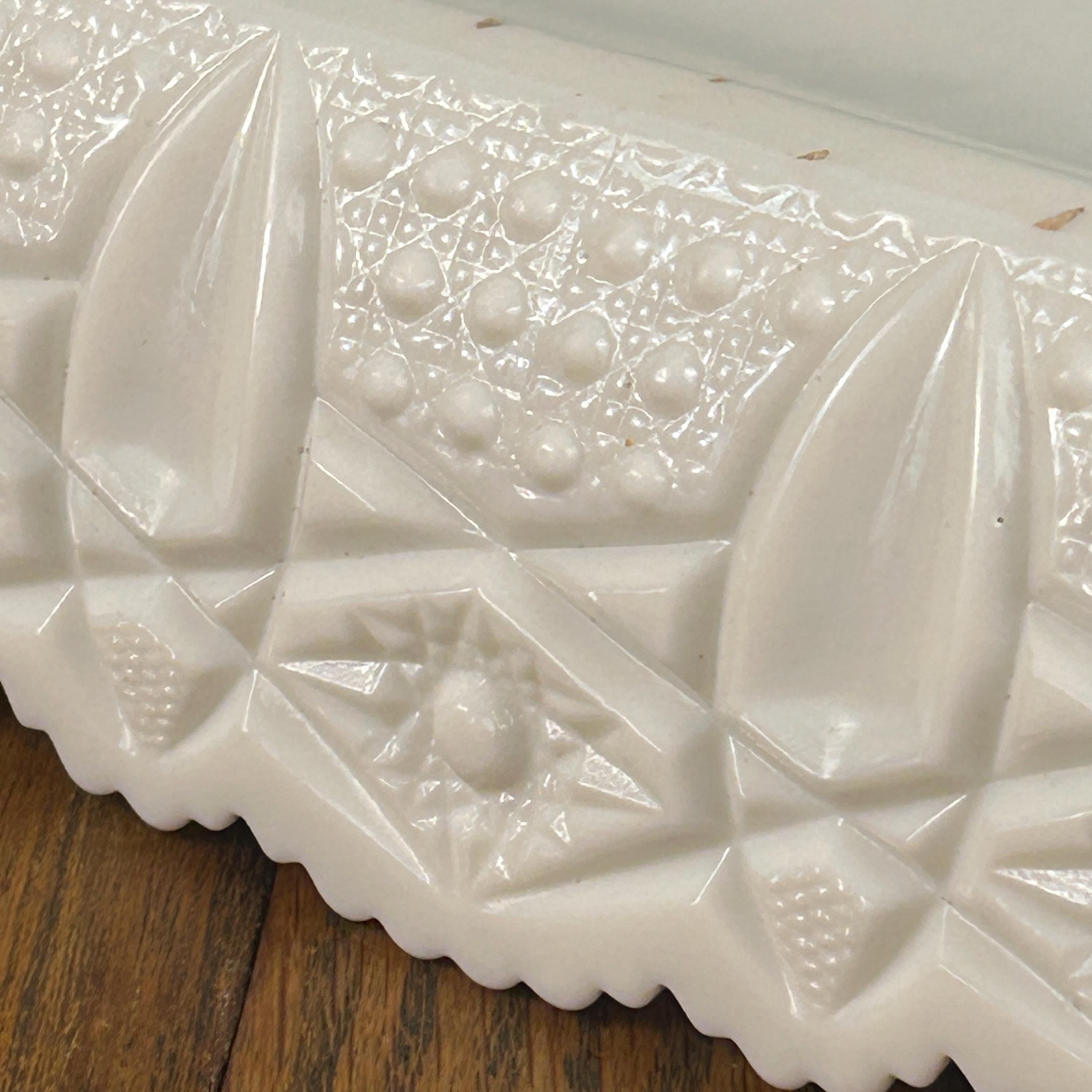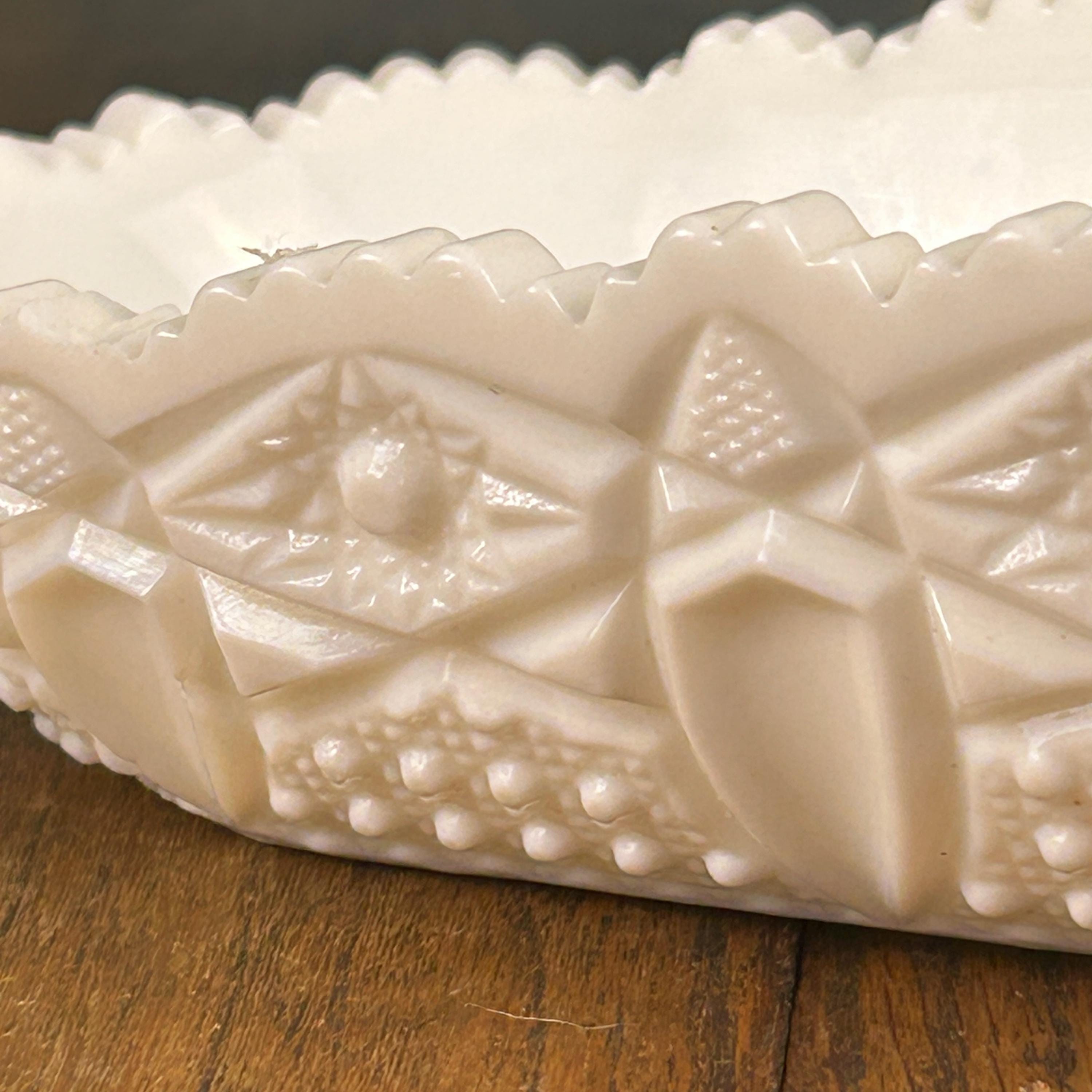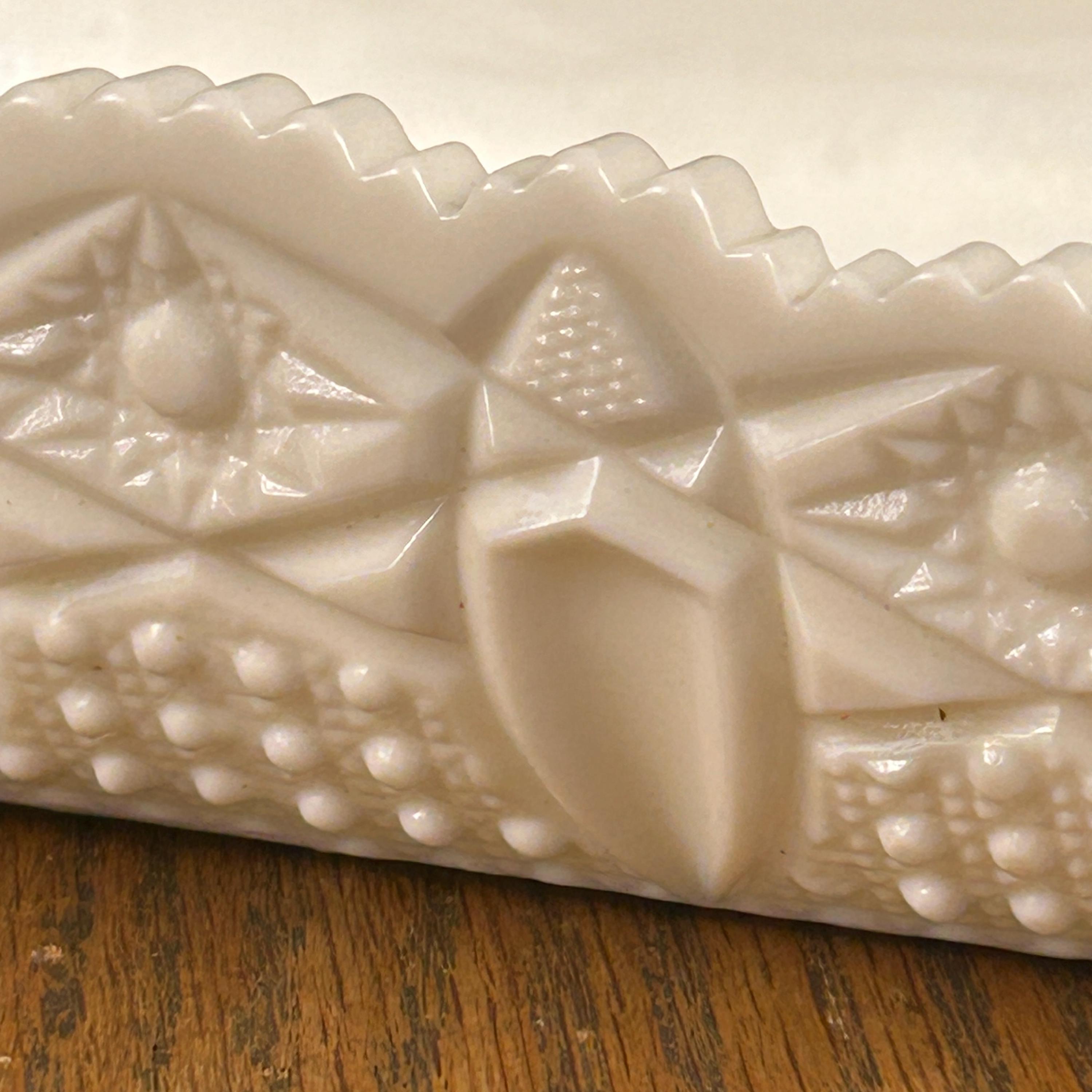 Beautiful vintage milk glass celery dish featuring the classic Quintec pattern, commonly attributed to L.E. Smith or Kemple. This elegant pressed white milk glass piece showcases a distinctive sawtooth (toothed) rim and detailed geometric pattern often referred to as button and star.