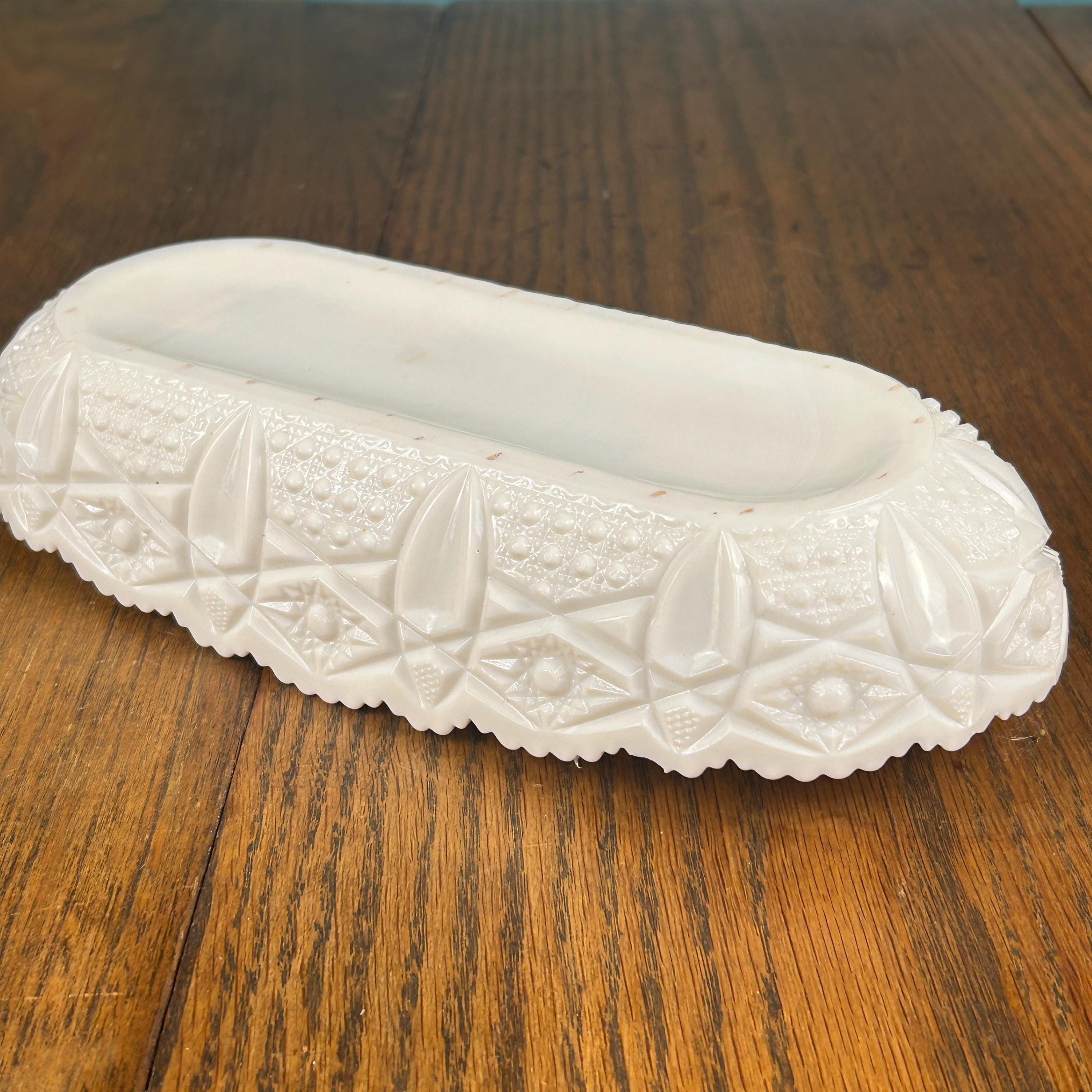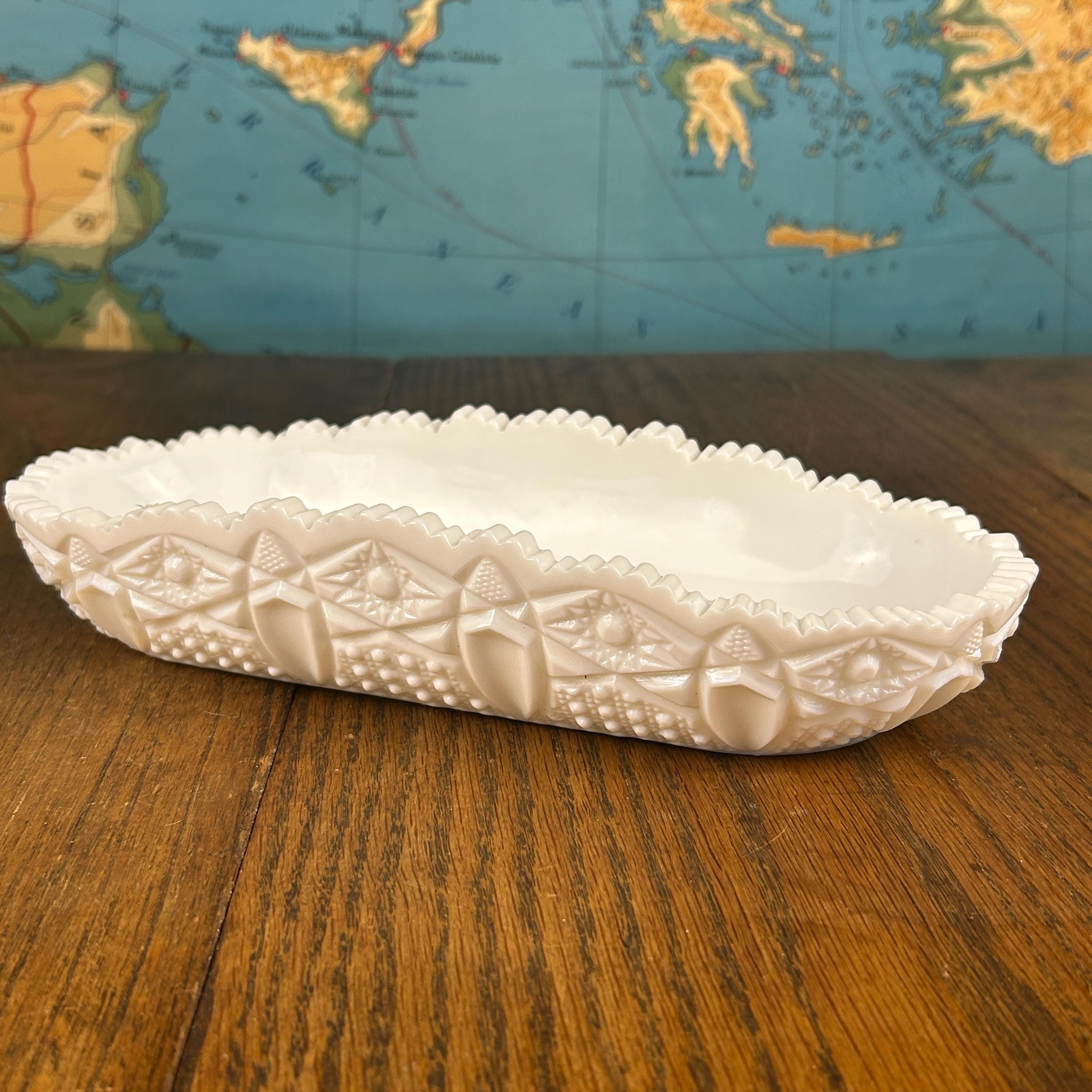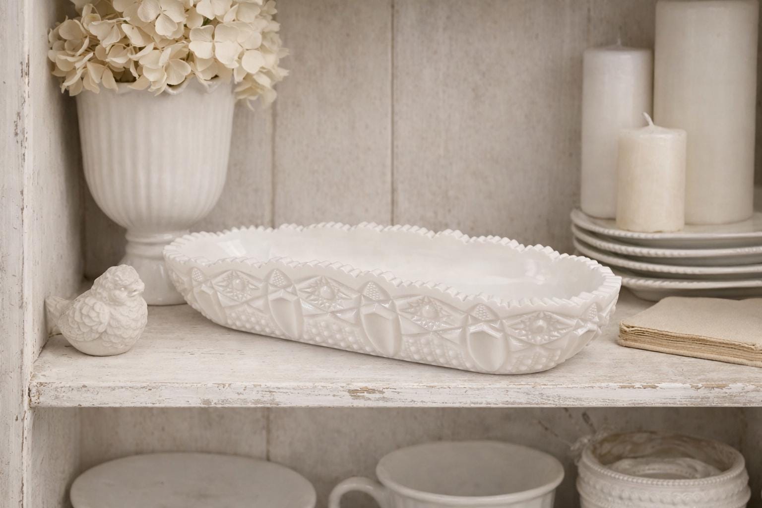 The crisp white glass and sculpted edge give this piece beautiful texture and dimension. Perfect for serving relishes, olives, pickles, or candy — or simply displayed in a hutch or on open shelving.