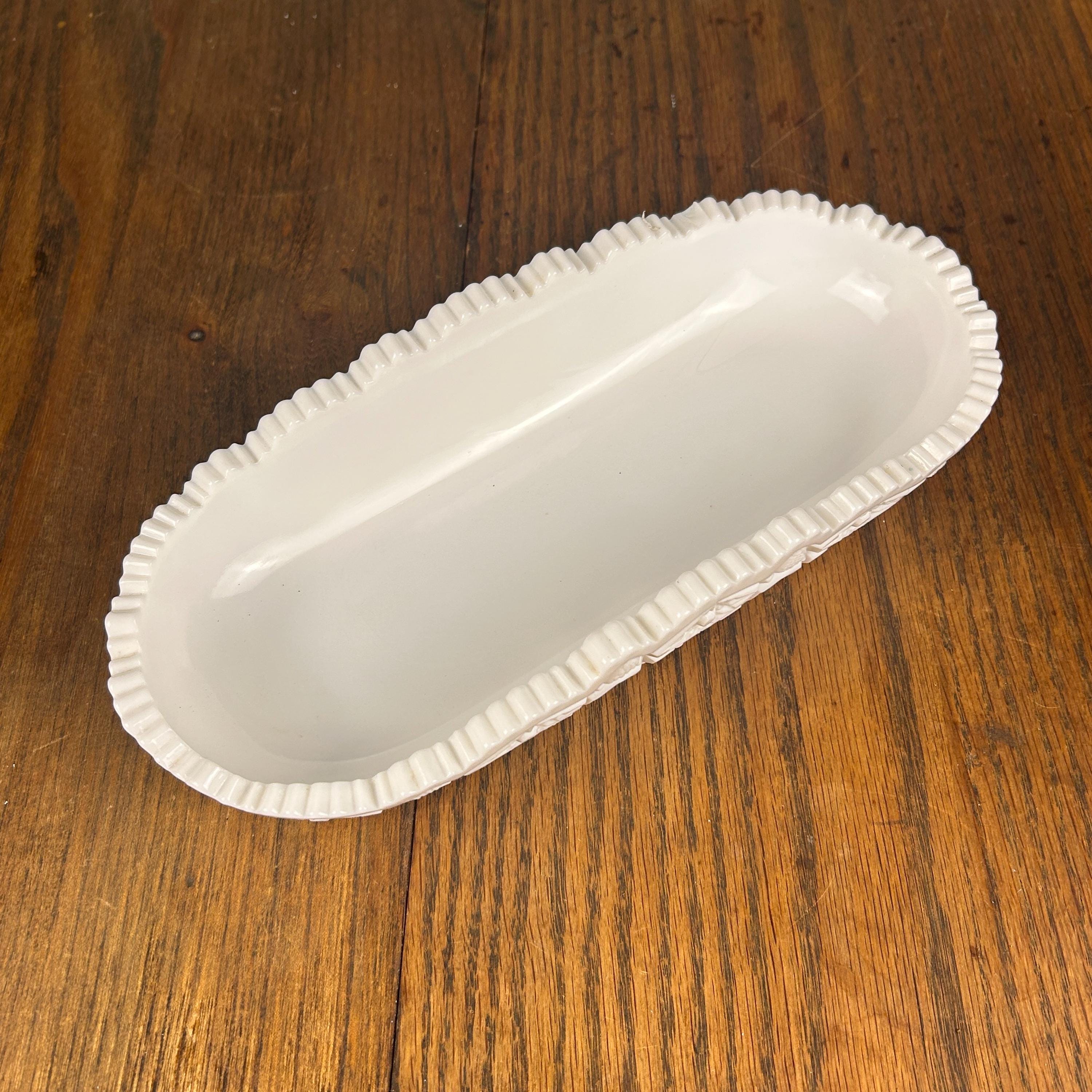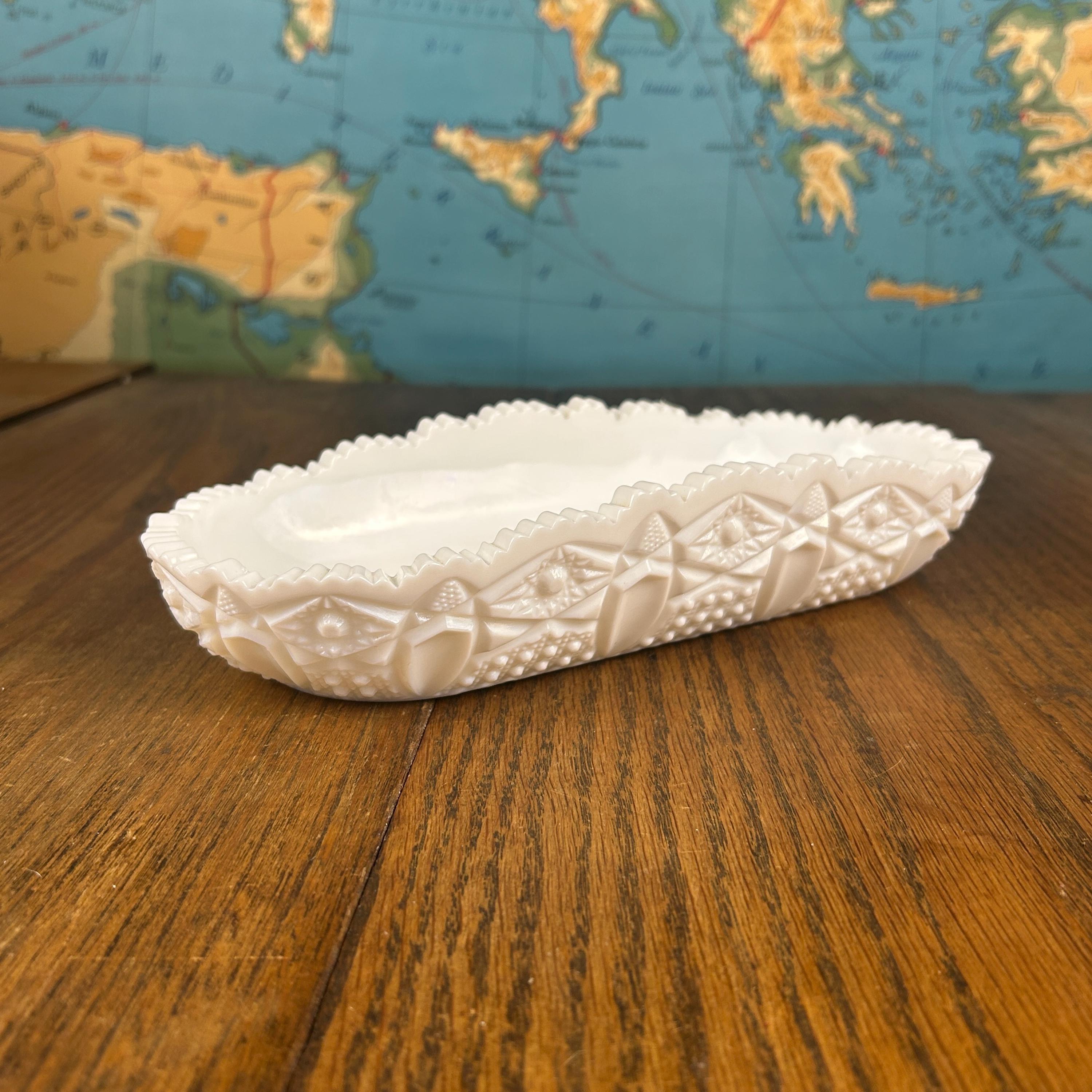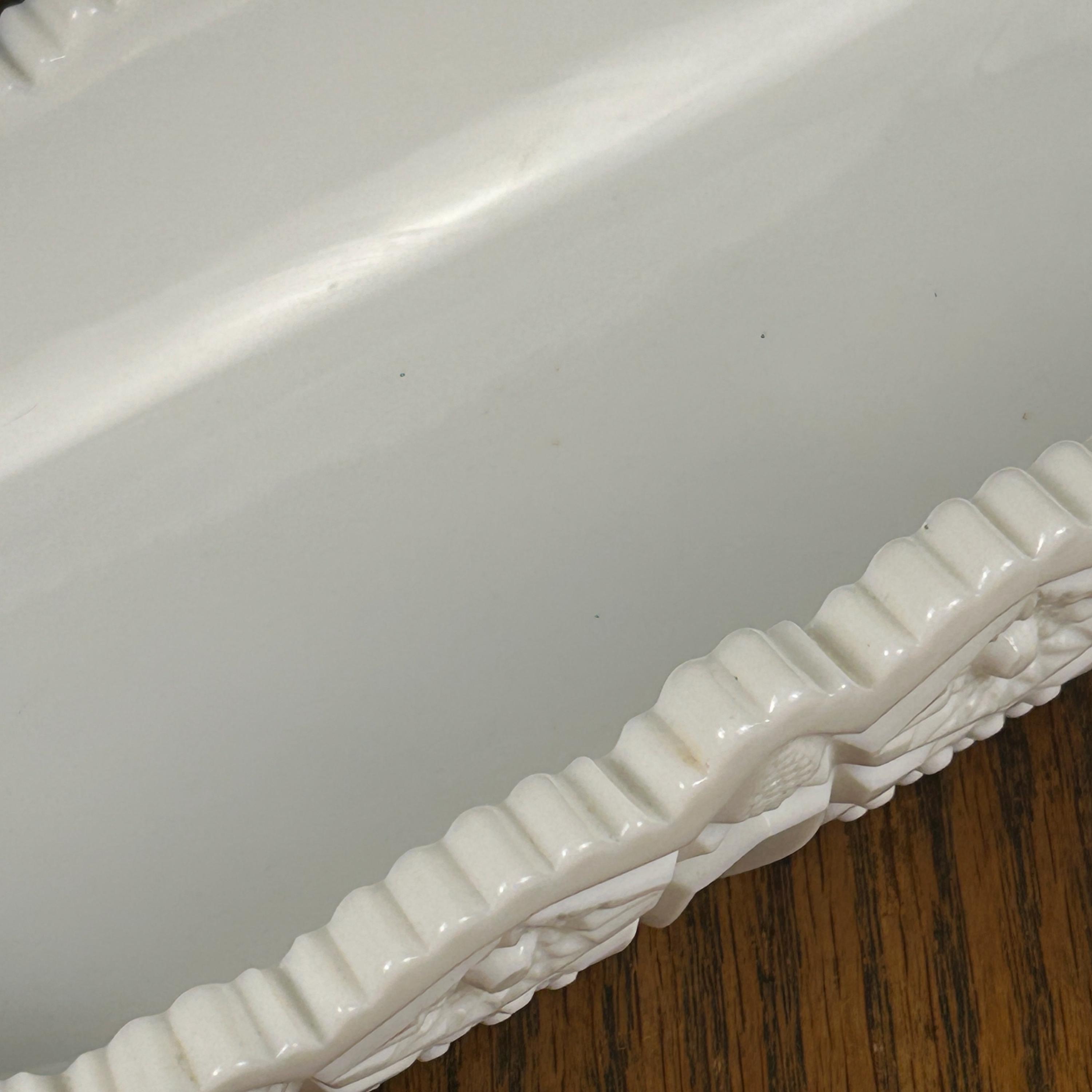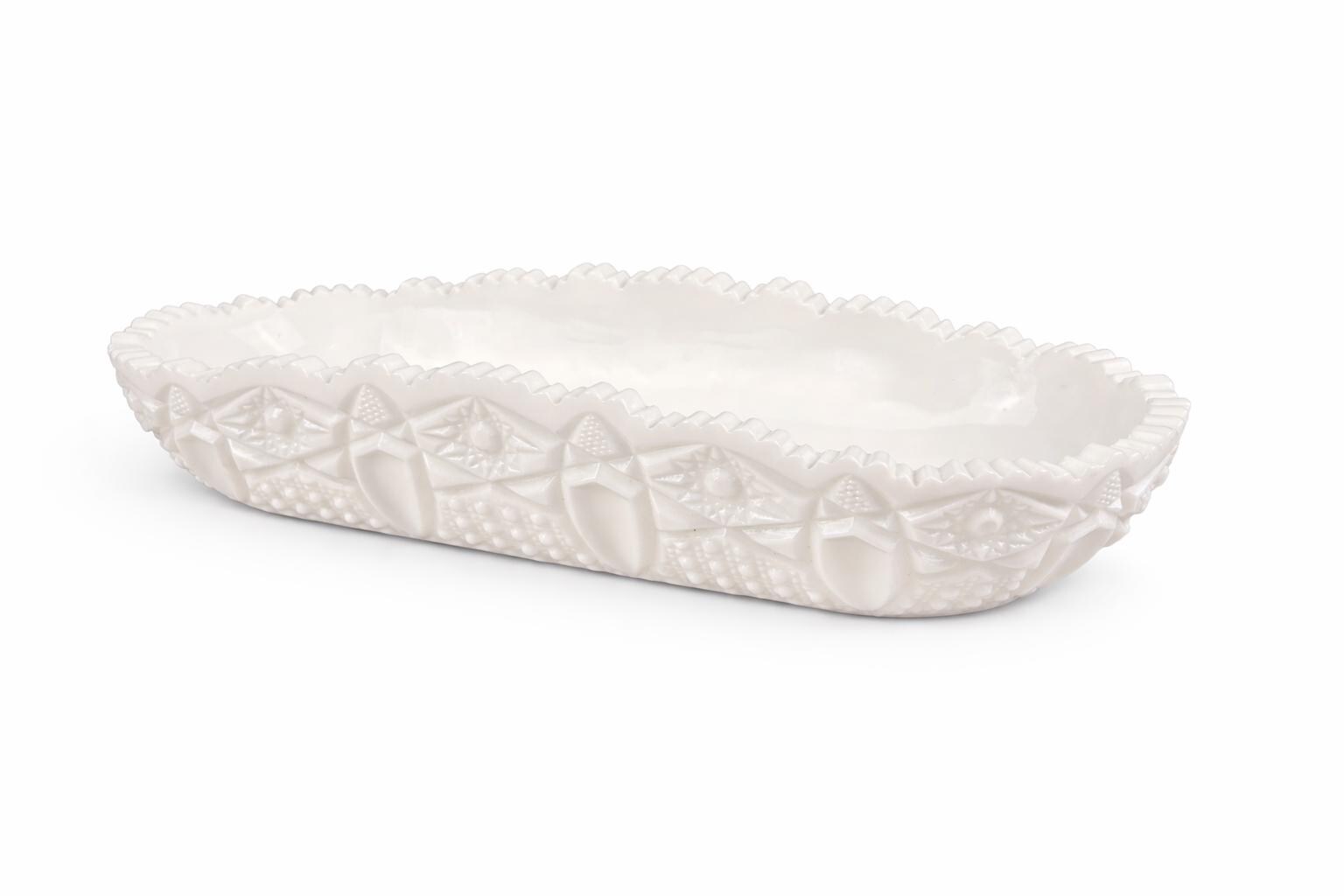 The crisp white glass and sculpted edge give this piece beautiful texture and dimension. Perfect for serving relishes, olives, pickles, or candy — or simply displayed in a hutch or on open shelving.