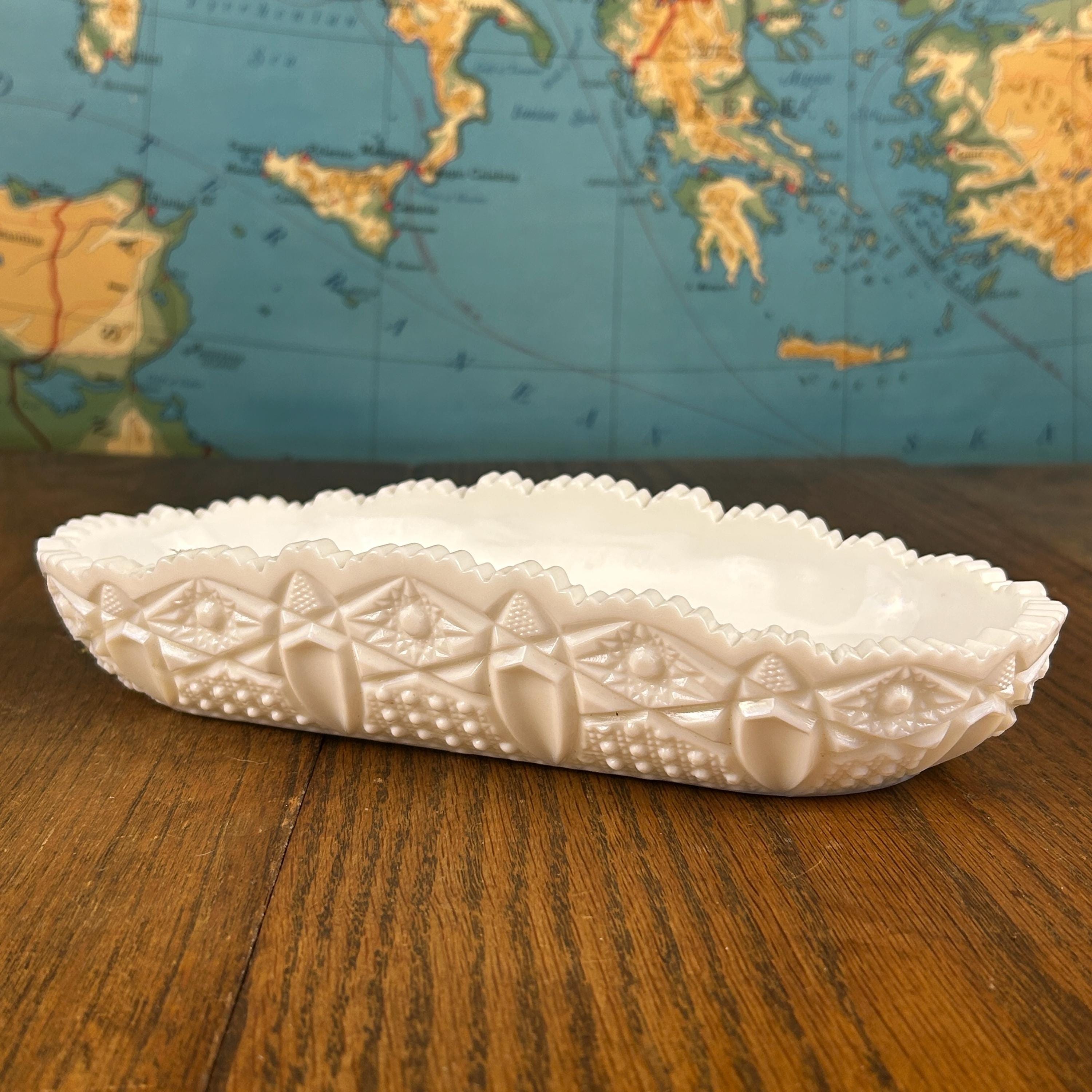 Vintage Milk Glass Celery Dish – L.E. Smith Quintec Sawtooth Edge – White Pressed Glass Relish Tray – 1940s 1950s Serving Dish