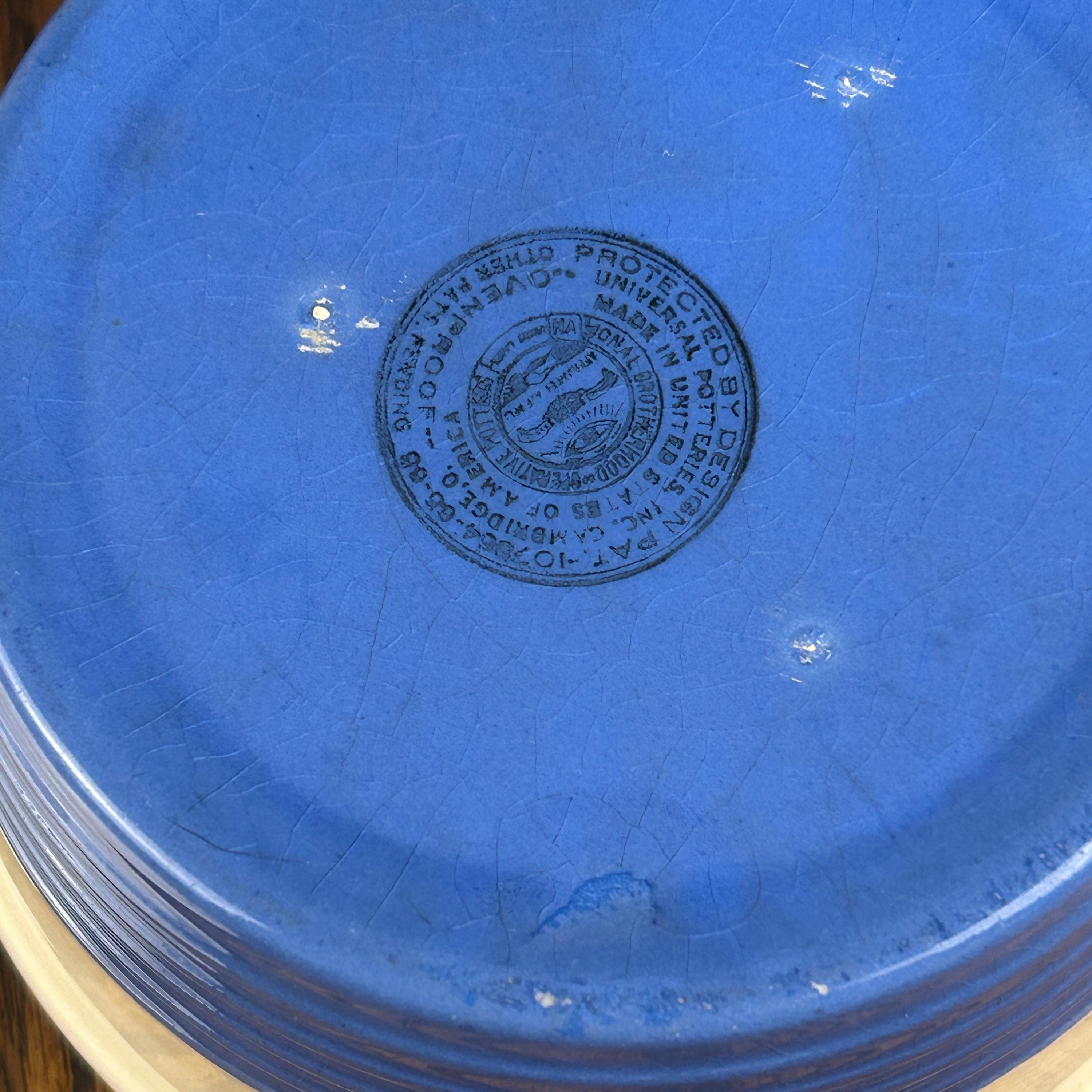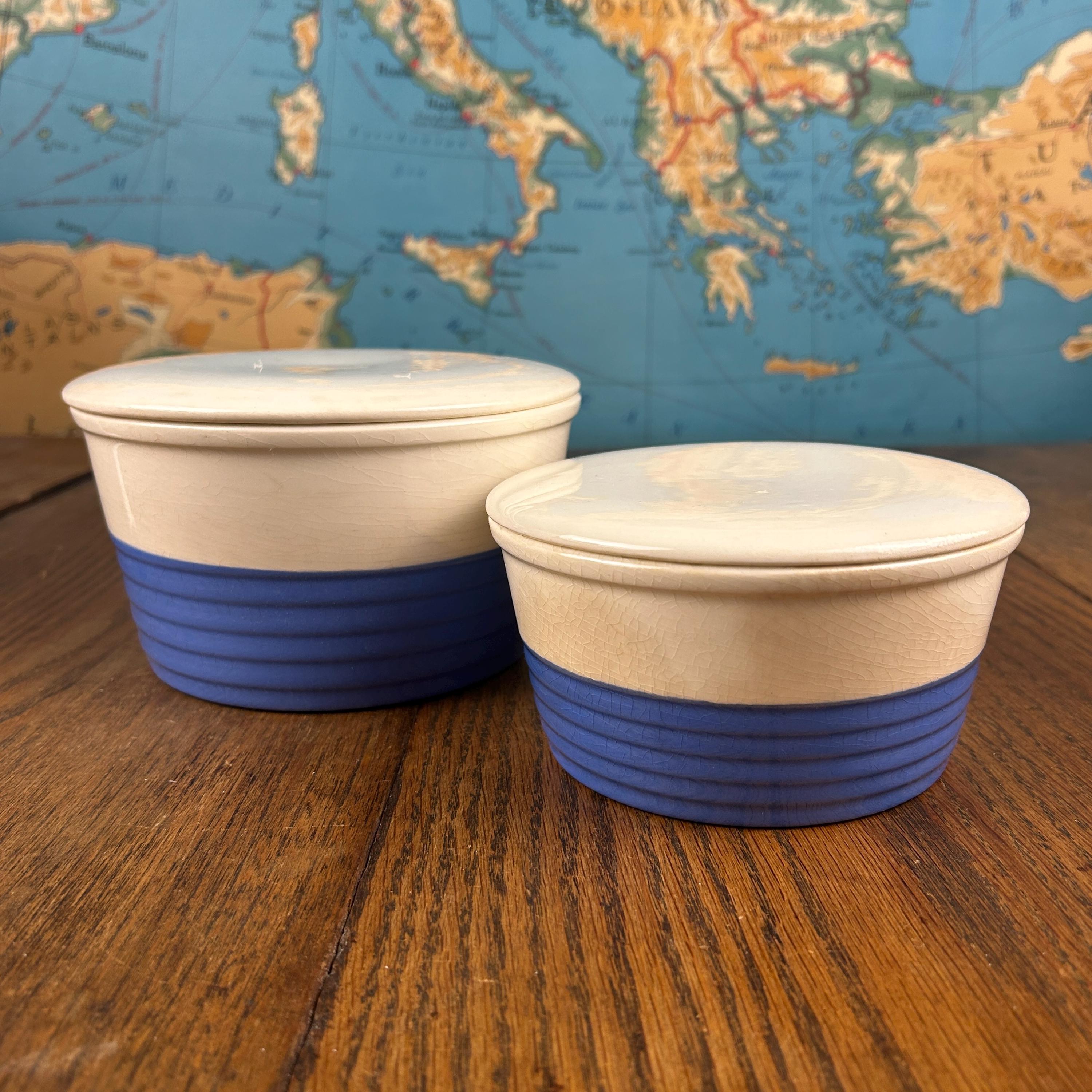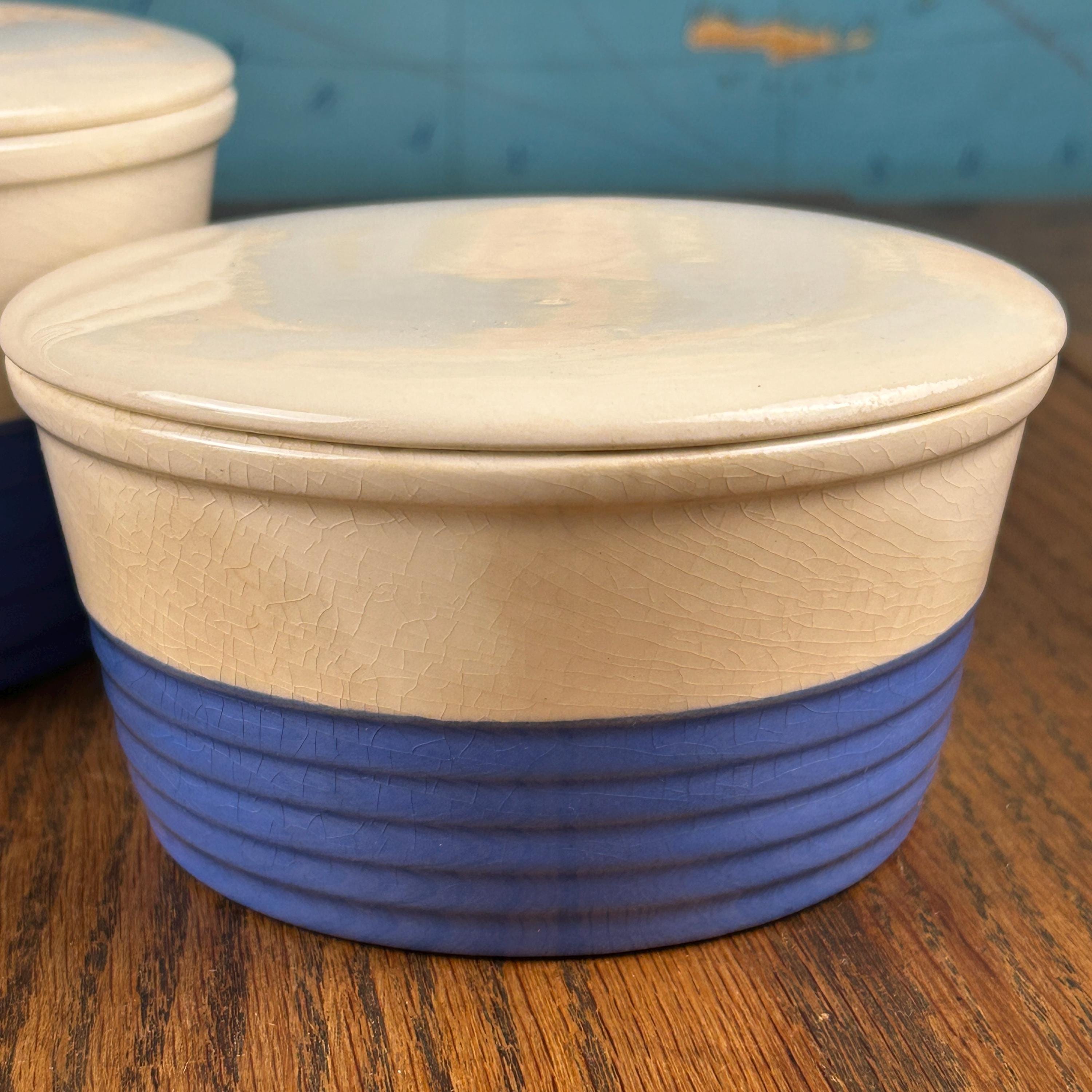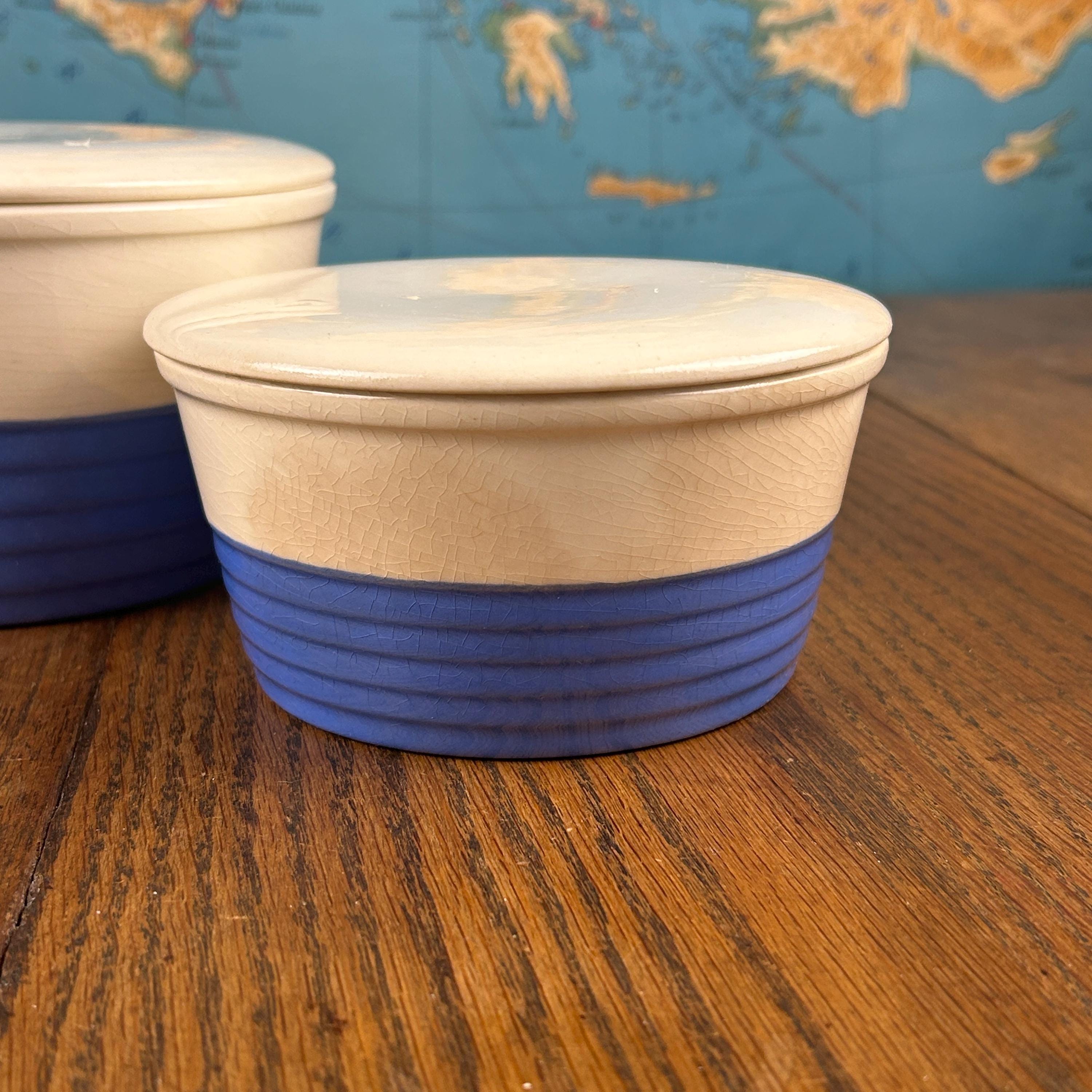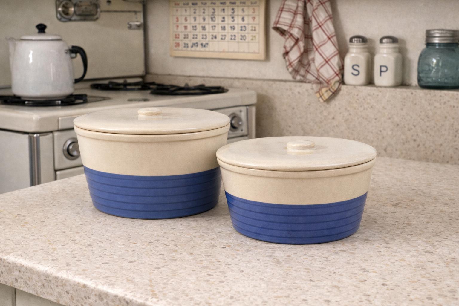 Add a classic touch of 1940s kitchen charm to your collection with these vintage Universal Potteries “Ringware” lidded bowls. Made in Cambridge, Ohio, these sturdy stoneware pieces feature the iconic ribbed (ringed) texture around the lower half and a beautiful two-tone blue and beige glaze.
