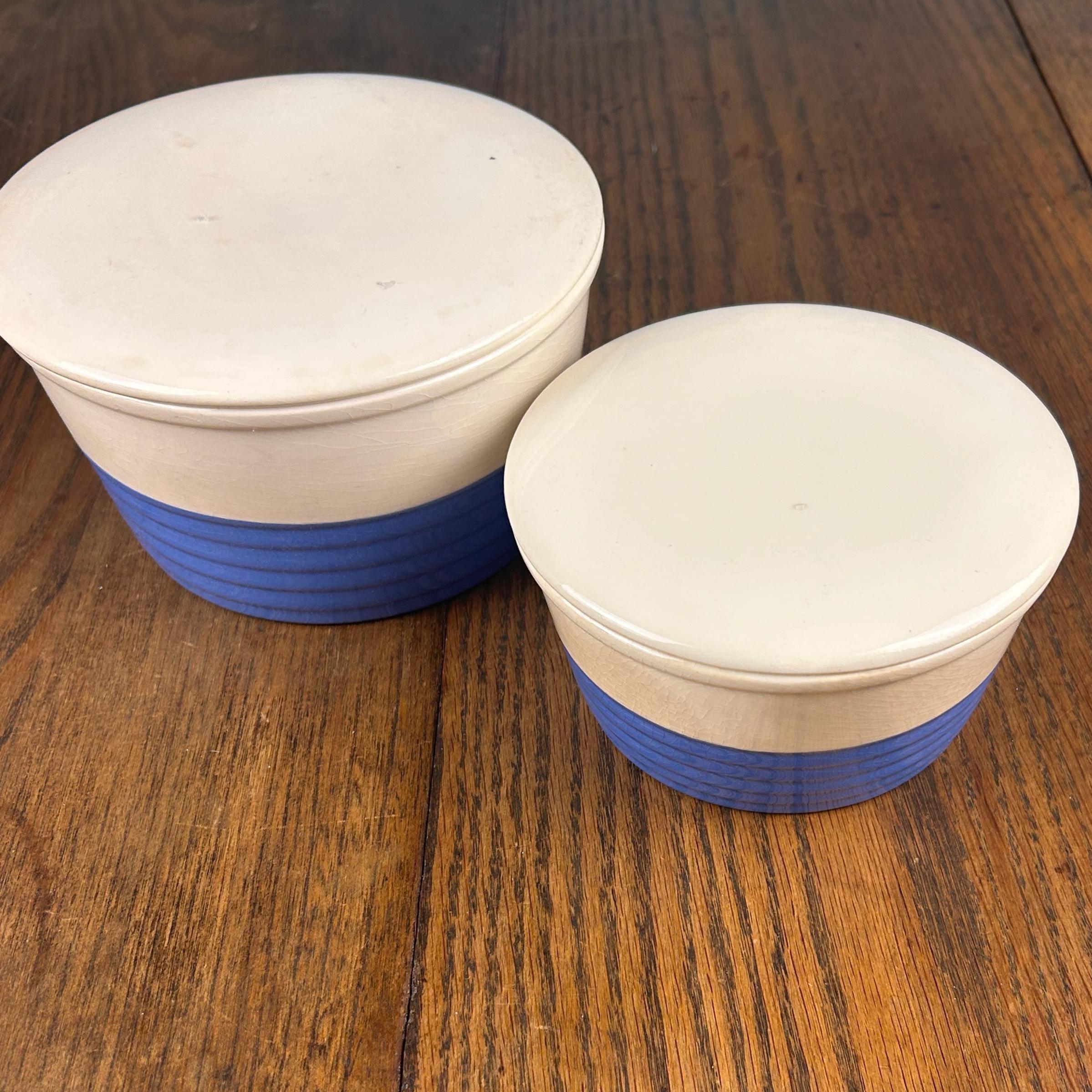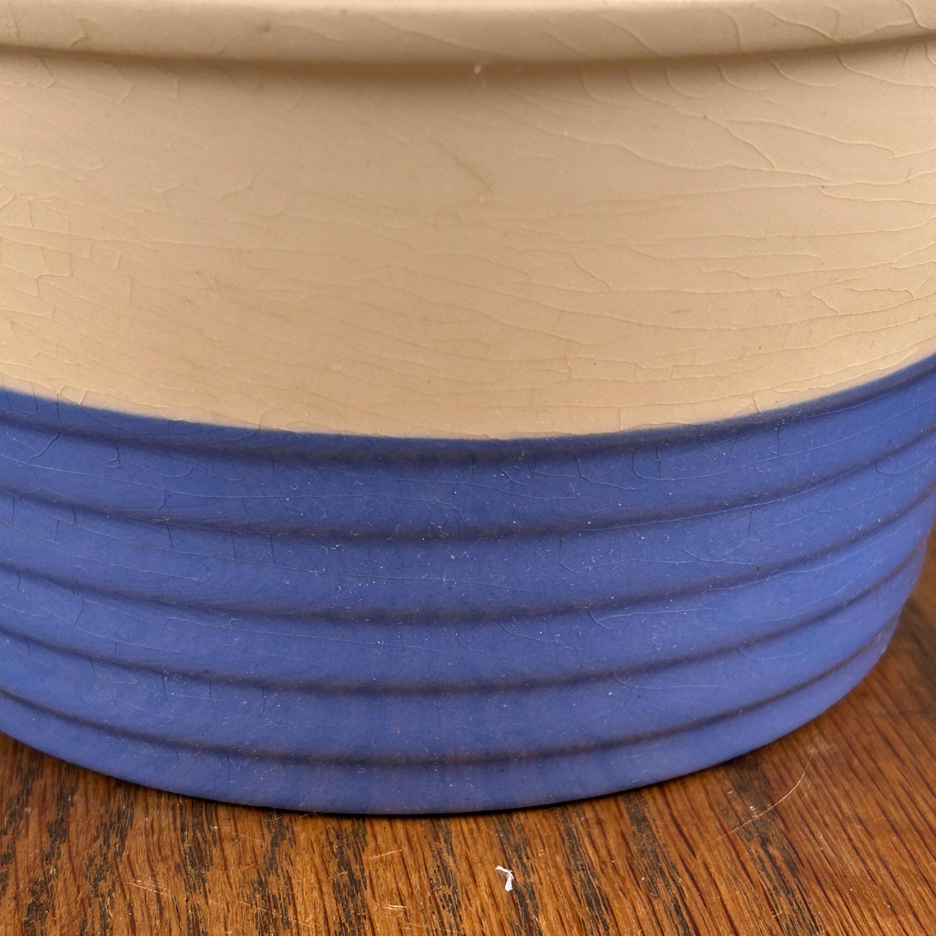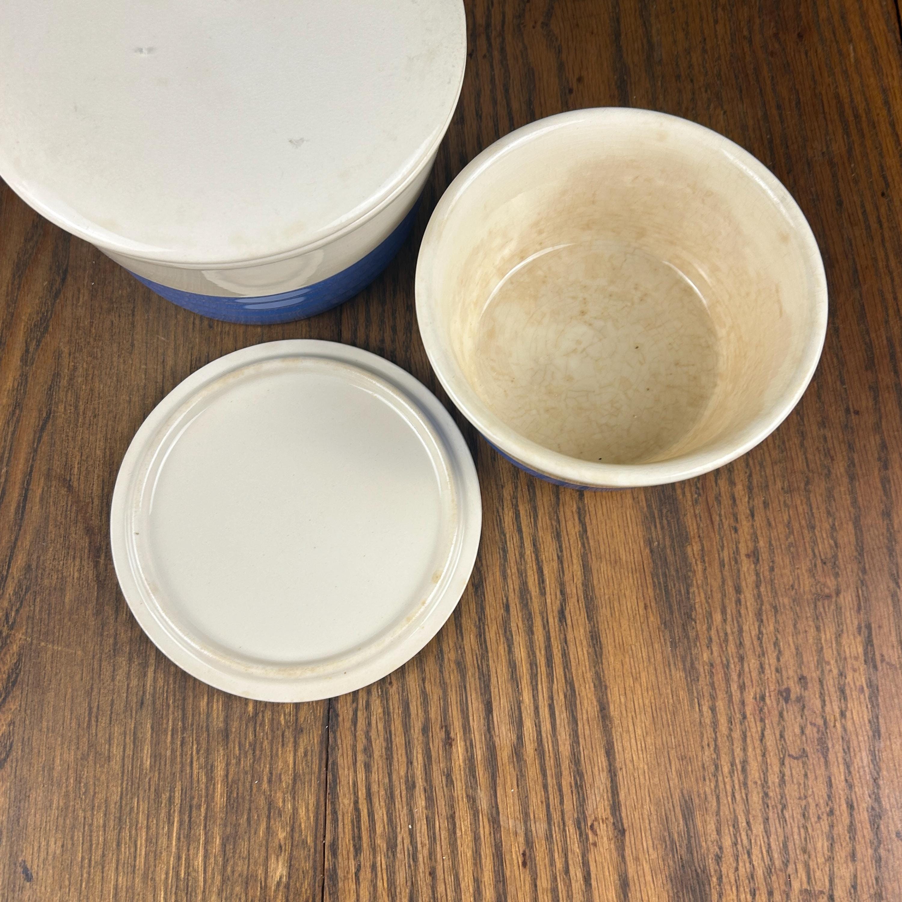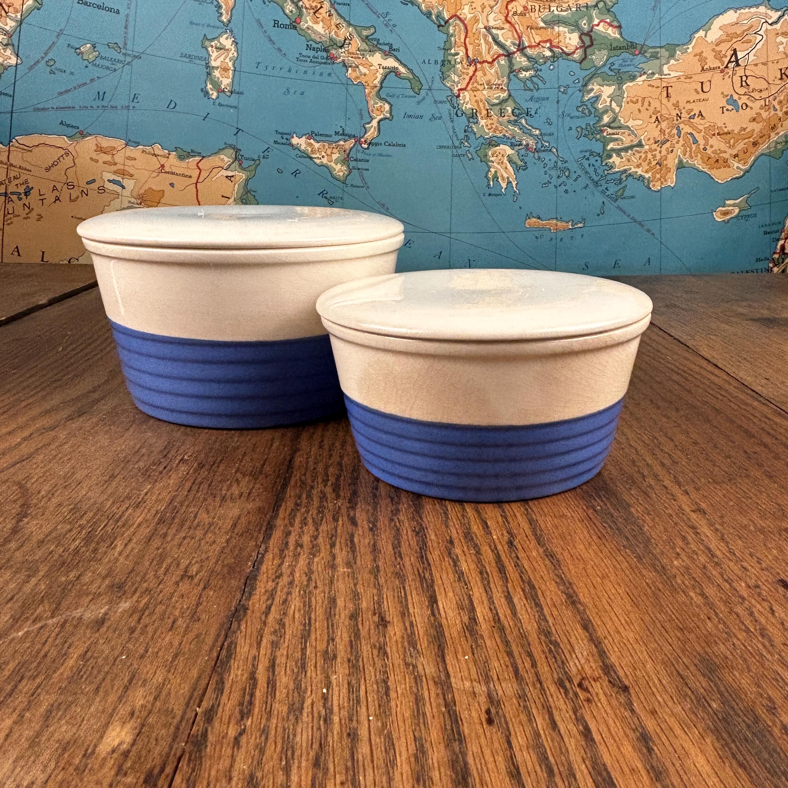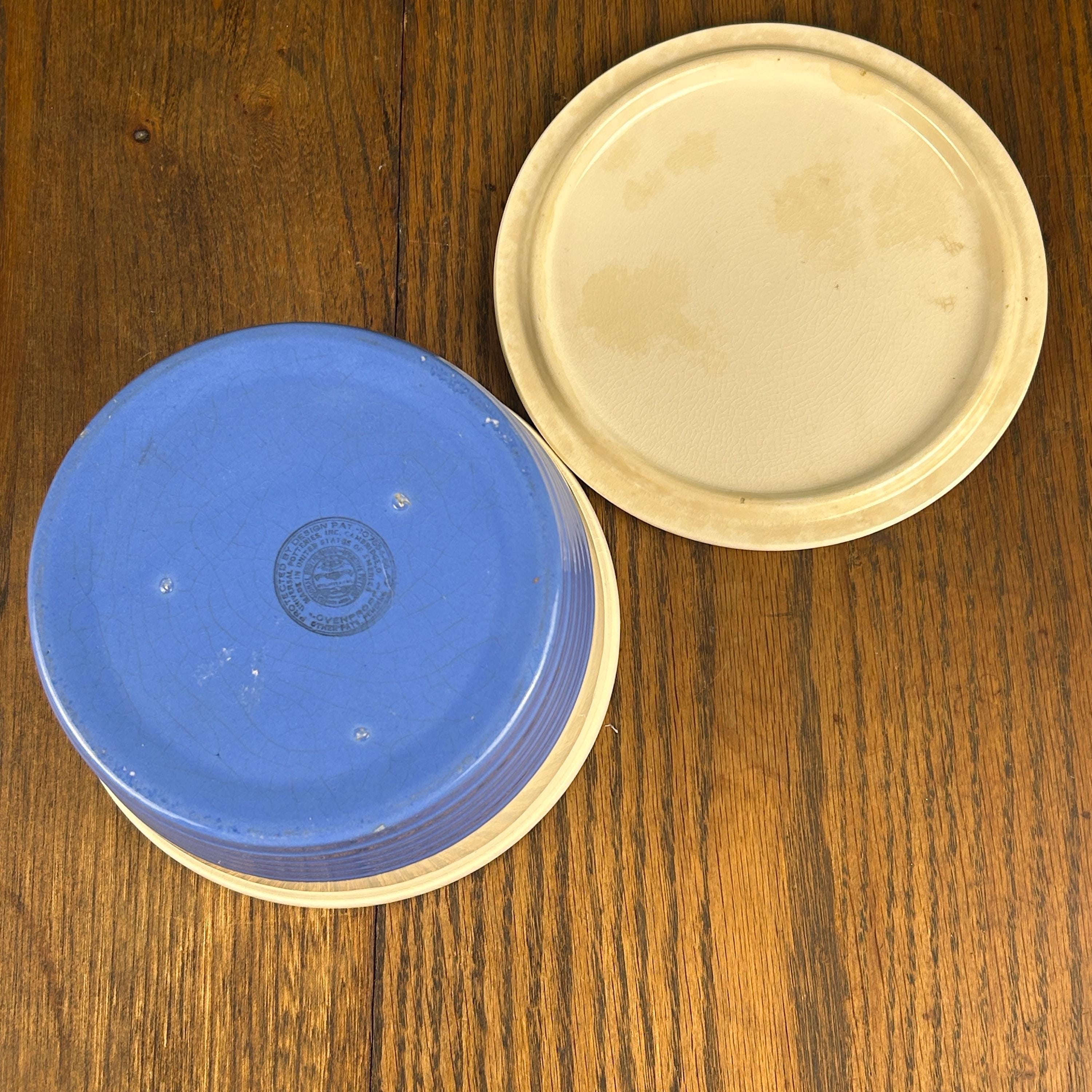 Add a classic touch of 1940s kitchen charm to your collection with these vintage Universal Potteries “Ringware” lidded bowls. Made in Cambridge, Ohio, these sturdy stoneware pieces feature the iconic ribbed (ringed) texture around the lower half and a beautiful two-tone blue and beige glaze.