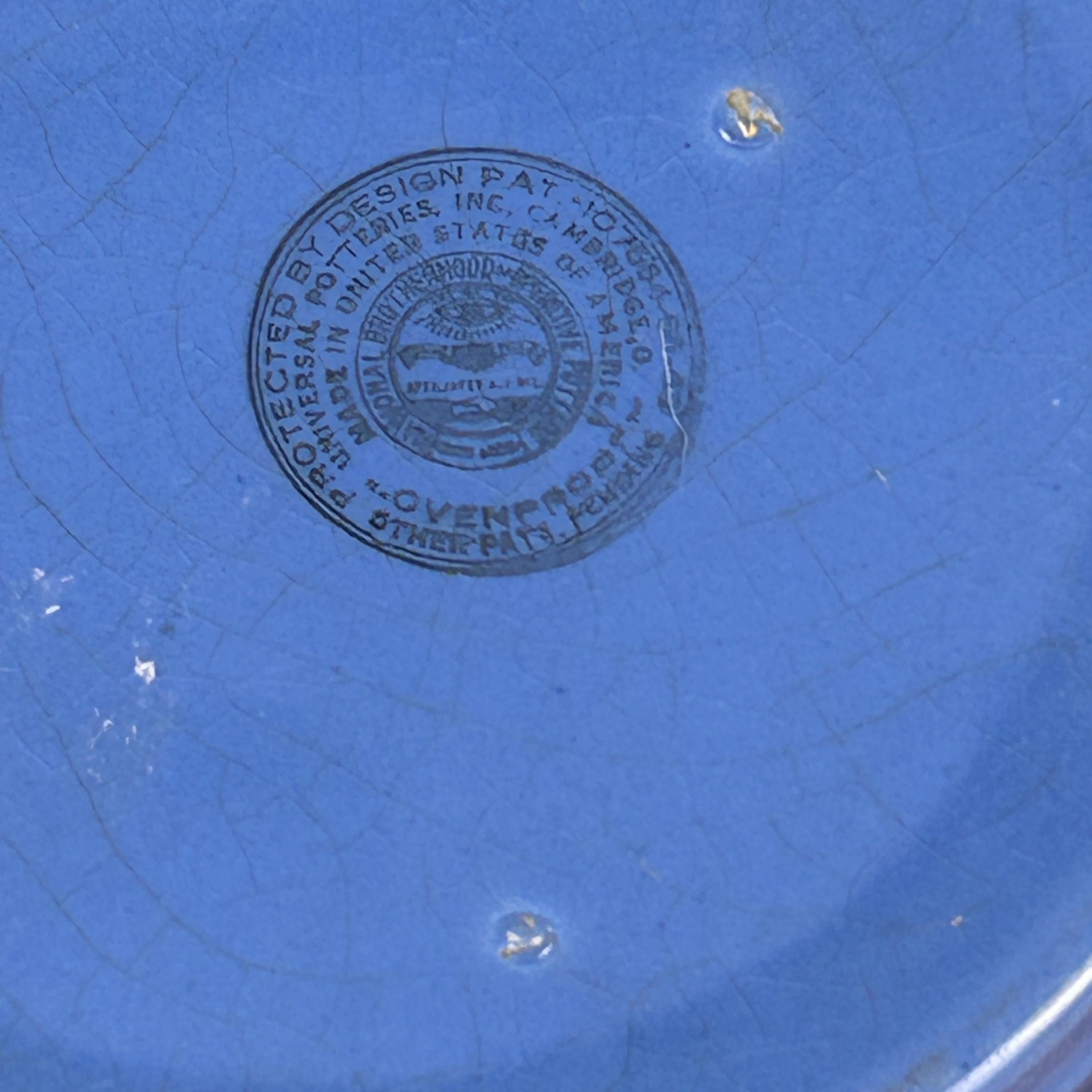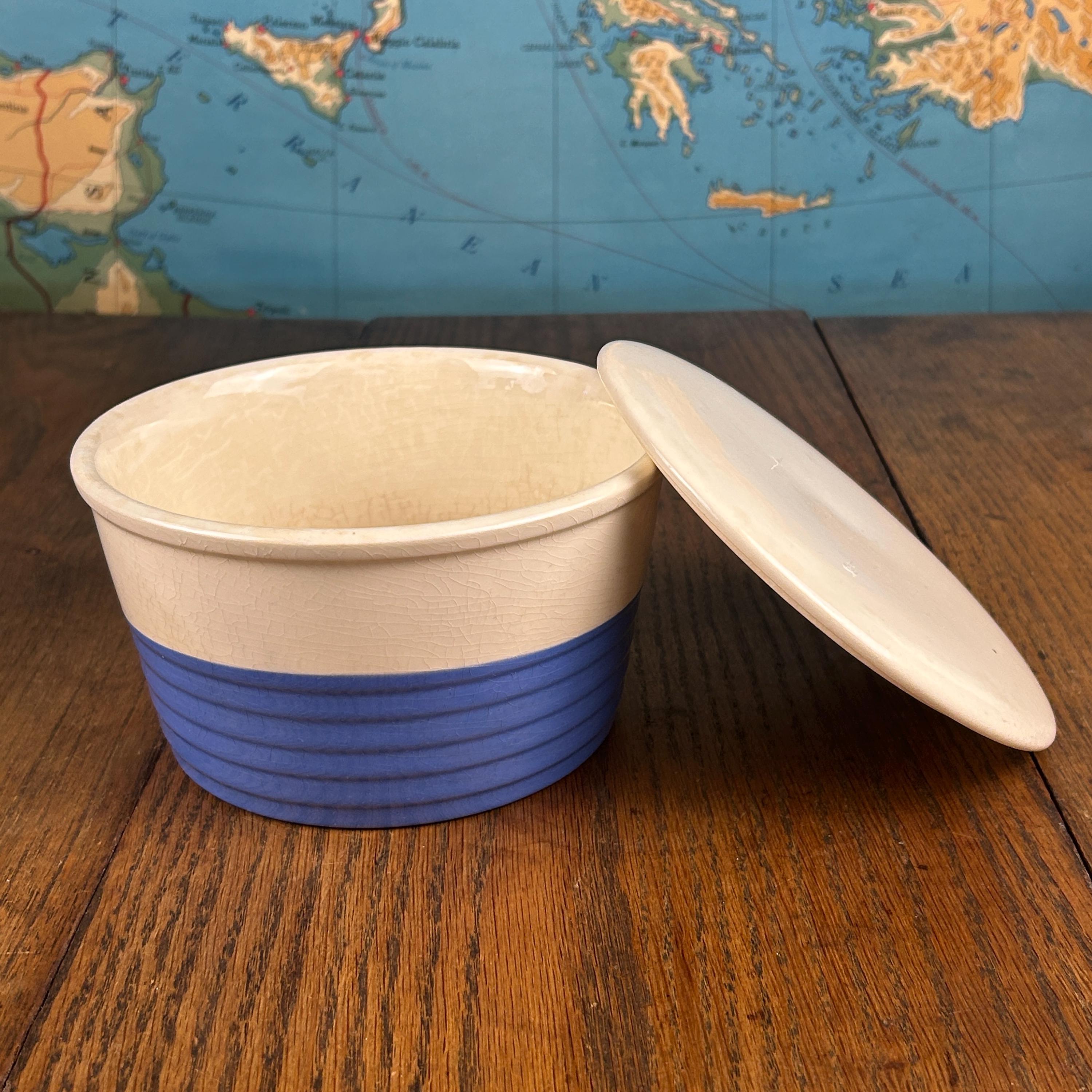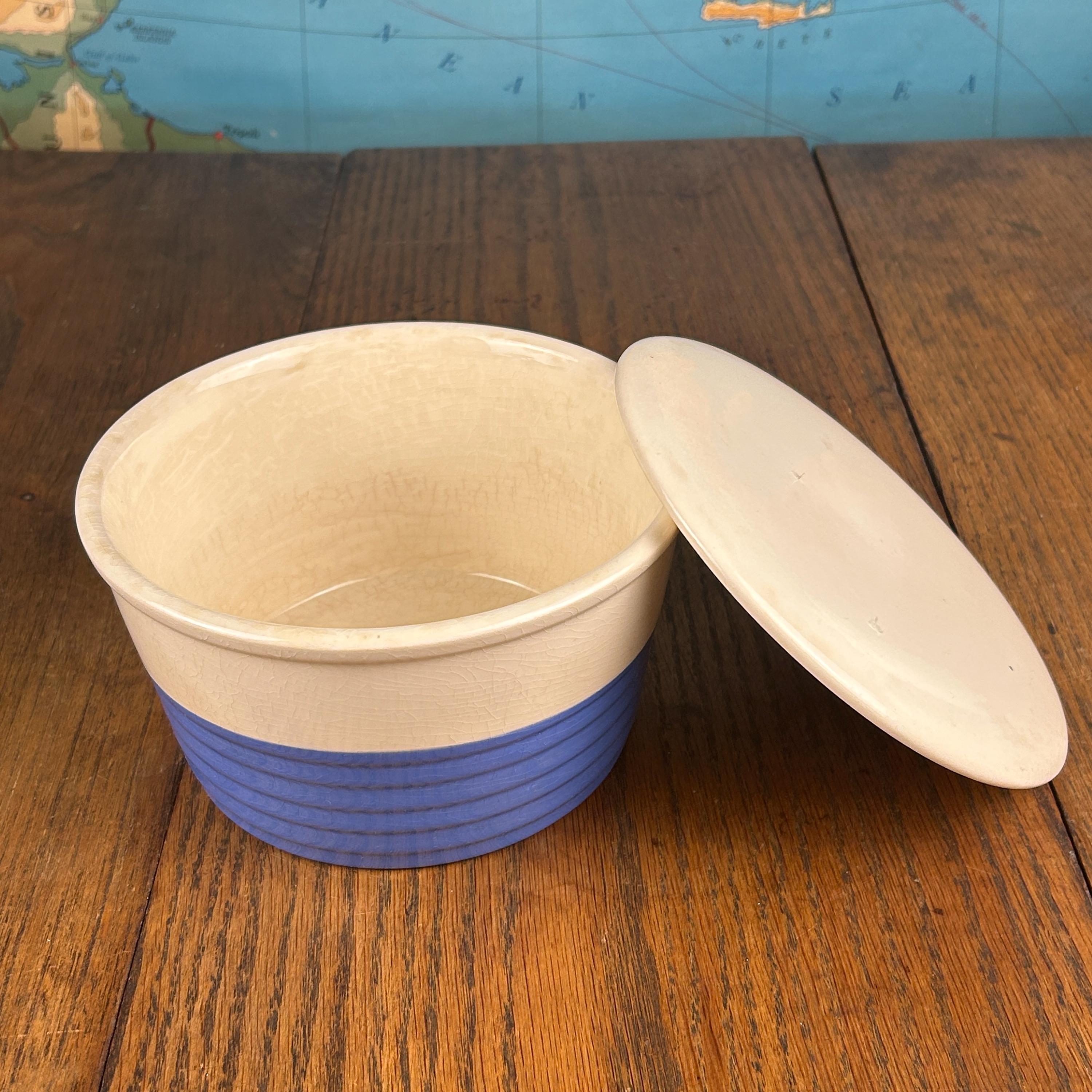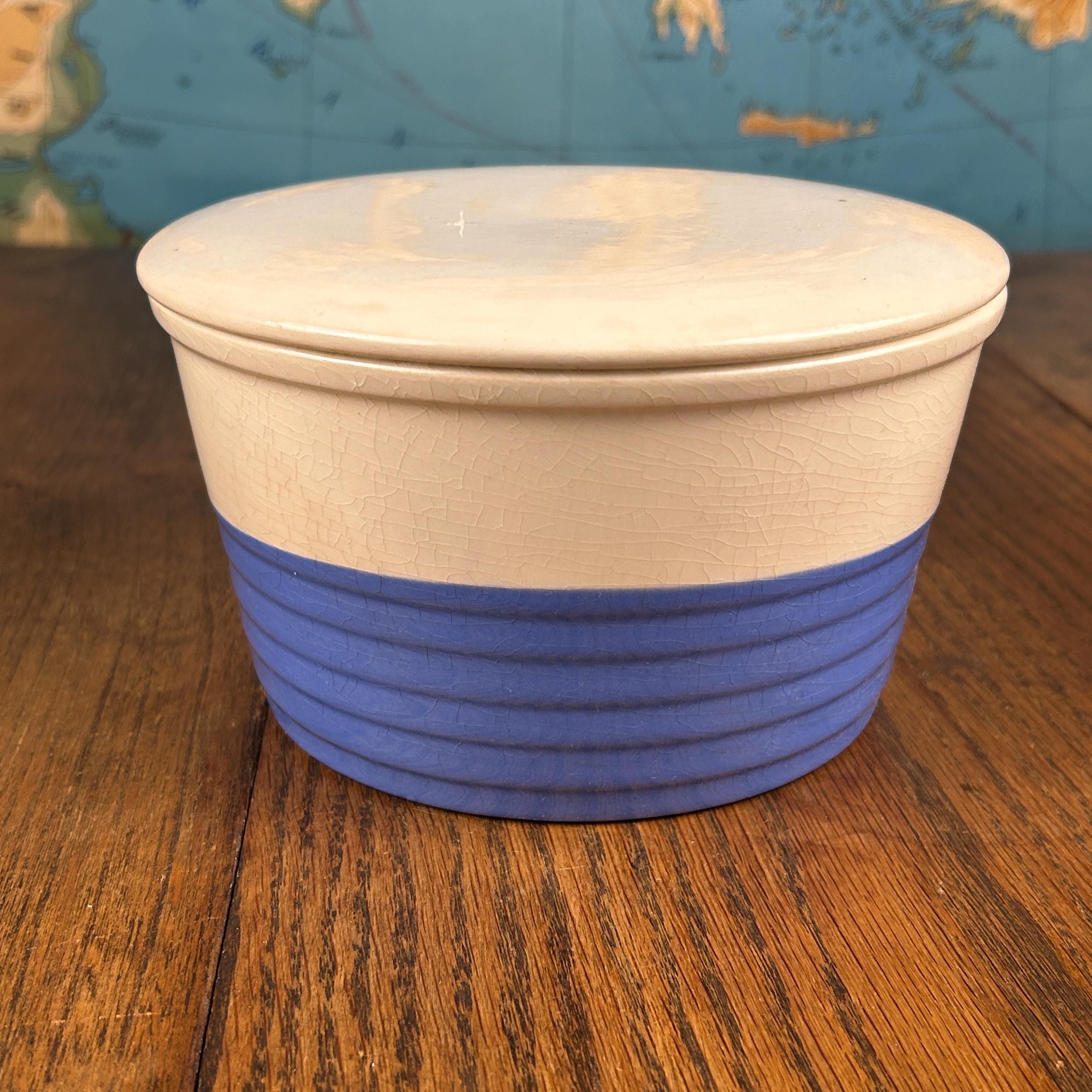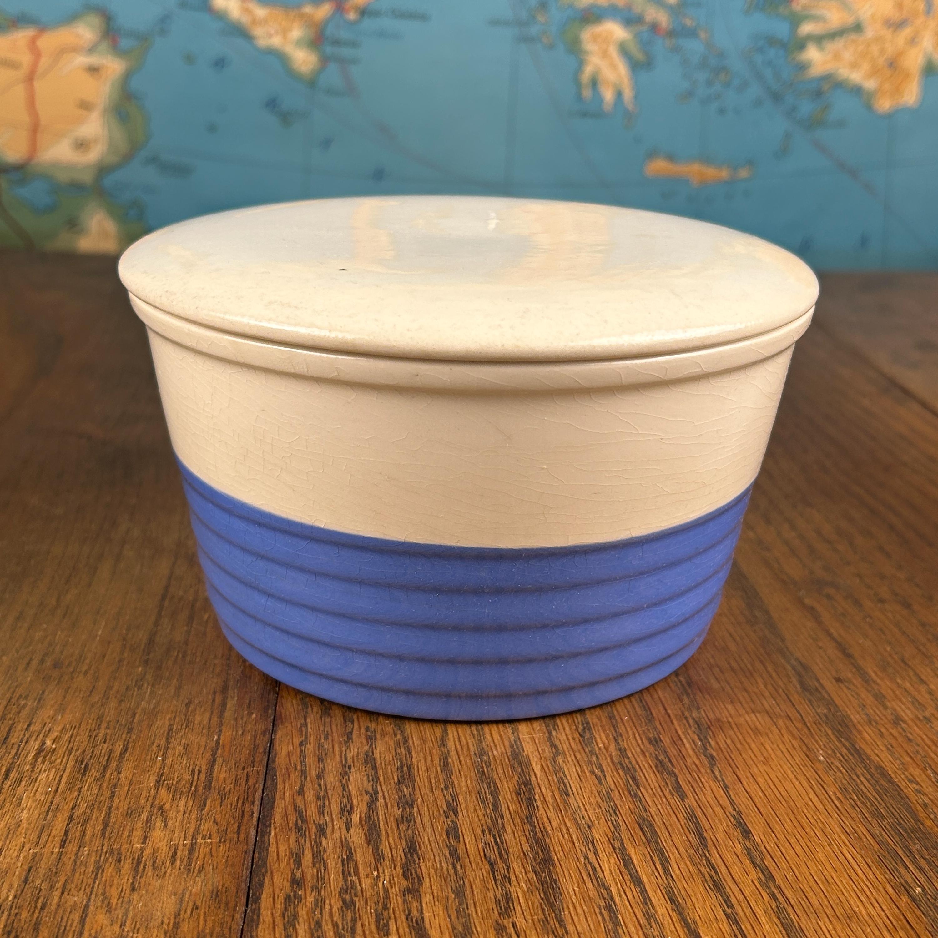 Add a classic touch of 1940s kitchen charm to your collection with these vintage Universal Potteries “Ringware” lidded bowls. Made in Cambridge, Ohio, these sturdy stoneware pieces feature the iconic ribbed (ringed) texture around the lower half and a beautiful two-tone blue and beige glaze.