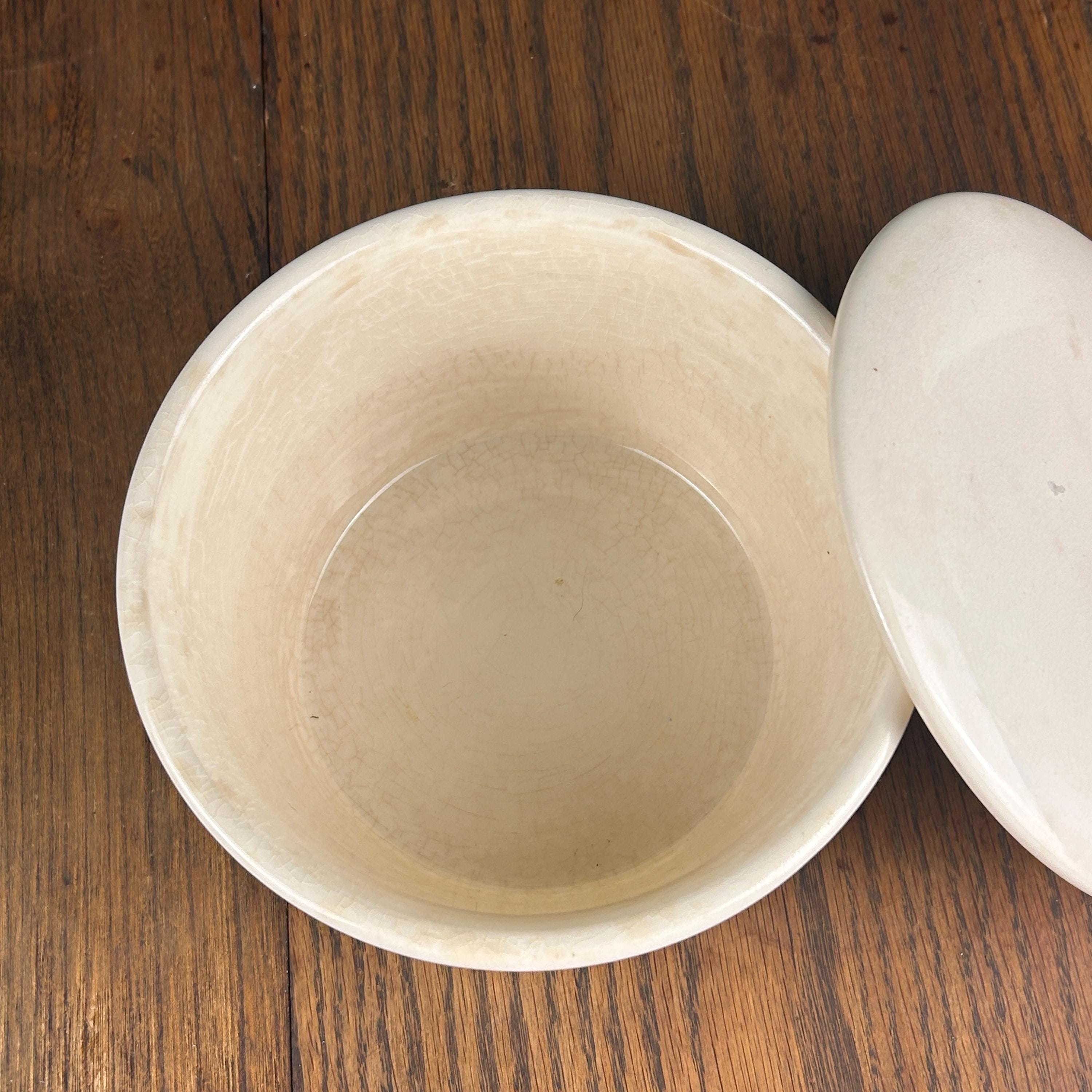 Originally sold as refrigerator or mixing bowls with covers, these heavy-duty stoneware pieces were designed for everyday use. Today, they are highly collectible and make beautiful display pieces in farmhouse, cottage, or mid-century kitchens.