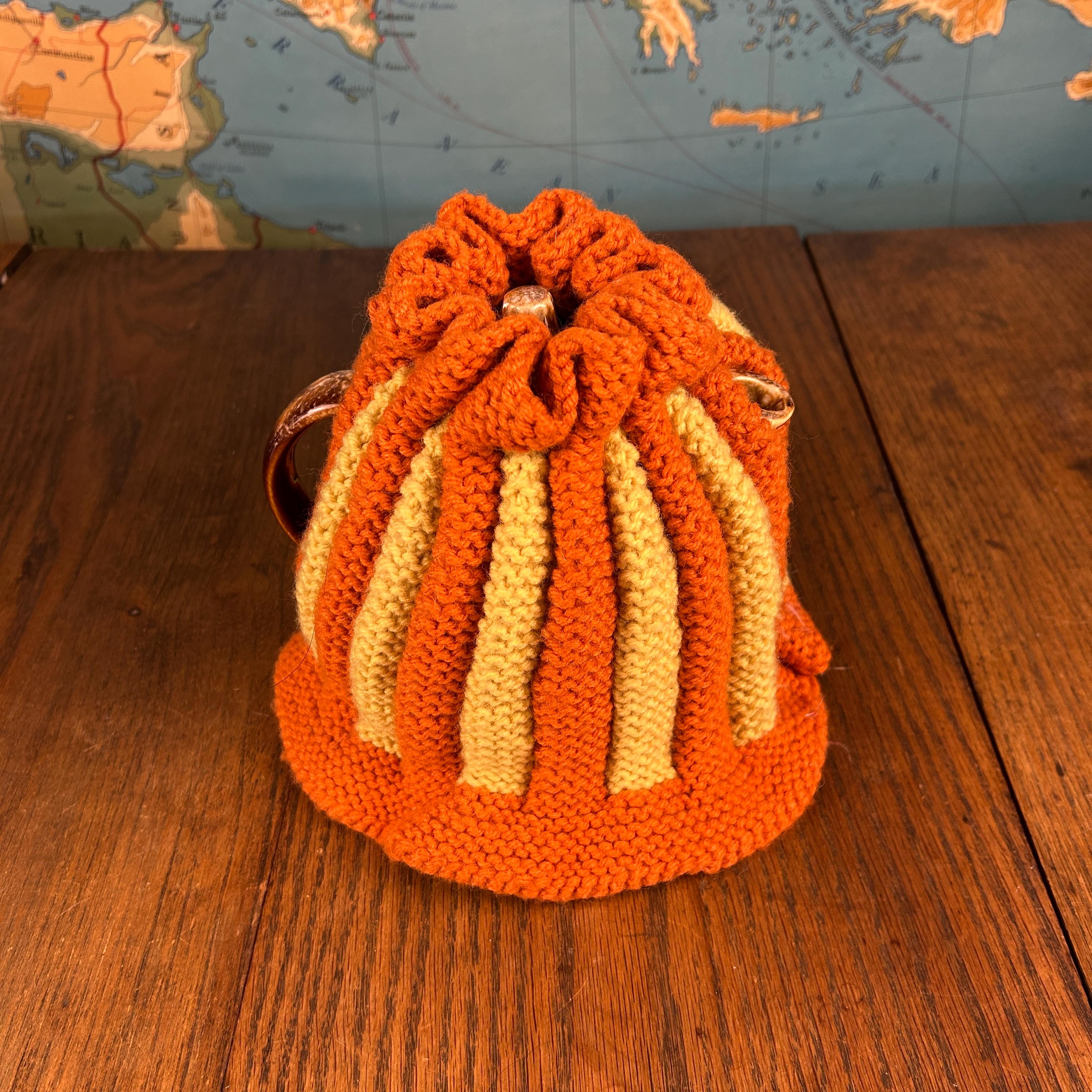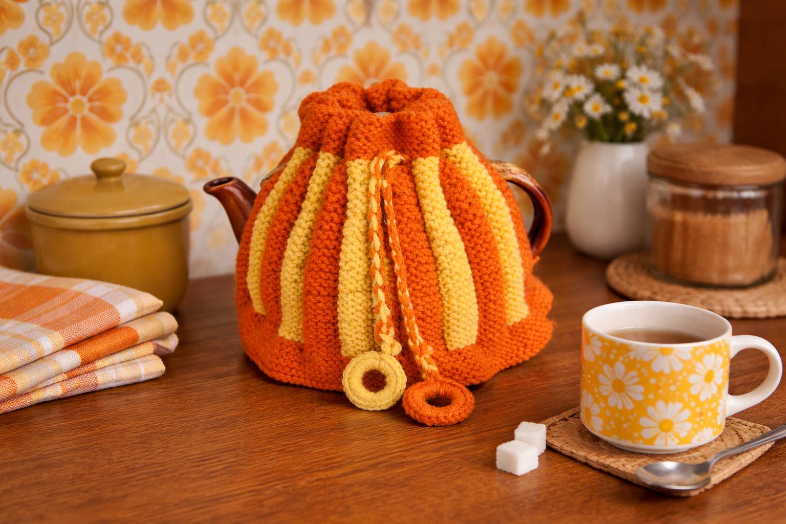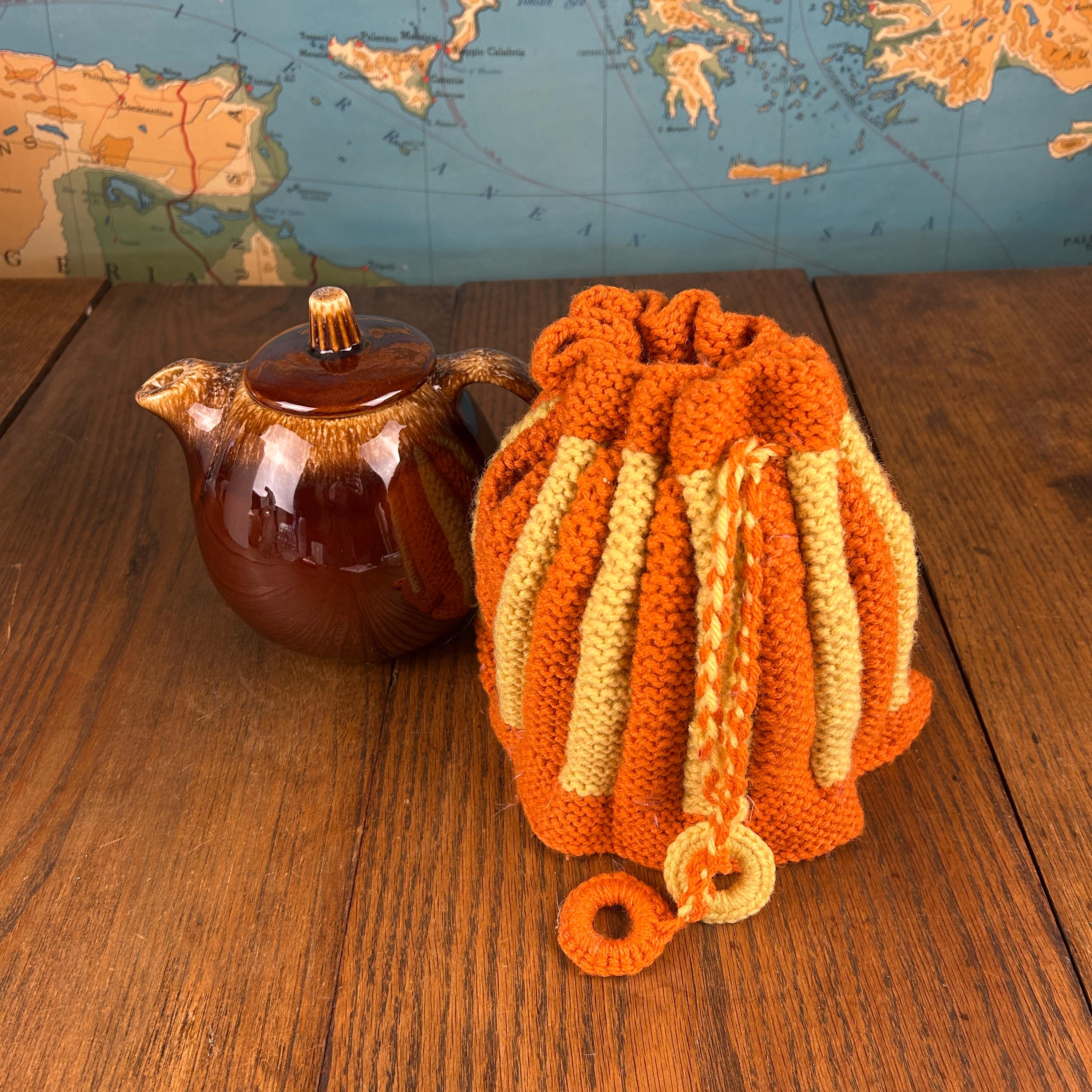 Hand-knit in warm orange and golden yellow wool, this cosy features beautiful crocheted ring accents that add texture and retro personality. The soft wool construction allows it to gently pull in and adapt to different teapot shapes and sizes.
