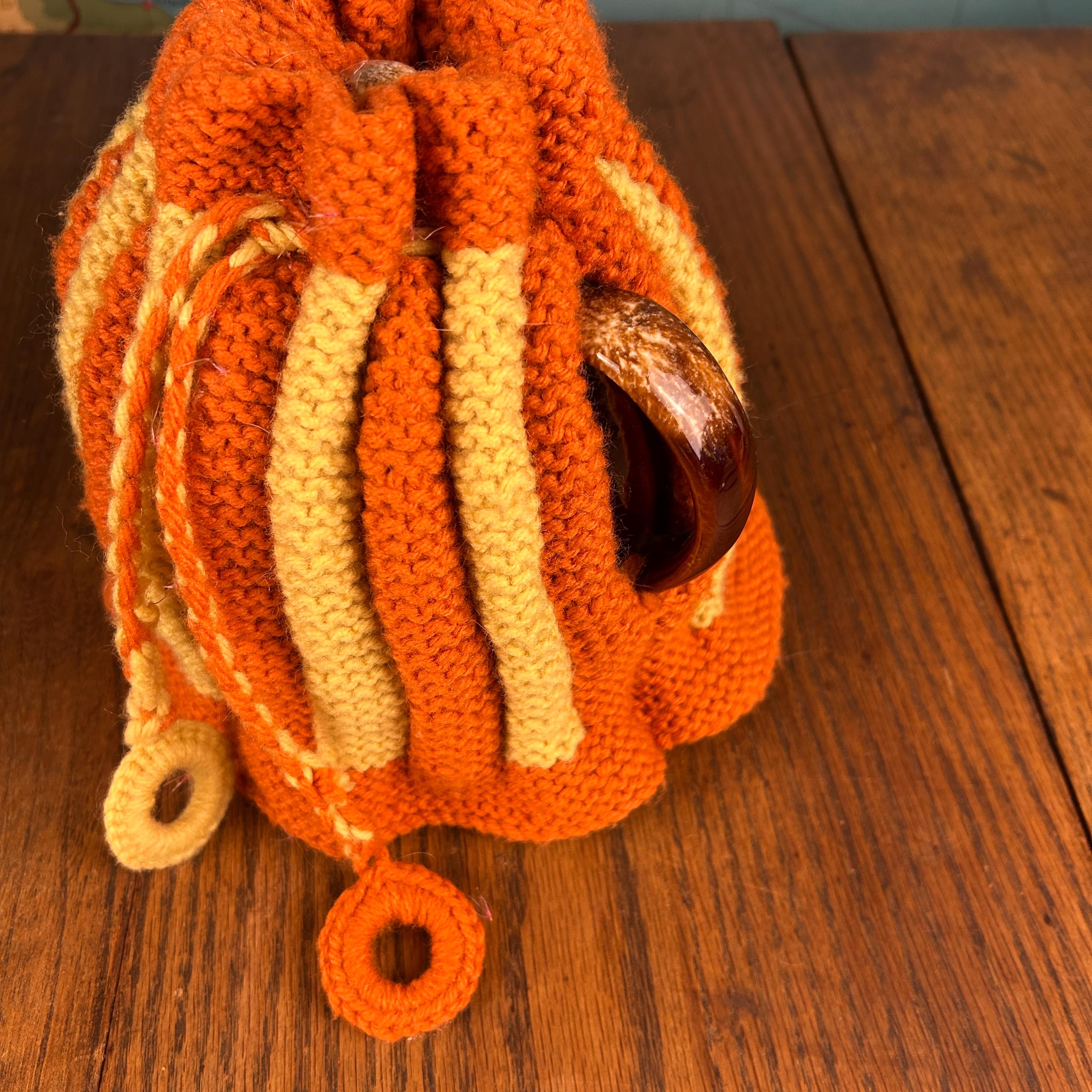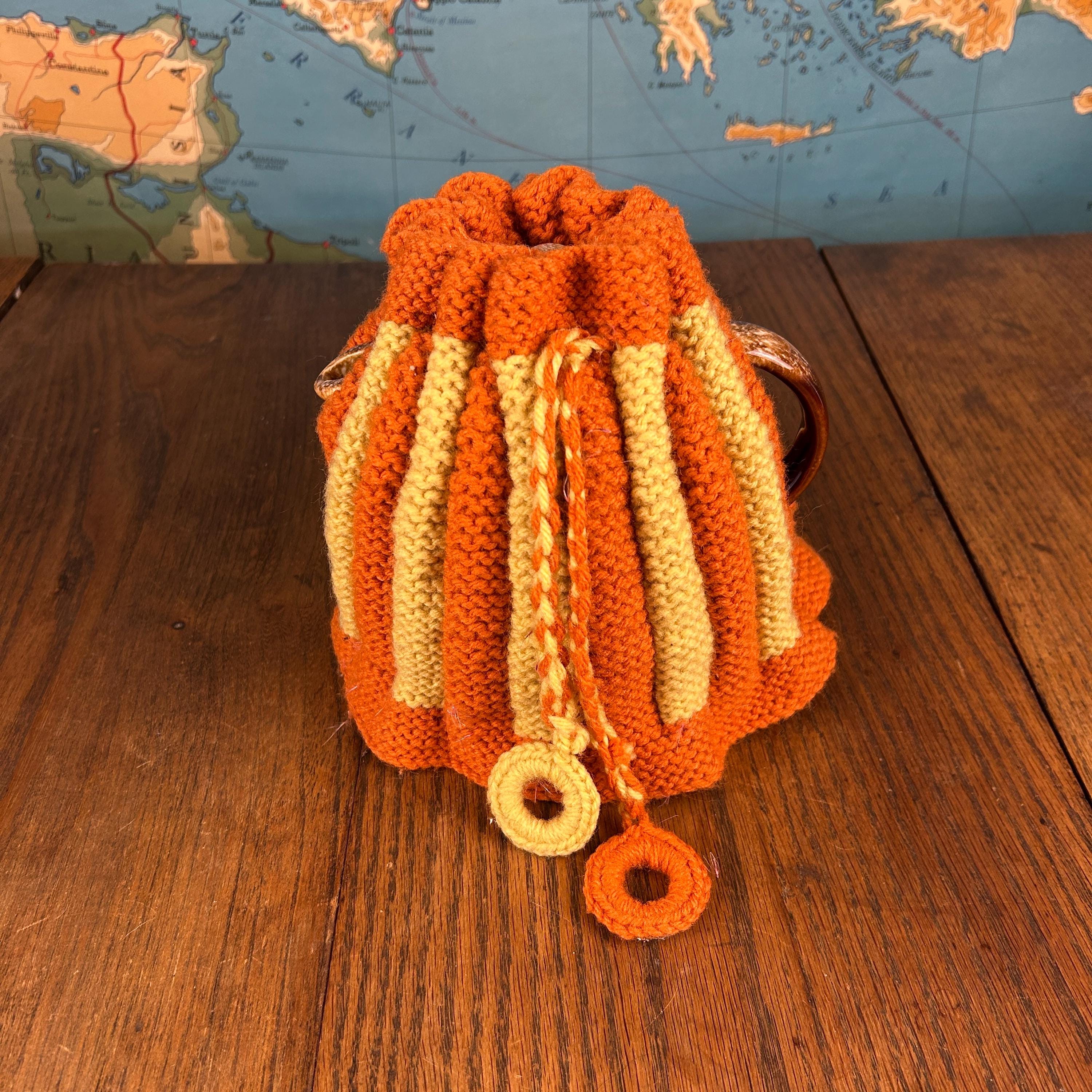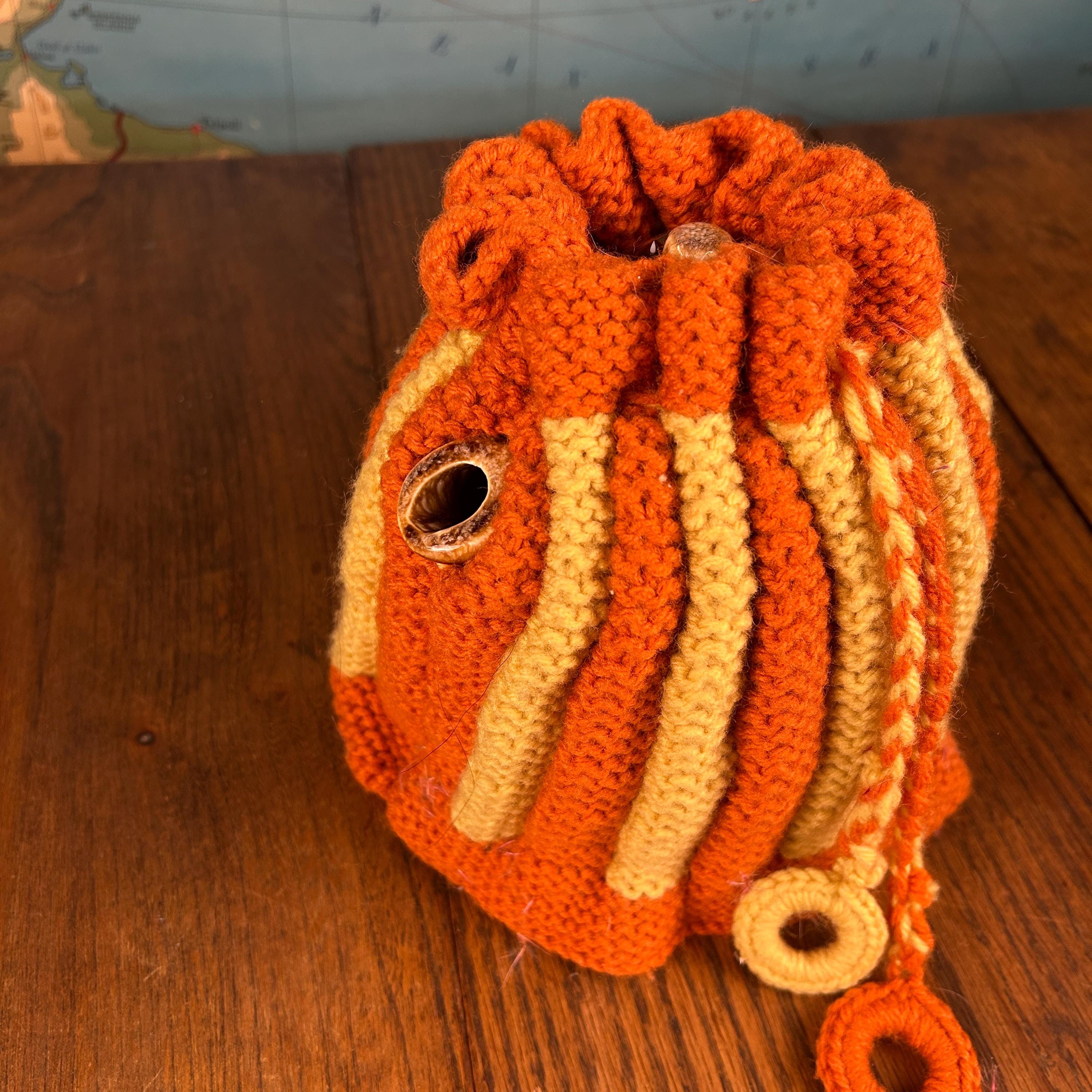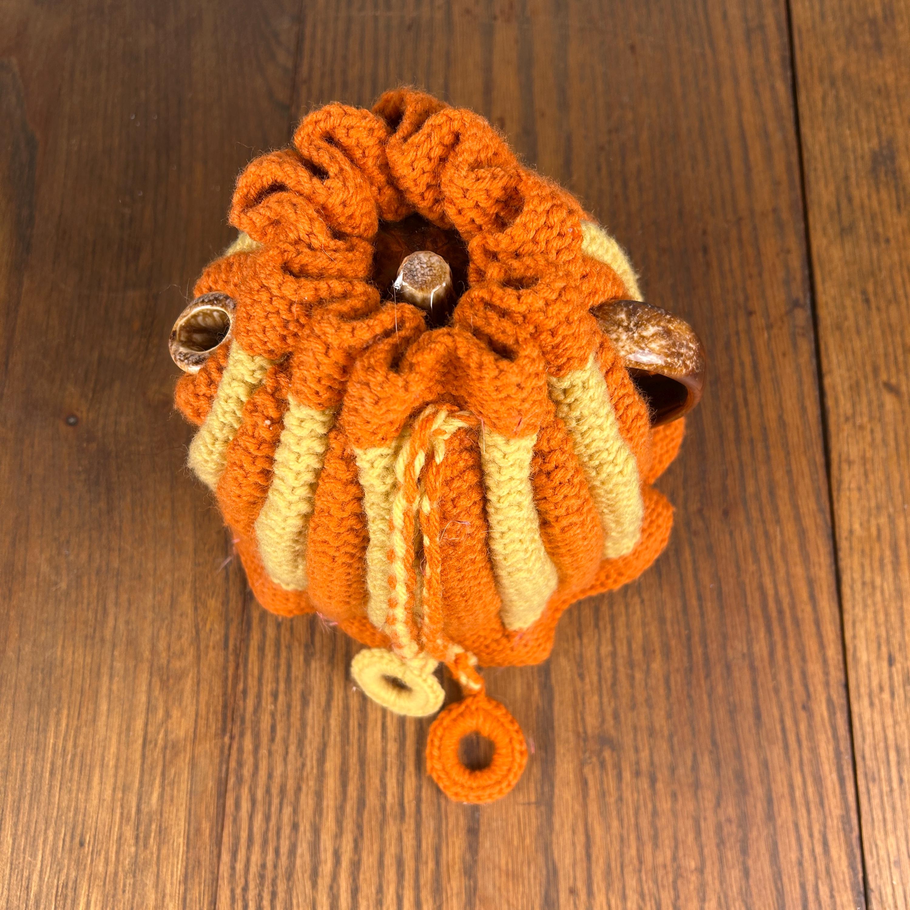 Hand-knit in warm orange and golden yellow wool, this cosy features beautiful crocheted ring accents that add texture and retro personality. The soft wool construction allows it to gently pull in and adapt to different teapot shapes and sizes.