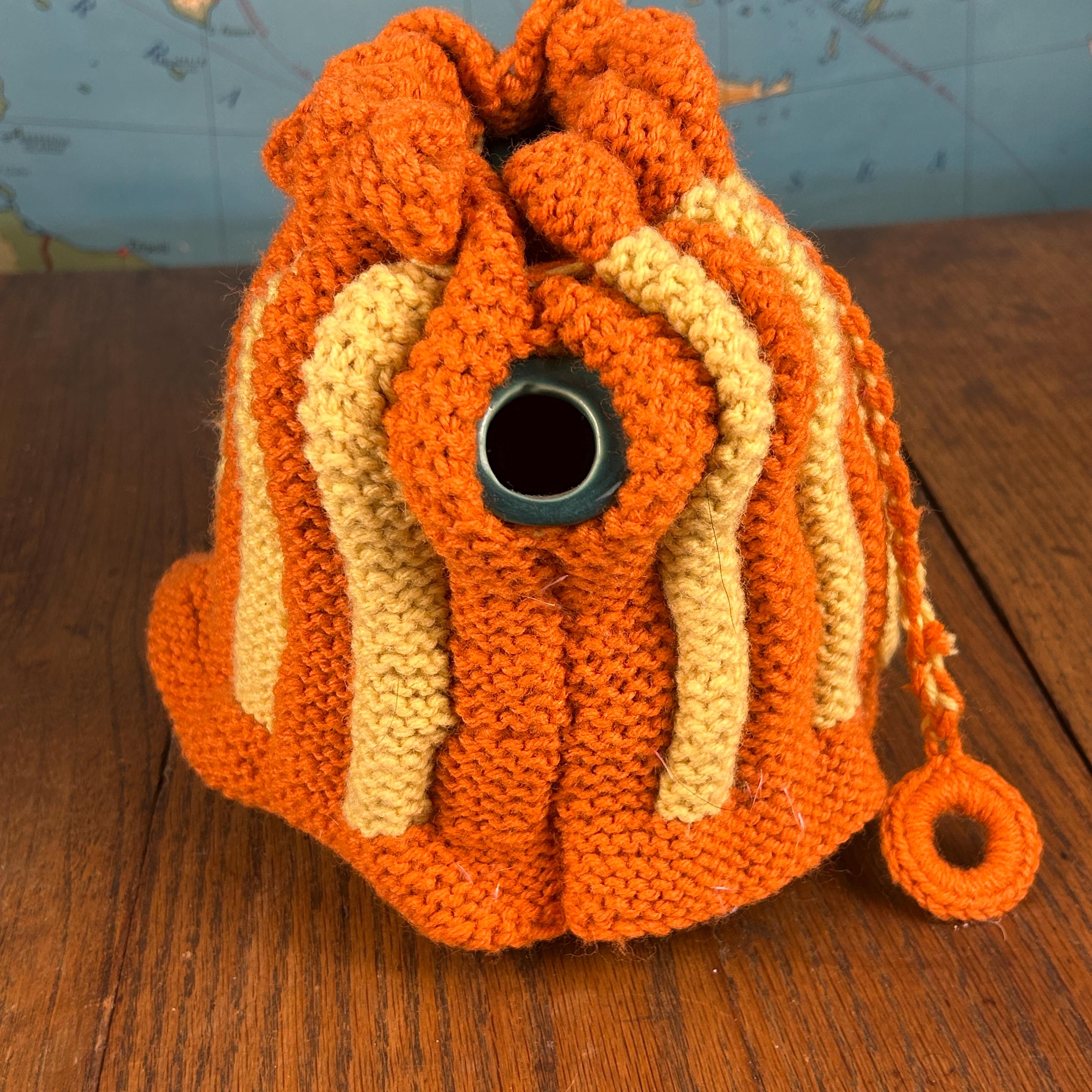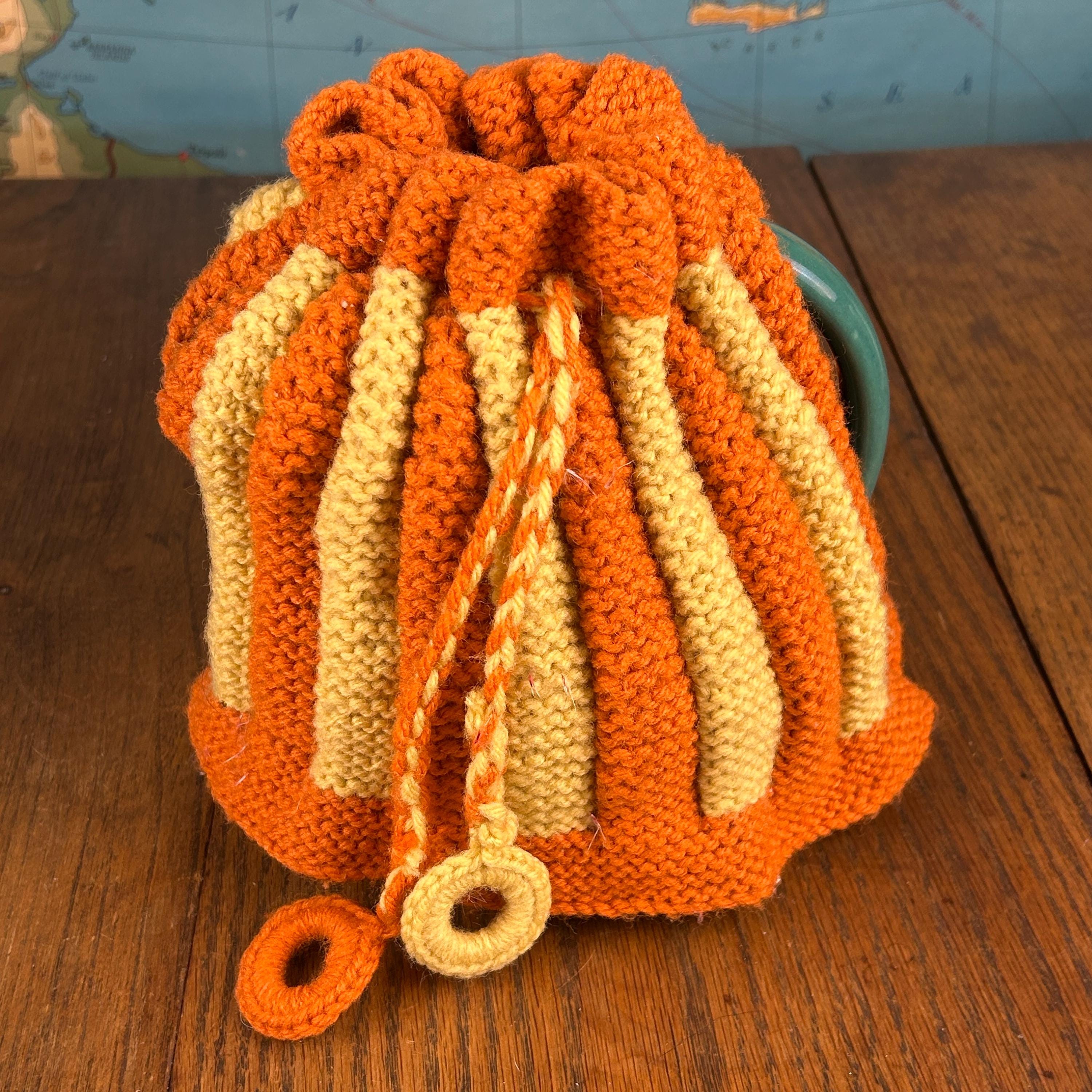 This charming vintage hand-knit tea cosy is made in the classic “bachelor cosy” style — designed so the handle and spout of the teapot remain exposed. The playful name comes from the idea that a tea-drinking gentleman could pour without removing the entire cosy!