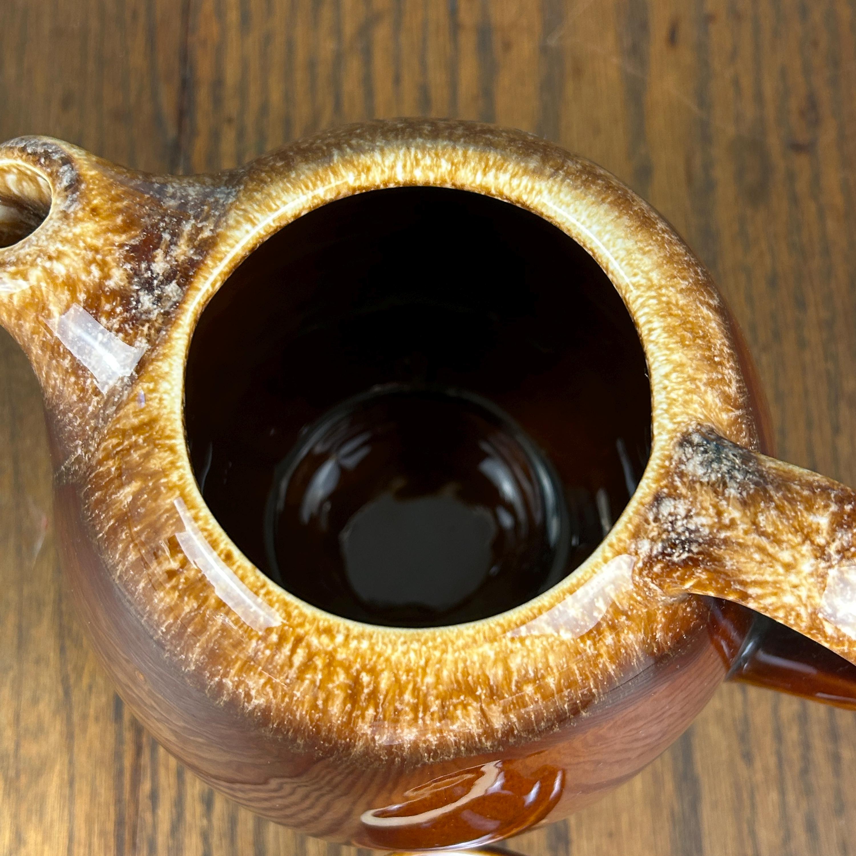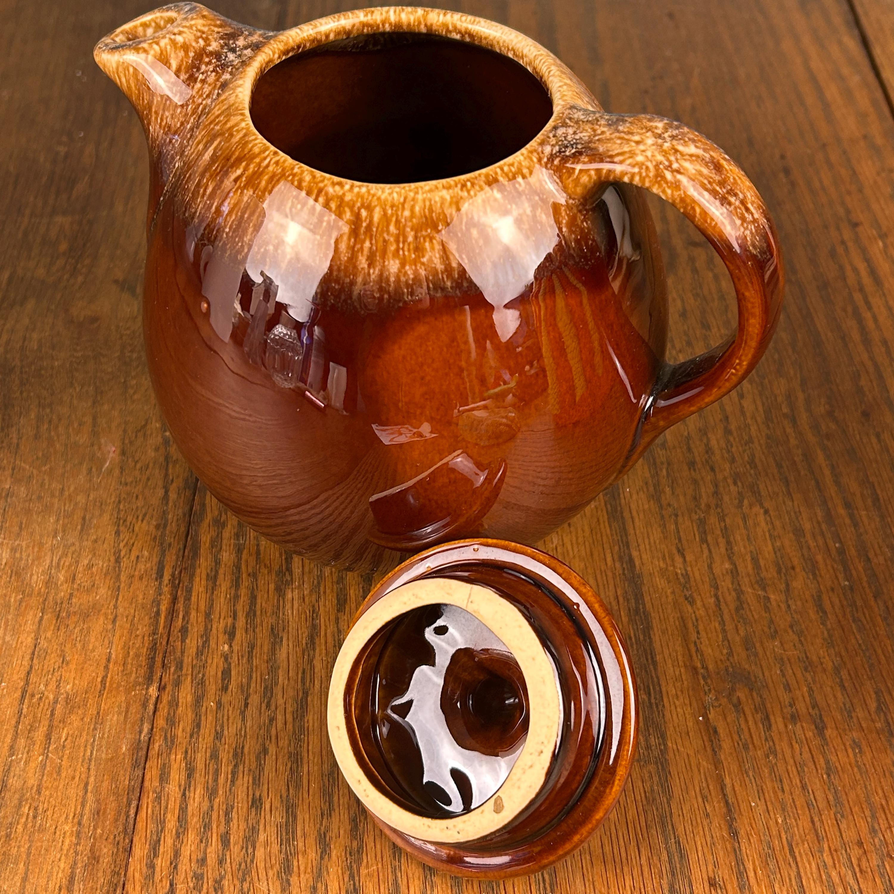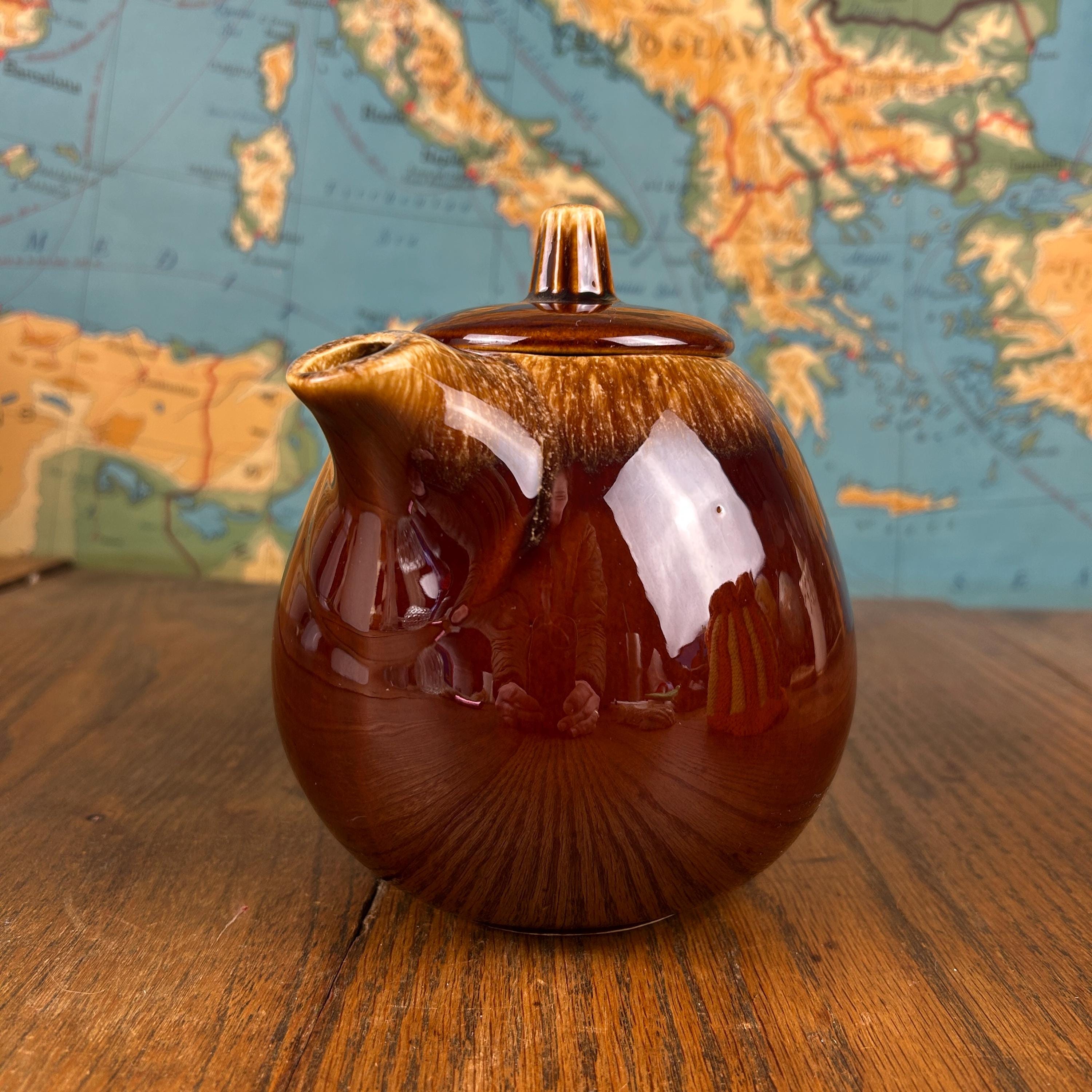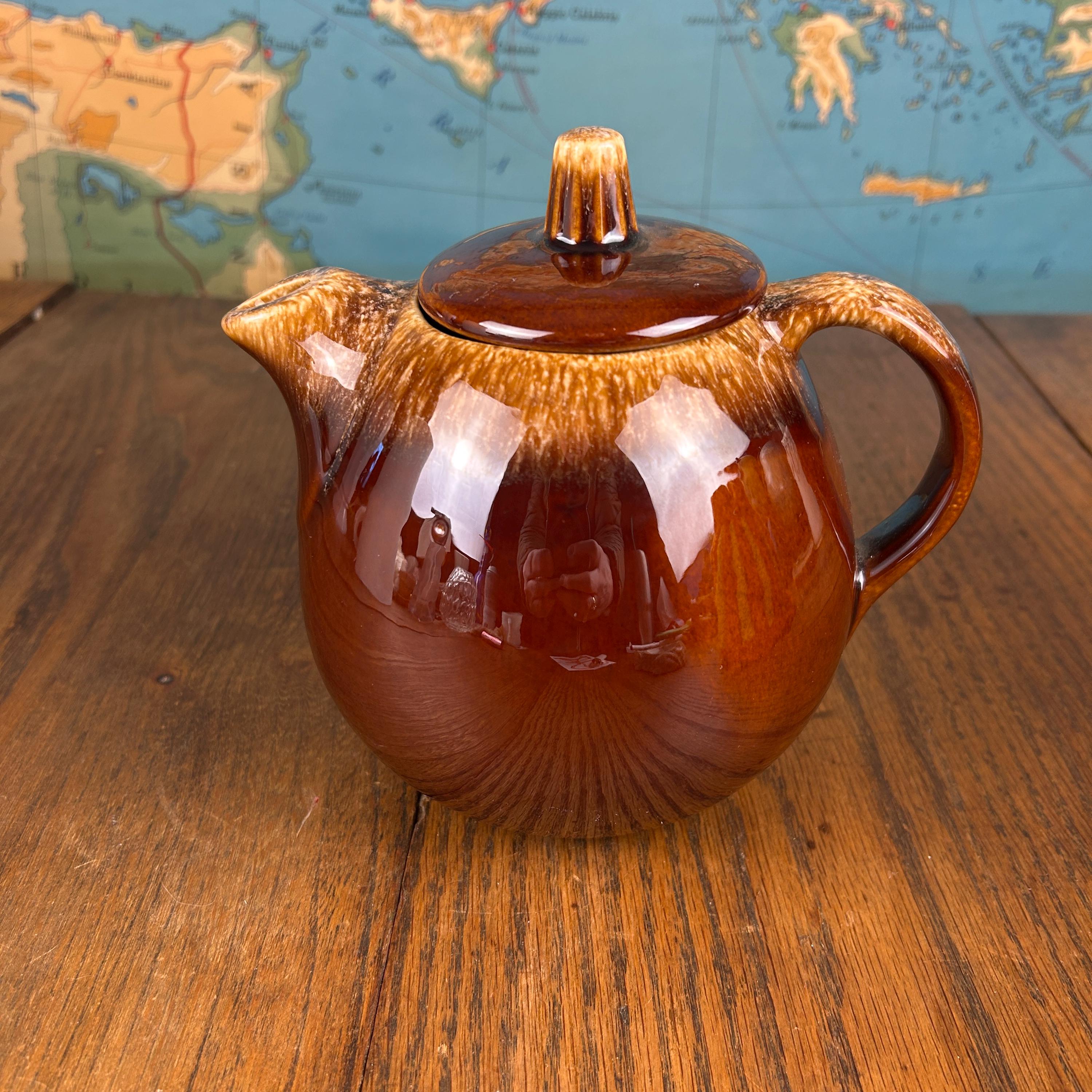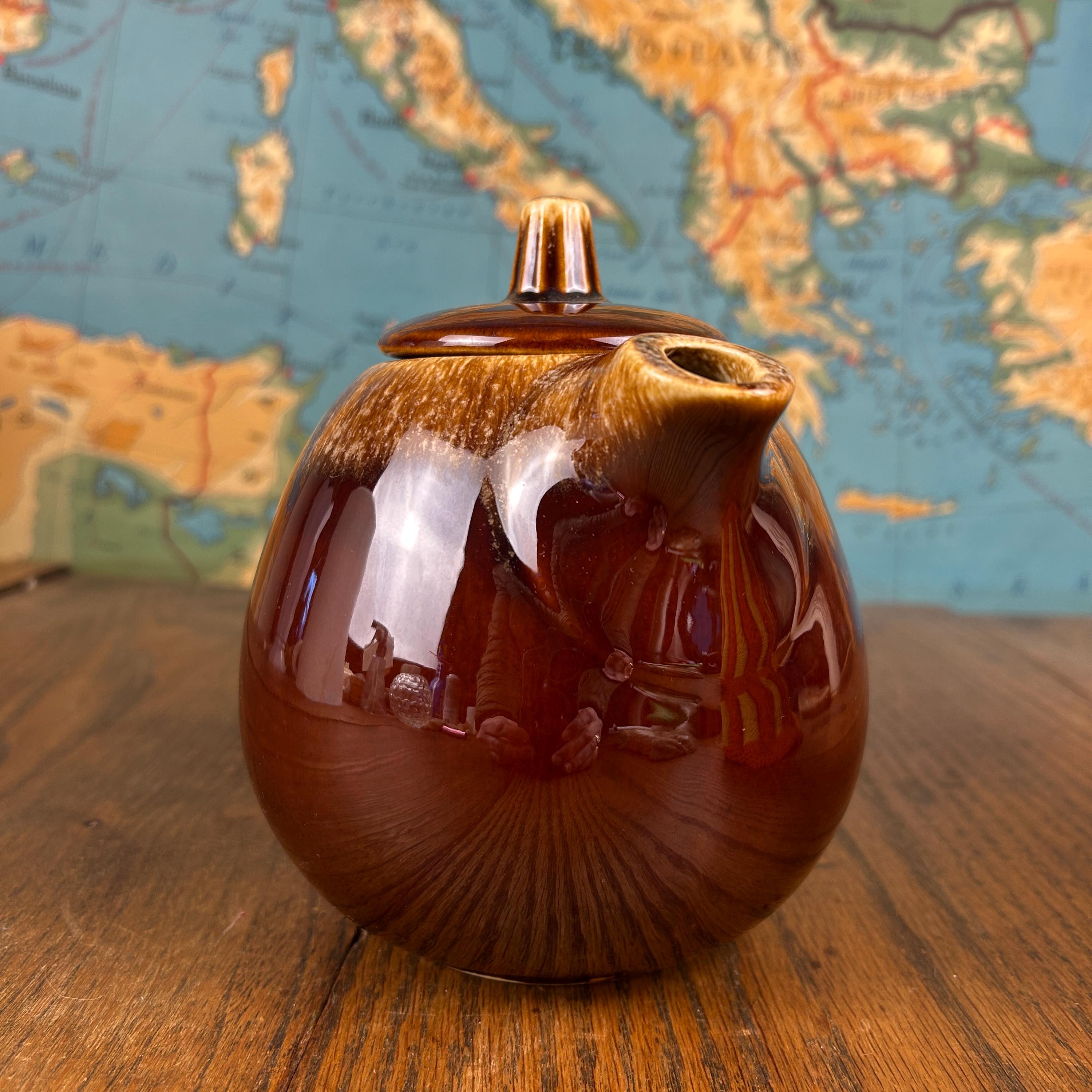 Made by Hull Pottery, a well-known American pottery company, the teapot is crafted from sturdy oven-proof ceramic and comes with its original fitted lid. The rich chocolate brown glaze paired with the soft cream drip detailing gives it a warm retro look that fits perfectly in farmhouse, mid-century, or vintage-inspired kitchens.