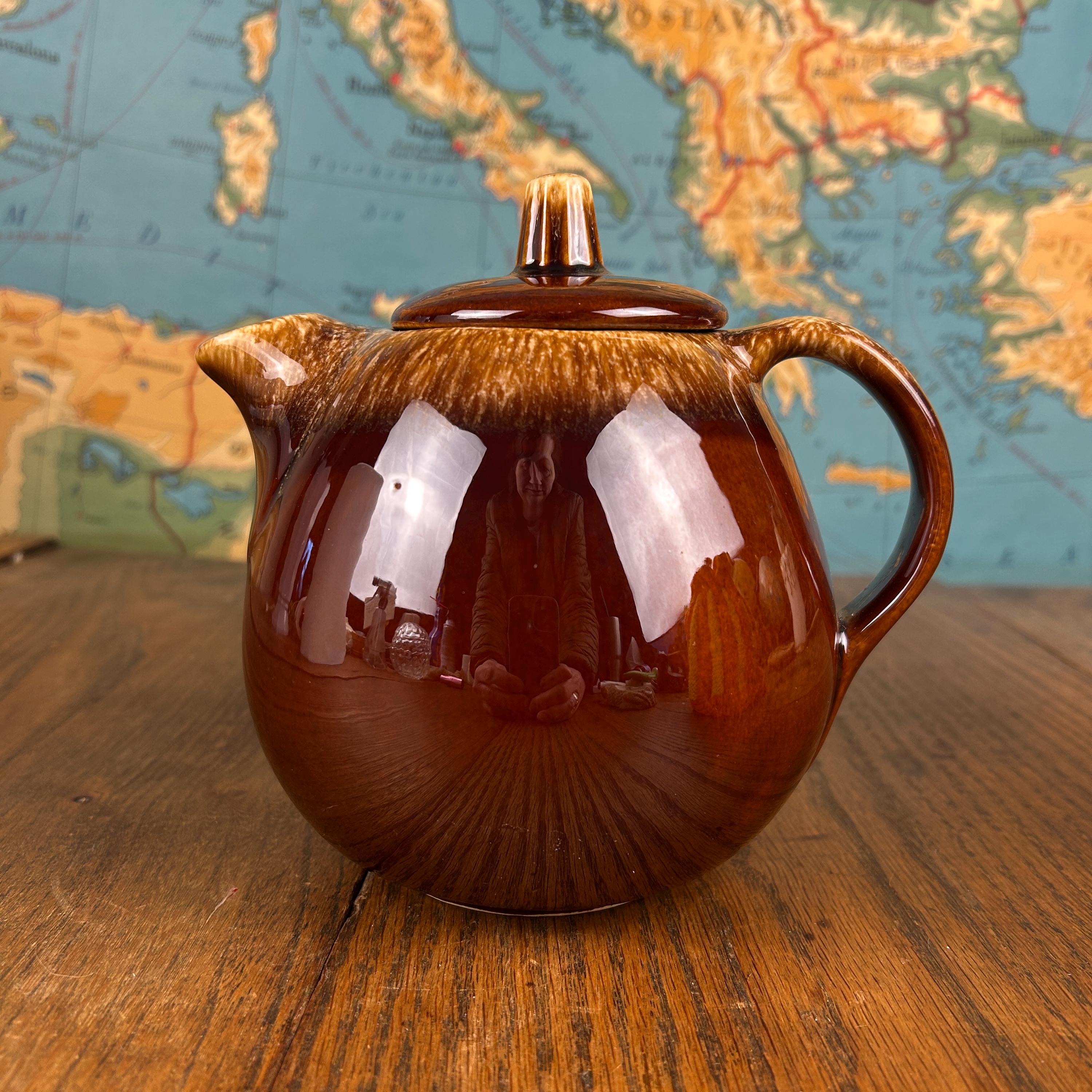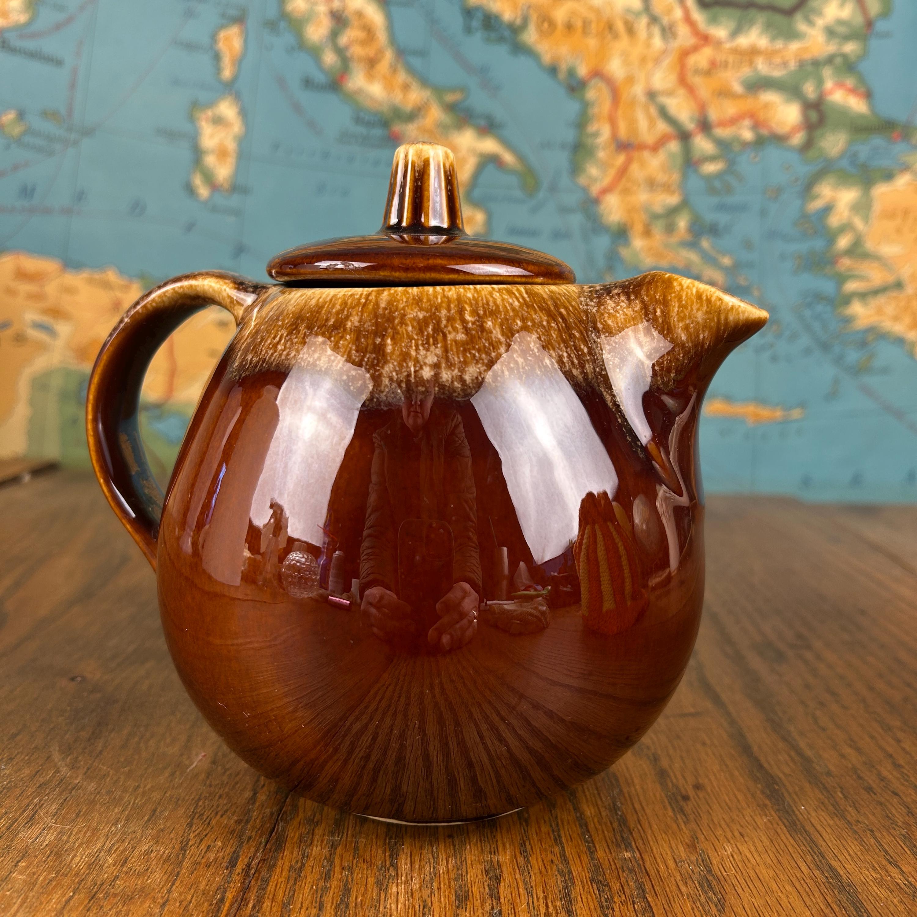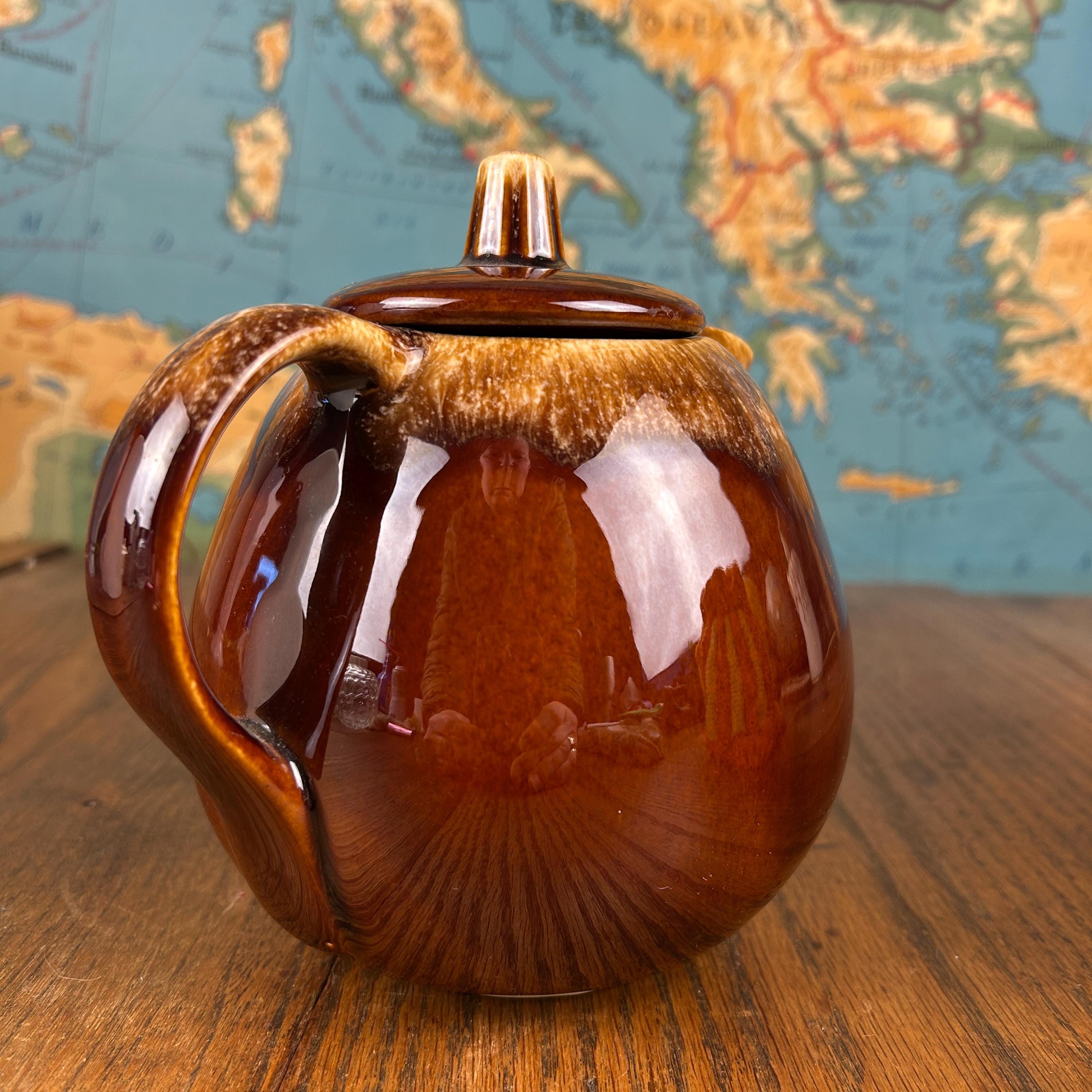 This beautiful vintage Hull Pottery teapot features the classic brown drip glaze design with a creamy white “drip” effect flowing around the rim. A timeless mid-century kitchen style, this piece is both functional and collectible.