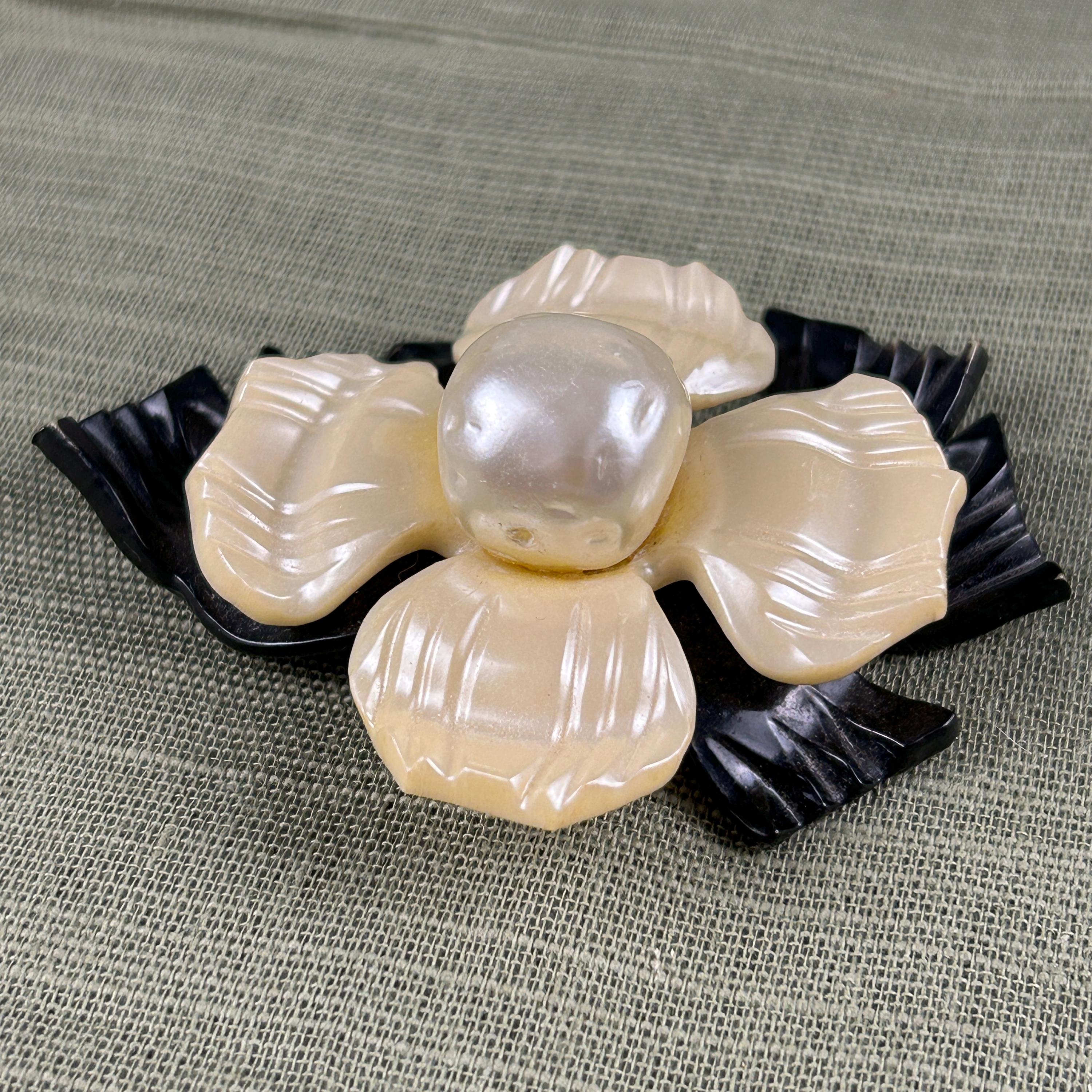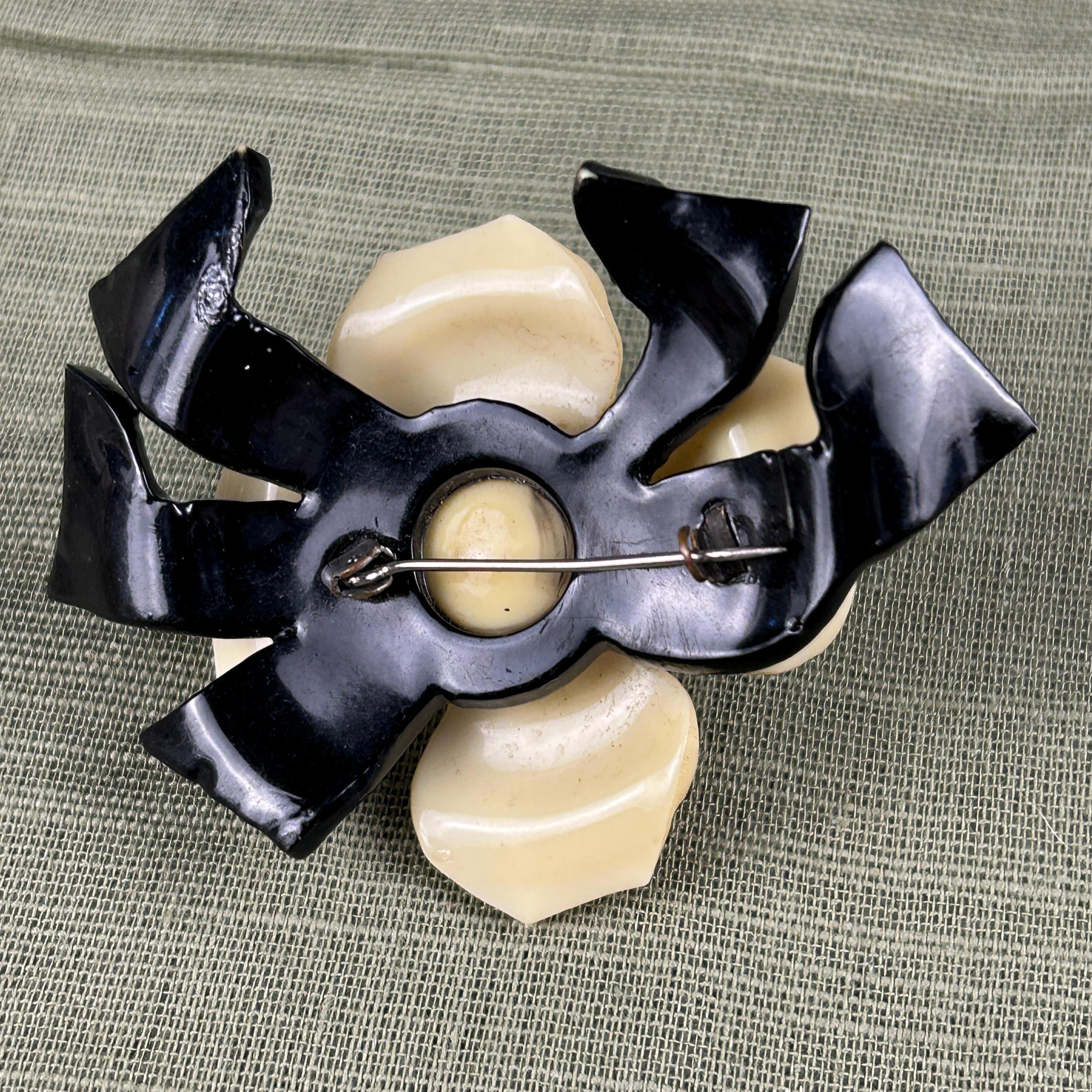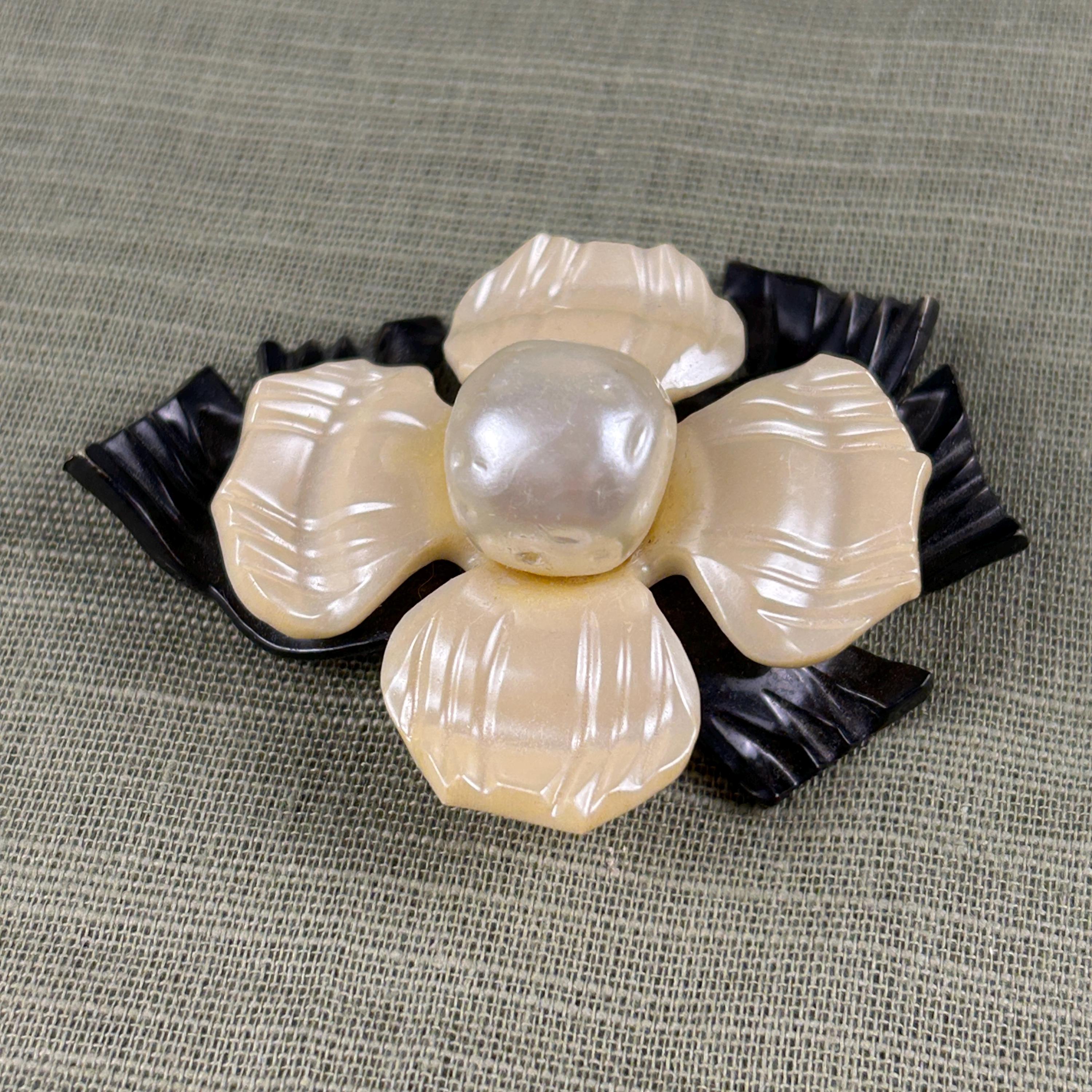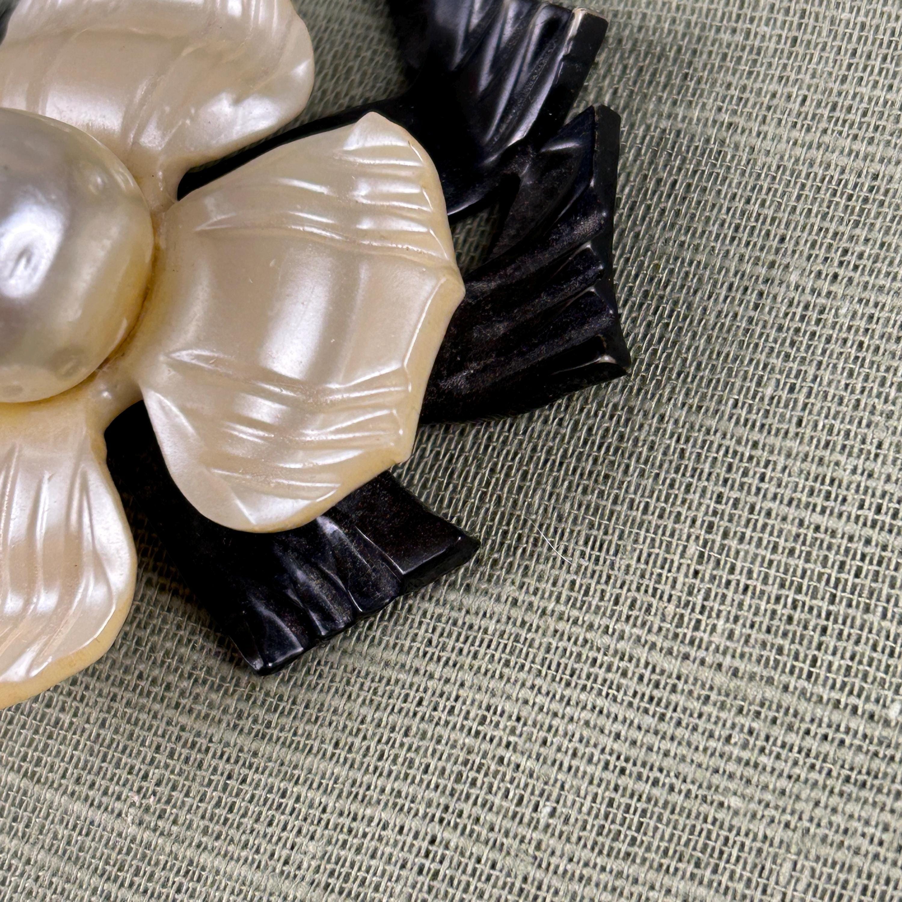 This lovely vintage floral brooch features a whimsical retro design with cream-colored petals, black accent leaves, and a large faux pearl center. The bold contrast and dimensional flower shape give the piece a charming mid-century look.