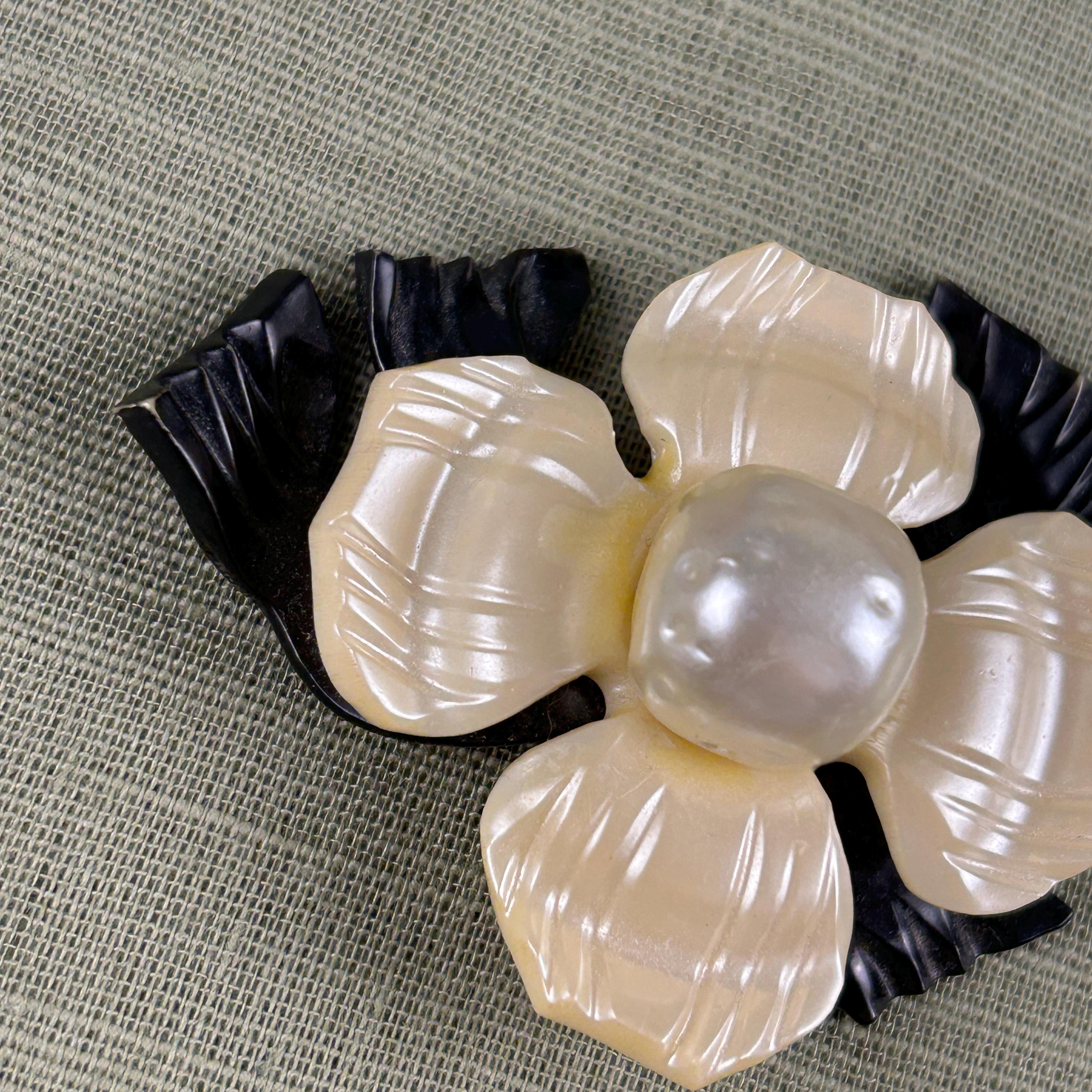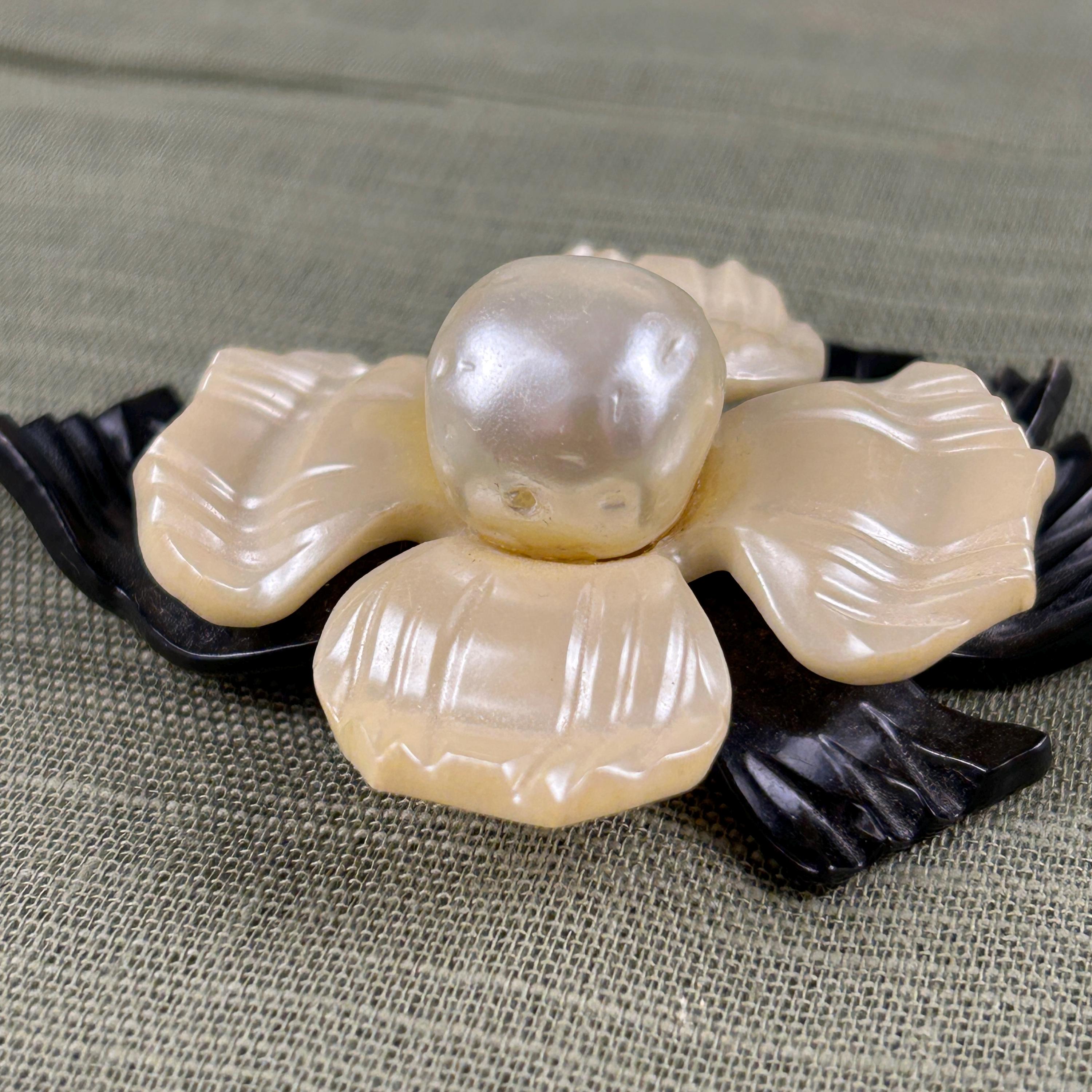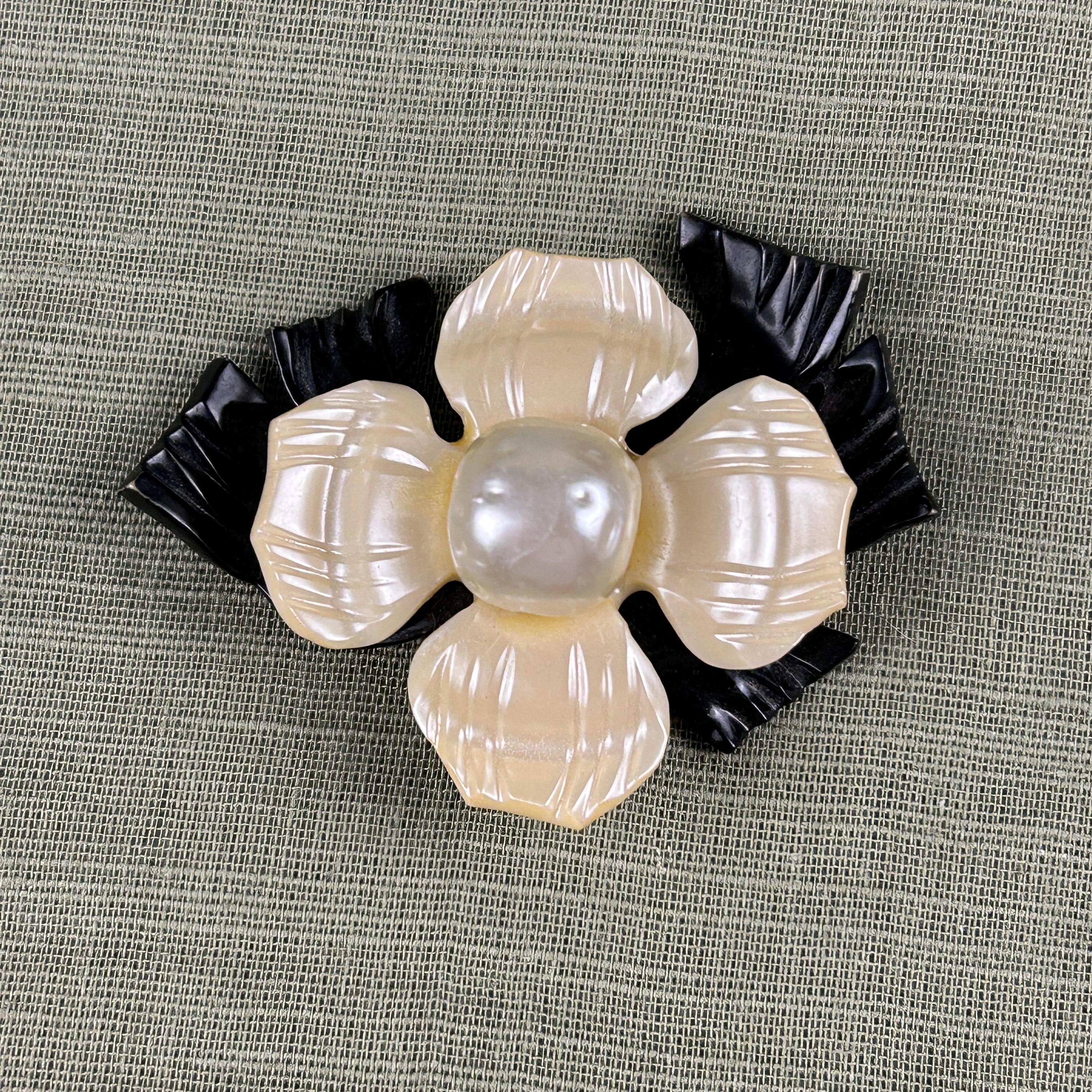 This lovely vintage floral brooch features a whimsical retro design with cream-colored petals, black accent leaves, and a large faux pearl center. The bold contrast and dimensional flower shape give the piece a charming mid-century look.