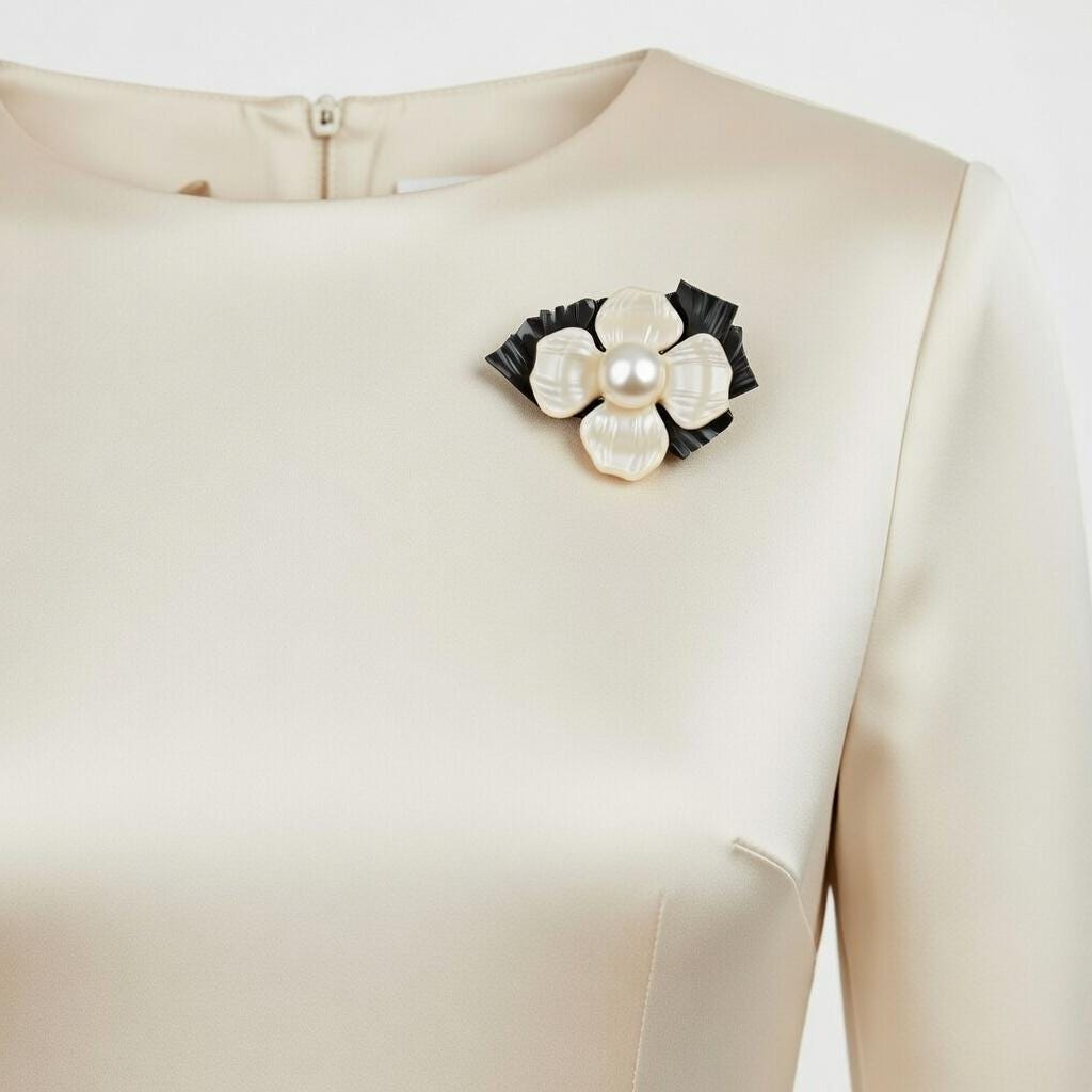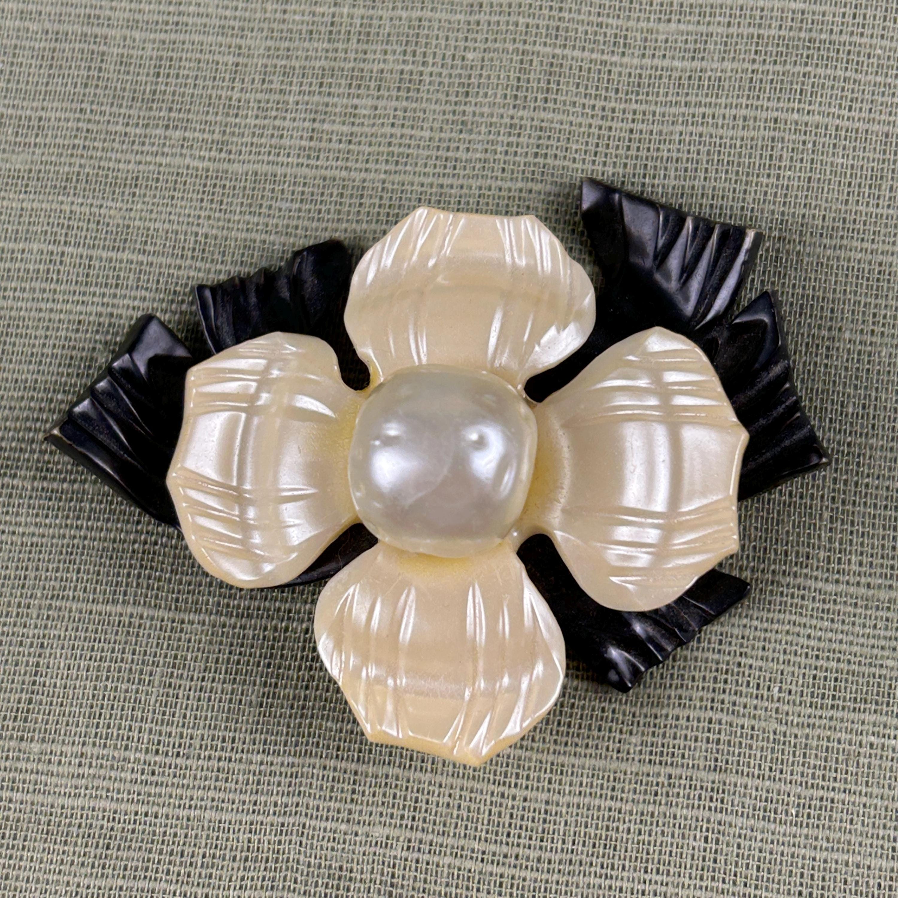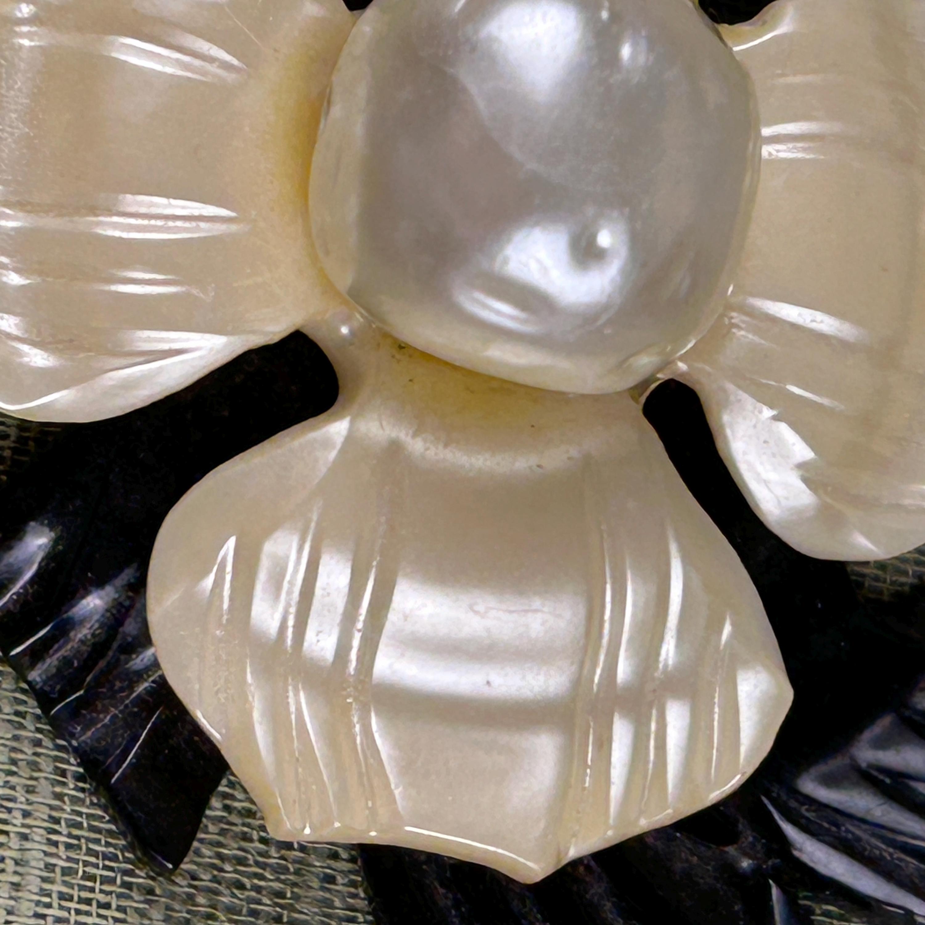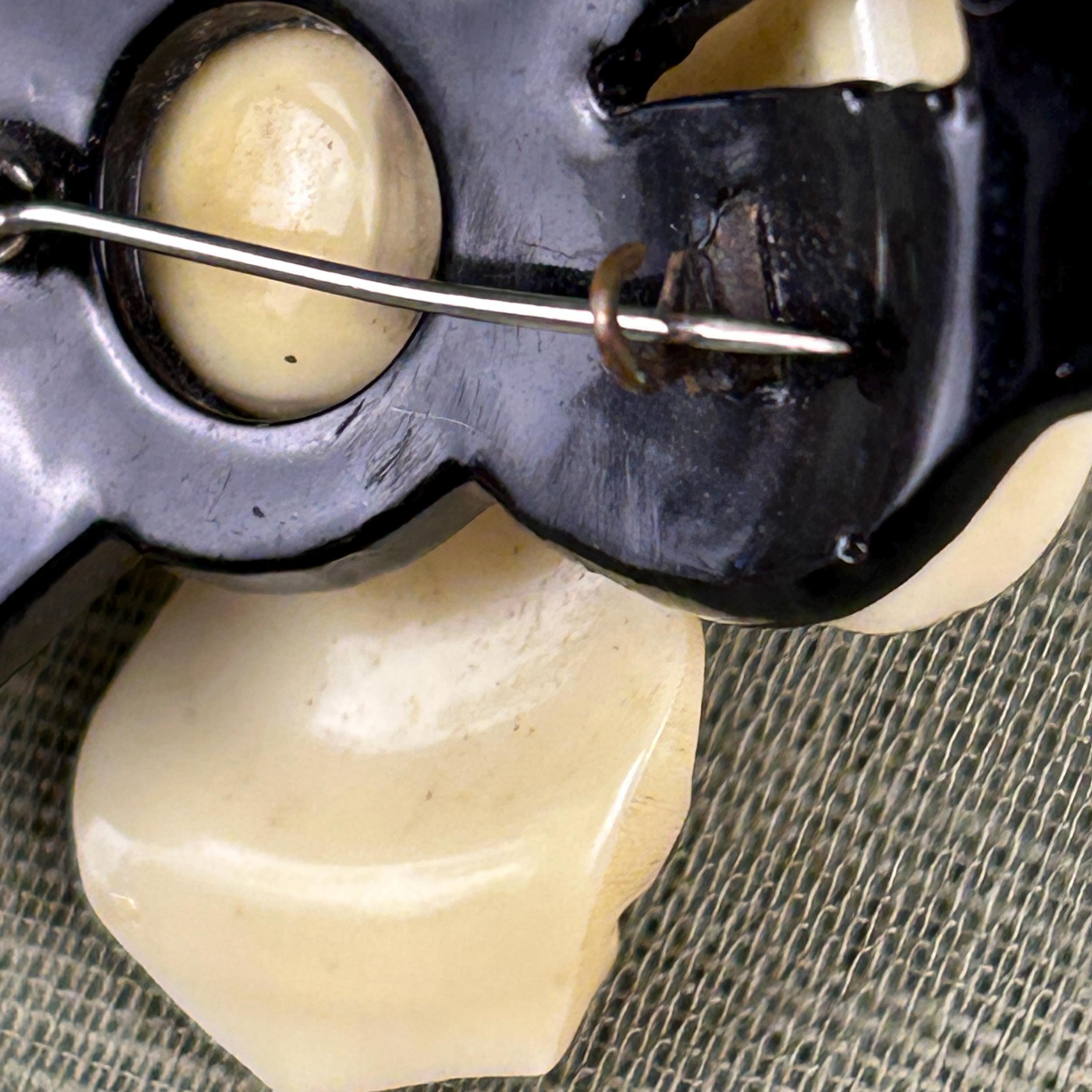 This lovely vintage floral brooch features a whimsical retro design with cream-colored petals, black accent leaves, and a large faux pearl center. The bold contrast and dimensional flower shape give the piece a charming mid-century look.