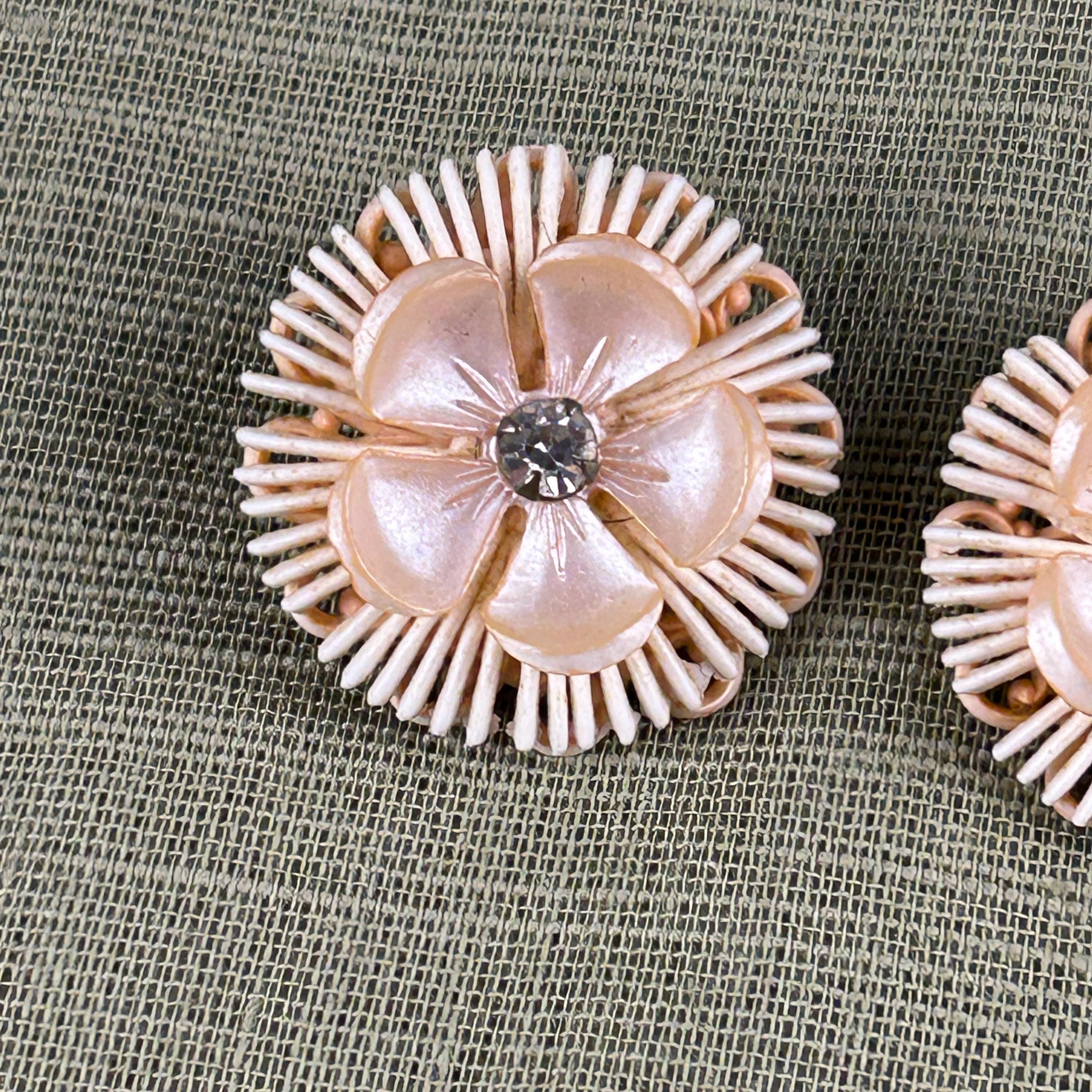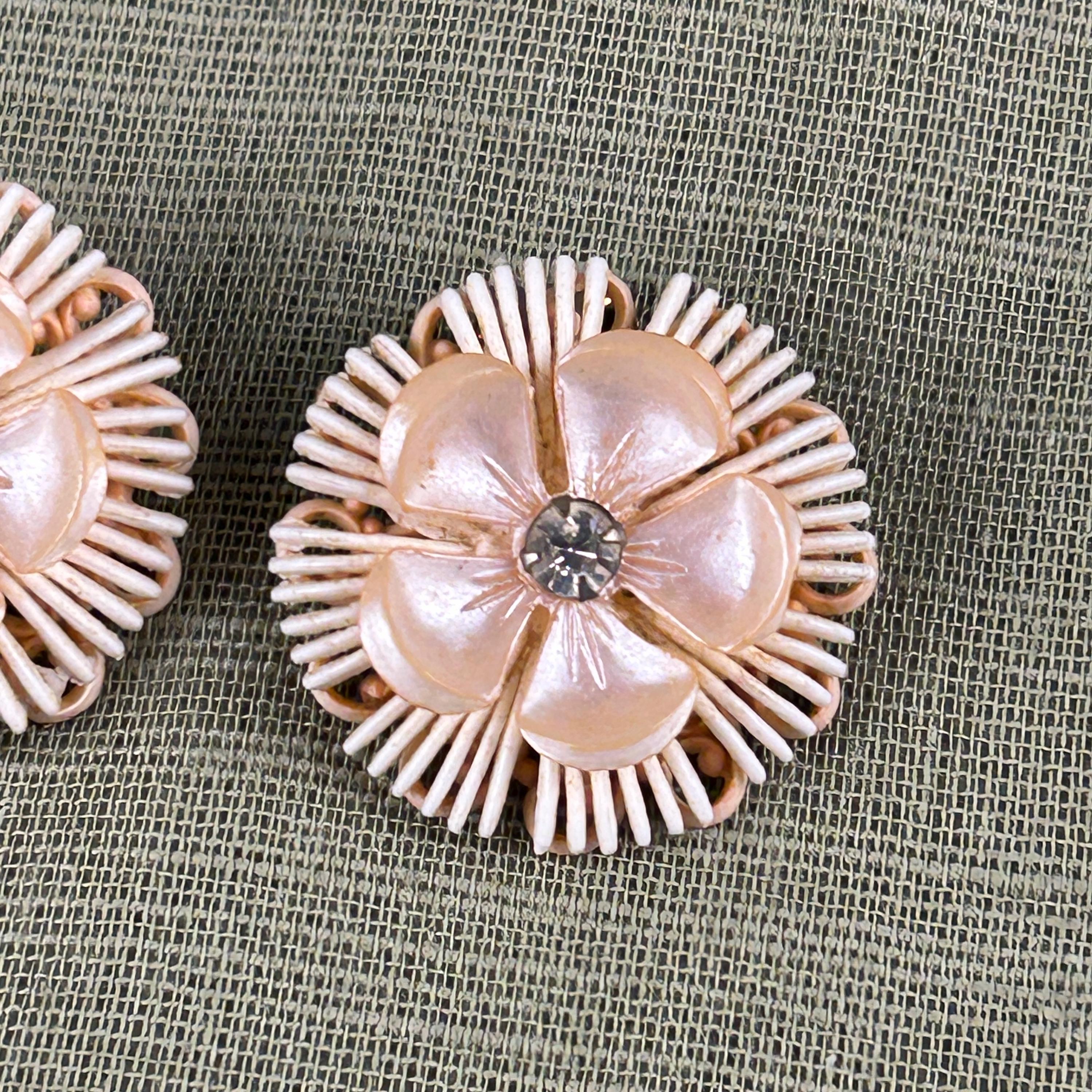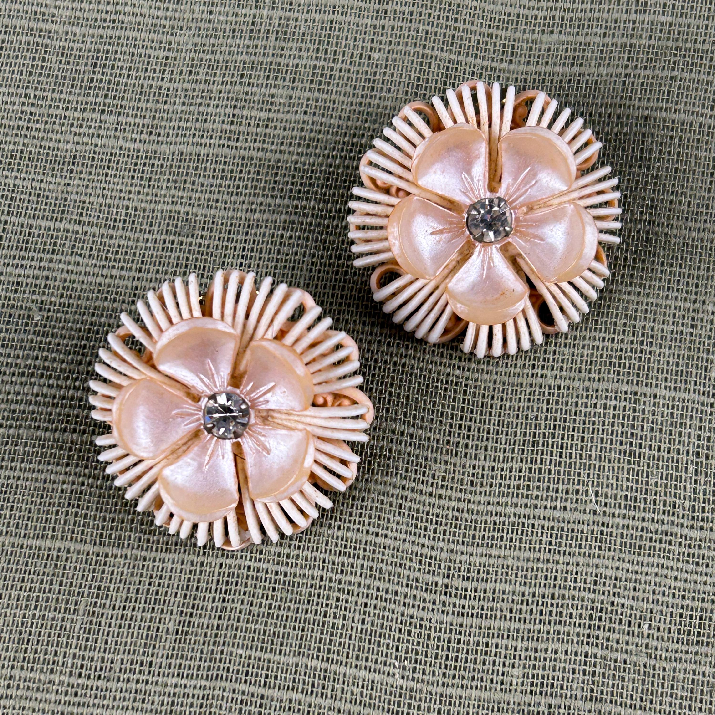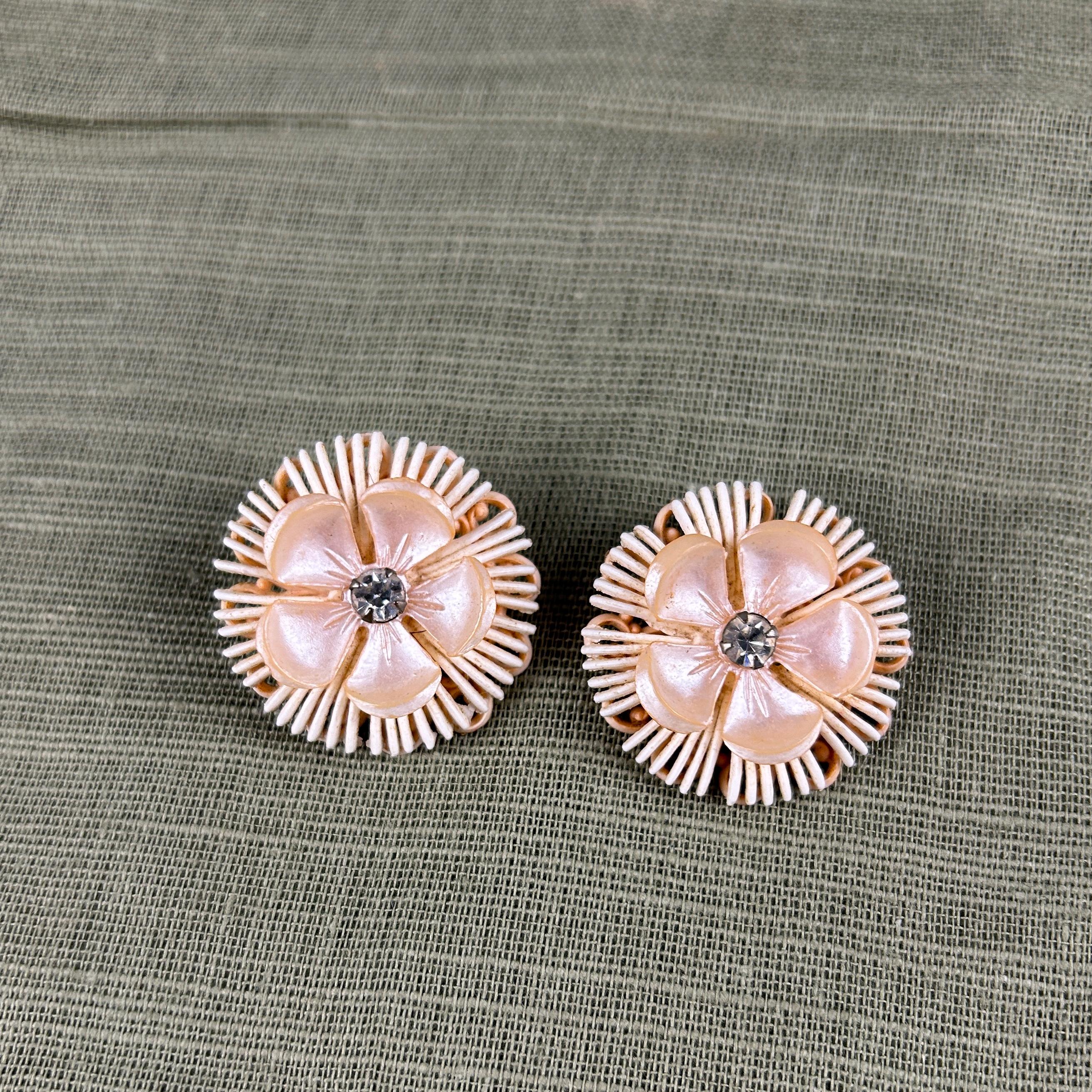 These beautiful vintage 1950s clip-on earrings feature an elegant floral design with cream-colored plastic petals and sparkling faux diamond rhinestone centers. The soft neutral color paired with the brilliant center stones gives these earrings a classic mid-century glamour.