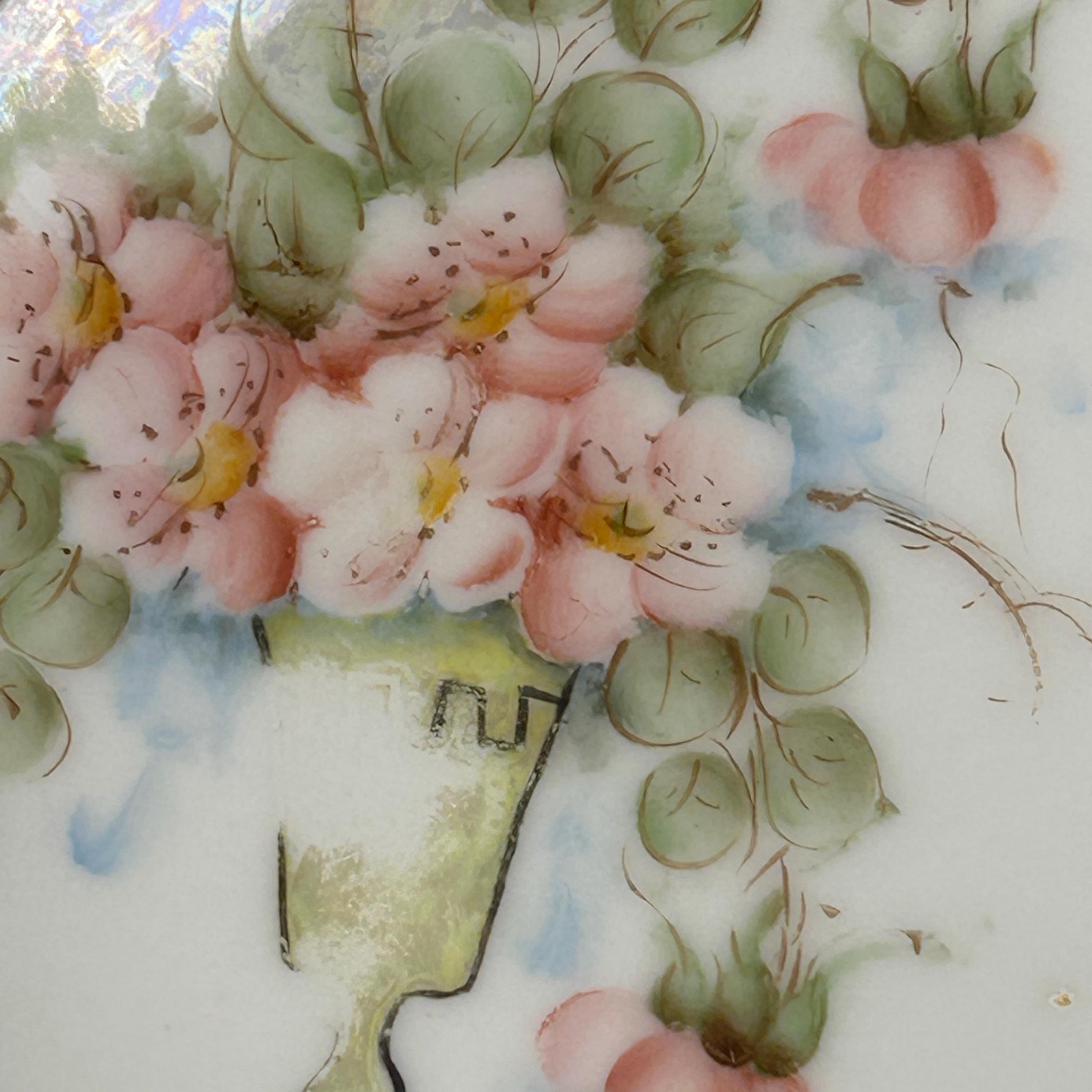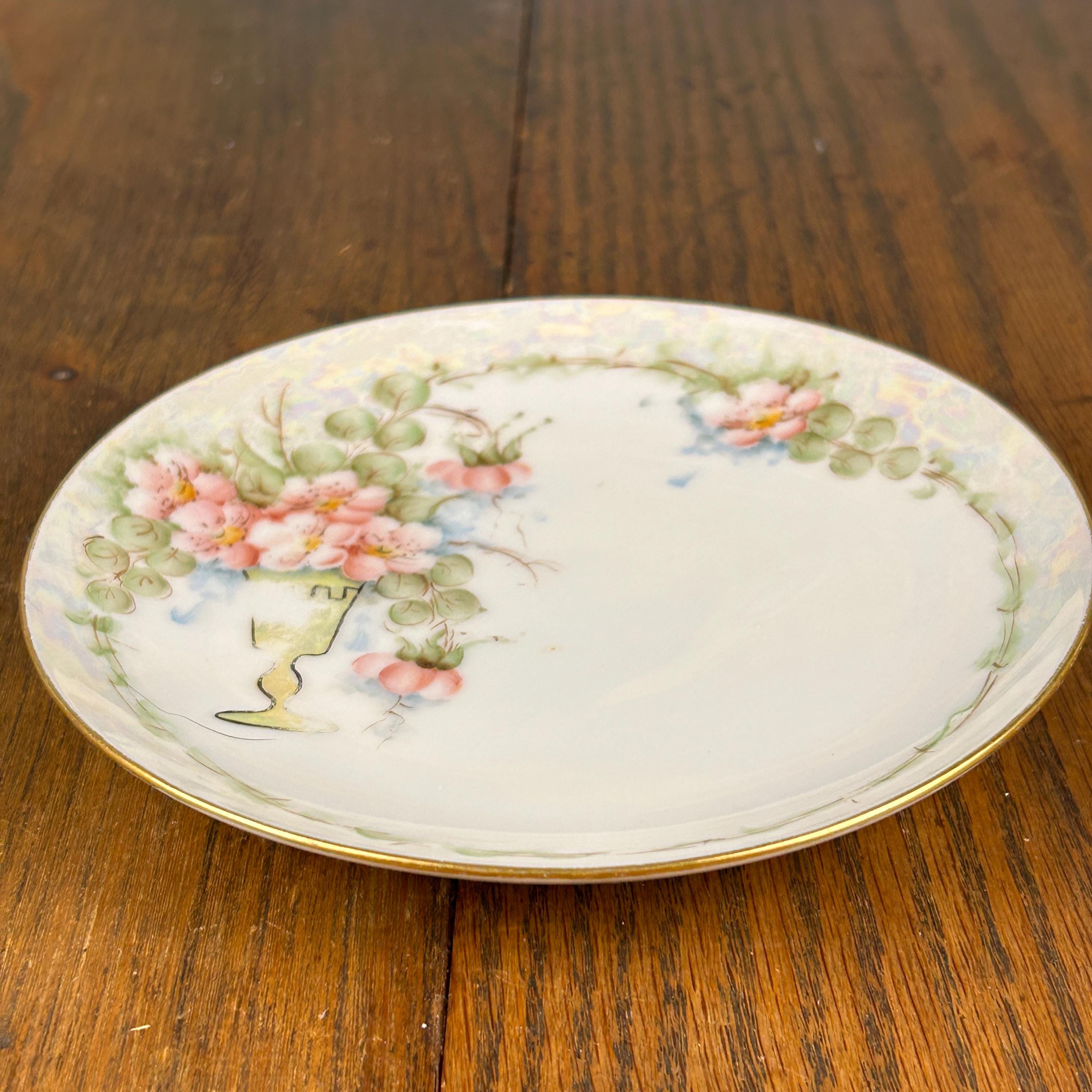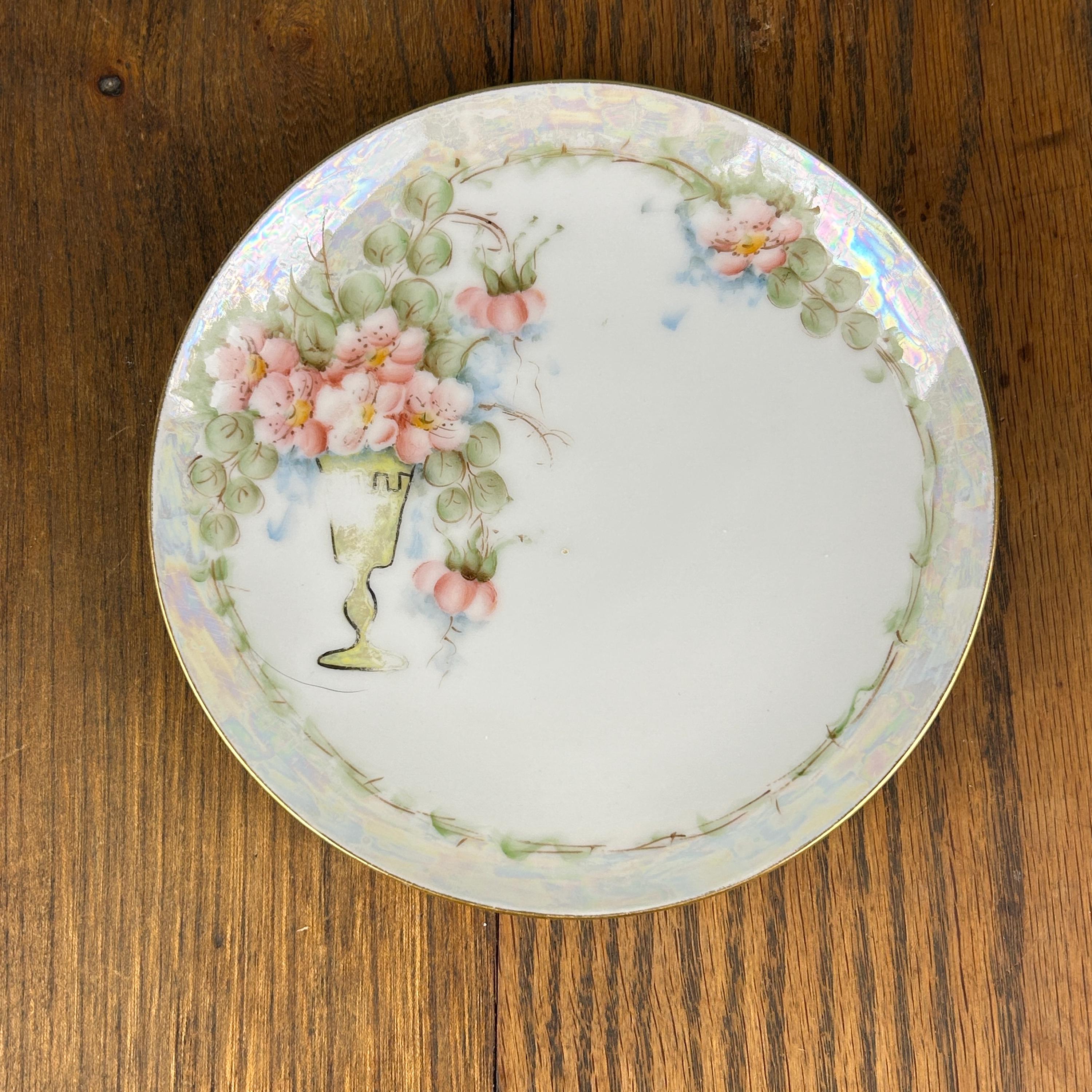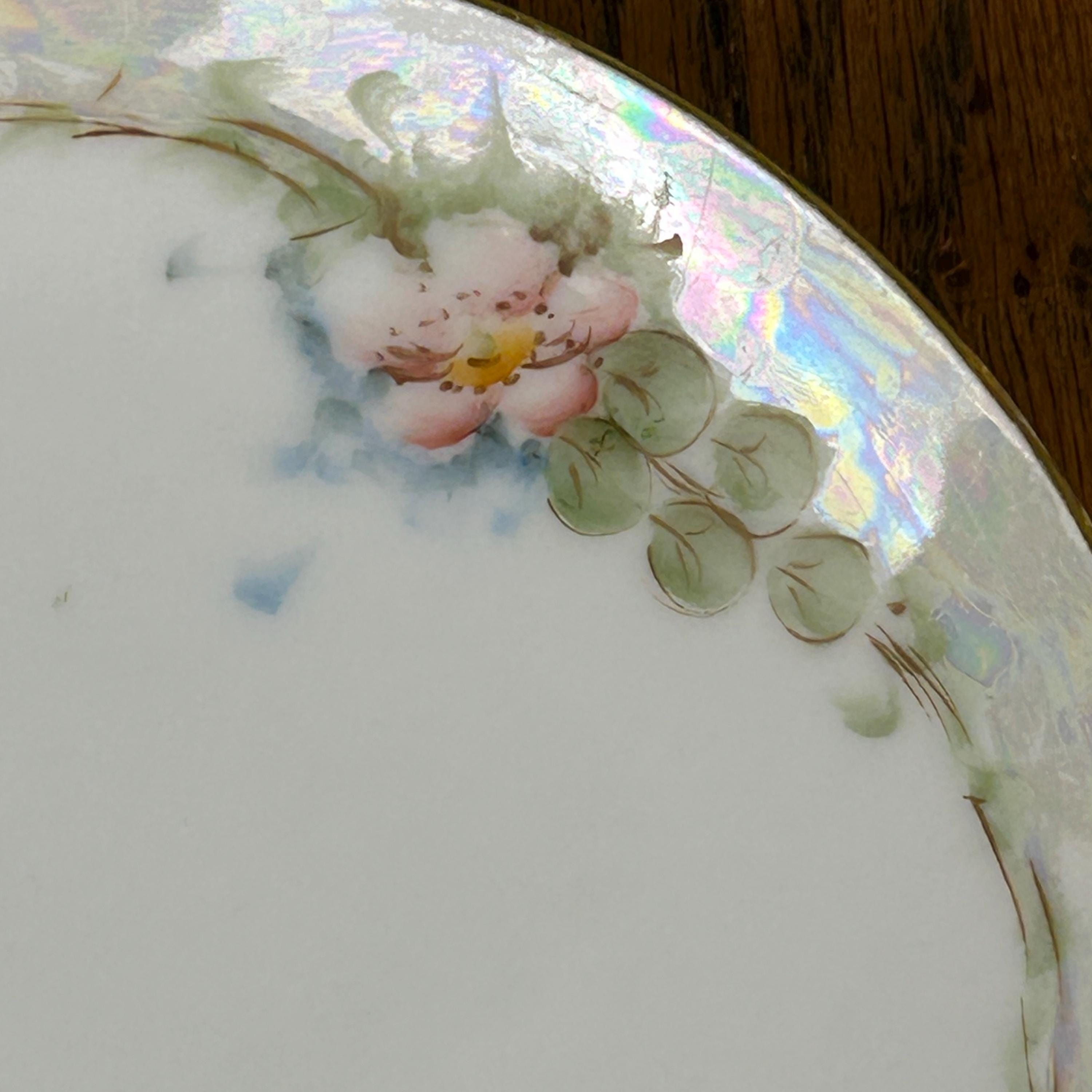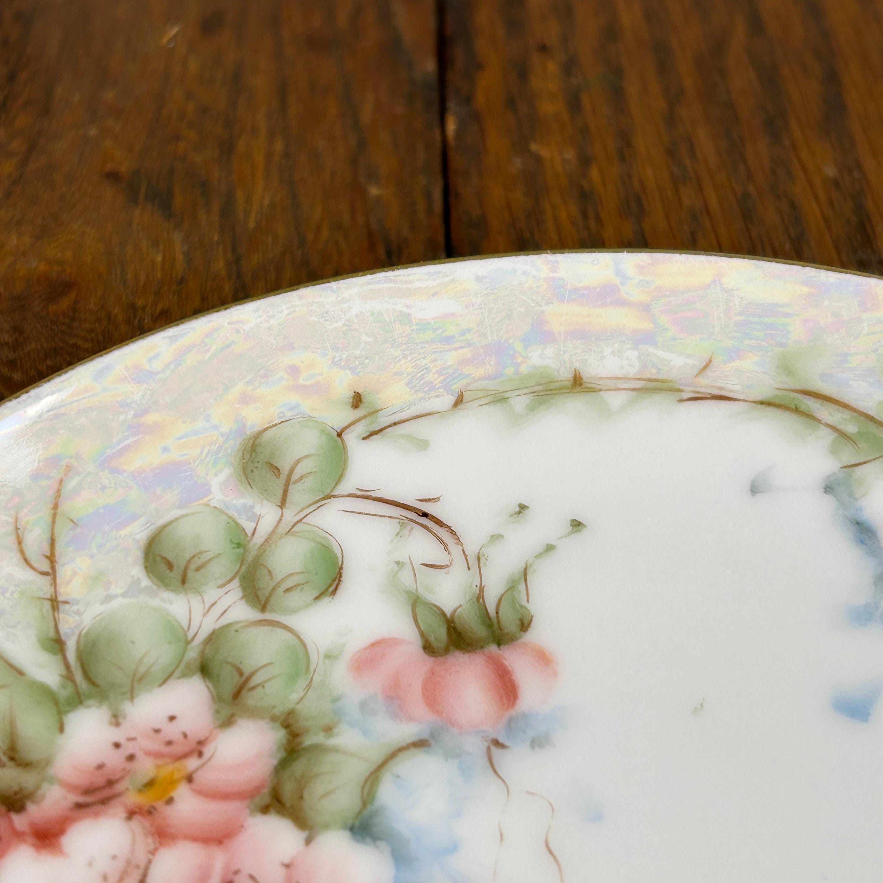 This lovely antique Gohram porcelain plate features delicate hand-painted pink flowers with green foliage, beautifully accented by gold trim and a pearlized edge. The soft iridescent luster glaze around the rim adds a subtle shimmer that enhances the elegant floral design.