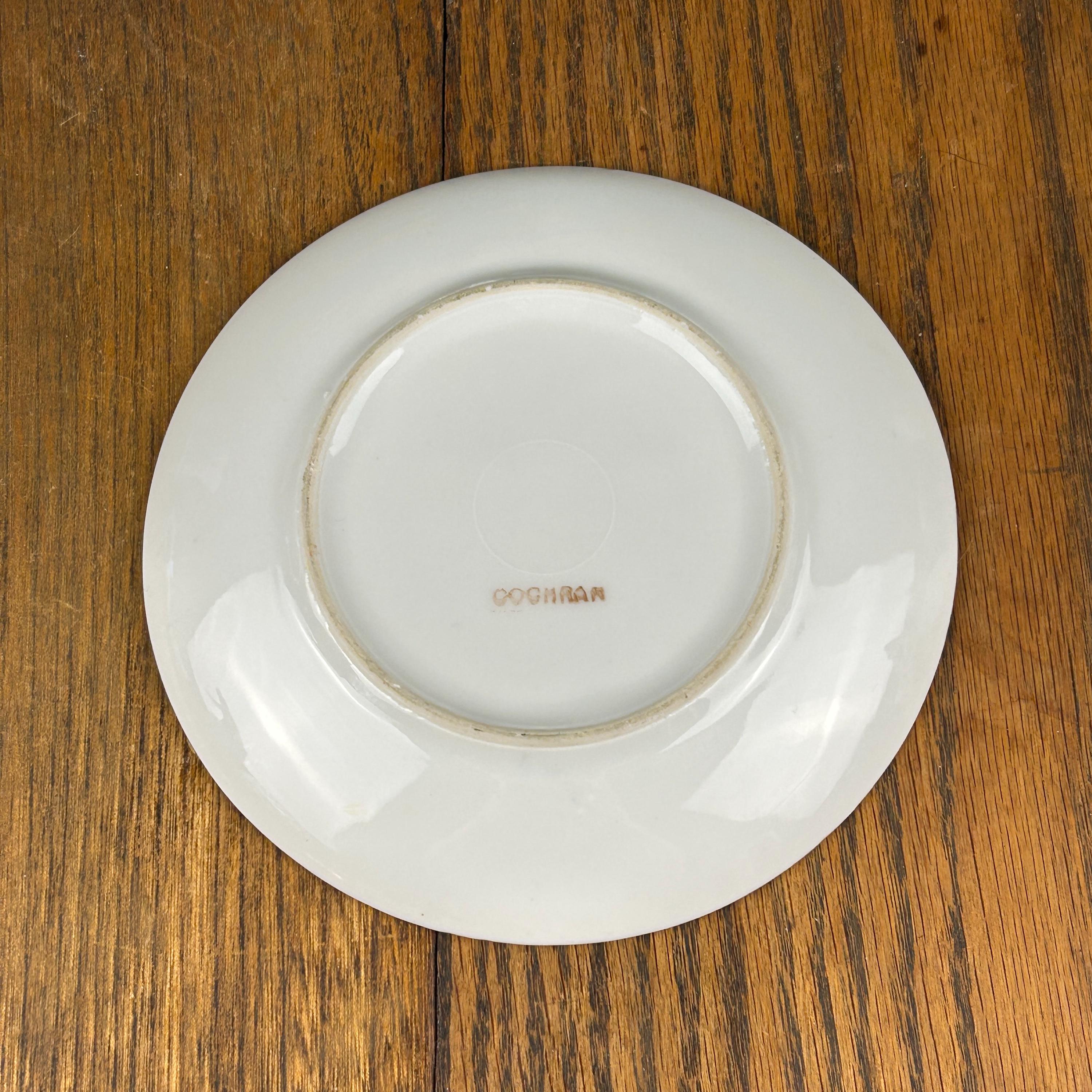 Crafted on fine white porcelain, this plate showcases classic antique styling with detailed brushwork and decorative gold banding. Pieces like this were often displayed in china cabinets or used as small serving plates for special occasions.