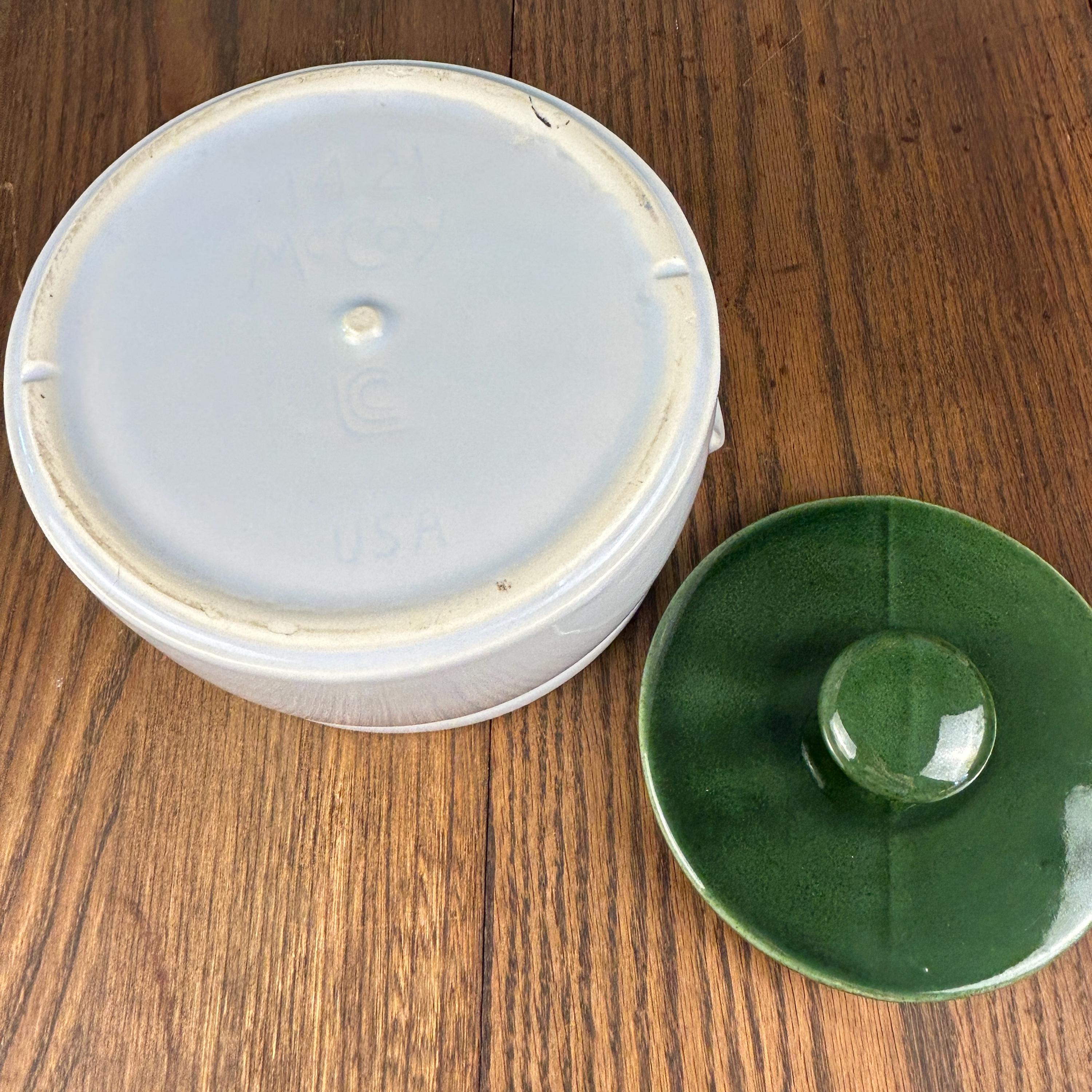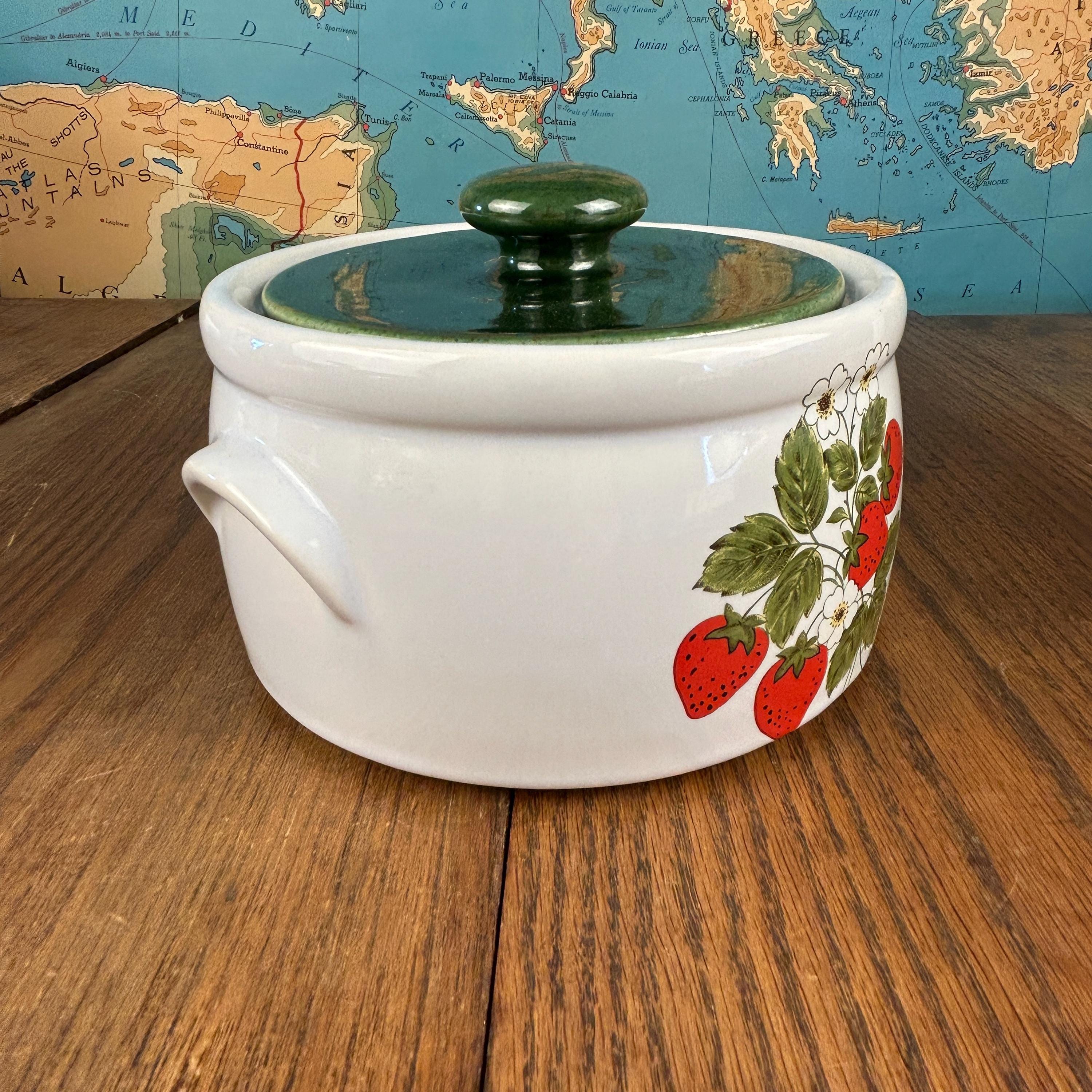 This charming vintage McCoy Pottery casserole dish, model #1421, features the beloved Strawberry Country pattern. Made by Nelson McCoy Pottery, the dish has a white body decorated with bright red strawberries and green leaves, topped with a coordinating green lid.