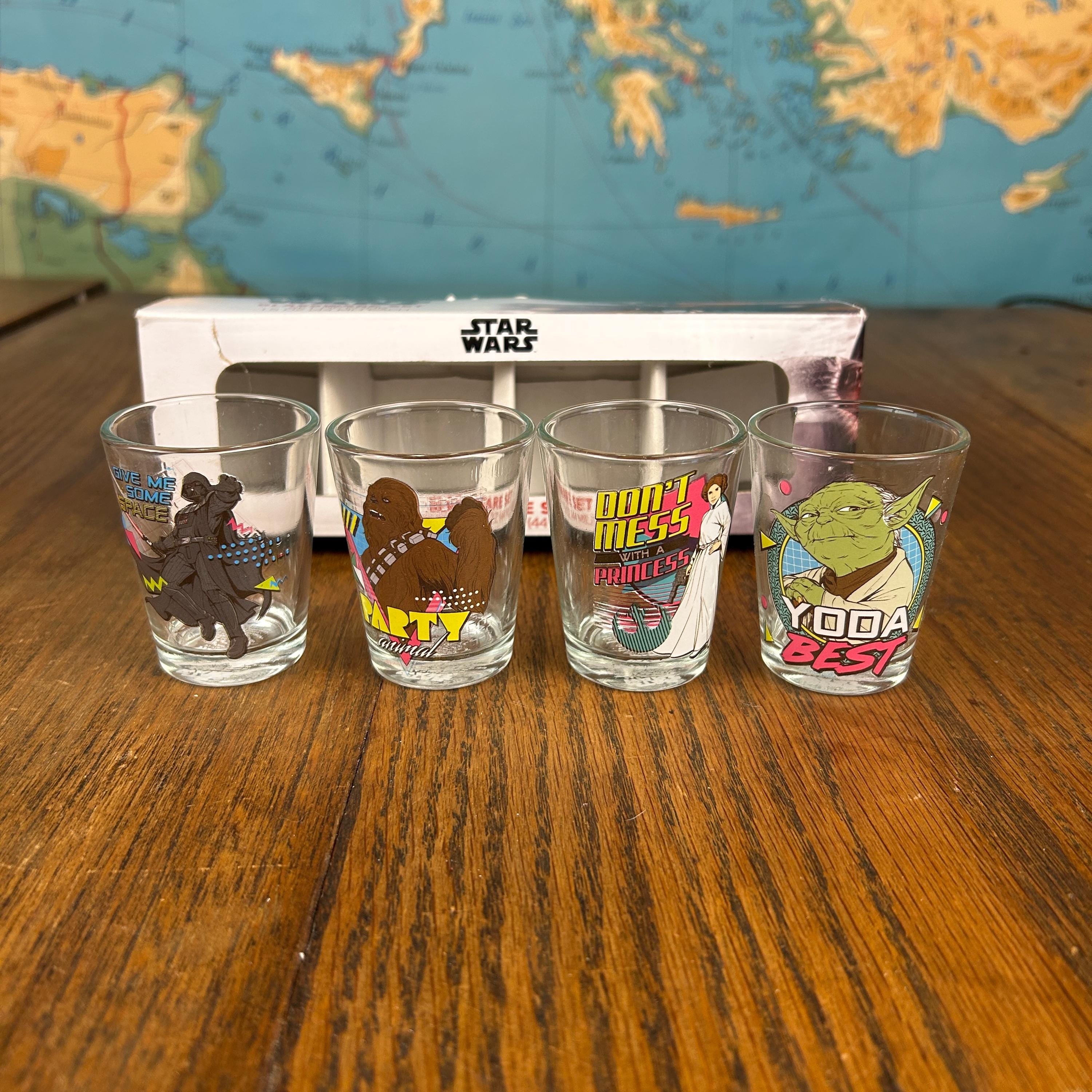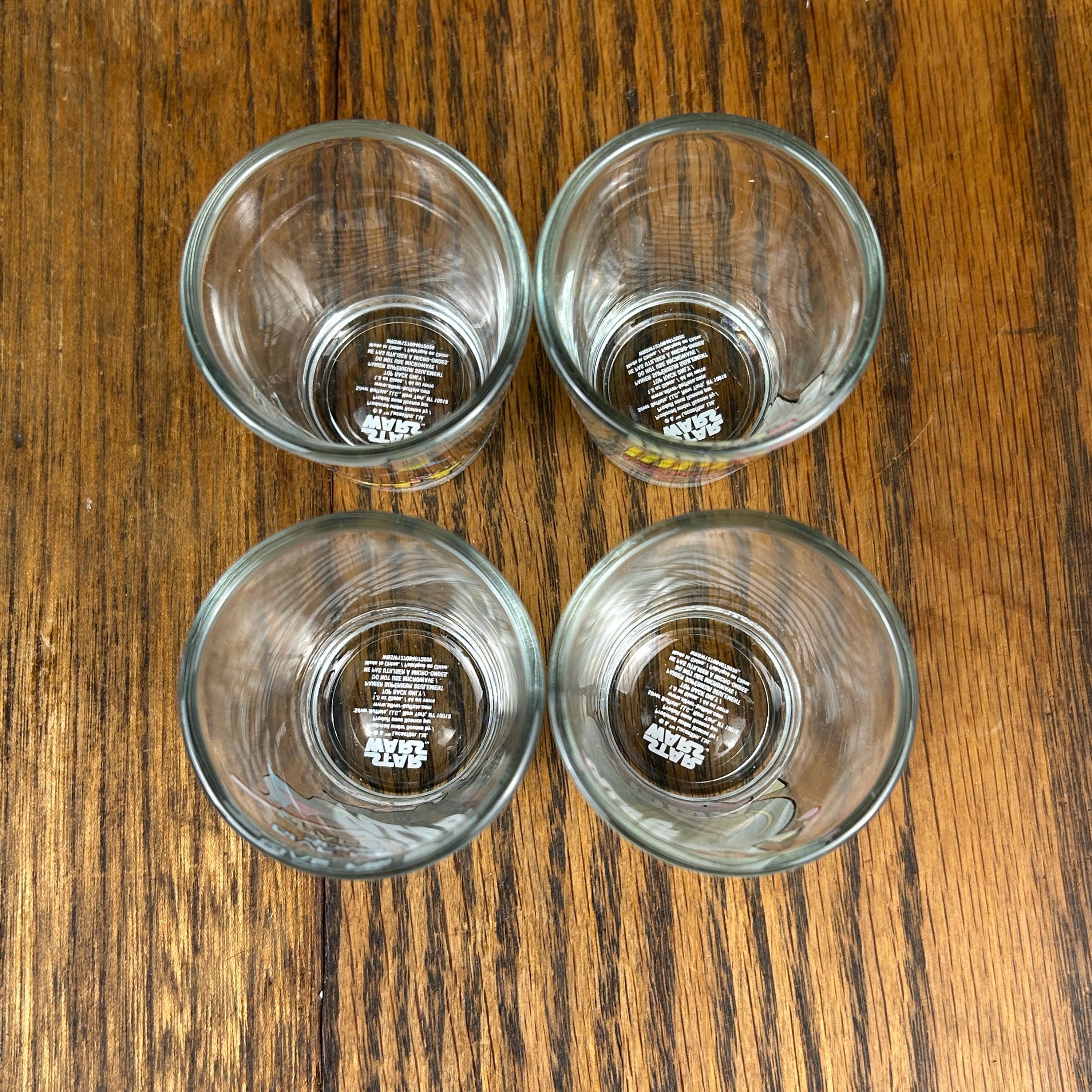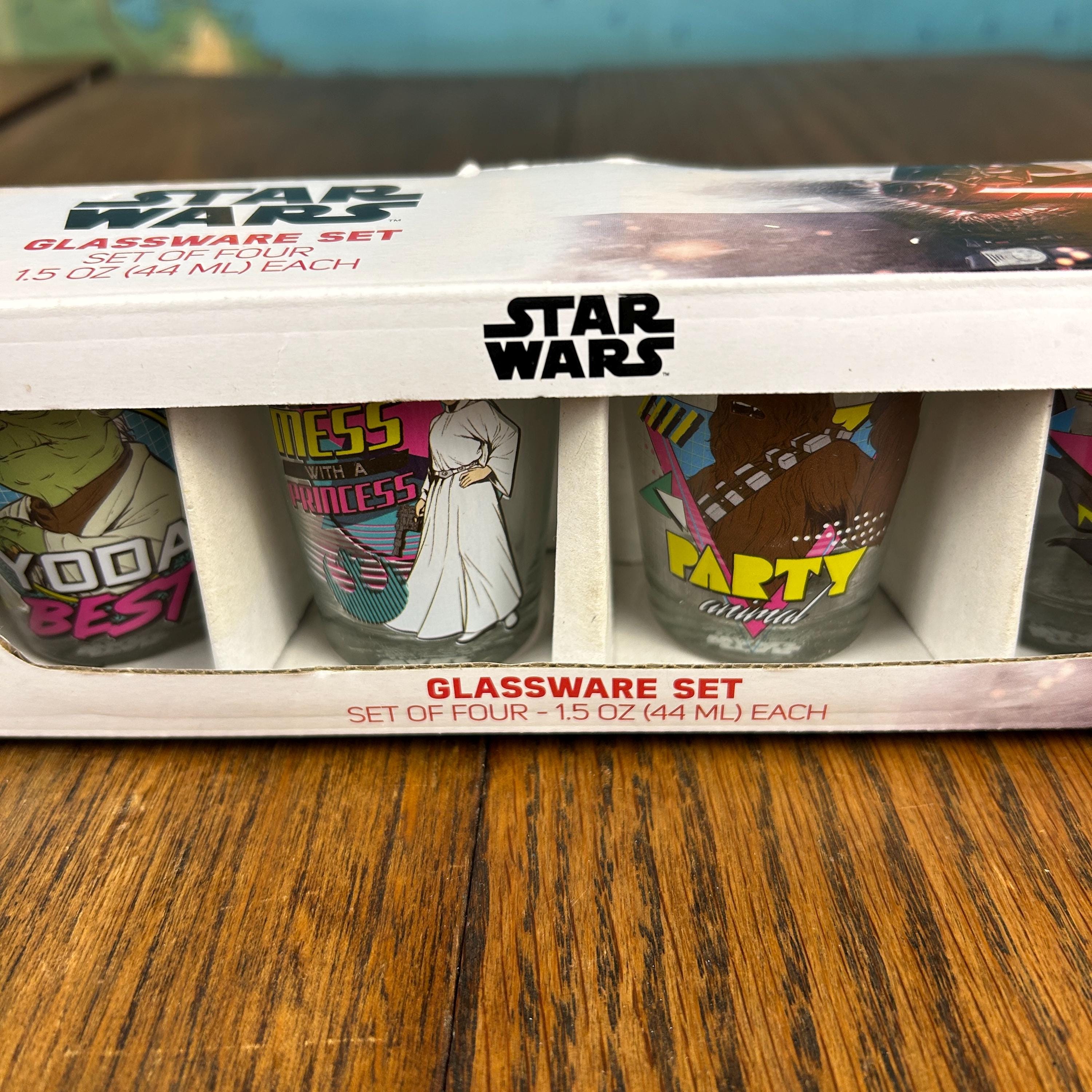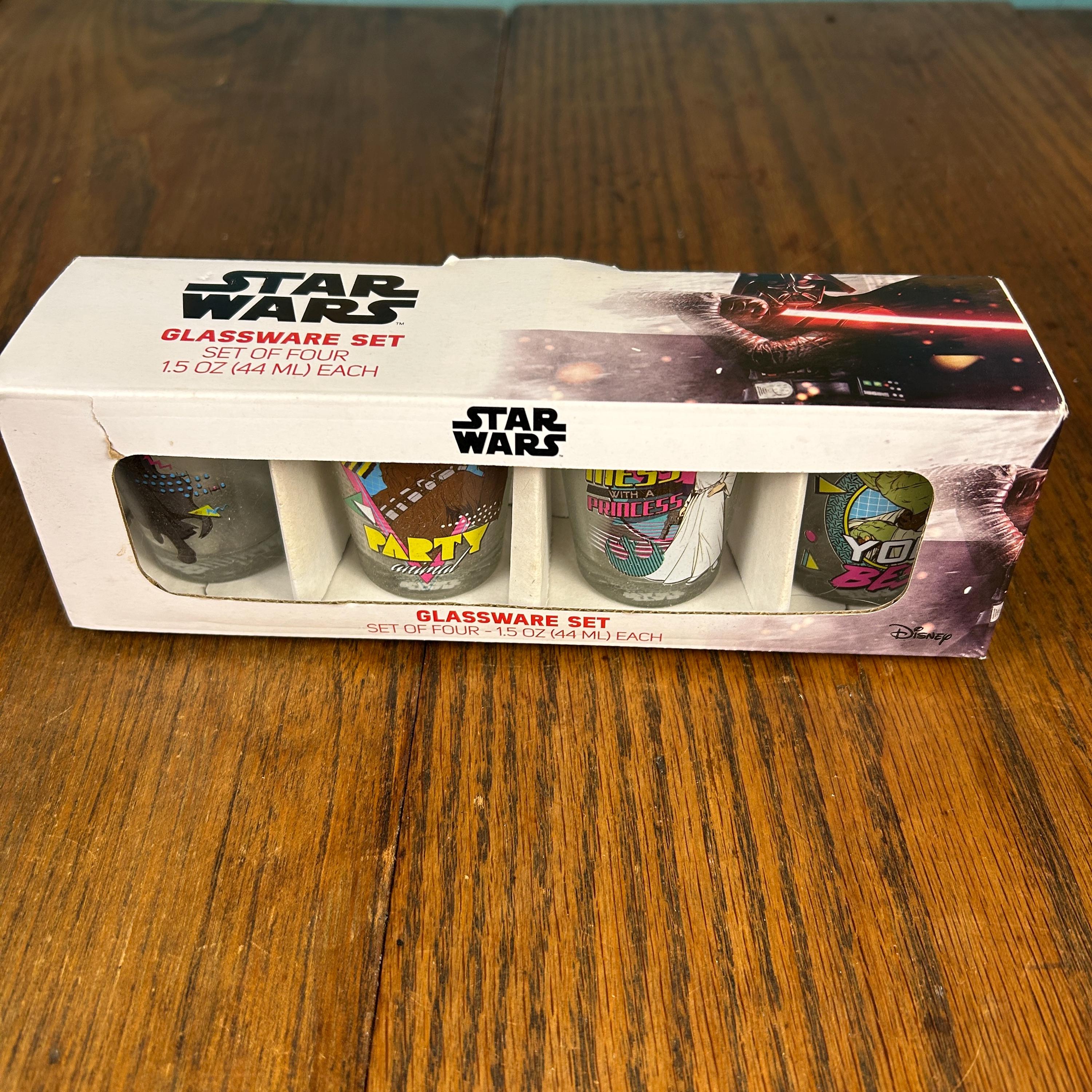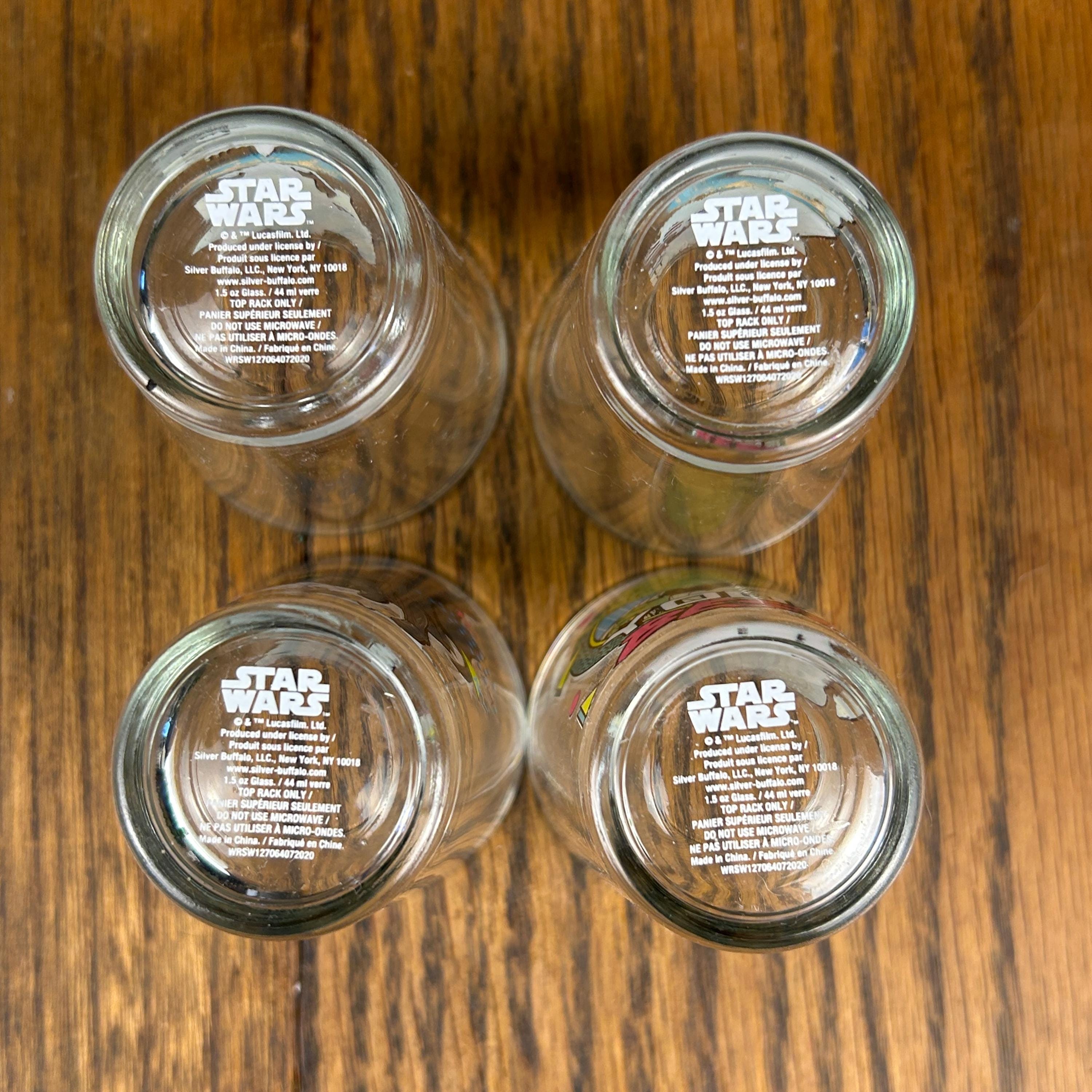 Each glass holds approximately 1.5 oz (44 ml) and features colorful Star Wars themed graphics with classic characters, giving the set a fun nostalgic look perfect for collectors and themed bar setups.