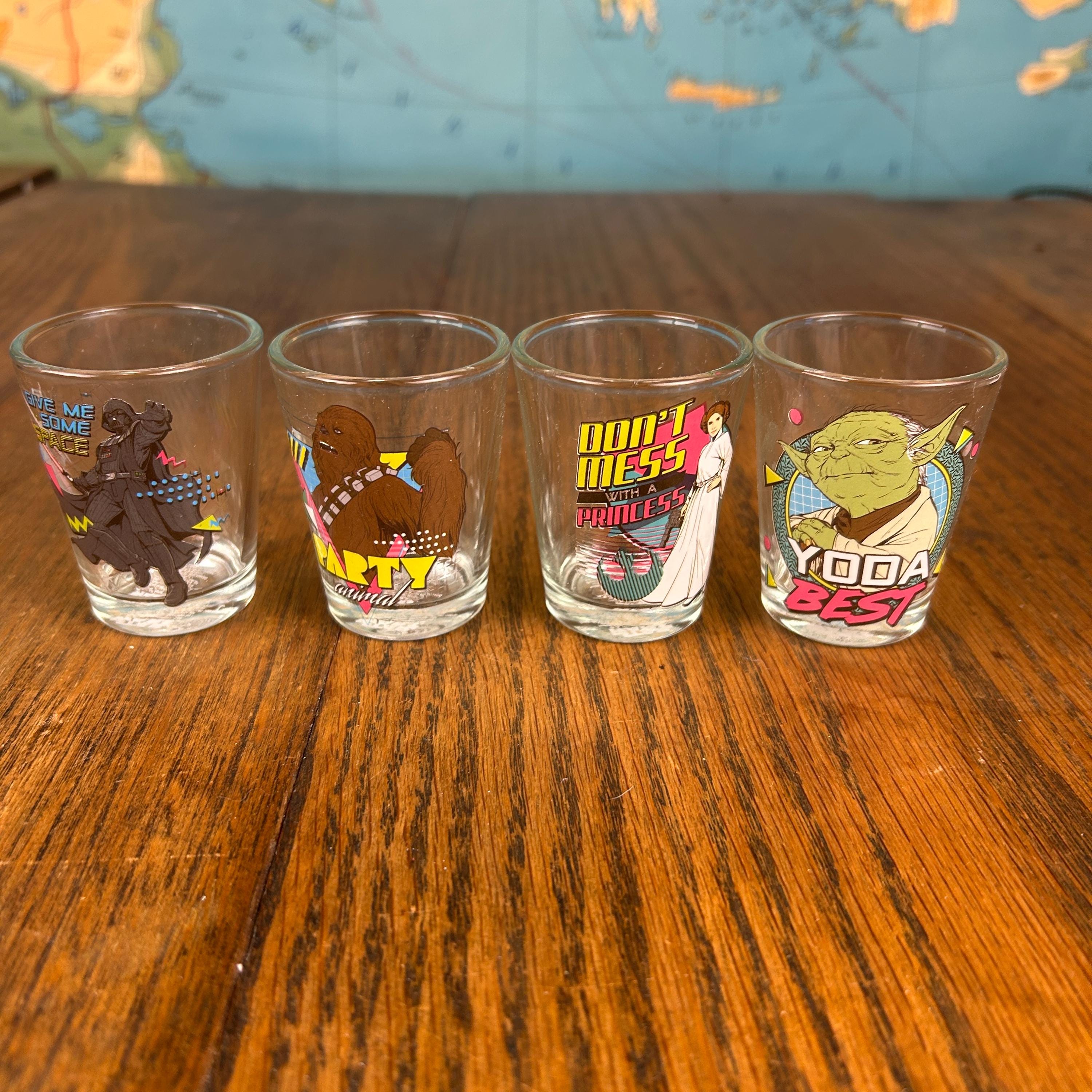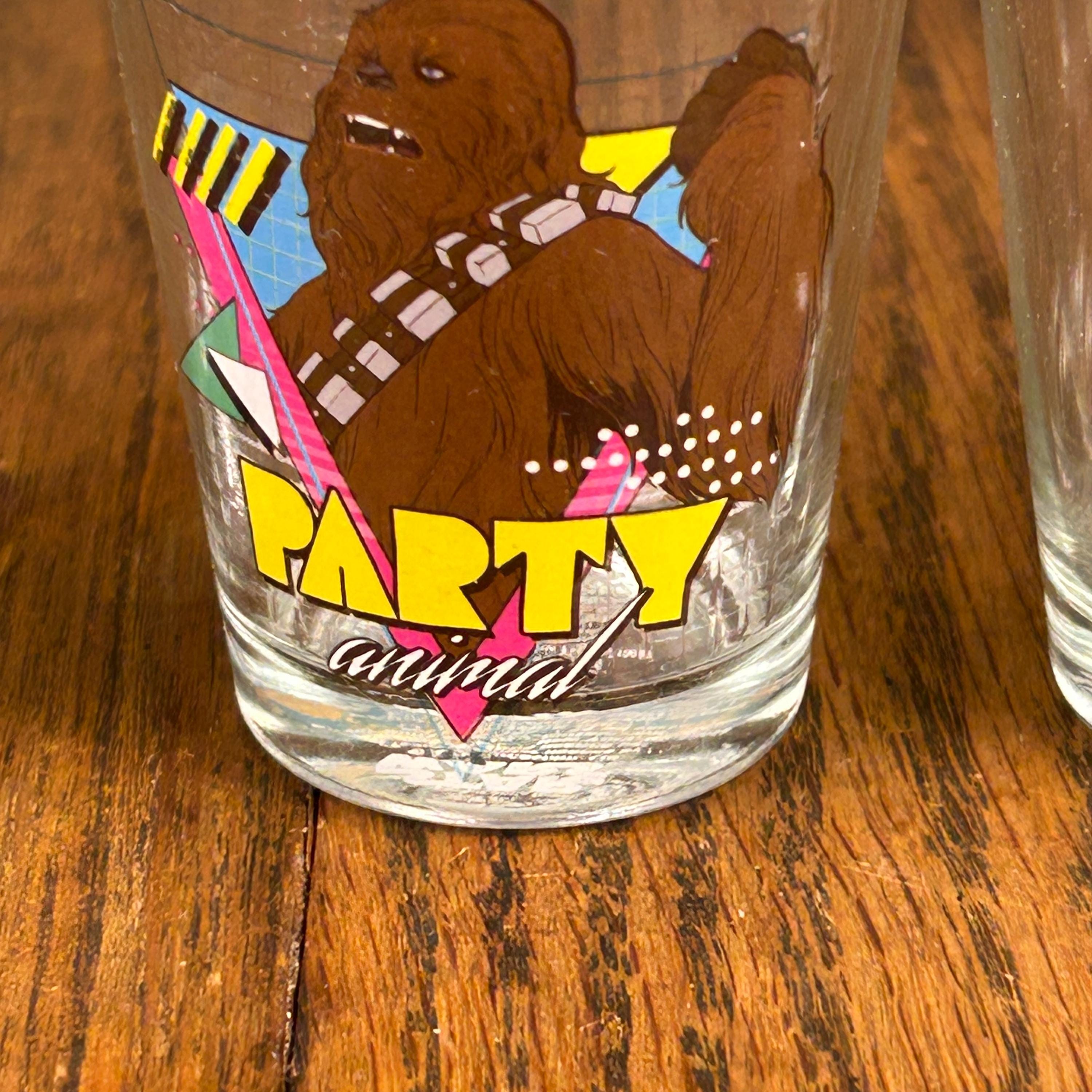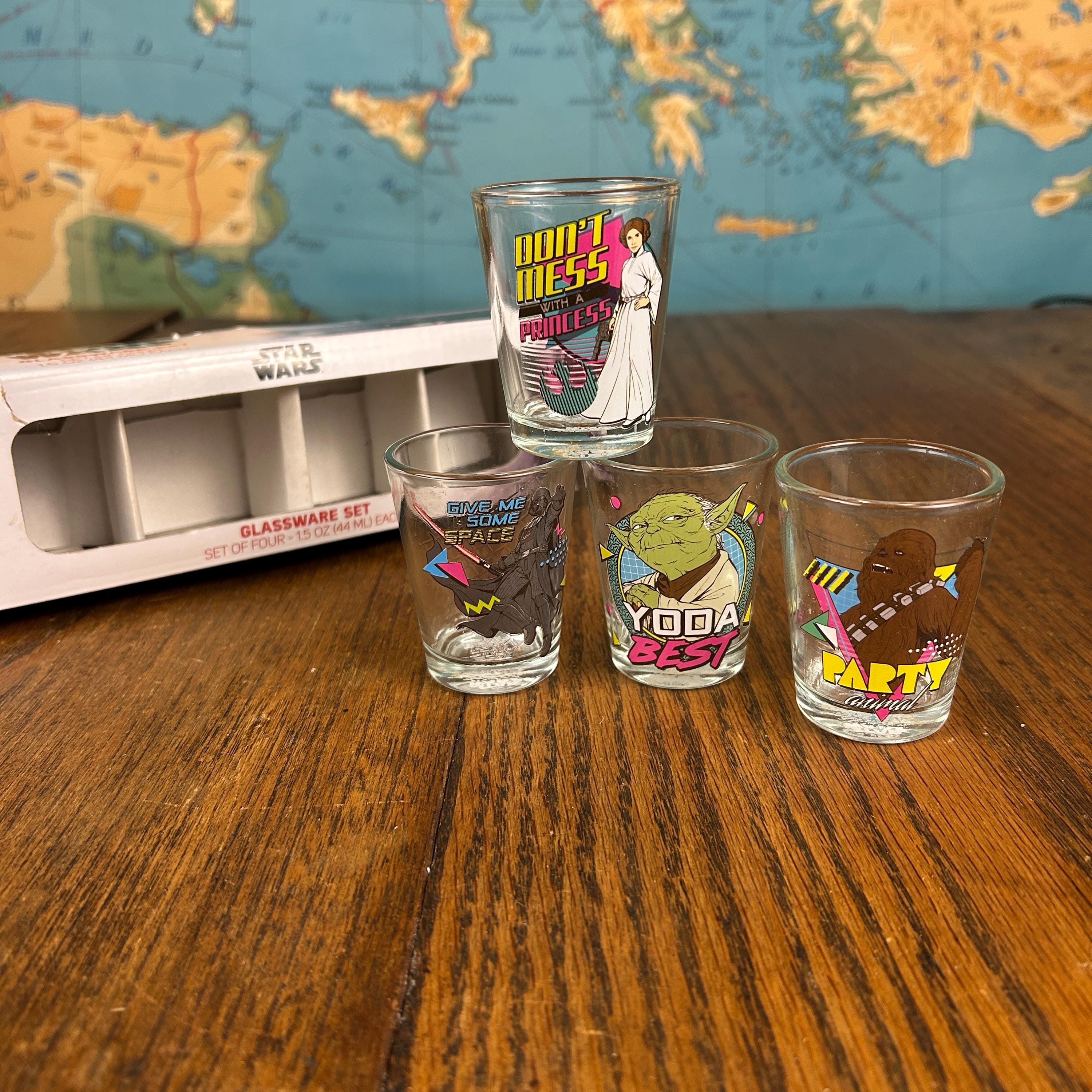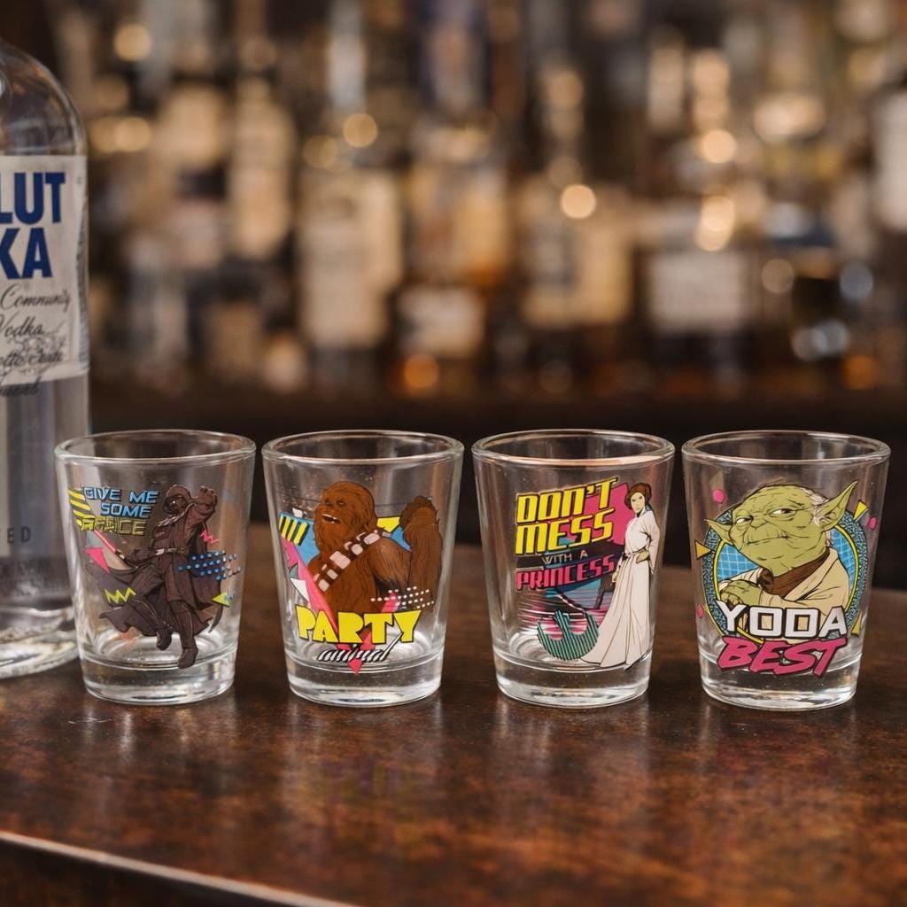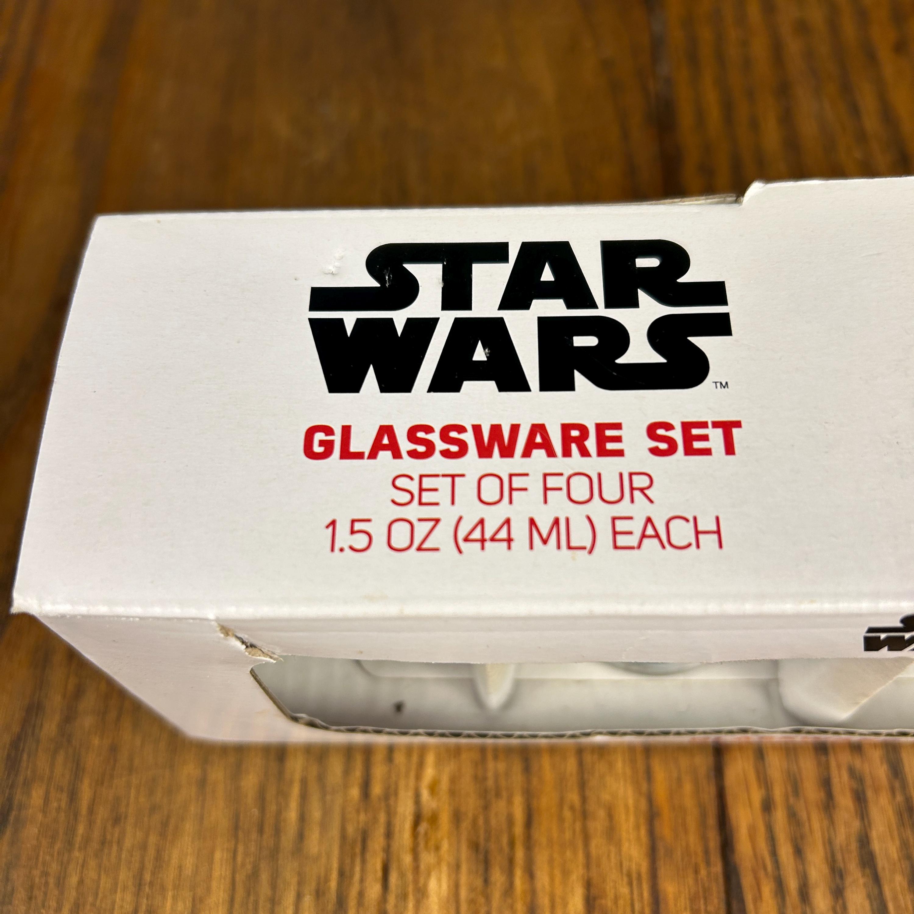 Each glass holds approximately 1.5 oz (44 ml) and features colorful Star Wars themed graphics with classic characters, giving the set a fun nostalgic look perfect for collectors and themed bar setups.
