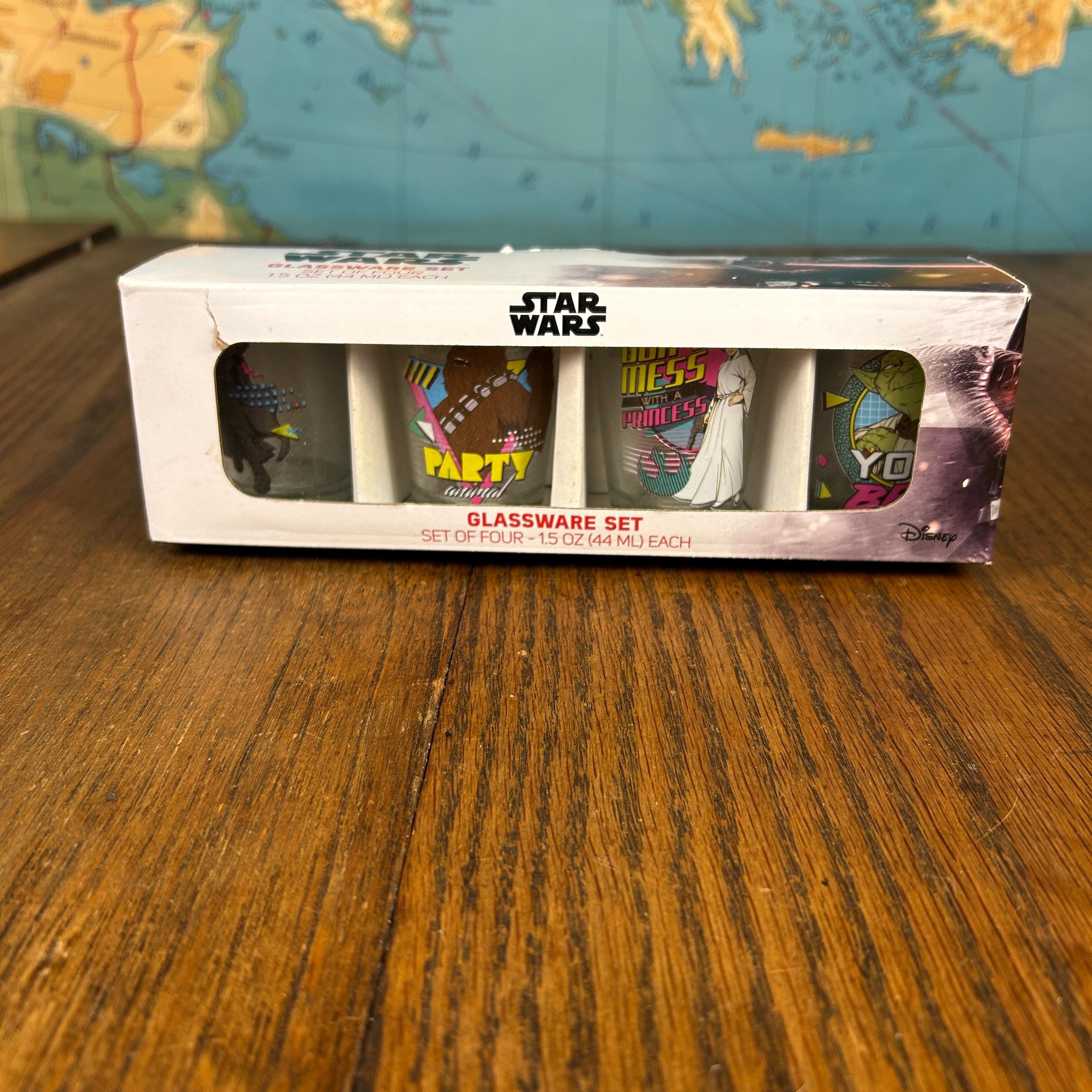 This Disney Star Wars glassware set includes four mini shot glasses featuring retro-style character designs inspired by classic Star Wars artwork from the 1980s–1990s. The set comes new old stock in the original packaging, making it a great collectible for fans of the iconic sci-fi franchise.