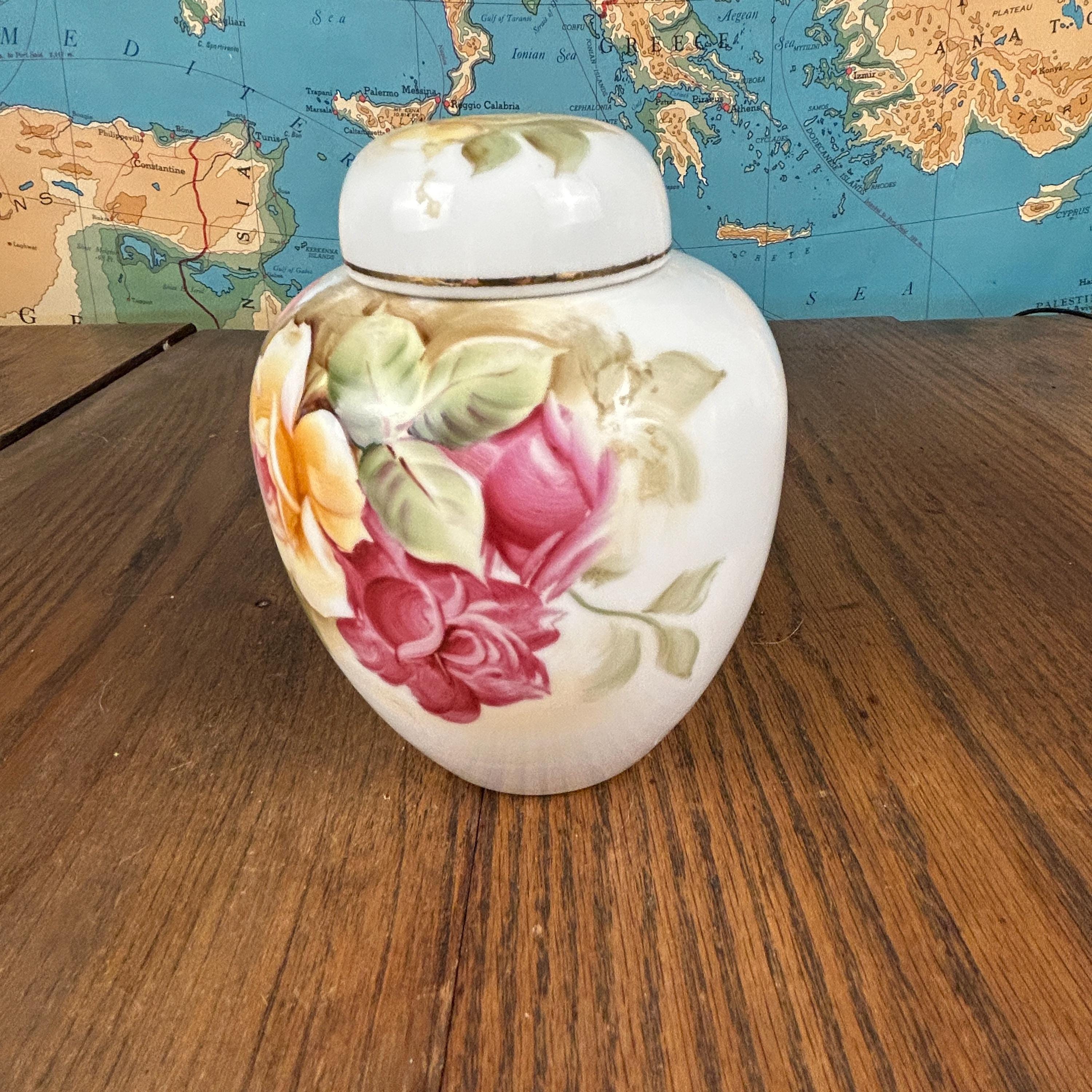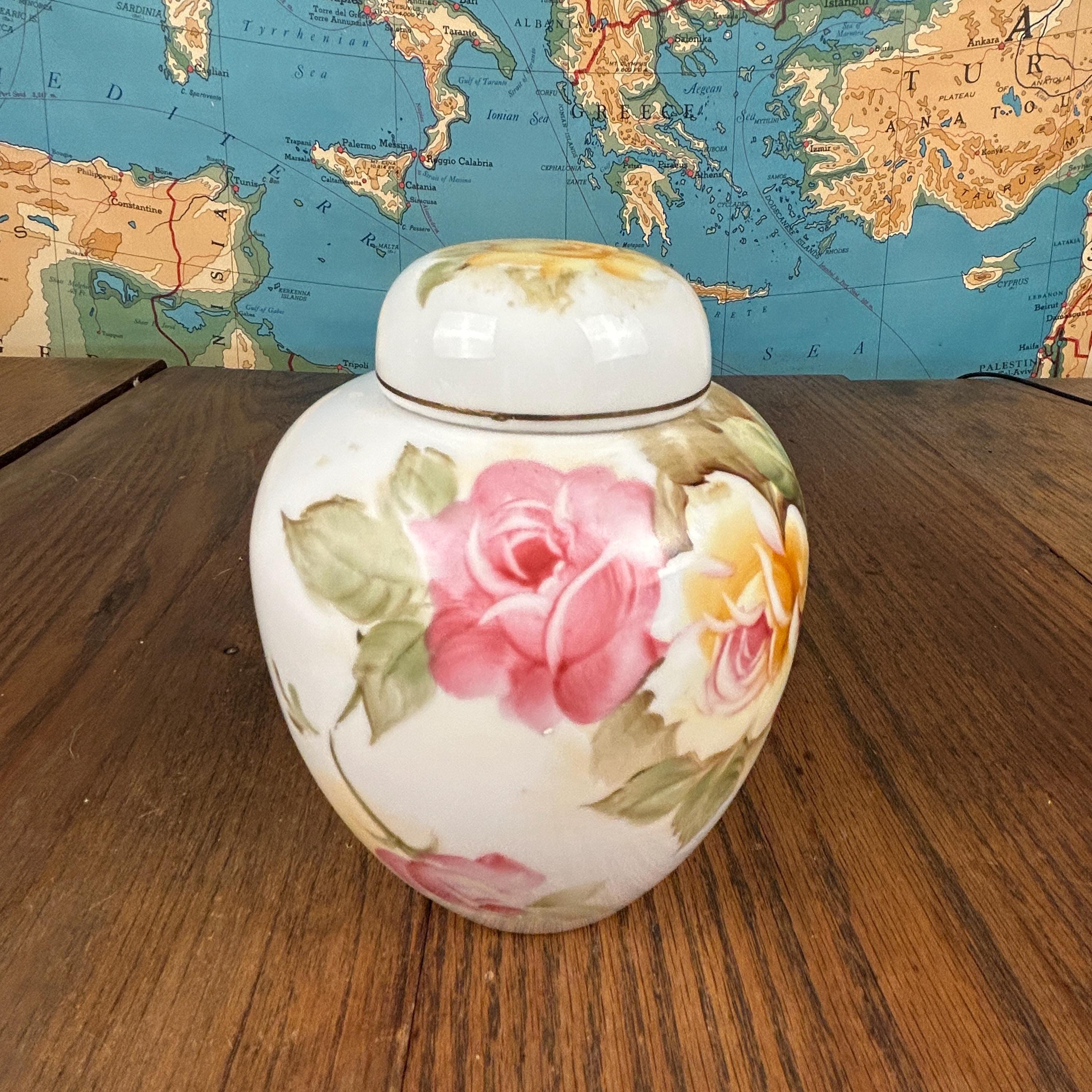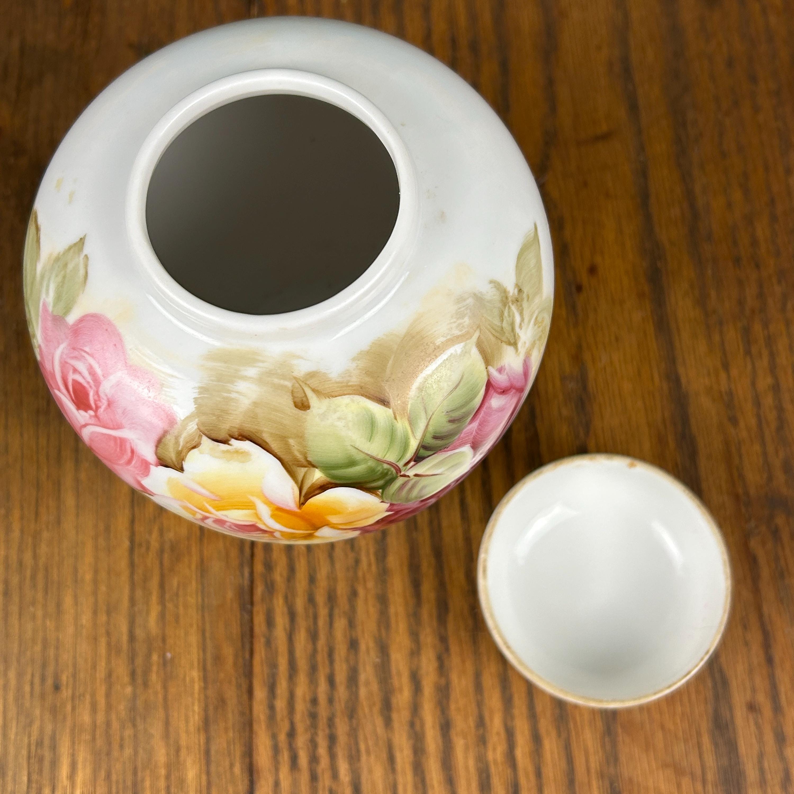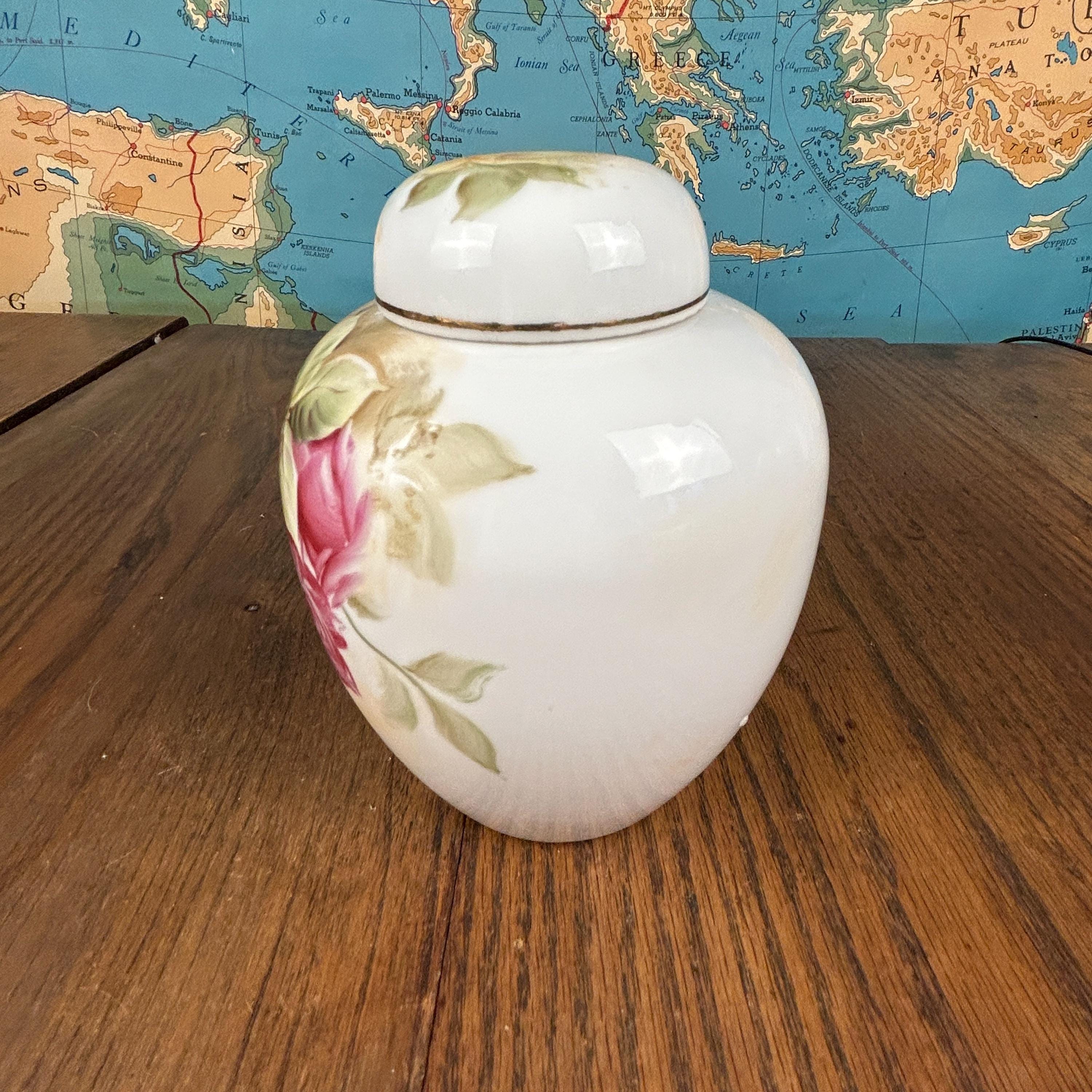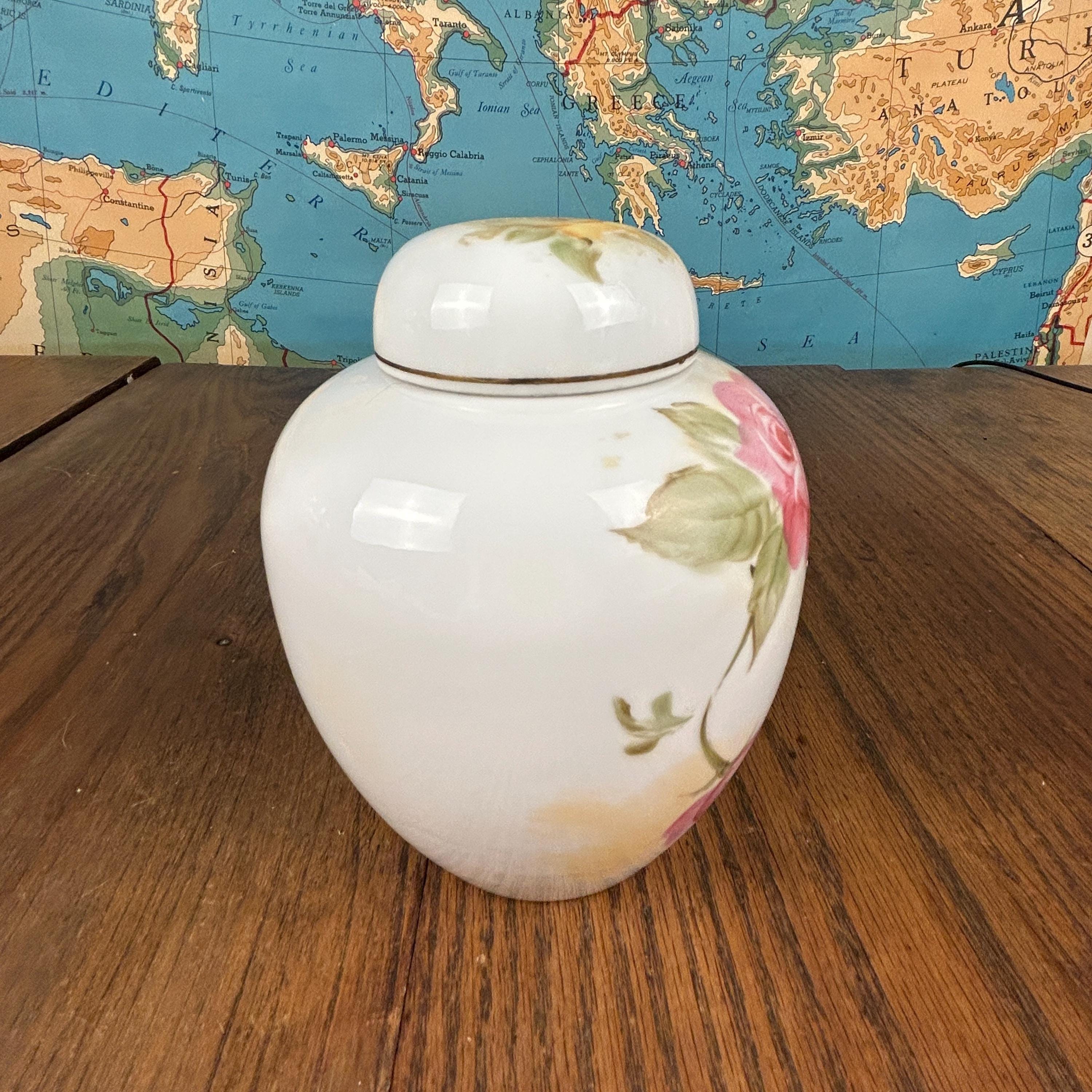 The jar is crafted from porcelain (or glass depending on final material) and showcases a lovely arrangement of pink roses and greenery against a light background. Pieces like this were traditionally used as ginger jars for tea storage or as dresser jars for powder, jewelry, and small trinkets.